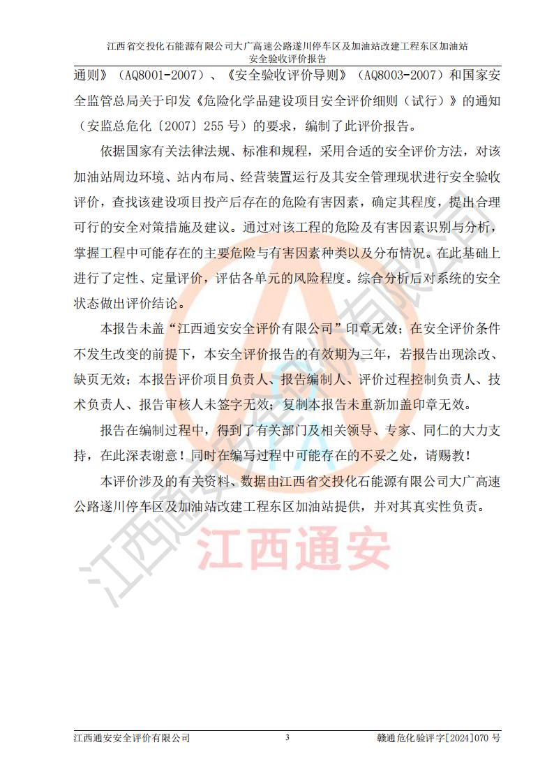 評(píng)價(jià)報(bào)告名稱(chēng) | 江西省交投化石能源有限公司大廣高速公路遂川停車(chē)區(qū)及加油站改建工程?hào)|區(qū)加油站安全驗(yàn)收評(píng)價(jià)報(bào)告 | |||