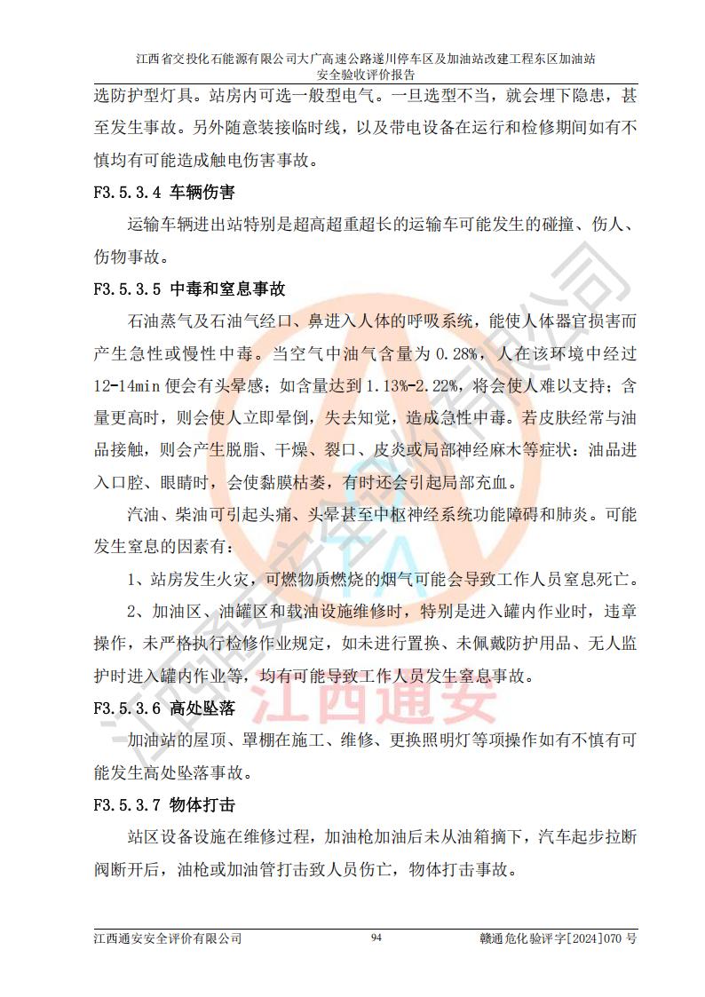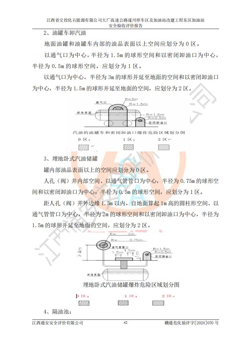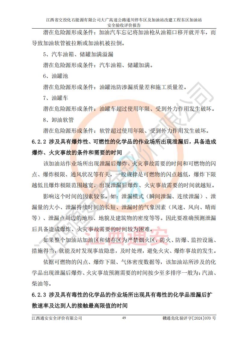 項(xiàng)目簡(jiǎn)介 | 江西省交投化石能源有限公司成立于2023年6月13日,為江西省交通投資集團(tuán)有限責(zé)任公司子公司,企業(yè)類(lèi)型:有限責(zé)任公司(非自然人投資或控股的法人獨(dú)資),法定**人陳大學(xué)。經(jīng)營(yíng)范圍為:許可項(xiàng)目:建設(shè)工程施工(除核電站建設(shè)經(jīng)營(yíng)、民用機(jī)場(chǎng)建設(shè)),建設(shè)工程設(shè)計(jì),建設(shè)工程勘察,建設(shè)工程施工(依法須經(jīng)批準(zhǔn)的項(xiàng)目,經(jīng)相關(guān)部門(mén)批準(zhǔn)后在許可**期內(nèi)方可開(kāi)展經(jīng)營(yíng)活動(dòng),具體經(jīng)營(yíng)項(xiàng)目和許可期限以相關(guān)部門(mén)批準(zhǔn)文件或許可證件為準(zhǔn))一般項(xiàng)目:石油制品銷(xiāo)售(不含危險(xiǎn)化學(xué)品),化工產(chǎn)品銷(xiāo)售(不含許可類(lèi)化工產(chǎn)品),成品油批發(fā)(不含危險(xiǎn)化學(xué)品),煉油、化工生產(chǎn)**設(shè)備銷(xiāo)售,非居住房地產(chǎn)租賃,住房租賃,租賃服務(wù)(不含許可類(lèi)租賃服務(wù)),工程管理服務(wù),潤(rùn)滑油銷(xiāo)售(除依法須經(jīng)批準(zhǔn)的項(xiàng)目外,憑營(yíng)業(yè)執(zhí)照依法自主開(kāi)展經(jīng)營(yíng)活動(dòng))。該站位于江西省吉安市遂川縣碧洲鎮(zhèn)。 該加油站改建前為中國(guó)石化銷(xiāo)售股份有限公司江西吉安石油分公司遂川服務(wù)區(qū)高速東加油站。江西省交投化石能源有限公司收購(gòu)了該加油站。 江西省交投化石能源有限公司大廣高速公路遂川停車(chē)區(qū)及加油站改建工程?hào)|區(qū)加油站位于江西省吉安市遂川縣碧洲鎮(zhèn),占地規(guī)模和建筑面積:總用地面積2947.00m2,建筑計(jì)容面積1079.33m2;新建二層框架結(jié)構(gòu)站房418.89m2。新建一座鋼結(jié)構(gòu)罩棚,投影面積1174.18m2,建筑面積660.44m2。 該加油站主要經(jīng)營(yíng)0#柴油、92#汽油、95#汽油、98#汽油,站內(nèi)設(shè)6座埋地非承重雙層油罐,分別為2座50m3油罐儲(chǔ)存0#柴油,1座50m3油罐儲(chǔ)存92#汽油,1座50m3油罐儲(chǔ)存95#汽油,1座30m3油罐儲(chǔ)存92#汽油,1座30m3油罐儲(chǔ)存98#汽油。*大存儲(chǔ)量為260m3,實(shí)際油品折算總?cè)萘繛?10m3(柴油折半),屬于**加油站。 該加油站的主要化學(xué)品物質(zhì)是汽油和柴油。根據(jù)危險(xiǎn)化學(xué)品目錄[2015年版]》(**安監(jiān)總局等十部門(mén)[2015]第5號(hào))以及《應(yīng)急管理部辦公廳關(guān)于修改《危險(xiǎn)化學(xué)品目錄(2015版)實(shí)施指南(試行)》涉及柴油部分內(nèi)容的通知》(應(yīng)急廳函〔2022〕300號(hào))、應(yīng)急管理部 工業(yè)和信息化部 公安部 生態(tài)環(huán)境部 交通運(yùn)輸部 農(nóng)業(yè)農(nóng)村部 衛(wèi)生健康委 市場(chǎng)監(jiān)管總局 鐵路局 民航局公告2022年第8號(hào)決定調(diào)整《危險(xiǎn)化學(xué)品目錄(2015版)》,將“1674柴油[閉杯閃點(diǎn)≤60℃]”調(diào)整為“1674柴油”等文件進(jìn)行辨識(shí):該加油站經(jīng)營(yíng)的汽油、柴油均屬于危險(xiǎn)化學(xué)品。 | |||