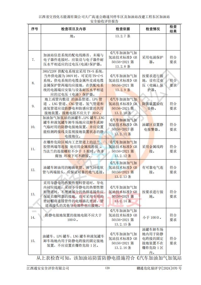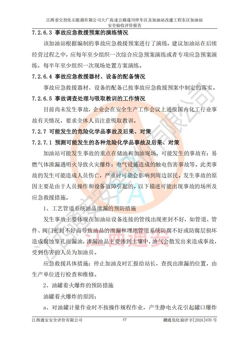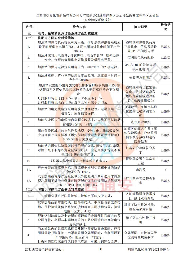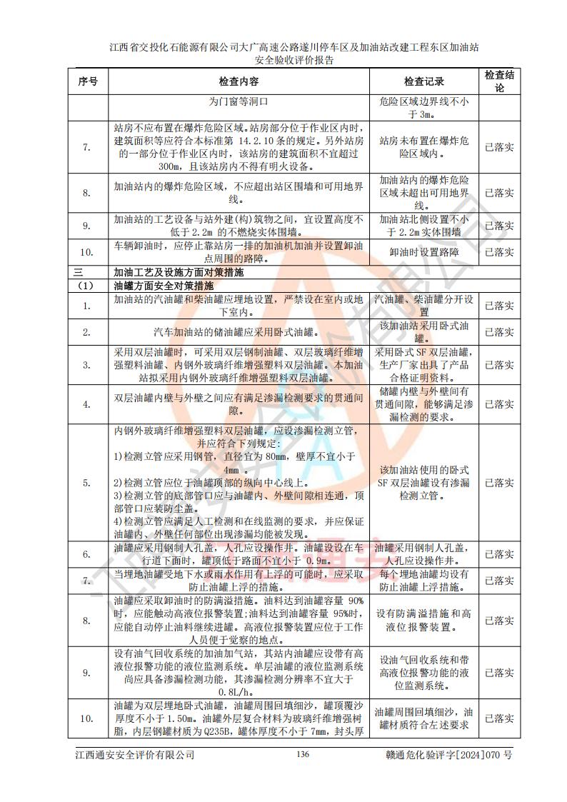 評(píng)價(jià)結(jié)論 | 該加油站在設(shè)計(jì)、施工過(guò)程中符合《危險(xiǎn)化學(xué)品建設(shè)項(xiàng)目安全監(jiān)督管理辦法》(2012年1月30日**安全生產(chǎn)監(jiān)督管理總局令第45號(hào)公布,自2012年4月1日起施行;根據(jù)2015年5月27日**安全生產(chǎn)監(jiān)督管理總局令第79號(hào)修正)等法規(guī)的要求,工程配套的安全設(shè)施做到了與主體工程同時(shí)設(shè)計(jì)、同時(shí)施工、同時(shí)投入生產(chǎn)和使用,符合**有關(guān)建設(shè)項(xiàng)目“三同時(shí)”的規(guī)定和要求。 該加油站現(xiàn)場(chǎng)情況與竣工圖紙一致,主體工程安全設(shè)施、安全措施符合法律法規(guī)的規(guī)定和要求,安全設(shè)施正常投用并運(yùn)行**;公用工程及輔助設(shè)施滿足主體工程生產(chǎn)安全的需要;企業(yè)安全管理體系滿足生產(chǎn)安全的要求。該加油站與周邊裝置和設(shè)施的安全防護(hù)距離、安全設(shè)施滿足標(biāo)準(zhǔn)規(guī)范的要求,該加油站的安全條件滿足安全生產(chǎn)的要求。 該加油站已針對(duì)本報(bào)告提出的安全隱患整改意見(jiàn)組織人員進(jìn)行整改,已落實(shí)到位,企業(yè)安全生產(chǎn)的風(fēng)險(xiǎn)控制在可以接受的范圍內(nèi)。 綜上所述,江西省交投化石能源有限公司大廣高速公路遂川停車(chē)區(qū)及加油站改建工程?hào)|區(qū)加油站具備**有關(guān)安全生產(chǎn)法律、法規(guī)、部門(mén)規(guī)章及標(biāo)準(zhǔn)規(guī)范要求的安全條件,符合經(jīng)營(yíng)和儲(chǔ)存危險(xiǎn)化學(xué)品的安全條件要求,具備安全驗(yàn)收的要求。 | |||