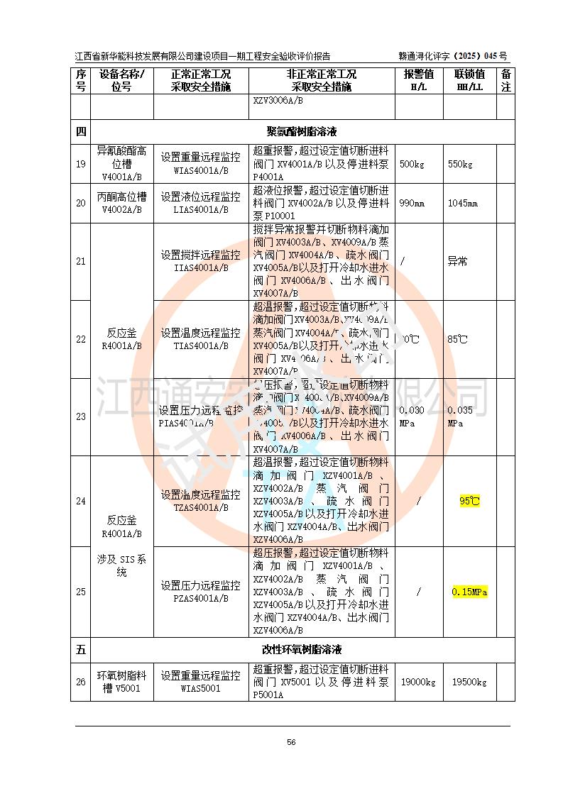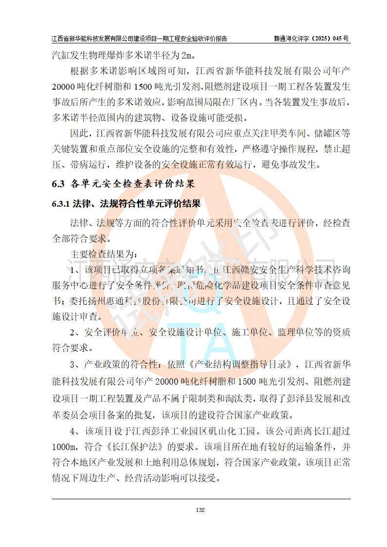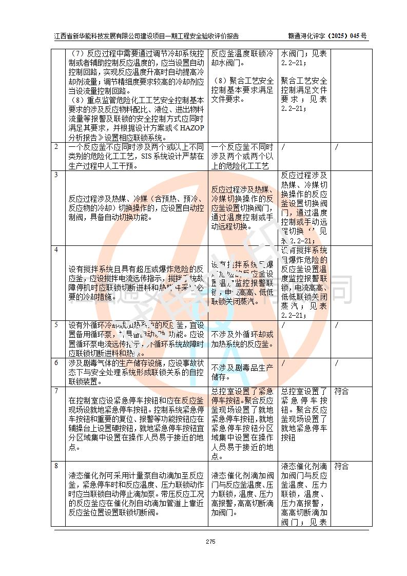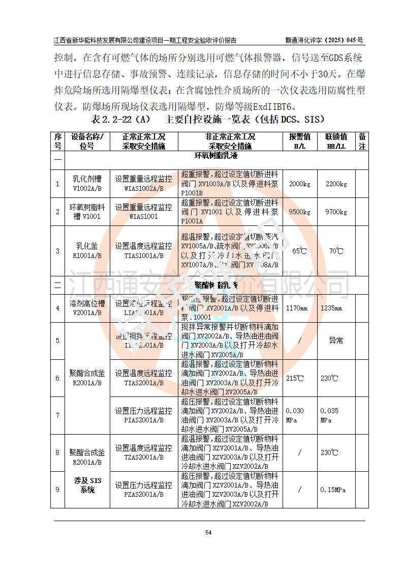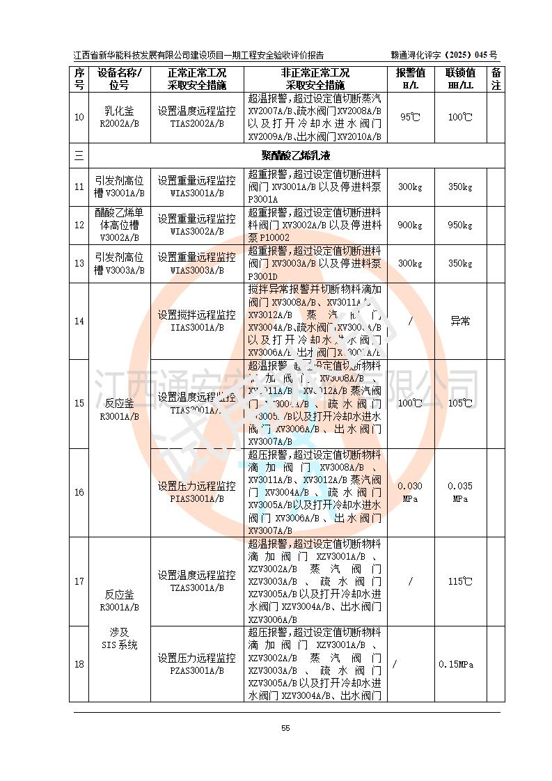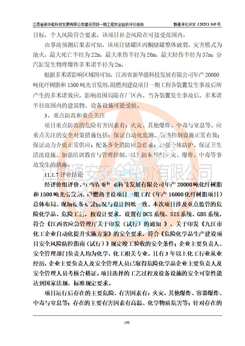 評(píng)價(jià)結(jié)論 | 經(jīng)評(píng)價(jià)組評(píng)價(jià),江西省新華能科技發(fā)展有限公司年產(chǎn)20000噸化纖樹脂和1500噸光引發(fā)劑、阻燃劑建設(shè)項(xiàng)目一期工程(年產(chǎn)16000化纖樹脂項(xiàng)目)總體布局、現(xiàn)場設(shè)備布置情況與設(shè)計(jì)圖紙一致,本次項(xiàng)目涉及重點(diǎn)監(jiān)管的危險(xiǎn)化學(xué)品、危險(xiǎn)工藝,按設(shè)計(jì)要求,設(shè)置有DCS系統(tǒng)、SIS系統(tǒng)、GDS系統(tǒng),符合《江西省應(yīng)急管理廳關(guān)于印發(fā)(試行)的通知 》、關(guān)于印發(fā)《九江市化工企業(yè)自動(dòng)化提升實(shí)施方案》的安全要求,符合《危險(xiǎn)化學(xué)品生產(chǎn)建設(shè)項(xiàng)目安全風(fēng)險(xiǎn)防控指南(試行)》規(guī)定竣工驗(yàn)收的安全條件;企業(yè)主要負(fù)責(zé)人、安全管理部門負(fù)責(zé)人均為化學(xué)、化工相關(guān)專業(yè),且有3年以上化工行業(yè)從業(yè)經(jīng)歷,企業(yè)主要負(fù)責(zé)人及安全管理人員已取得危險(xiǎn)化學(xué)品企業(yè)主要負(fù)責(zé)人及安全管理人員考核合格證。項(xiàng)目選擇的工藝過程及設(shè)備設(shè)施的安全可靠性能 達(dá)到**法規(guī)、標(biāo)準(zhǔn)規(guī)定要求。 項(xiàng)目運(yùn)行后存在的主要危險(xiǎn)、有害因素有:火災(zāi)、其他爆炸、容器爆炸、中毒與窒息等;存在的主要有害因素有高溫、化學(xué)物質(zhì)危害等;針對(duì)存在的危險(xiǎn)、有害因素,企業(yè)采取了**的安全技術(shù)措施及安全管理措施,符合**有關(guān)法規(guī)、標(biāo)準(zhǔn)、規(guī)范要求;項(xiàng)目風(fēng)險(xiǎn)可控,其安全生產(chǎn)條件和安全管理 方面具備竣工安全驗(yàn)收的條件。 | |||||