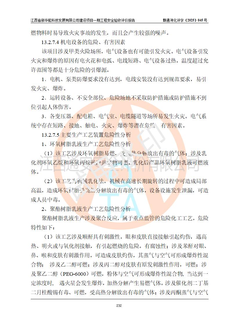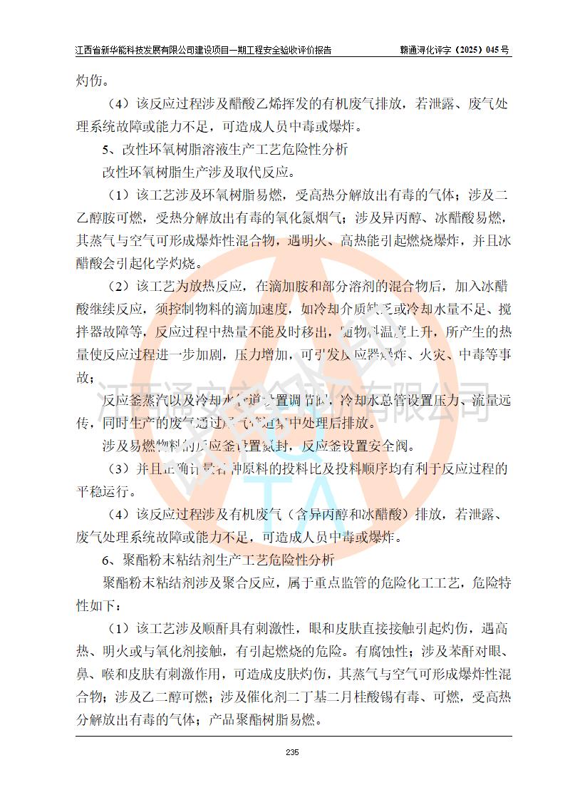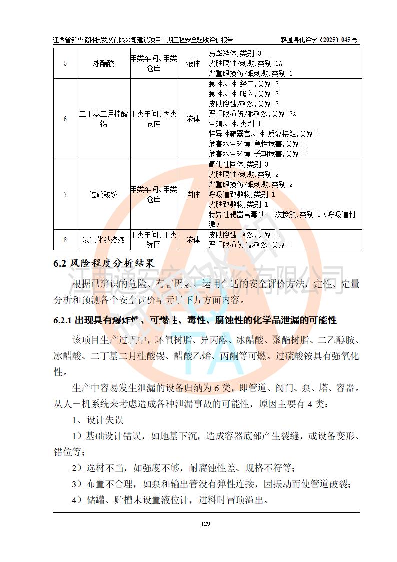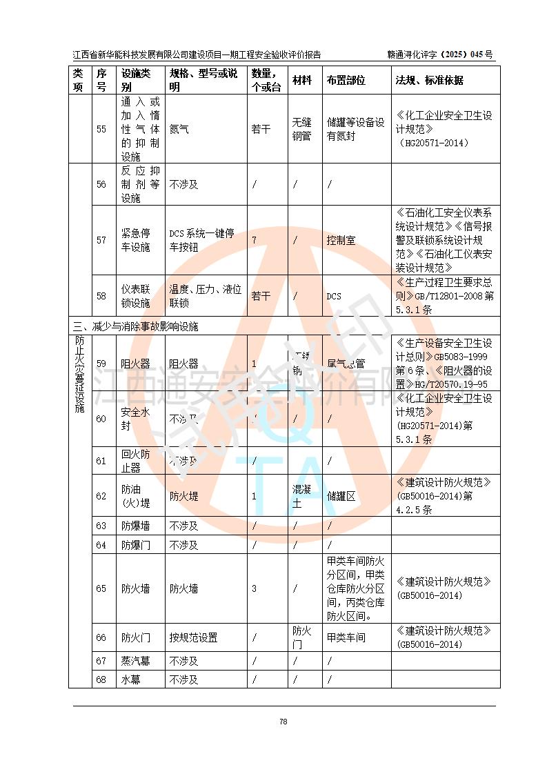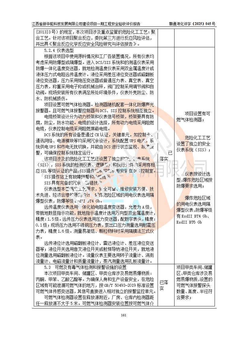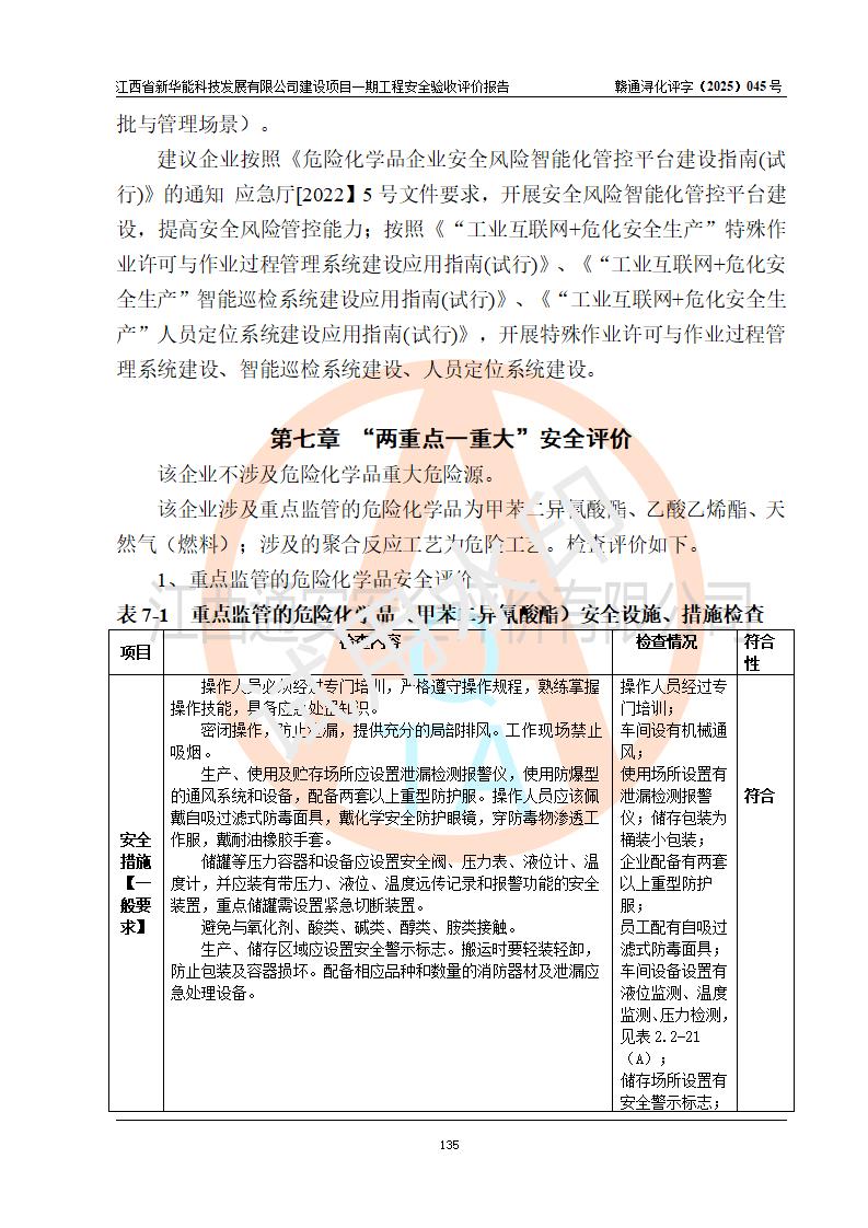 評(píng)價(jià)結(jié)論 | 經(jīng)評(píng)價(jià)組評(píng)價(jià),江西省新華能科技發(fā)展有限公司年產(chǎn)20000噸化纖樹脂和1500噸光引發(fā)劑、阻燃劑建設(shè)項(xiàng)目一期工程(年產(chǎn)16000化纖樹脂項(xiàng)目)總體布局、現(xiàn)場設(shè)備布置情況與設(shè)計(jì)圖紙一致,本次項(xiàng)目涉及重點(diǎn)監(jiān)管的危險(xiǎn)化學(xué)品、危險(xiǎn)工藝,按設(shè)計(jì)要求,設(shè)置有DCS系統(tǒng)、SIS系統(tǒng)、GDS系統(tǒng),符合《江西省應(yīng)急管理廳關(guān)于印發(fā)(試行)的通知 》、關(guān)于印發(fā)《九江市化工企業(yè)自動(dòng)化提升實(shí)施方案》的安全要求,符合《危險(xiǎn)化學(xué)品生產(chǎn)建設(shè)項(xiàng)目安全風(fēng)險(xiǎn)防控指南(試行)》規(guī)定竣工驗(yàn)收的安全條件;企業(yè)主要負(fù)責(zé)人、安全管理部門負(fù)責(zé)人均為化學(xué)、化工相關(guān)專業(yè),且有3年以上化工行業(yè)從業(yè)經(jīng)歷,企業(yè)主要負(fù)責(zé)人及安全管理人員已取得危險(xiǎn)化學(xué)品企業(yè)主要負(fù)責(zé)人及安全管理人員考核合格證。項(xiàng)目選擇的工藝過程及設(shè)備設(shè)施的安全可靠性能 達(dá)到**法規(guī)、標(biāo)準(zhǔn)規(guī)定要求。 項(xiàng)目運(yùn)行后存在的主要危險(xiǎn)、有害因素有:火災(zāi)、其他爆炸、容器爆炸、中毒與窒息等;存在的主要有害因素有高溫、化學(xué)物質(zhì)危害等;針對(duì)存在的危險(xiǎn)、有害因素,企業(yè)采取了**的安全技術(shù)措施及安全管理措施,符合**有關(guān)法規(guī)、標(biāo)準(zhǔn)、規(guī)范要求;項(xiàng)目風(fēng)險(xiǎn)可控,其安全生產(chǎn)條件和安全管理 方面具備竣工安全驗(yàn)收的條件。 | |||||