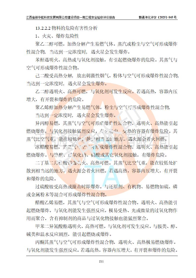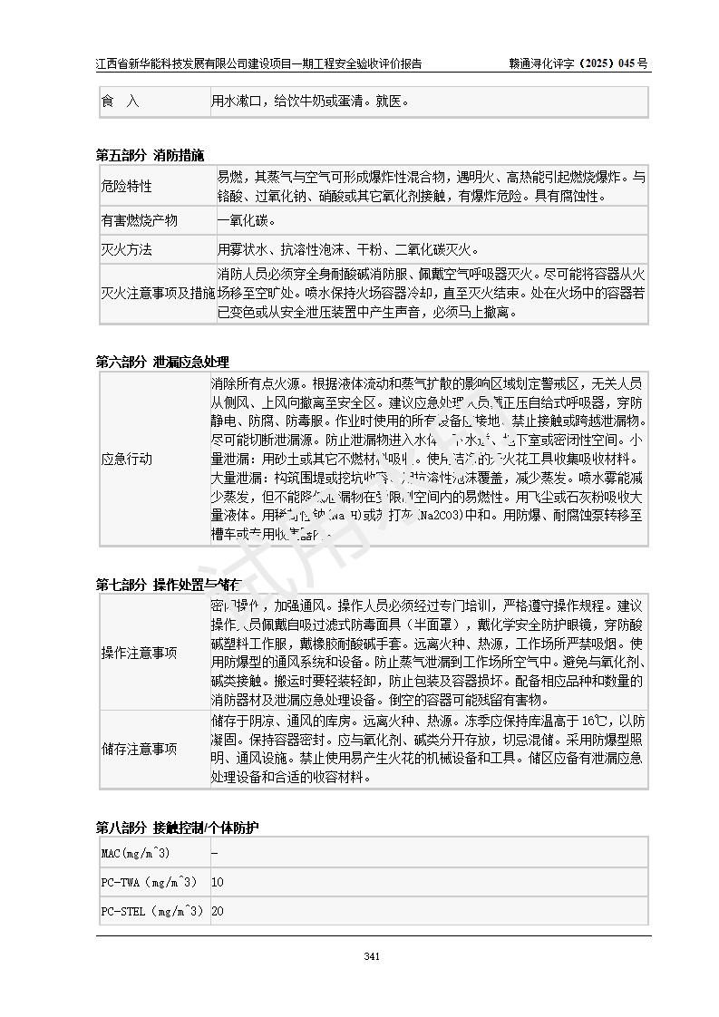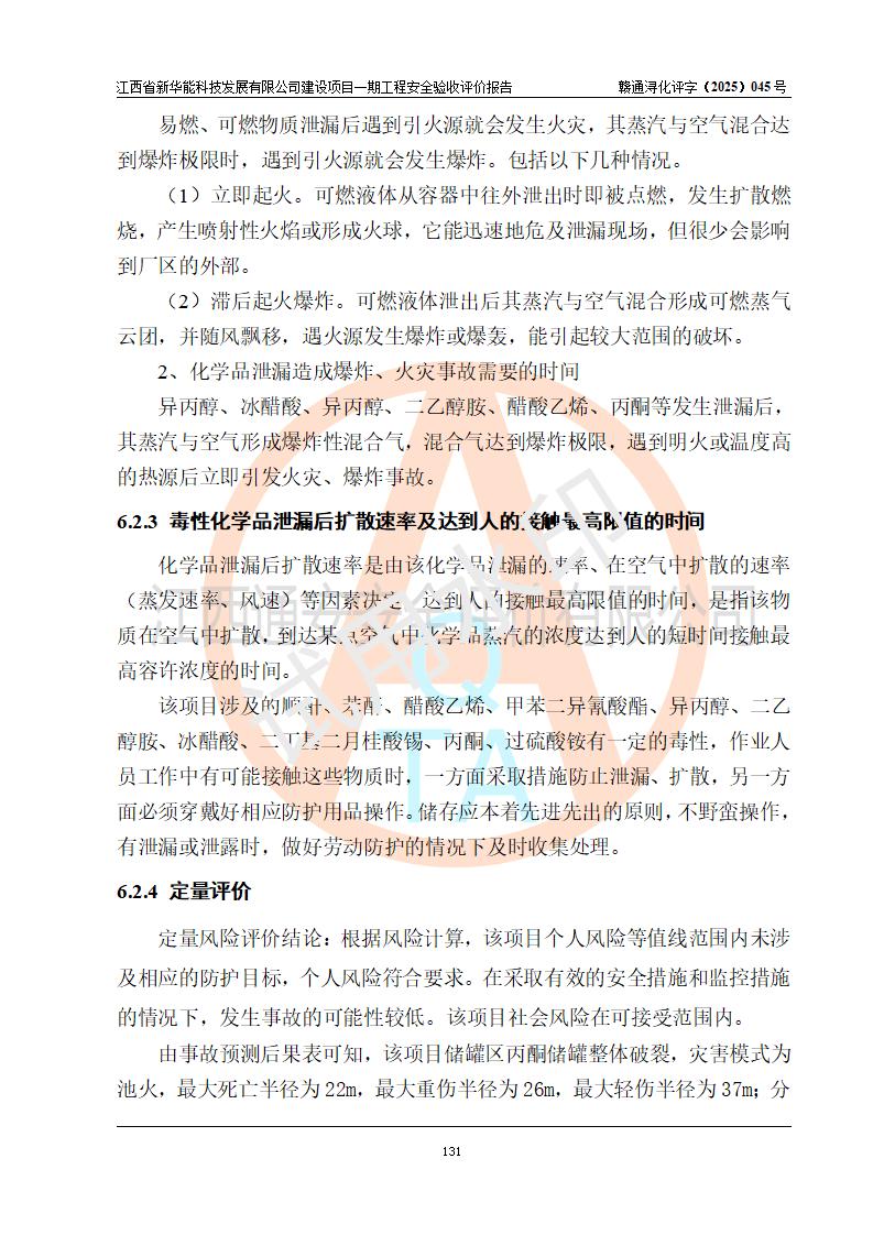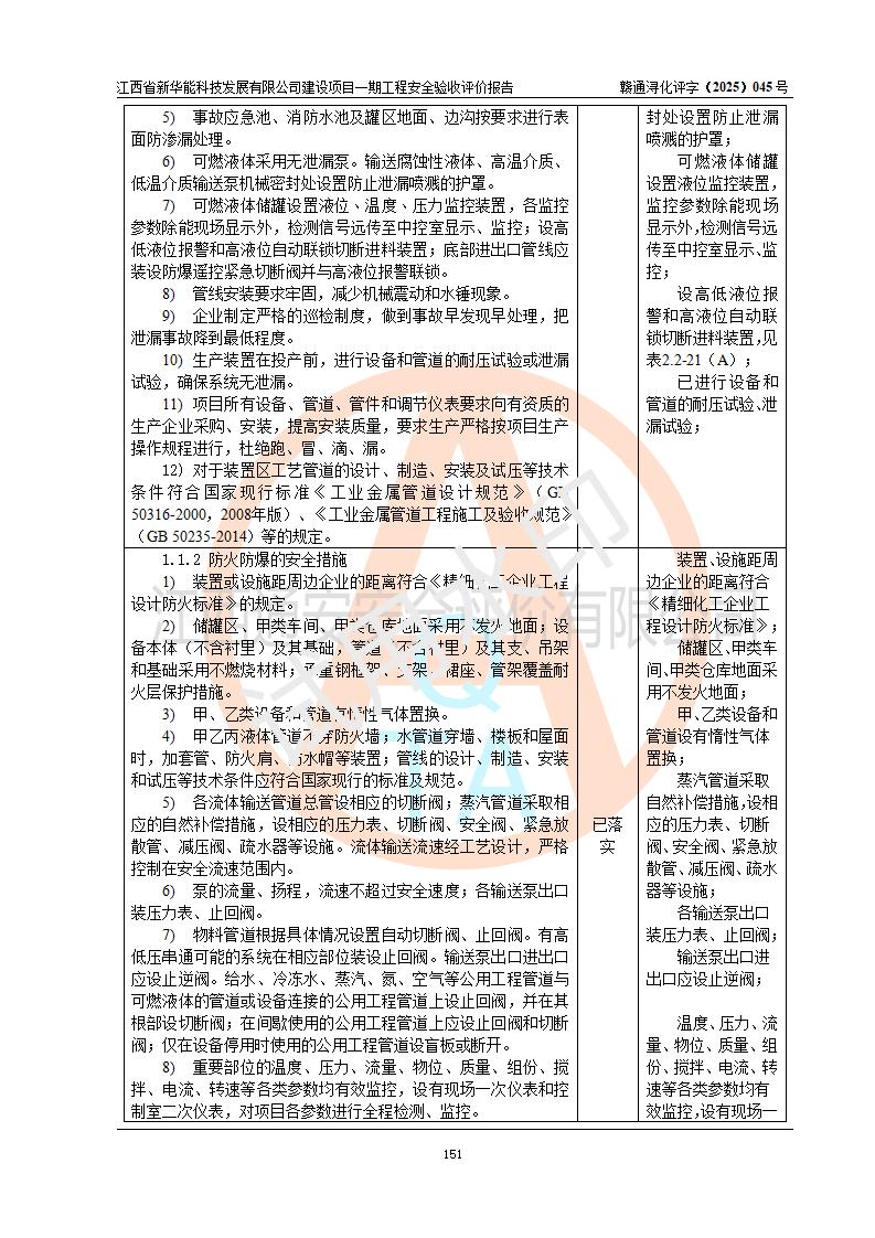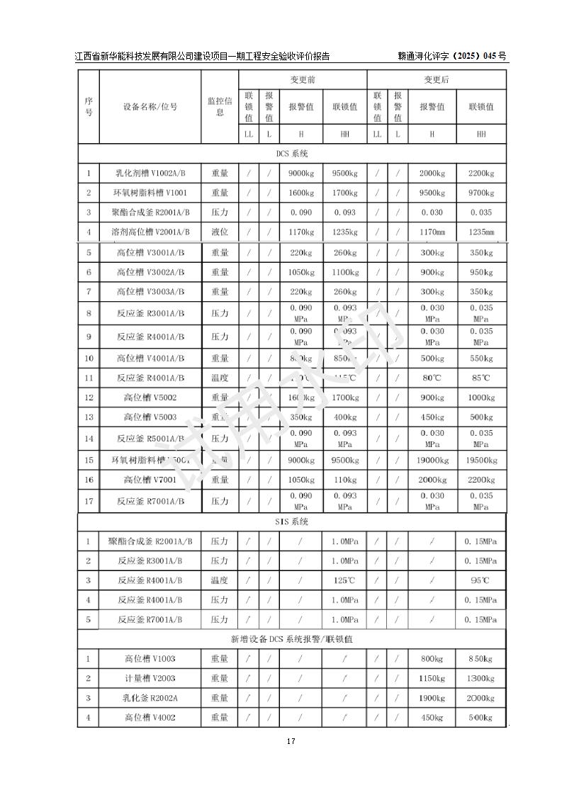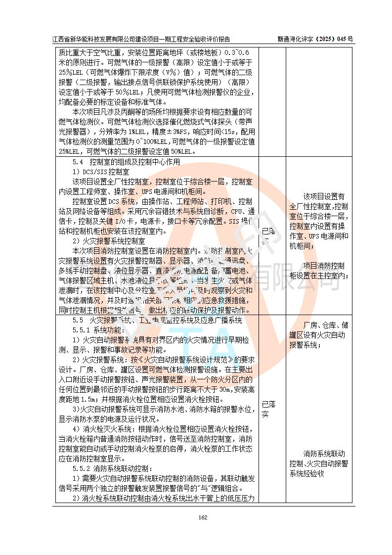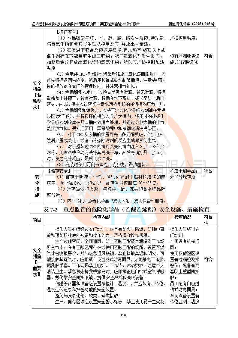 評(píng)價(jià)結(jié)論 | 經(jīng)評(píng)價(jià)組評(píng)價(jià),江西省新華能科技發(fā)展有限公司年產(chǎn)20000噸化纖樹脂和1500噸光引發(fā)劑、阻燃劑建設(shè)項(xiàng)目一期工程(年產(chǎn)16000化纖樹脂項(xiàng)目)總體布局、現(xiàn)場設(shè)備布置情況與設(shè)計(jì)圖紙一致,本次項(xiàng)目涉及重點(diǎn)監(jiān)管的危險(xiǎn)化學(xué)品、危險(xiǎn)工藝,按設(shè)計(jì)要求,設(shè)置有DCS系統(tǒng)、SIS系統(tǒng)、GDS系統(tǒng),符合《江西省應(yīng)急管理廳關(guān)于印發(fā)(試行)的通知 》、關(guān)于印發(fā)《九江市化工企業(yè)自動(dòng)化提升實(shí)施方案》的安全要求,符合《危險(xiǎn)化學(xué)品生產(chǎn)建設(shè)項(xiàng)目安全風(fēng)險(xiǎn)防控指南(試行)》規(guī)定竣工驗(yàn)收的安全條件;企業(yè)主要負(fù)責(zé)人、安全管理部門負(fù)責(zé)人均為化學(xué)、化工相關(guān)專業(yè),且有3年以上化工行業(yè)從業(yè)經(jīng)歷,企業(yè)主要負(fù)責(zé)人及安全管理人員已取得危險(xiǎn)化學(xué)品企業(yè)主要負(fù)責(zé)人及安全管理人員考核合格證。項(xiàng)目選擇的工藝過程及設(shè)備設(shè)施的安全可靠性能 達(dá)到**法規(guī)、標(biāo)準(zhǔn)規(guī)定要求。 項(xiàng)目運(yùn)行后存在的主要危險(xiǎn)、有害因素有:火災(zāi)、其他爆炸、容器爆炸、中毒與窒息等;存在的主要有害因素有高溫、化學(xué)物質(zhì)危害等;針對(duì)存在的危險(xiǎn)、有害因素,企業(yè)采取了**的安全技術(shù)措施及安全管理措施,符合**有關(guān)法規(guī)、標(biāo)準(zhǔn)、規(guī)范要求;項(xiàng)目風(fēng)險(xiǎn)可控,其安全生產(chǎn)條件和安全管理 方面具備竣工安全驗(yàn)收的條件。 | |||||