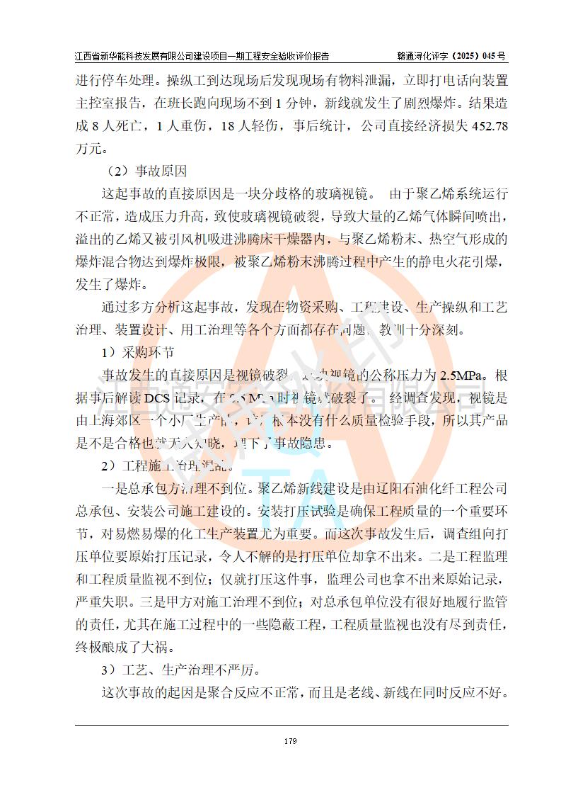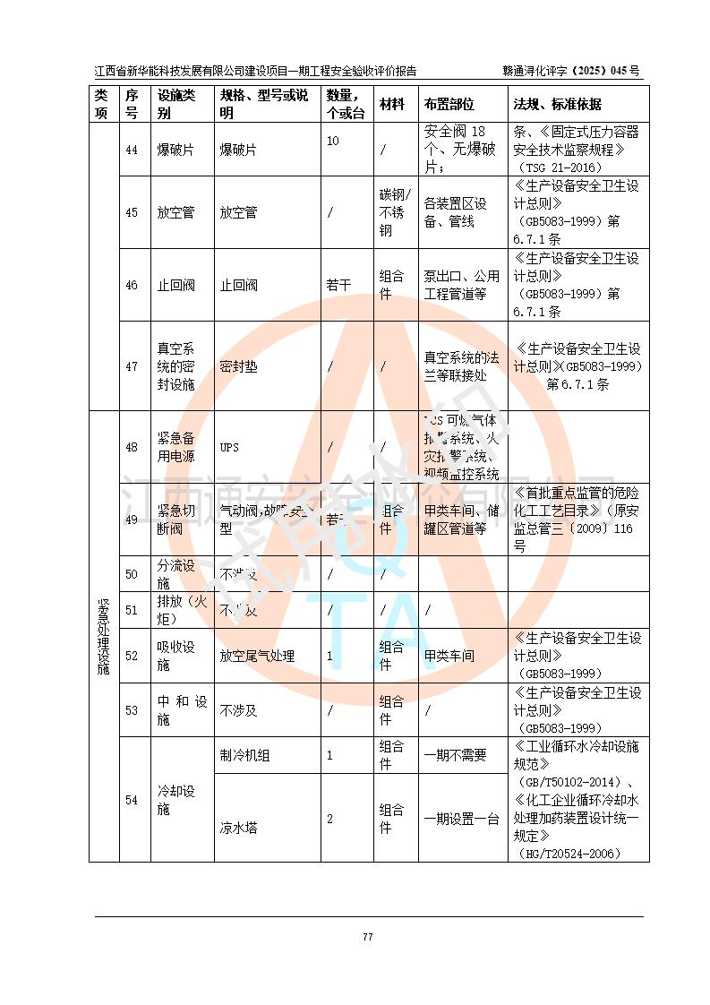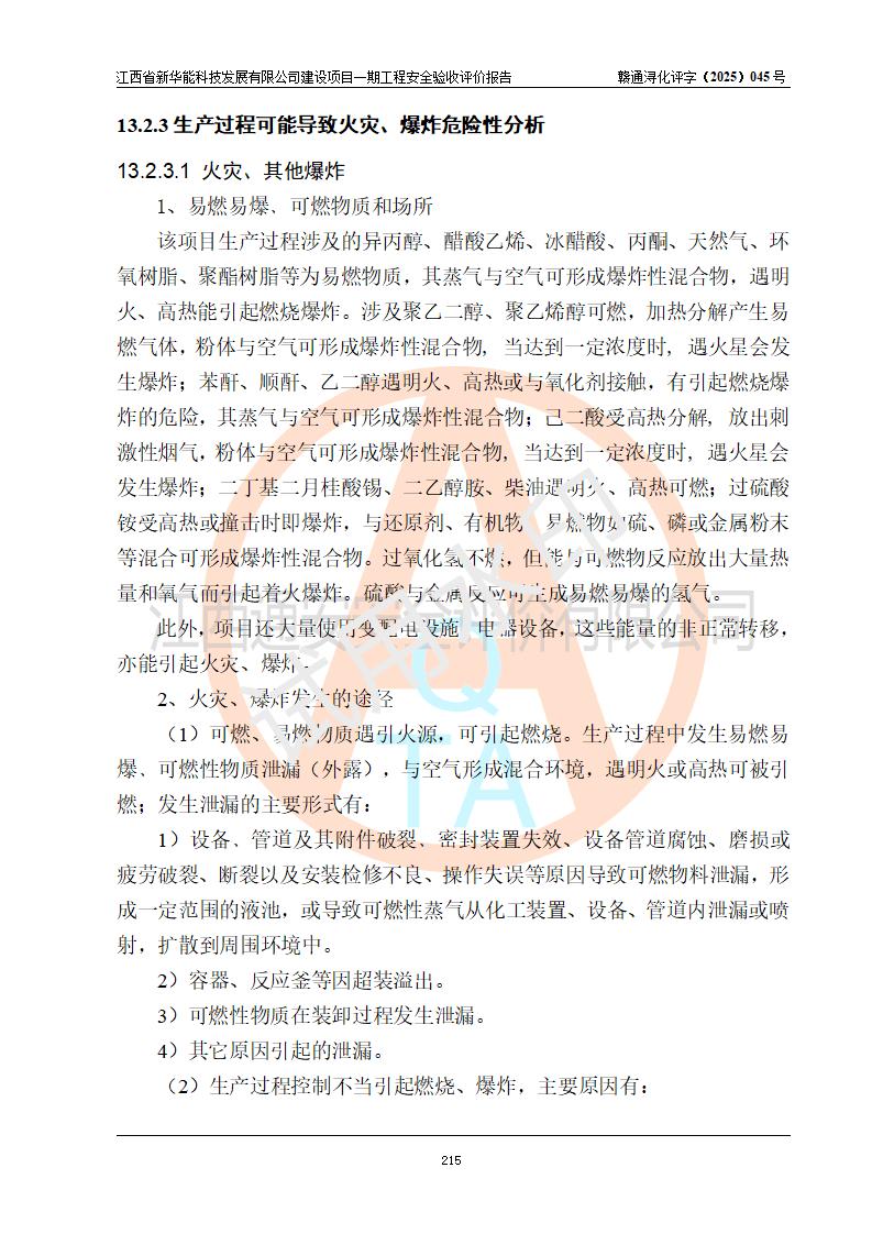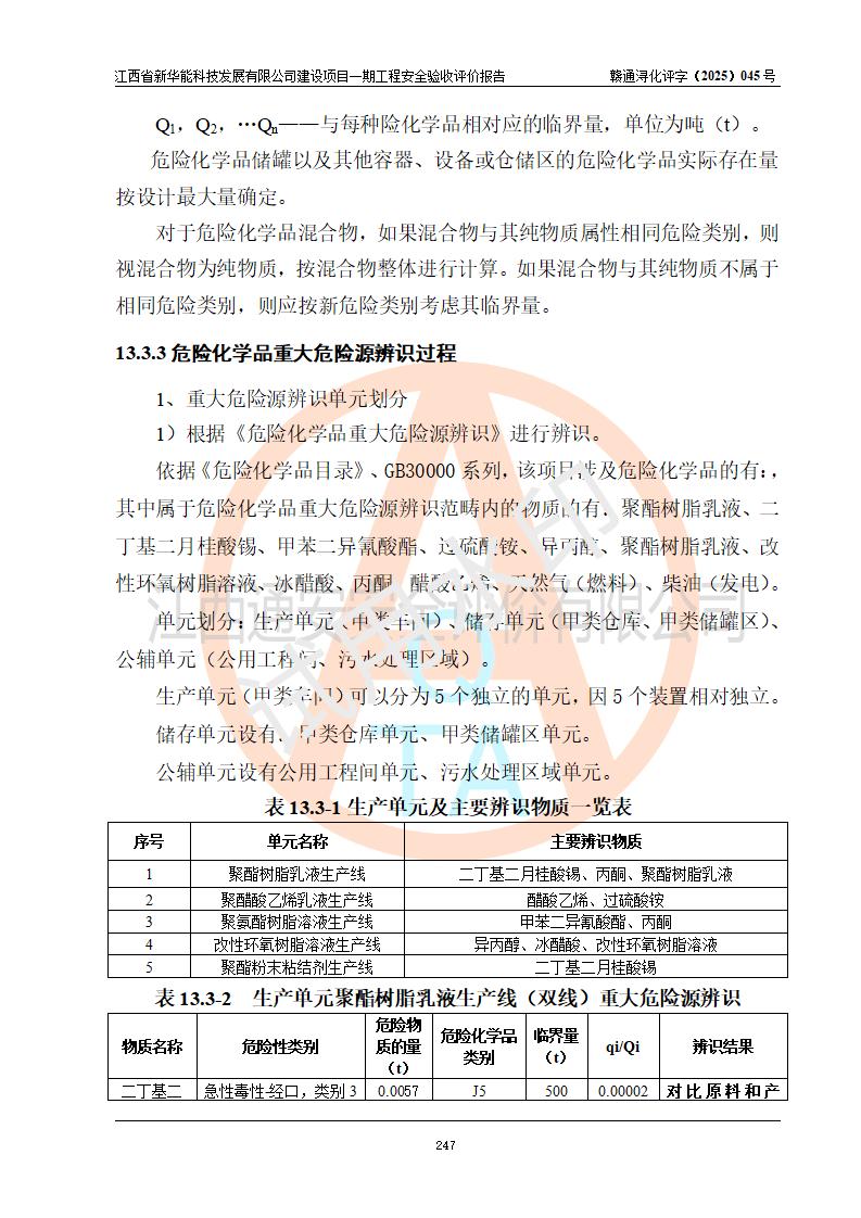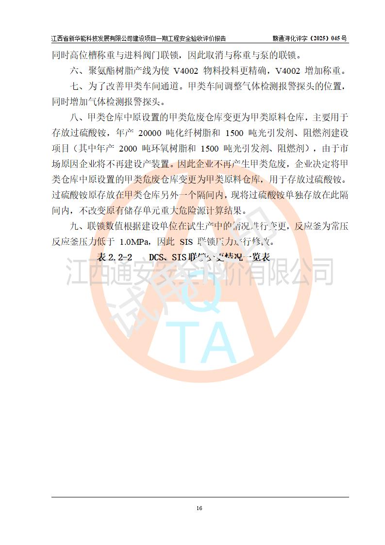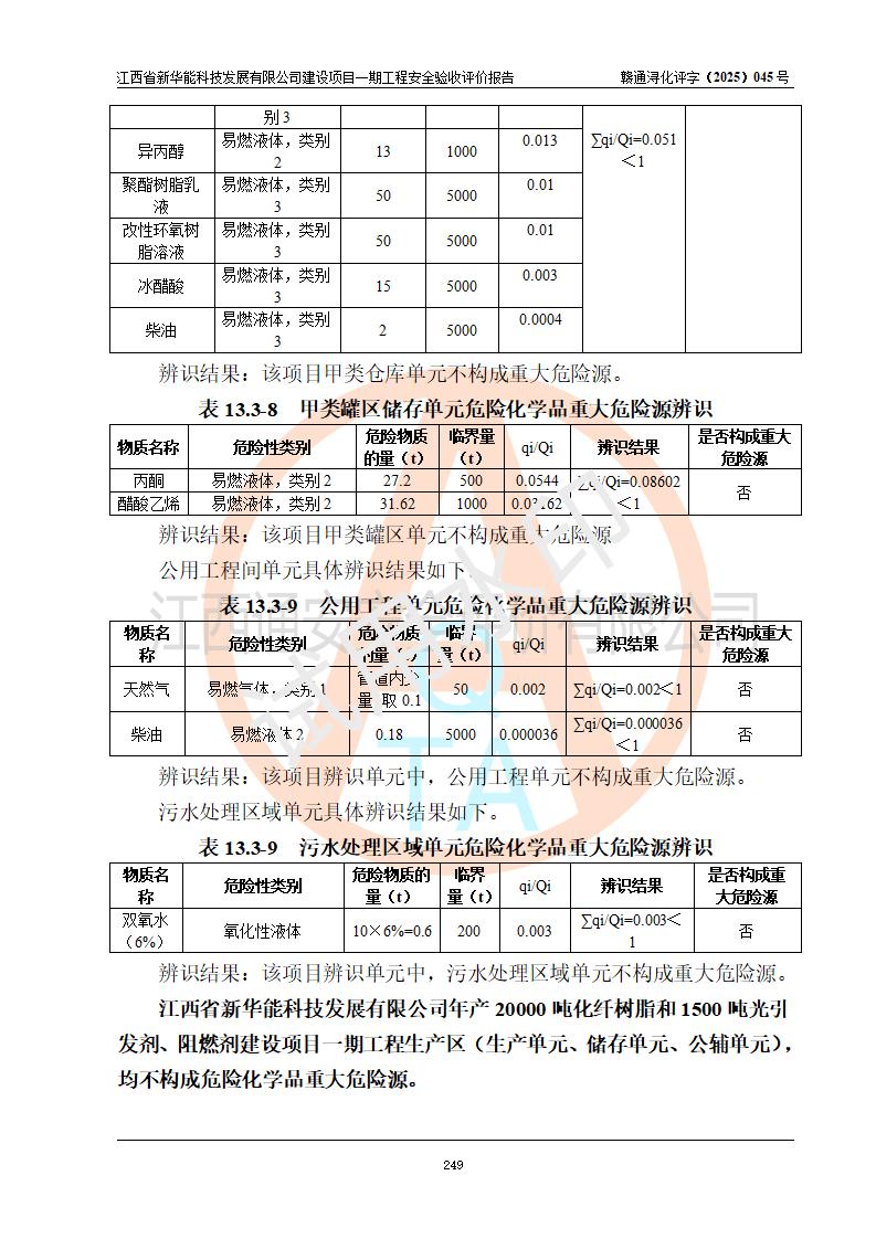 評(píng)價(jià)結(jié)論 | 經(jīng)評(píng)價(jià)組評(píng)價(jià),江西省新華能科技發(fā)展有限公司年產(chǎn)20000噸化纖樹脂和1500噸光引發(fā)劑、阻燃劑建設(shè)項(xiàng)目一期工程(年產(chǎn)16000化纖樹脂項(xiàng)目)總體布局、現(xiàn)場設(shè)備布置情況與設(shè)計(jì)圖紙一致,本次項(xiàng)目涉及重點(diǎn)監(jiān)管的危險(xiǎn)化學(xué)品、危險(xiǎn)工藝,按設(shè)計(jì)要求,設(shè)置有DCS系統(tǒng)、SIS系統(tǒng)、GDS系統(tǒng),符合《江西省應(yīng)急管理廳關(guān)于印發(fā)(試行)的通知 》、關(guān)于印發(fā)《九江市化工企業(yè)自動(dòng)化提升實(shí)施方案》的安全要求,符合《危險(xiǎn)化學(xué)品生產(chǎn)建設(shè)項(xiàng)目安全風(fēng)險(xiǎn)防控指南(試行)》規(guī)定竣工驗(yàn)收的安全條件;企業(yè)主要負(fù)責(zé)人、安全管理部門負(fù)責(zé)人均為化學(xué)、化工相關(guān)專業(yè),且有3年以上化工行業(yè)從業(yè)經(jīng)歷,企業(yè)主要負(fù)責(zé)人及安全管理人員已取得危險(xiǎn)化學(xué)品企業(yè)主要負(fù)責(zé)人及安全管理人員考核合格證。項(xiàng)目選擇的工藝過程及設(shè)備設(shè)施的安全可靠性能 達(dá)到**法規(guī)、標(biāo)準(zhǔn)規(guī)定要求。 項(xiàng)目運(yùn)行后存在的主要危險(xiǎn)、有害因素有:火災(zāi)、其他爆炸、容器爆炸、中毒與窒息等;存在的主要有害因素有高溫、化學(xué)物質(zhì)危害等;針對(duì)存在的危險(xiǎn)、有害因素,企業(yè)采取了**的安全技術(shù)措施及安全管理措施,符合**有關(guān)法規(guī)、標(biāo)準(zhǔn)、規(guī)范要求;項(xiàng)目風(fēng)險(xiǎn)可控,其安全生產(chǎn)條件和安全管理 方面具備竣工安全驗(yàn)收的條件。 | |||||