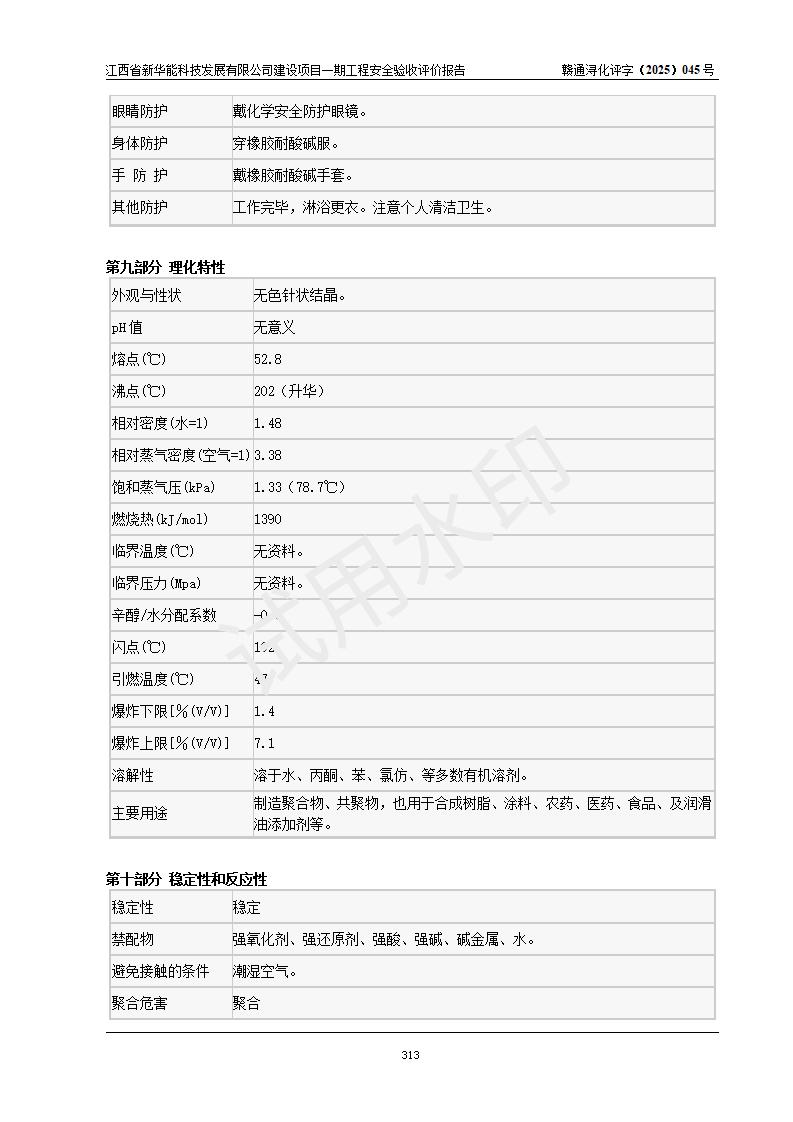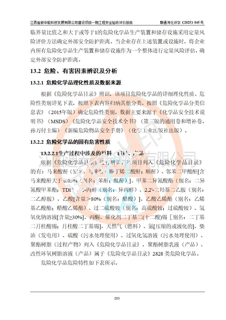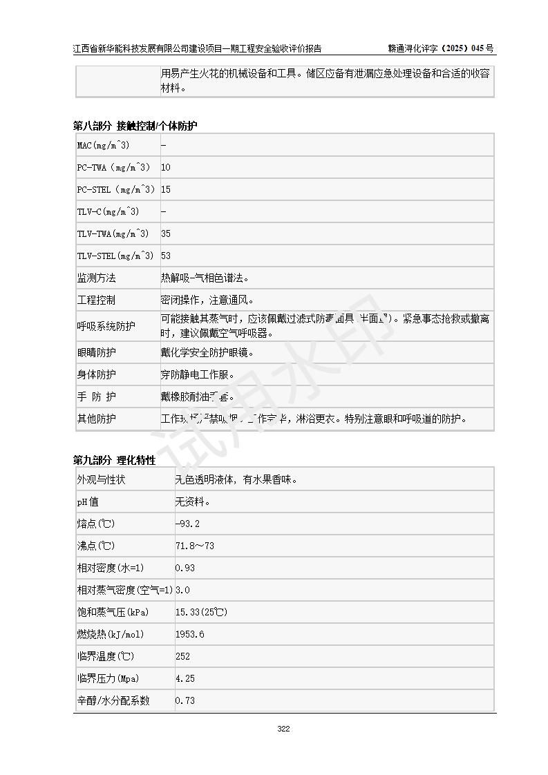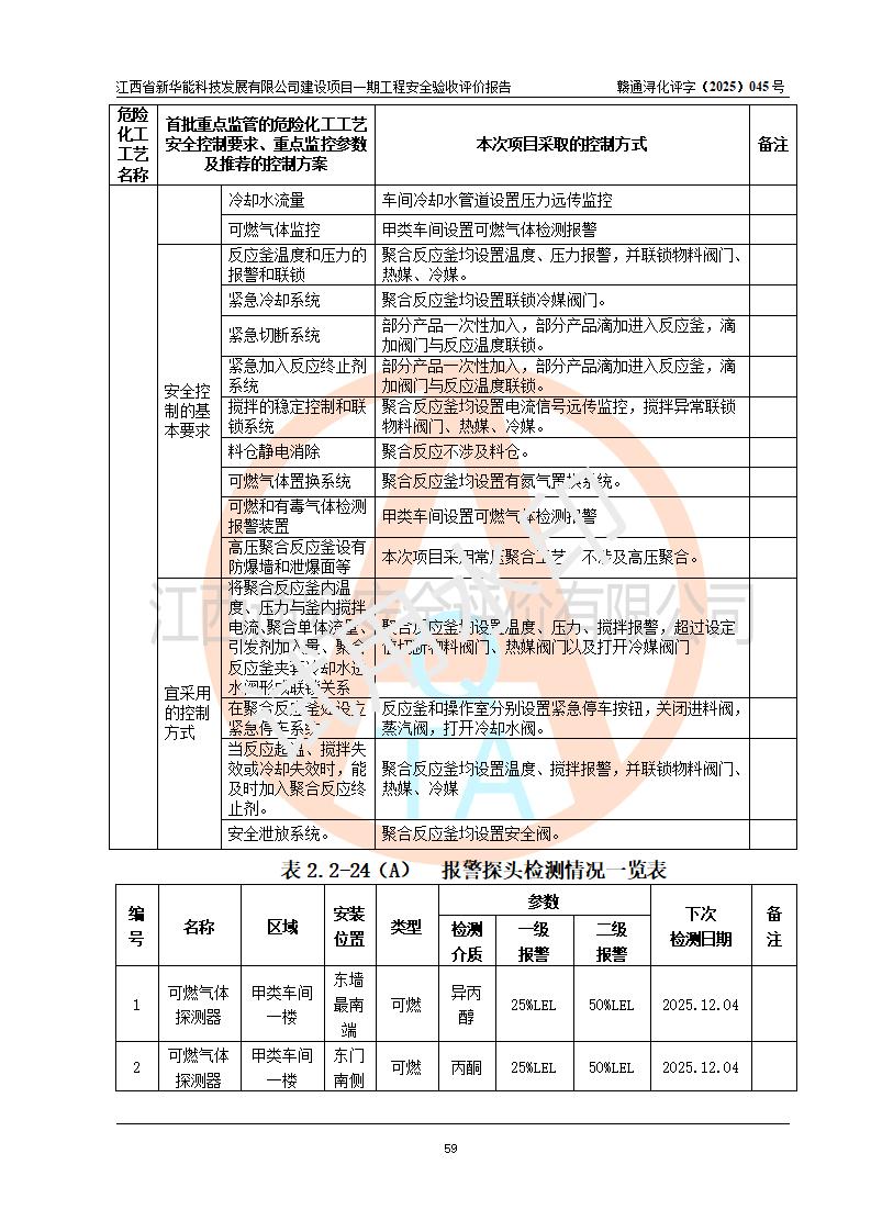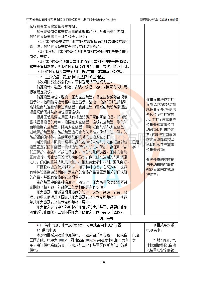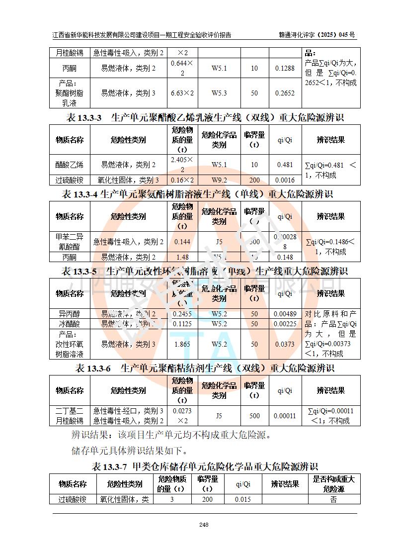 評(píng)價(jià)結(jié)論 | 經(jīng)評(píng)價(jià)組評(píng)價(jià),江西省新華能科技發(fā)展有限公司年產(chǎn)20000噸化纖樹脂和1500噸光引發(fā)劑、阻燃劑建設(shè)項(xiàng)目一期工程(年產(chǎn)16000化纖樹脂項(xiàng)目)總體布局、現(xiàn)場設(shè)備布置情況與設(shè)計(jì)圖紙一致,本次項(xiàng)目涉及重點(diǎn)監(jiān)管的危險(xiǎn)化學(xué)品、危險(xiǎn)工藝,按設(shè)計(jì)要求,設(shè)置有DCS系統(tǒng)、SIS系統(tǒng)、GDS系統(tǒng),符合《江西省應(yīng)急管理廳關(guān)于印發(fā)(試行)的通知 》、關(guān)于印發(fā)《九江市化工企業(yè)自動(dòng)化提升實(shí)施方案》的安全要求,符合《危險(xiǎn)化學(xué)品生產(chǎn)建設(shè)項(xiàng)目安全風(fēng)險(xiǎn)防控指南(試行)》規(guī)定竣工驗(yàn)收的安全條件;企業(yè)主要負(fù)責(zé)人、安全管理部門負(fù)責(zé)人均為化學(xué)、化工相關(guān)專業(yè),且有3年以上化工行業(yè)從業(yè)經(jīng)歷,企業(yè)主要負(fù)責(zé)人及安全管理人員已取得危險(xiǎn)化學(xué)品企業(yè)主要負(fù)責(zé)人及安全管理人員考核合格證。項(xiàng)目選擇的工藝過程及設(shè)備設(shè)施的安全可靠性能 達(dá)到**法規(guī)、標(biāo)準(zhǔn)規(guī)定要求。 項(xiàng)目運(yùn)行后存在的主要危險(xiǎn)、有害因素有:火災(zāi)、其他爆炸、容器爆炸、中毒與窒息等;存在的主要有害因素有高溫、化學(xué)物質(zhì)危害等;針對(duì)存在的危險(xiǎn)、有害因素,企業(yè)采取了**的安全技術(shù)措施及安全管理措施,符合**有關(guān)法規(guī)、標(biāo)準(zhǔn)、規(guī)范要求;項(xiàng)目風(fēng)險(xiǎn)可控,其安全生產(chǎn)條件和安全管理 方面具備竣工安全驗(yàn)收的條件。 | |||||
