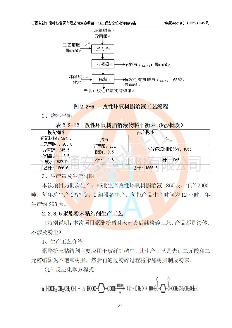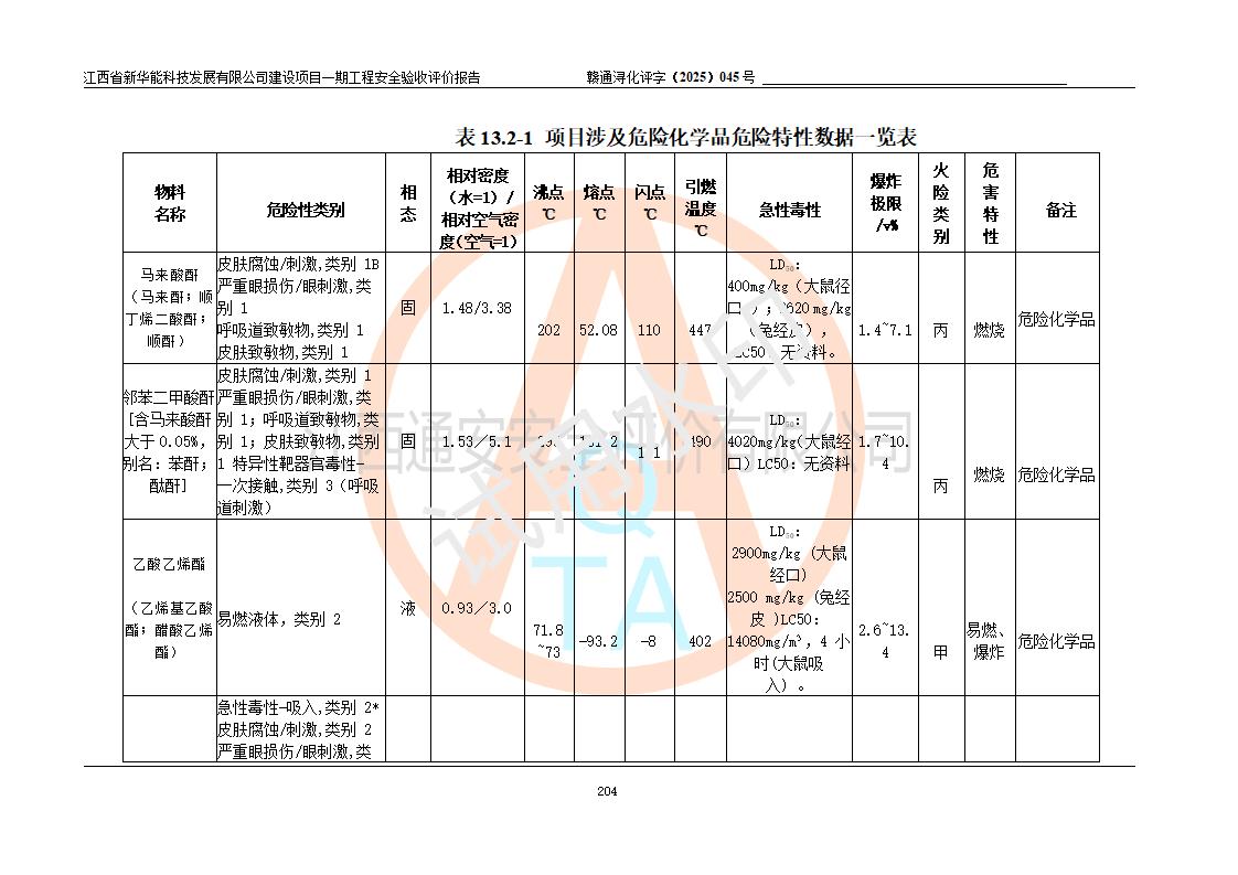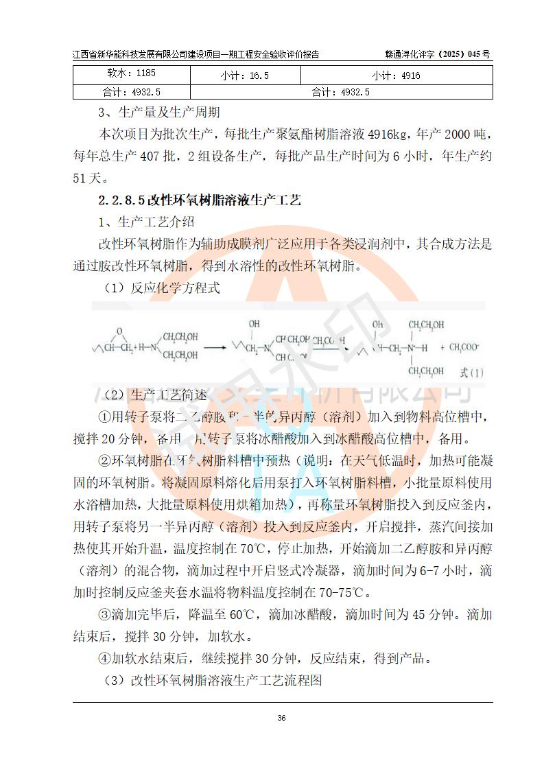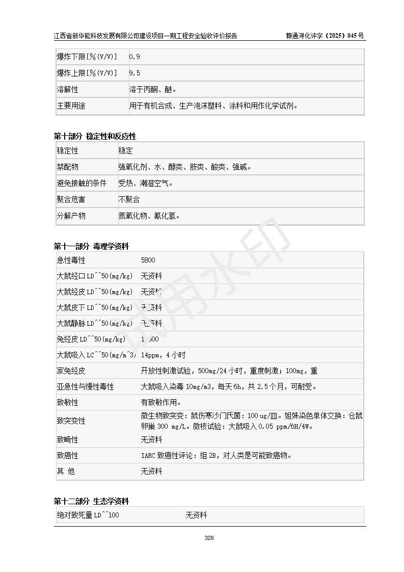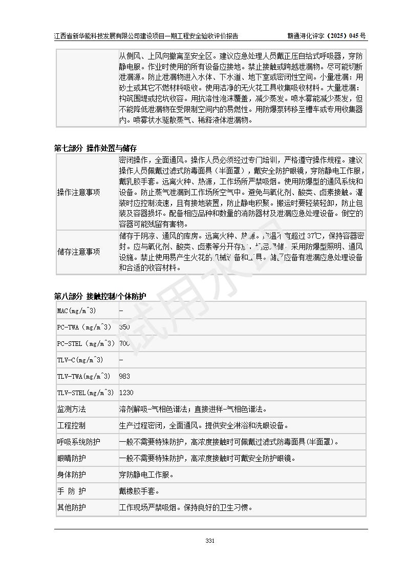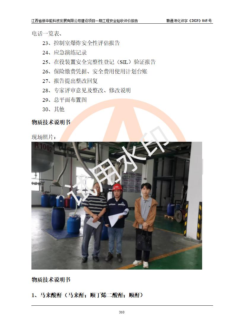 評(píng)價(jià)結(jié)論 | 經(jīng)評(píng)價(jià)組評(píng)價(jià),江西省新華能科技發(fā)展有限公司年產(chǎn)20000噸化纖樹脂和1500噸光引發(fā)劑、阻燃劑建設(shè)項(xiàng)目一期工程(年產(chǎn)16000化纖樹脂項(xiàng)目)總體布局、現(xiàn)場設(shè)備布置情況與設(shè)計(jì)圖紙一致,本次項(xiàng)目涉及重點(diǎn)監(jiān)管的危險(xiǎn)化學(xué)品、危險(xiǎn)工藝,按設(shè)計(jì)要求,設(shè)置有DCS系統(tǒng)、SIS系統(tǒng)、GDS系統(tǒng),符合《江西省應(yīng)急管理廳關(guān)于印發(fā)(試行)的通知 》、關(guān)于印發(fā)《九江市化工企業(yè)自動(dòng)化提升實(shí)施方案》的安全要求,符合《危險(xiǎn)化學(xué)品生產(chǎn)建設(shè)項(xiàng)目安全風(fēng)險(xiǎn)防控指南(試行)》規(guī)定竣工驗(yàn)收的安全條件;企業(yè)主要負(fù)責(zé)人、安全管理部門負(fù)責(zé)人均為化學(xué)、化工相關(guān)專業(yè),且有3年以上化工行業(yè)從業(yè)經(jīng)歷,企業(yè)主要負(fù)責(zé)人及安全管理人員已取得危險(xiǎn)化學(xué)品企業(yè)主要負(fù)責(zé)人及安全管理人員考核合格證。項(xiàng)目選擇的工藝過程及設(shè)備設(shè)施的安全可靠性能 達(dá)到**法規(guī)、標(biāo)準(zhǔn)規(guī)定要求。 項(xiàng)目運(yùn)行后存在的主要危險(xiǎn)、有害因素有:火災(zāi)、其他爆炸、容器爆炸、中毒與窒息等;存在的主要有害因素有高溫、化學(xué)物質(zhì)危害等;針對(duì)存在的危險(xiǎn)、有害因素,企業(yè)采取了**的安全技術(shù)措施及安全管理措施,符合**有關(guān)法規(guī)、標(biāo)準(zhǔn)、規(guī)范要求;項(xiàng)目風(fēng)險(xiǎn)可控,其安全生產(chǎn)條件和安全管理 方面具備竣工安全驗(yàn)收的條件。 | |||||