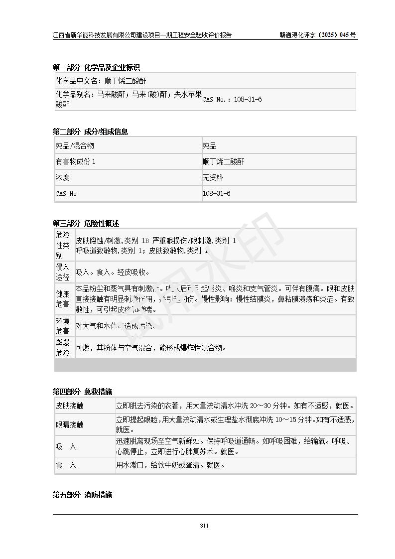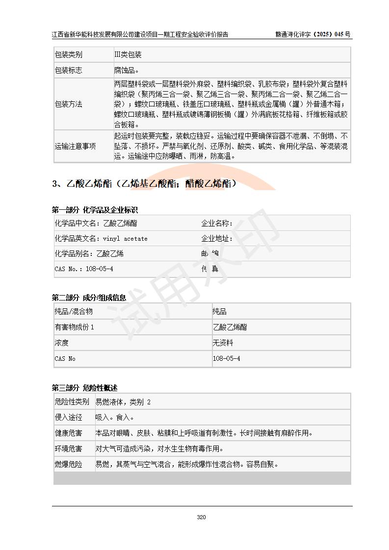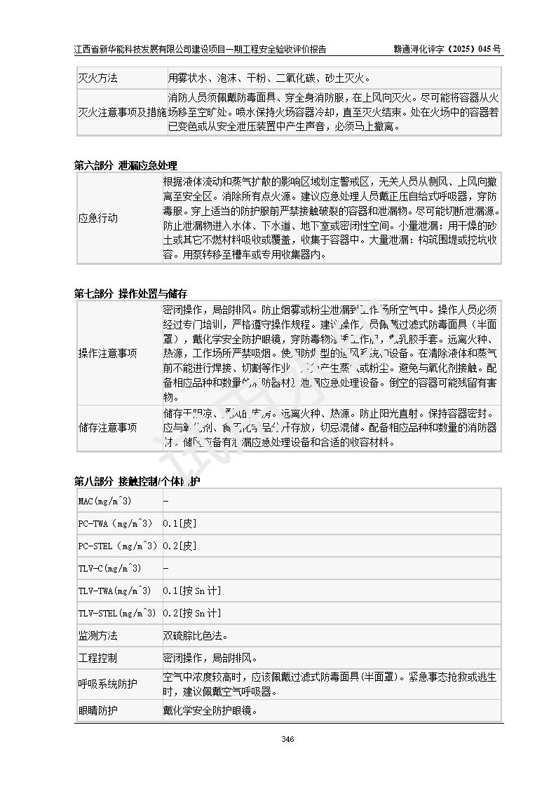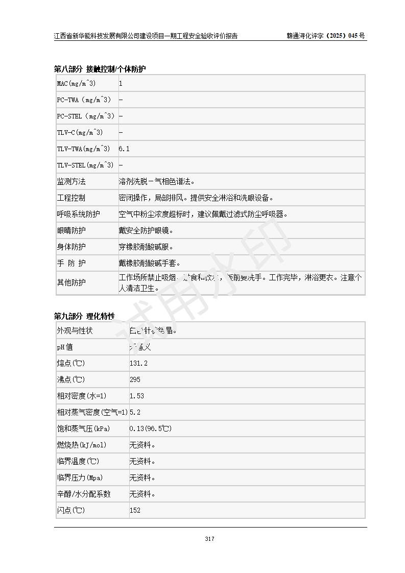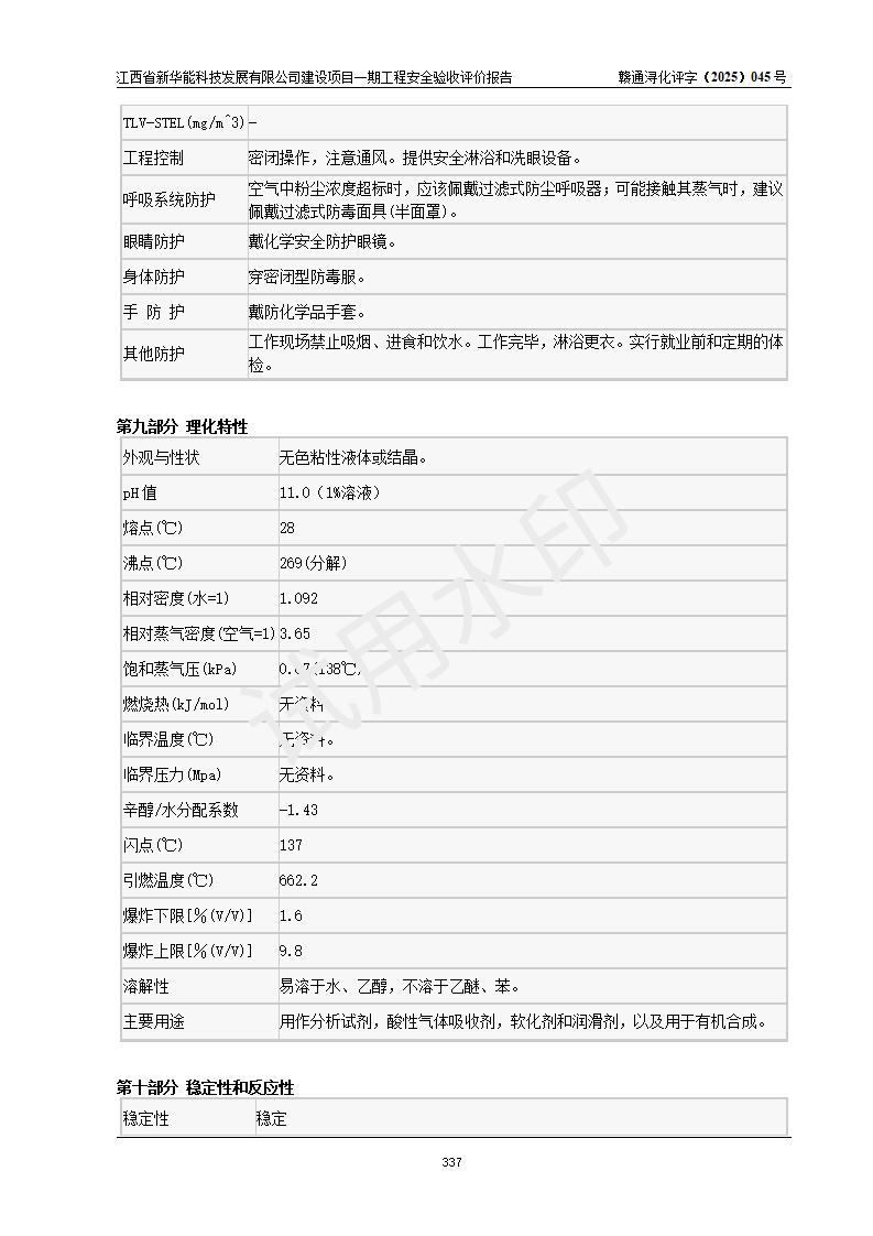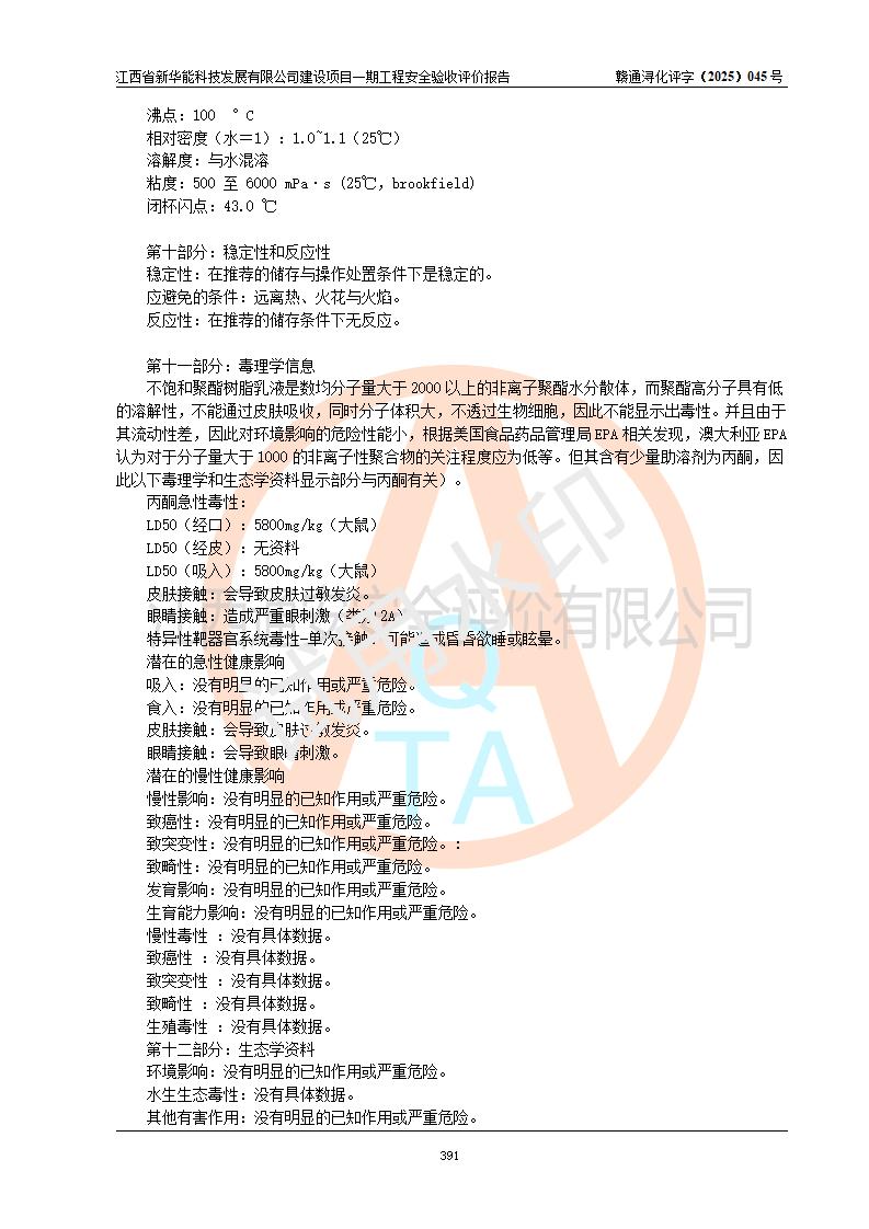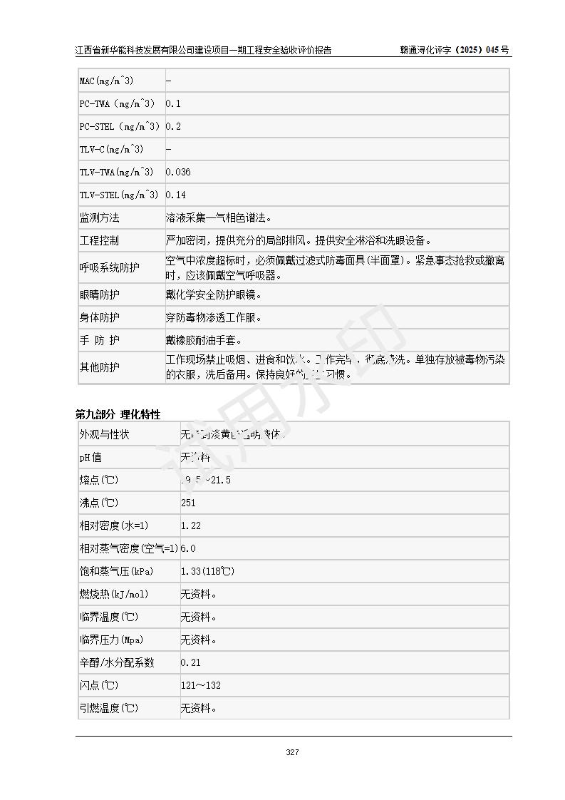 評(píng)價(jià)結(jié)論 | 經(jīng)評(píng)價(jià)組評(píng)價(jià),江西省新華能科技發(fā)展有限公司年產(chǎn)20000噸化纖樹脂和1500噸光引發(fā)劑、阻燃劑建設(shè)項(xiàng)目一期工程(年產(chǎn)16000化纖樹脂項(xiàng)目)總體布局、現(xiàn)場設(shè)備布置情況與設(shè)計(jì)圖紙一致,本次項(xiàng)目涉及重點(diǎn)監(jiān)管的危險(xiǎn)化學(xué)品、危險(xiǎn)工藝,按設(shè)計(jì)要求,設(shè)置有DCS系統(tǒng)、SIS系統(tǒng)、GDS系統(tǒng),符合《江西省應(yīng)急管理廳關(guān)于印發(fā)(試行)的通知 》、關(guān)于印發(fā)《九江市化工企業(yè)自動(dòng)化提升實(shí)施方案》的安全要求,符合《危險(xiǎn)化學(xué)品生產(chǎn)建設(shè)項(xiàng)目安全風(fēng)險(xiǎn)防控指南(試行)》規(guī)定竣工驗(yàn)收的安全條件;企業(yè)主要負(fù)責(zé)人、安全管理部門負(fù)責(zé)人均為化學(xué)、化工相關(guān)專業(yè),且有3年以上化工行業(yè)從業(yè)經(jīng)歷,企業(yè)主要負(fù)責(zé)人及安全管理人員已取得危險(xiǎn)化學(xué)品企業(yè)主要負(fù)責(zé)人及安全管理人員考核合格證。項(xiàng)目選擇的工藝過程及設(shè)備設(shè)施的安全可靠性能 達(dá)到**法規(guī)、標(biāo)準(zhǔn)規(guī)定要求。 項(xiàng)目運(yùn)行后存在的主要危險(xiǎn)、有害因素有:火災(zāi)、其他爆炸、容器爆炸、中毒與窒息等;存在的主要有害因素有高溫、化學(xué)物質(zhì)危害等;針對(duì)存在的危險(xiǎn)、有害因素,企業(yè)采取了**的安全技術(shù)措施及安全管理措施,符合**有關(guān)法規(guī)、標(biāo)準(zhǔn)、規(guī)范要求;項(xiàng)目風(fēng)險(xiǎn)可控,其安全生產(chǎn)條件和安全管理 方面具備竣工安全驗(yàn)收的條件。 | |||||