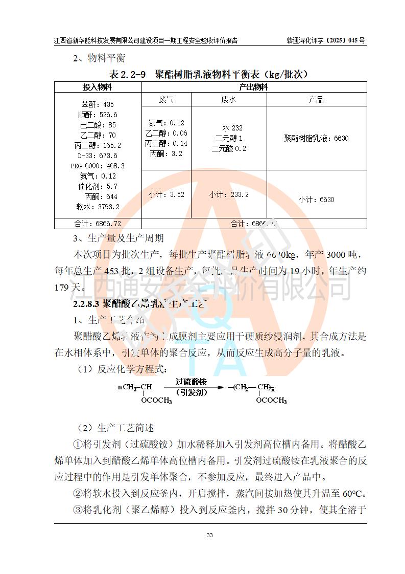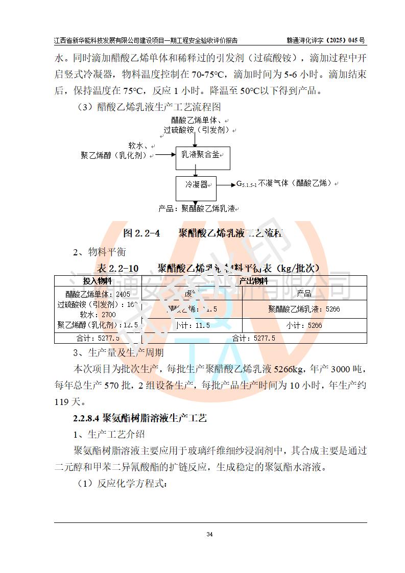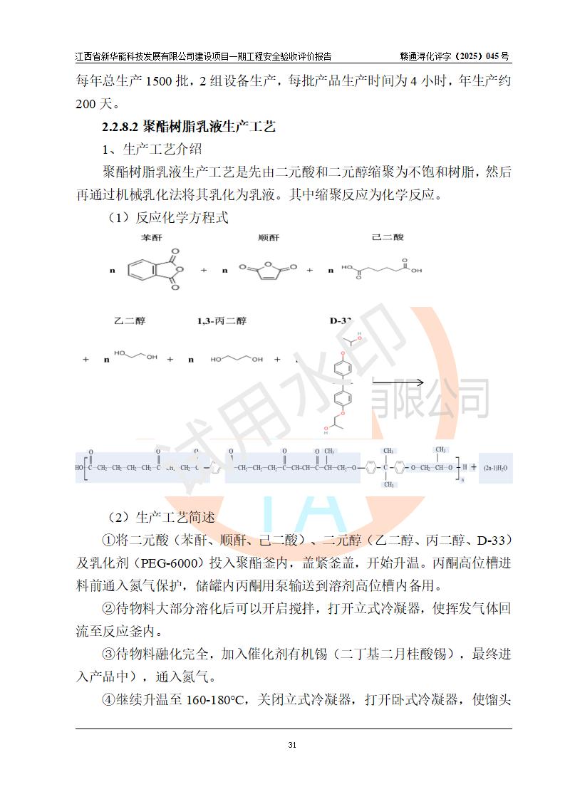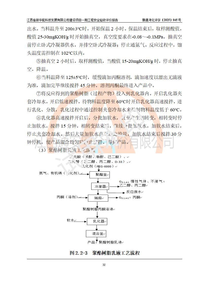項(xiàng)目簡介 | 項(xiàng)目名稱:年產(chǎn)20000噸化纖樹脂和1500噸光引發(fā)劑、阻燃劑建設(shè)項(xiàng)目一期工程(年產(chǎn)16000化纖樹脂項(xiàng)目) 年產(chǎn)16000噸化纖樹脂項(xiàng)目,包括:年產(chǎn)3000噸環(huán)氧樹脂乳液、年產(chǎn)3000噸聚酯樹脂乳液、年產(chǎn)3000噸聚醋酸乙烯乳液、年產(chǎn)1000噸聚氨酯樹脂溶液、年產(chǎn)1000噸改性環(huán)氧樹脂溶液、年產(chǎn)5000噸聚酯粉末粘結(jié)劑(一期為液體),而年產(chǎn)20000噸化纖樹脂和1500噸光引發(fā)劑、阻燃劑建設(shè)項(xiàng)目中年產(chǎn)2000噸環(huán)氧樹脂和年產(chǎn)1500噸光引發(fā)劑、阻燃劑生產(chǎn)裝置以及年產(chǎn)2000噸聚氨酯樹脂溶液兩條生產(chǎn)線中的一條生產(chǎn)線(年產(chǎn)1000噸聚氨酯樹脂溶液)、年產(chǎn)2000噸改性環(huán)氧樹脂溶液兩條生產(chǎn)線中的一條生產(chǎn)線(年產(chǎn)1000噸改性環(huán)氧樹脂溶液)生產(chǎn)裝置因市場等原因目前沒有建設(shè) 建設(shè)單位:江西省新華能科技發(fā)展有限公司 建設(shè)地點(diǎn):江西彭澤工業(yè)園區(qū)磯山化工園 項(xiàng)目性質(zhì):新建 總投資:4000萬元 占地面積:21.9畝 設(shè)計(jì)單位:揚(yáng)州惠通科技股份有限公司[化工石化醫(yī)藥行業(yè)(化工工程)專業(yè)**] 房屋建設(shè)施工單位:江西裕正禾建設(shè)有限公司 房屋建設(shè)監(jiān)理單位:河南海納建設(shè)管理有限公司(工程監(jiān)理綜合資質(zhì)) 設(shè)備安裝單位:江蘇漢皇安裝集團(tuán)有限公司(資質(zhì)等級(jí):石油化工工程施工總承包貳級(jí)) 設(shè)備安裝監(jiān)理單位:同致誠工程咨詢有限公司(工程監(jiān)理綜合資質(zhì)) 儀電安裝單位、調(diào)試單位:上海南服控制工程有限公司 | |||||