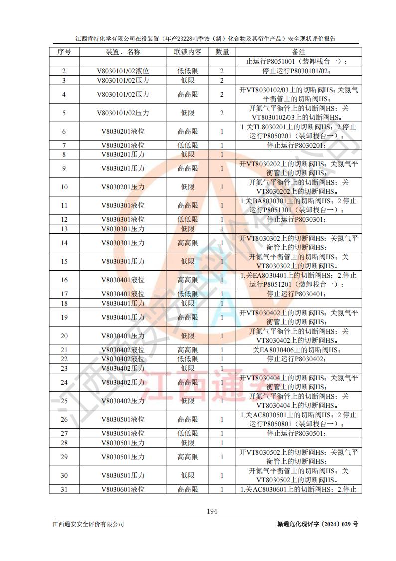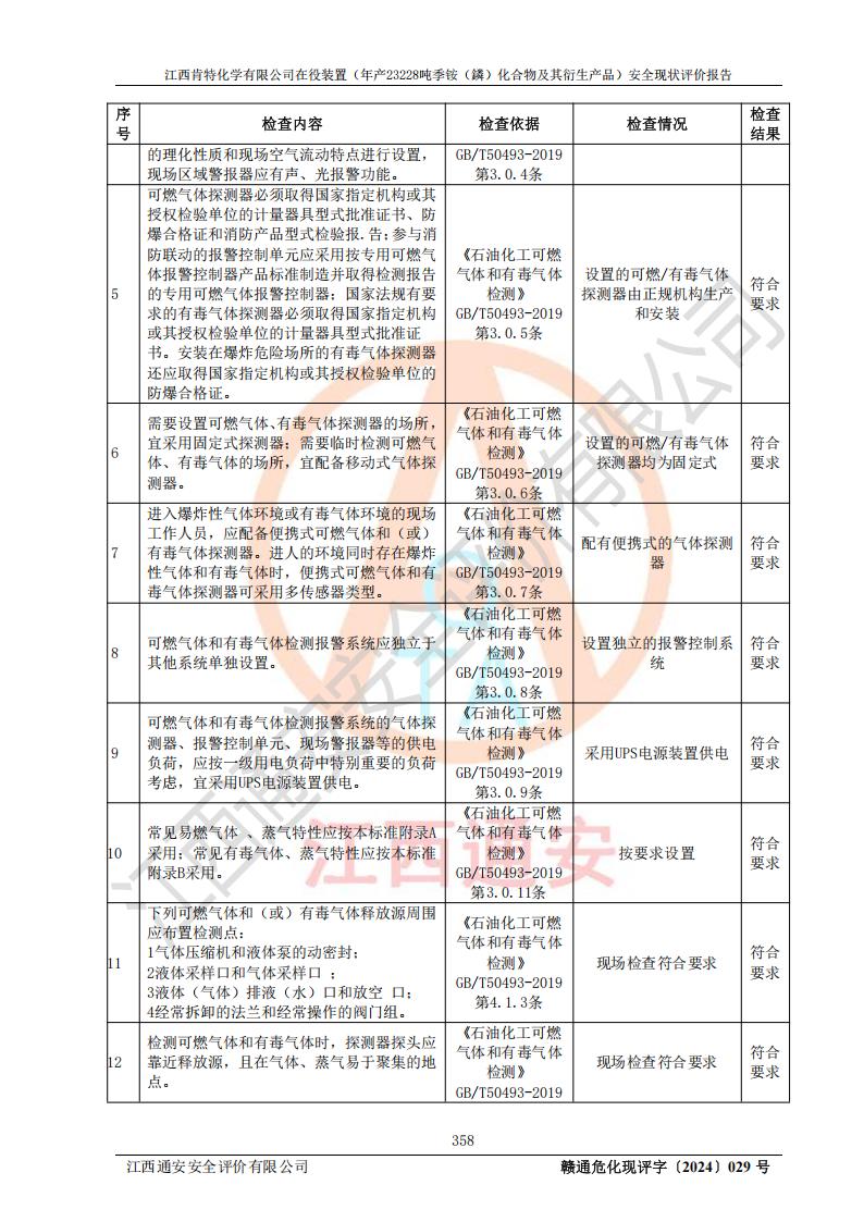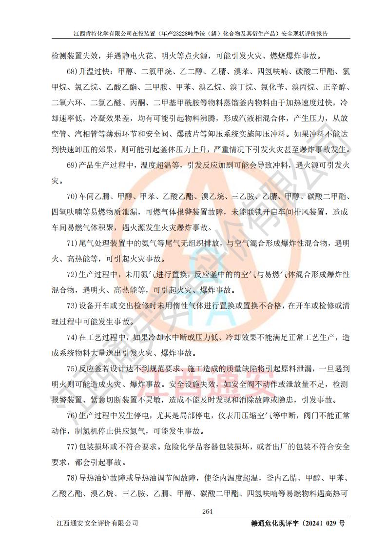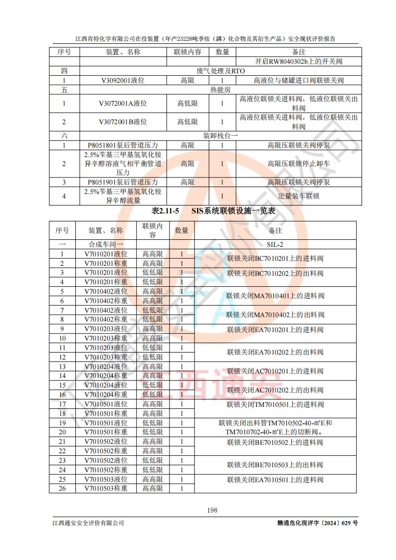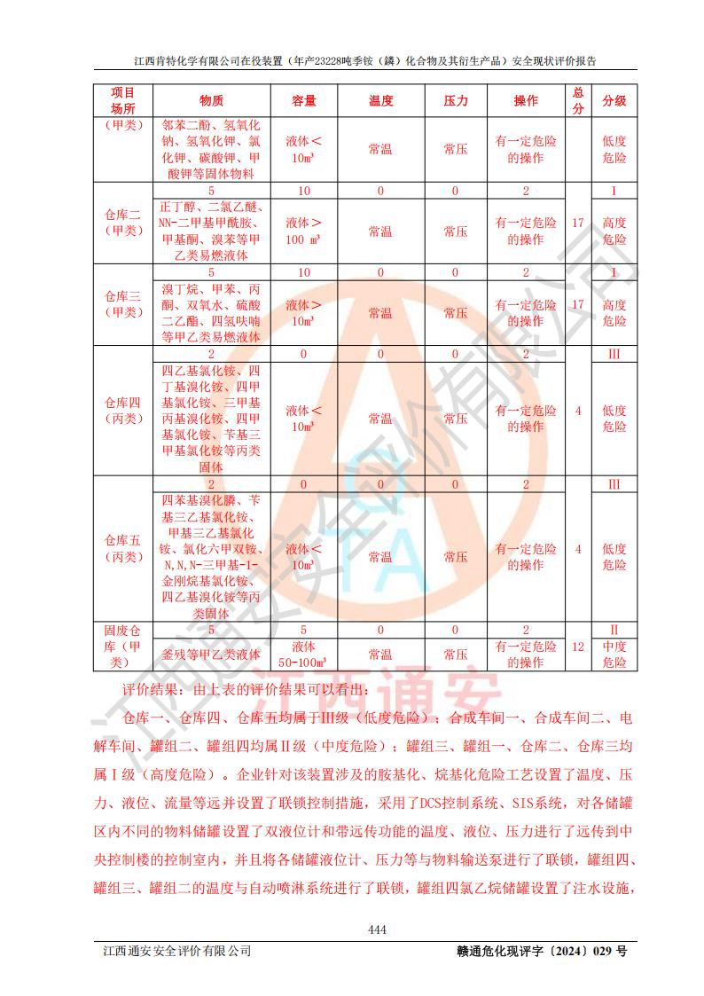 評(píng)價(jià)結(jié)論 | 江西肯特化學(xué)有限公司在役裝置(年產(chǎn)23228噸季銨(鏻)化合物及其衍生產(chǎn)品)現(xiàn)場(chǎng)情況與設(shè)計(jì)圖紙一致,DCS系統(tǒng)、SIS系統(tǒng)設(shè)計(jì)符合要求且運(yùn)行正常,有關(guān)從業(yè)人員資質(zhì)符合《江西省危險(xiǎn)化學(xué)品安全專項(xiàng)整治三年行動(dòng)實(shí)施方案》要求,安全設(shè)施及安全管理符合法律、法規(guī)、標(biāo)準(zhǔn)的要求,安全風(fēng)險(xiǎn)是可以控制的,其風(fēng)險(xiǎn)程度是可以接受的,安全設(shè)施符合安全生產(chǎn)條件,能夠滿足安全生產(chǎn)的要求。 | |||