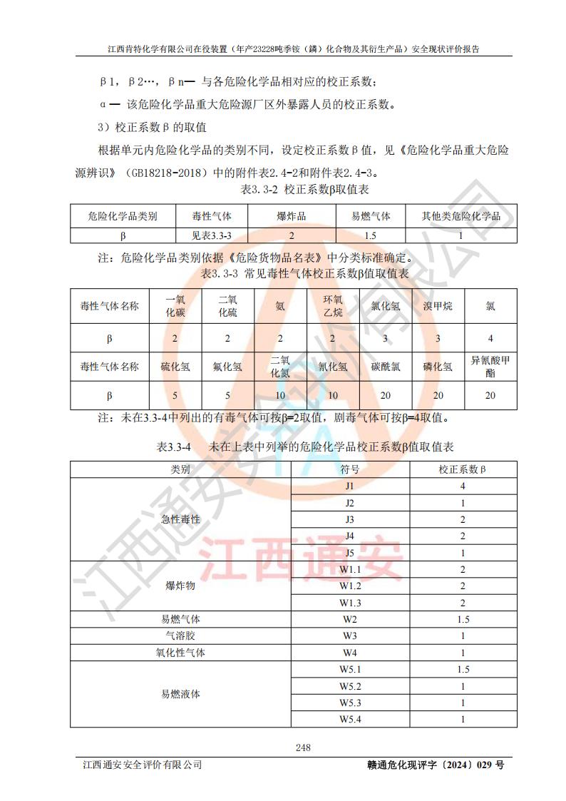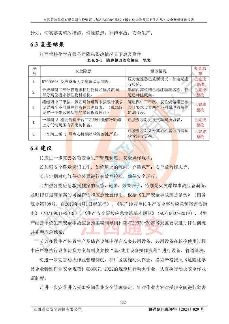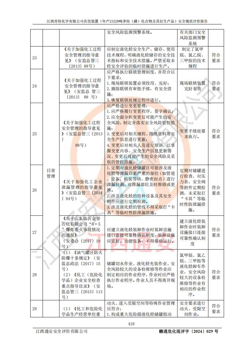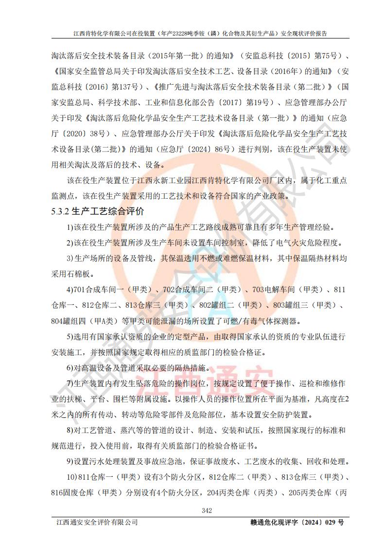 評(píng)價(jià)結(jié)論 | 江西肯特化學(xué)有限公司在役裝置(年產(chǎn)23228噸季銨(鏻)化合物及其衍生產(chǎn)品)現(xiàn)場(chǎng)情況與設(shè)計(jì)圖紙一致,DCS系統(tǒng)、SIS系統(tǒng)設(shè)計(jì)符合要求且運(yùn)行正常,有關(guān)從業(yè)人員資質(zhì)符合《江西省危險(xiǎn)化學(xué)品安全專項(xiàng)整治三年行動(dòng)實(shí)施方案》要求,安全設(shè)施及安全管理符合法律、法規(guī)、標(biāo)準(zhǔn)的要求,安全風(fēng)險(xiǎn)是可以控制的,其風(fēng)險(xiǎn)程度是可以接受的,安全設(shè)施符合安全生產(chǎn)條件,能夠滿足安全生產(chǎn)的要求。 | |||