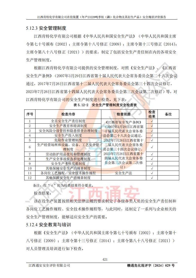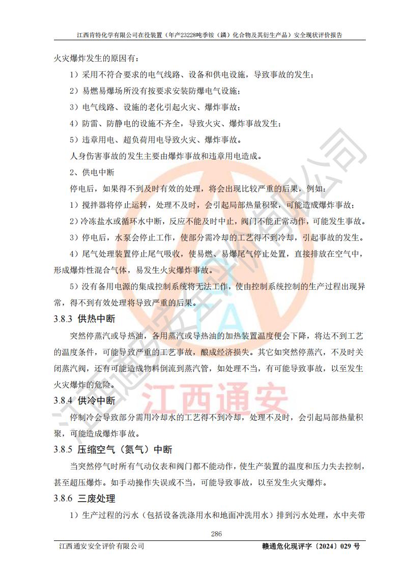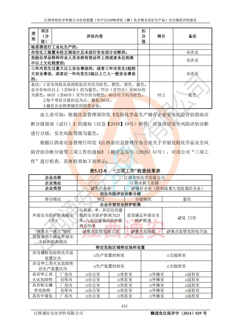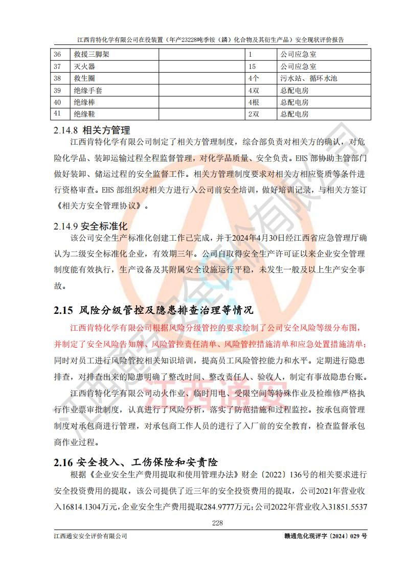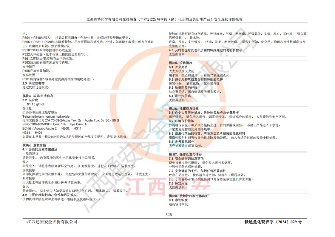 評(píng)價(jià)結(jié)論 | 江西肯特化學(xué)有限公司在役裝置(年產(chǎn)23228噸季銨(鏻)化合物及其衍生產(chǎn)品)現(xiàn)場(chǎng)情況與設(shè)計(jì)圖紙一致,DCS系統(tǒng)、SIS系統(tǒng)設(shè)計(jì)符合要求且運(yùn)行正常,有關(guān)從業(yè)人員資質(zhì)符合《江西省危險(xiǎn)化學(xué)品安全專項(xiàng)整治三年行動(dòng)實(shí)施方案》要求,安全設(shè)施及安全管理符合法律、法規(guī)、標(biāo)準(zhǔn)的要求,安全風(fēng)險(xiǎn)是可以控制的,其風(fēng)險(xiǎn)程度是可以接受的,安全設(shè)施符合安全生產(chǎn)條件,能夠滿足安全生產(chǎn)的要求。 | |||