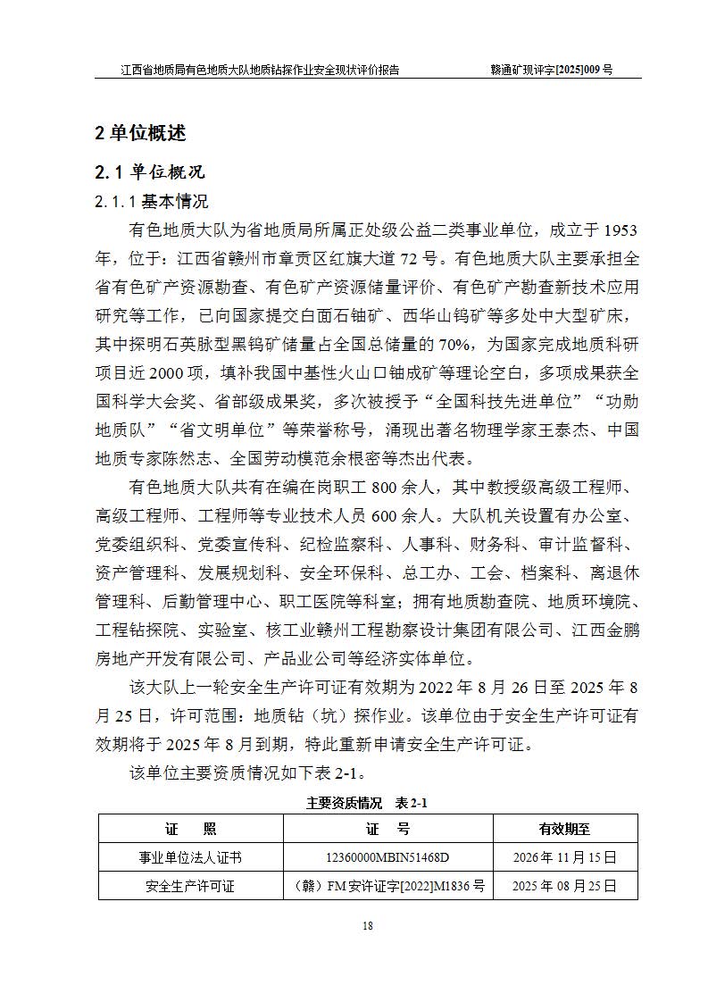 項(xiàng)目簡(jiǎn)介 | 江西省地質(zhì)局有色地質(zhì)大隊(duì)(以下簡(jiǎn)稱“有色地質(zhì)大隊(duì)”)為省地質(zhì)局所屬正處級(jí)公益二類事業(yè)單位,成立于1953年,位于:江西省贛州市章貢區(qū)紅旗大道72號(hào)。有色地質(zhì)大隊(duì)主要承擔(dān)**有色礦產(chǎn)資源勘查、有色礦產(chǎn)資源儲(chǔ)量評(píng)價(jià)、有色礦產(chǎn)勘查新技術(shù)應(yīng)用研究等工作,已向**提交白面石鈾礦、西華山鎢礦等多處中大型礦床,其中探明石英脈型黑鎢礦儲(chǔ)量占**總儲(chǔ)量的70%,為**完成地質(zhì)科研項(xiàng)目近2000項(xiàng),填補(bǔ)我國(guó)中基性火山口鈾成礦等理論空白,多項(xiàng)成果獲**科學(xué)大會(huì)獎(jiǎng)、省部級(jí)成果獎(jiǎng),多次被授予“**科技**單位”“功勛地質(zhì)隊(duì)”“省文明單位”等**稱號(hào),涌現(xiàn)出**物理學(xué)家王泰杰、中國(guó)地質(zhì)專家陳然志、**勞動(dòng)模范余根密等****。 有色地質(zhì)大隊(duì)共有在編在崗職工800余人,其中**級(jí)高級(jí)工程師、高級(jí)工程師、工程師等專業(yè)技術(shù)人員600余人。大隊(duì)機(jī)關(guān)設(shè)置有辦公室、黨委組織科、黨委宣傳科、紀(jì)檢監(jiān)察科、人事科、財(cái)務(wù)科、審計(jì)監(jiān)督科、資產(chǎn)管理科、發(fā)展規(guī)劃科、安全**科、總工辦、工會(huì)、檔案科、離退休管理科、后勤管理中心、職工醫(yī)院等科室;擁有地質(zhì)勘查院、地質(zhì)環(huán)境院、工程鉆探院、實(shí)驗(yàn)室、核工業(yè)贛州工程勘察設(shè)計(jì)集團(tuán)有限公司、江西金鵬房地產(chǎn)開發(fā)有限公司、產(chǎn)品業(yè)公司等經(jīng)濟(jì)實(shí)體單位。 該大隊(duì)上一輪安全生產(chǎn)許可證**期為2022年8月26日至2025年8月25日,許可范圍:地質(zhì)鉆(坑)探作業(yè)。該單位由于安全生產(chǎn)許可證**期將于2025年8月到期,特此重新申請(qǐng)安全生產(chǎn)許可證。按照《安全生產(chǎn)法》、《礦山安全法》和《關(guān)于做好非煤礦山企業(yè)安全生產(chǎn)許可證延期換證工作的通知》等有關(guān)規(guī)定,該單位在申請(qǐng)安全生產(chǎn)許可證前應(yīng)進(jìn)行安全現(xiàn)狀評(píng)價(jià)。 | |||||
