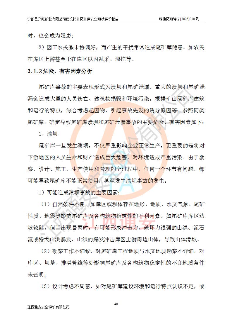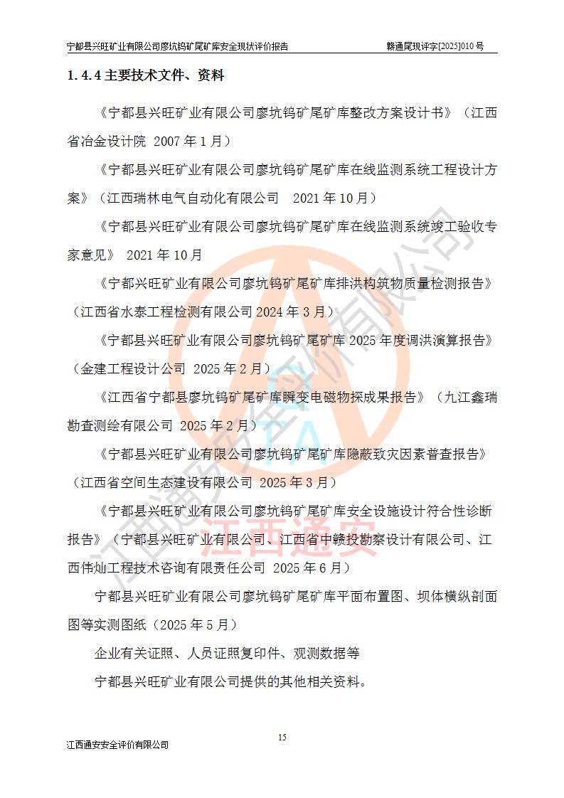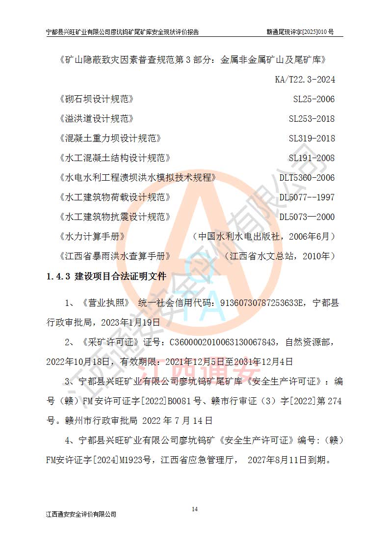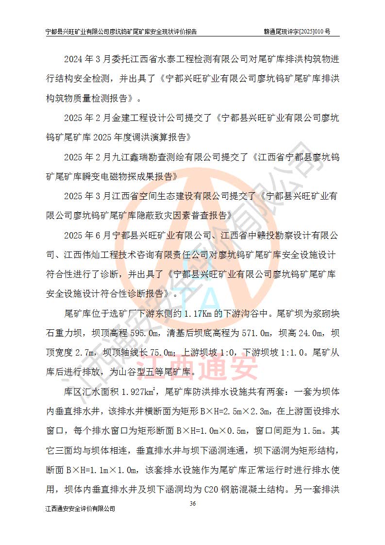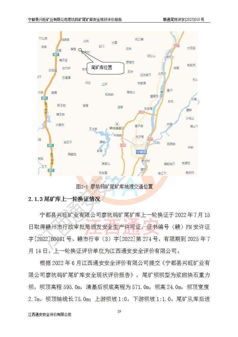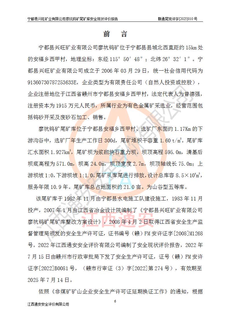 寧都縣興旺礦業(yè)有限公司廖坑鎢礦位于寧都縣縣城北西直距約15km處的安福鄉(xiāng)西甲村,地理坐標:東經(jīng)115°50′48″;北緯26°32′1″。寧都縣興旺礦業(yè)有限公司成立于2006年03月29日,統(tǒng)一社會信用代碼為91360730787253633E,企業(yè)類型為有限責任公司(自然人投資或控股),企業(yè)注冊地位于江西省贛州市寧都縣安福鄉(xiāng)西甲村,法定**人為曾德強,注冊資本為1915萬元人民幣,所屬行業(yè)為有色金屬礦采選業(yè),經(jīng)營范圍包括鎢砂開采及廢砂石加工、銷售。 廖坑鎢礦尾礦庫位于寧都縣安福鄉(xiāng)西甲村、選礦廠東面約1.17Km的下游溝谷中,選礦廠年生產(chǎn)工作日300d,尾礦堆積干容重1.60 t/m3。尾礦庫匯水面積1.927km2,尾礦壩為漿砌塊石重力壩,壩頂高程595.0m,清基后壩底高程為571.0m,壩高24.0m,壩頂寬度2.7m,壩頂軸線長75.0m;上游壩坡1:0,下游壩坡1:1.0。尾礦從庫尾進行排放,設(shè)計總庫容8.5×104m3,服務年限10.9年。尾礦庫總占地面積約21.0畝。為山谷型五等庫。 該尾礦庫于1982年11月由寧都縣水電施工隊建設(shè)施工,1983年11月投產(chǎn),2007年1月由江西省冶金設(shè)計院編制了《寧都縣興旺礦業(yè)有限公司廖坑鎢礦尾礦庫整改方案設(shè)計》,2008年4月2日取得江西省安全生產(chǎn)監(jiān)督管理局頒發(fā)的安全生產(chǎn)許可證,證書編號(贛)FM安許證字[2008]M1268號。2022年江西通安安全評價有限公司編制了安全現(xiàn)狀評價報告,2022年7月15日由贛州市行政審批局下發(fā)了安全生產(chǎn)許可證,證號(贛)FM安許證字[2022]B0081號,(贛市行審證(3)字[2022]第274號),**期至2025年7月14日。 依照《非煤礦礦山企業(yè)安全生產(chǎn)許可證延期換證工作》的通知,根據(jù)***《安全生產(chǎn)許可證條例》、《江西省安全生產(chǎn)條例》、《非煤礦山安全生產(chǎn)許可證實施辦法》、《江西省非煤礦礦山企業(yè)安全生產(chǎn)許可證辦法》規(guī)定及非煤礦山安全評價導則的要求,受寧都縣興旺礦業(yè)有限公司的委托,我公司承擔廖坑鎢礦尾礦庫延期換證的安全現(xiàn)狀評價工作。 |