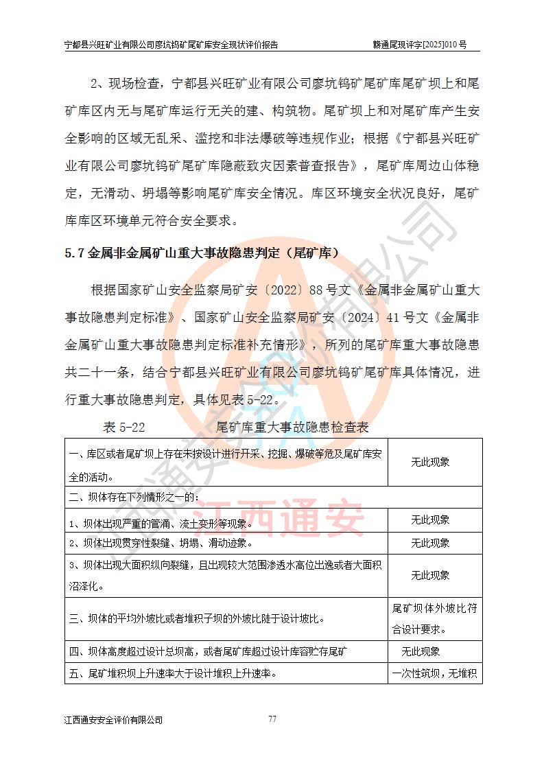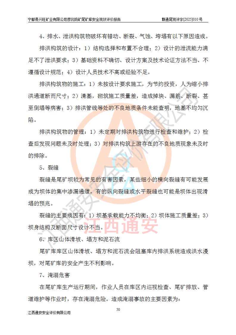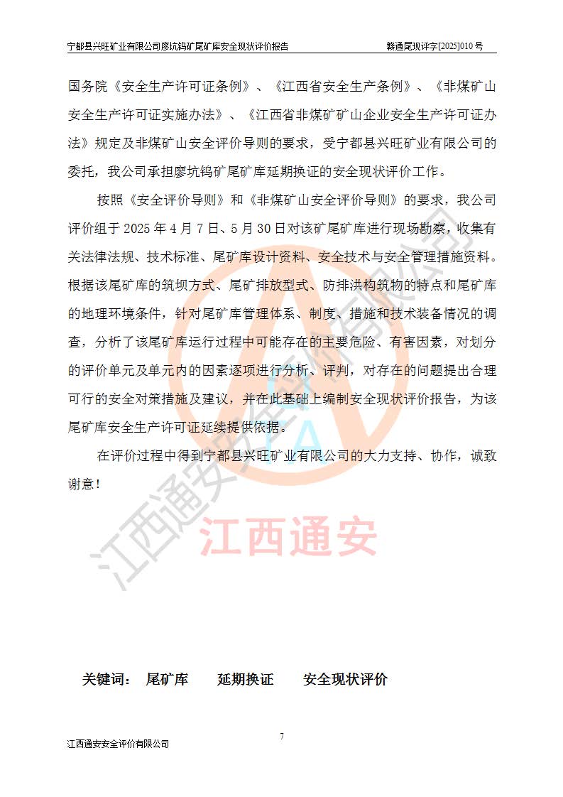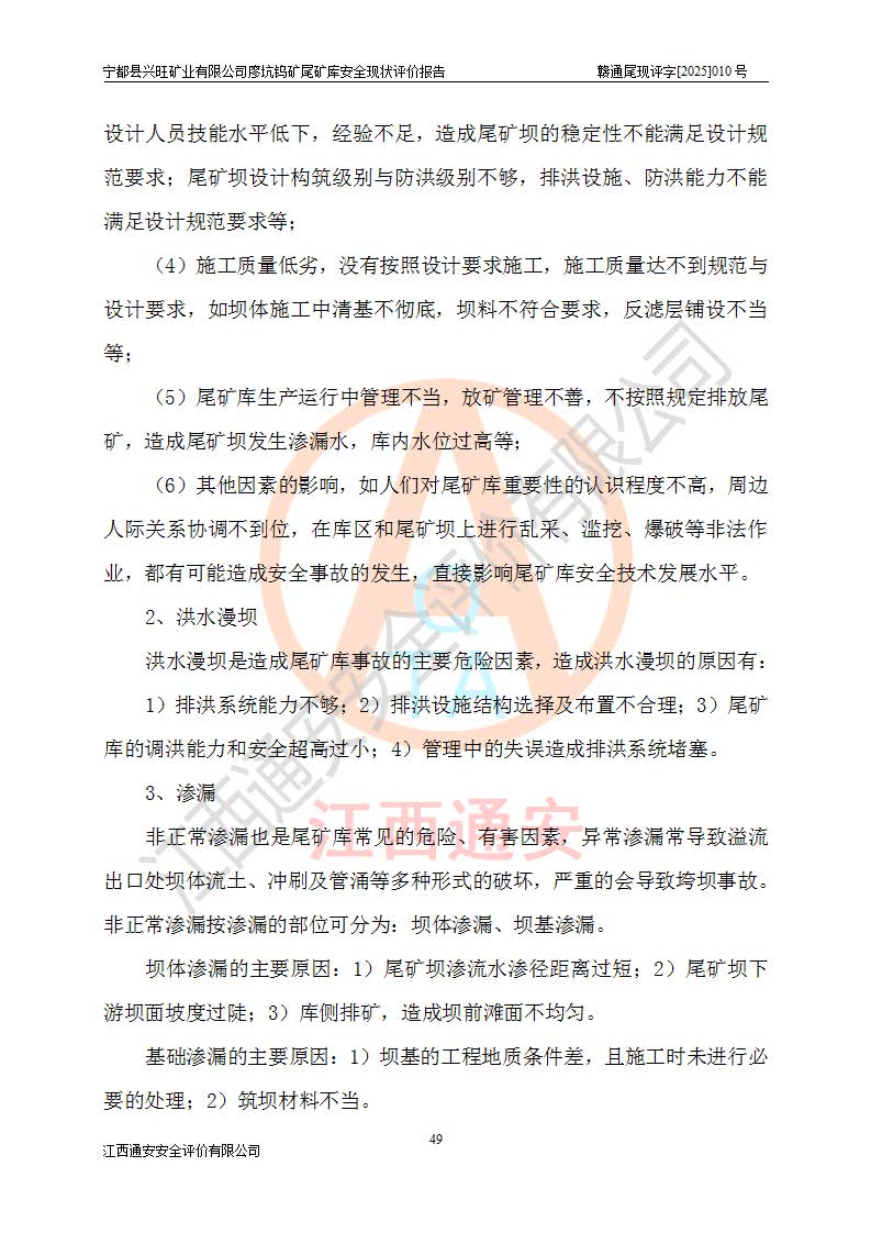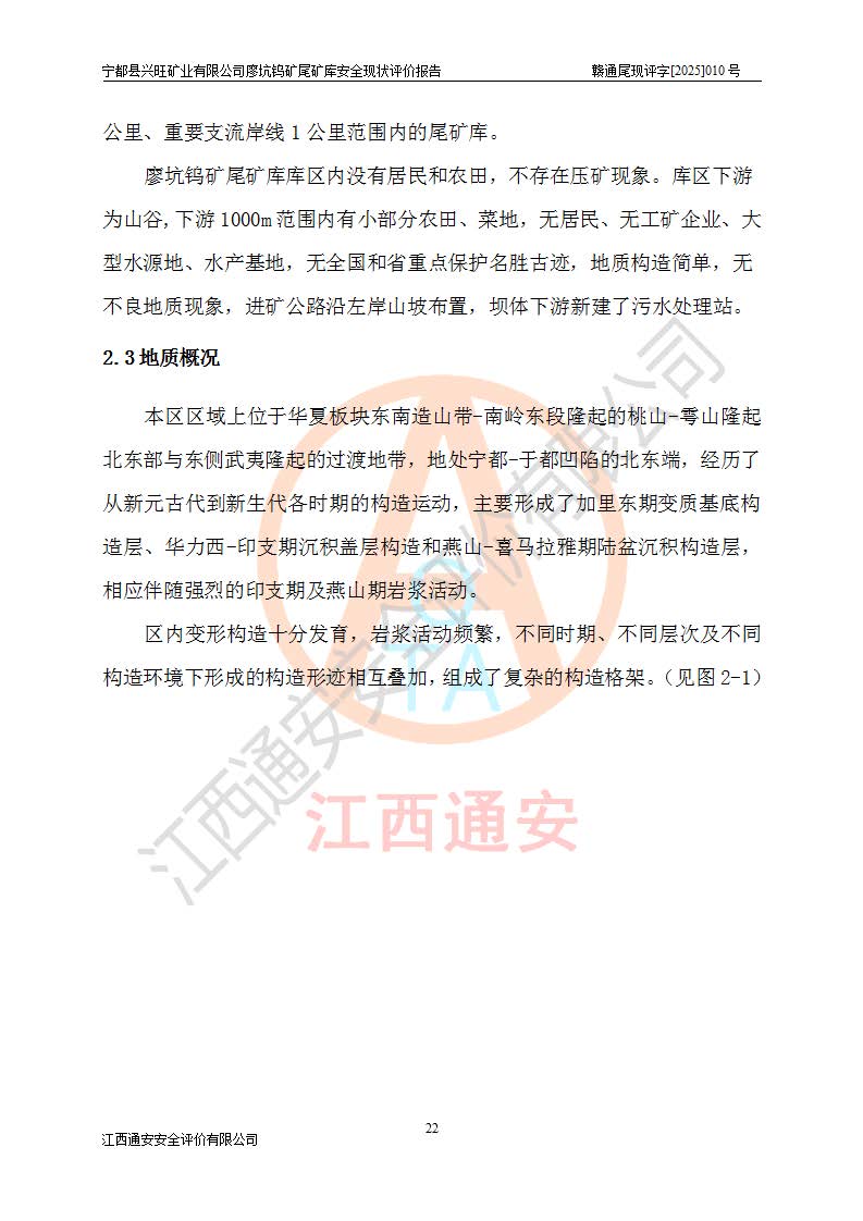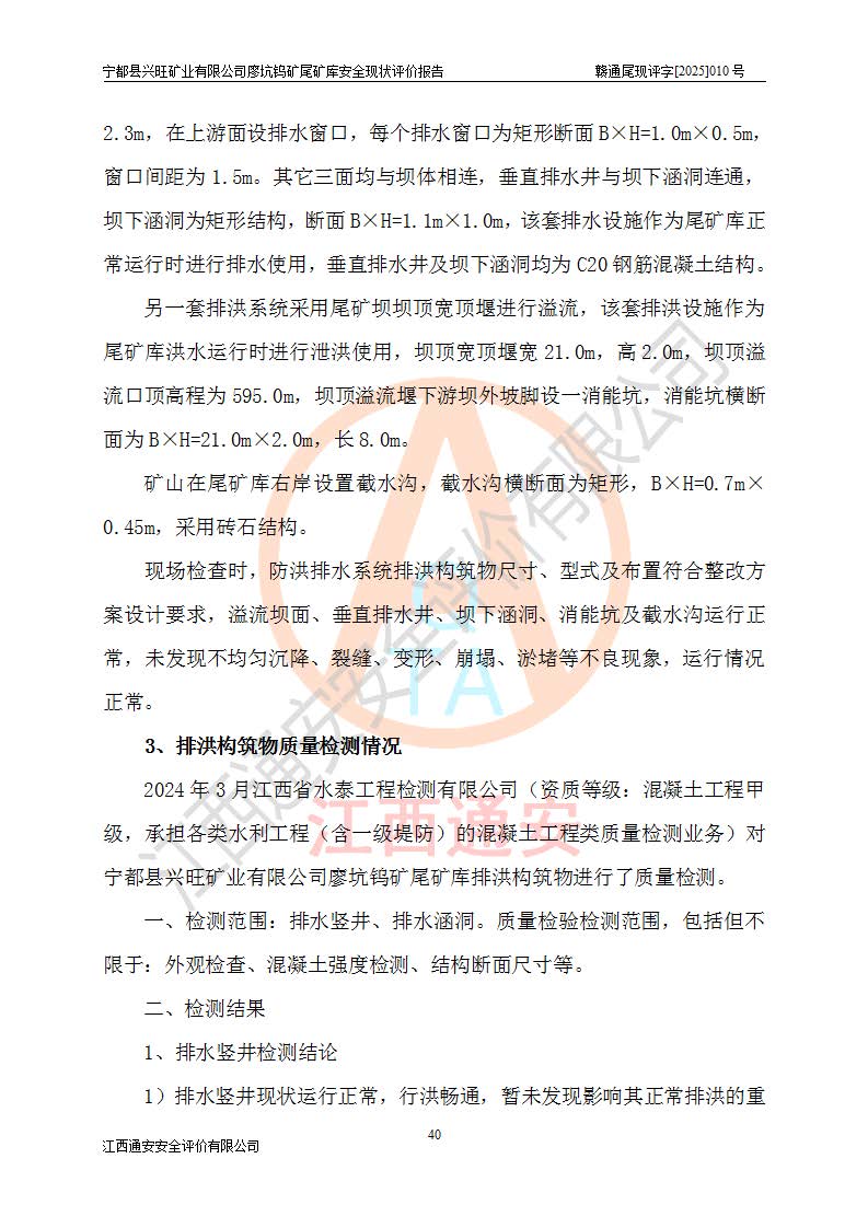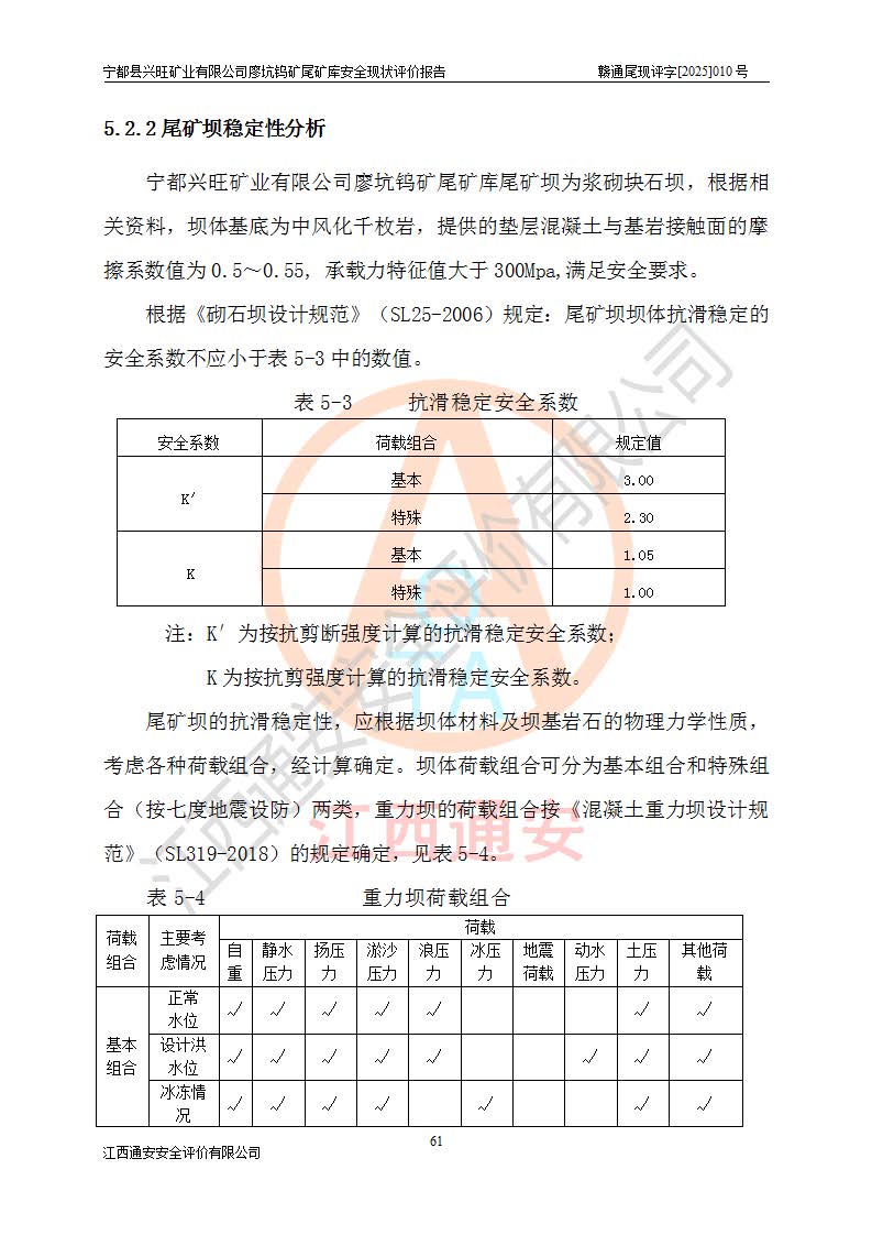 寧都縣興旺礦業(yè)有限公司廖坑鎢礦位于寧都縣縣城北西直距約15km處的安福鄉(xiāng)西甲村,地理坐標:東經(jīng)115°50′48″;北緯26°32′1″。寧都縣興旺礦業(yè)有限公司成立于2006年03月29日,統(tǒng)一社會信用代碼為91360730787253633E,企業(yè)類型為有限責任公司(自然人投資或控股),企業(yè)注冊地位于江西省贛州市寧都縣安福鄉(xiāng)西甲村,法定**人為曾德強,注冊資本為1915萬元人民幣,所屬行業(yè)為有色金屬礦采選業(yè),經(jīng)營范圍包括鎢砂開采及廢砂石加工、銷售。 廖坑鎢礦尾礦庫位于寧都縣安福鄉(xiāng)西甲村、選礦廠東面約1.17Km的下游溝谷中,選礦廠年生產(chǎn)工作日300d,尾礦堆積干容重1.60 t/m3。尾礦庫匯水面積1.927km2,尾礦壩為漿砌塊石重力壩,壩頂高程595.0m,清基后壩底高程為571.0m,壩高24.0m,壩頂寬度2.7m,壩頂軸線長75.0m;上游壩坡1:0,下游壩坡1:1.0。尾礦從庫尾進行排放,設(shè)計總庫容8.5×104m3,服務年限10.9年。尾礦庫總占地面積約21.0畝。為山谷型五等庫。 該尾礦庫于1982年11月由寧都縣水電施工隊建設(shè)施工,1983年11月投產(chǎn),2007年1月由江西省冶金設(shè)計院編制了《寧都縣興旺礦業(yè)有限公司廖坑鎢礦尾礦庫整改方案設(shè)計》,2008年4月2日取得江西省安全生產(chǎn)監(jiān)督管理局頒發(fā)的安全生產(chǎn)許可證,證書編號(贛)FM安許證字[2008]M1268號。2022年江西通安安全評價有限公司編制了安全現(xiàn)狀評價報告,2022年7月15日由贛州市行政審批局下發(fā)了安全生產(chǎn)許可證,證號(贛)FM安許證字[2022]B0081號,(贛市行審證(3)字[2022]第274號),**期至2025年7月14日。 依照《非煤礦礦山企業(yè)安全生產(chǎn)許可證延期換證工作》的通知,根據(jù)***《安全生產(chǎn)許可證條例》、《江西省安全生產(chǎn)條例》、《非煤礦山安全生產(chǎn)許可證實施辦法》、《江西省非煤礦礦山企業(yè)安全生產(chǎn)許可證辦法》規(guī)定及非煤礦山安全評價導則的要求,受寧都縣興旺礦業(yè)有限公司的委托,我公司承擔廖坑鎢礦尾礦庫延期換證的安全現(xiàn)狀評價工作。 |