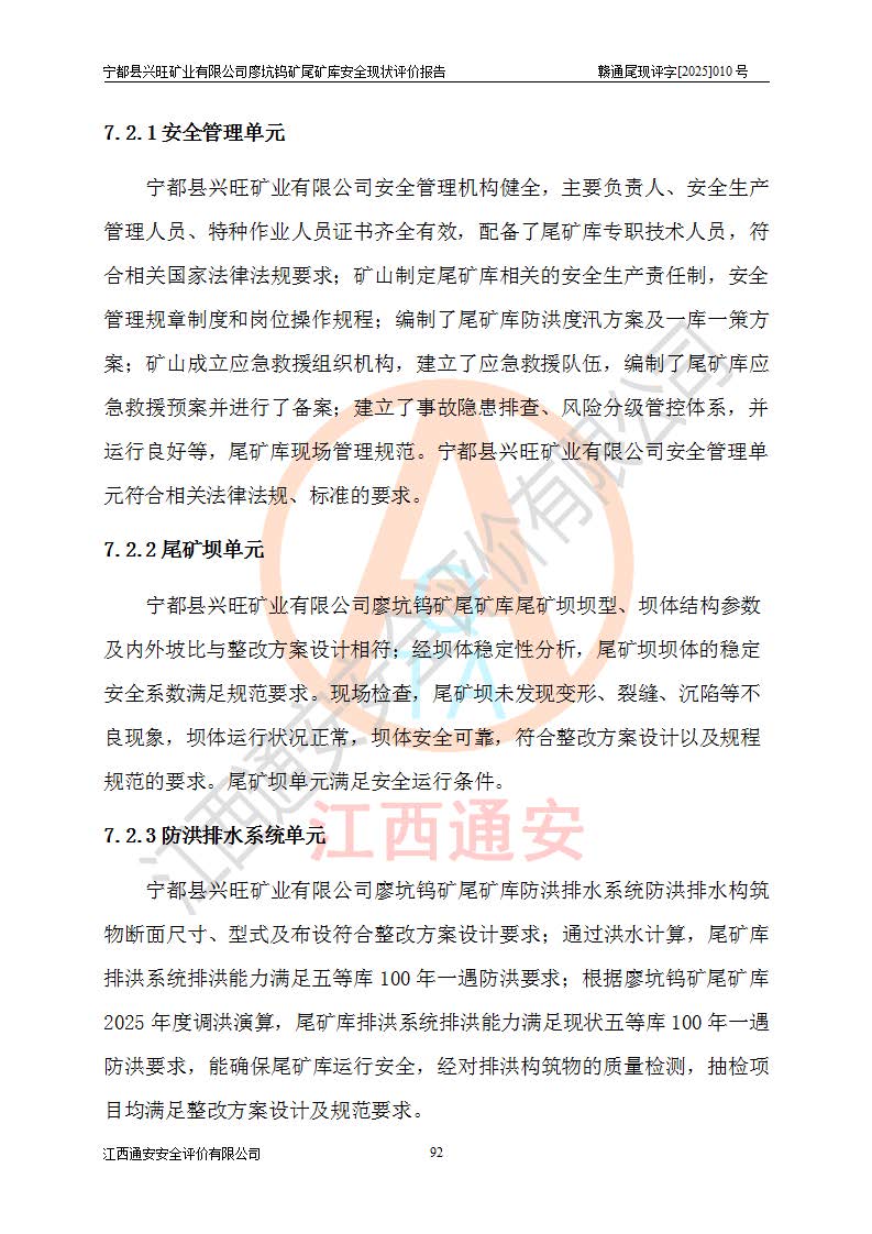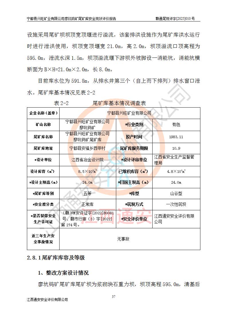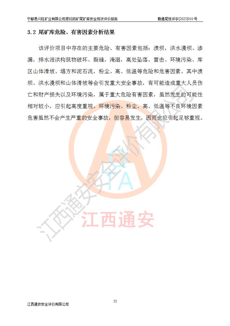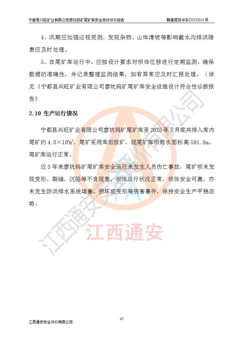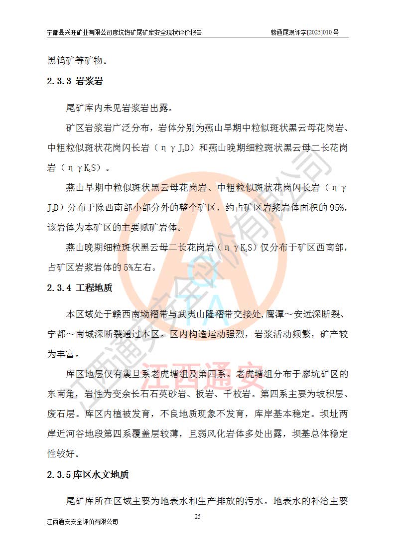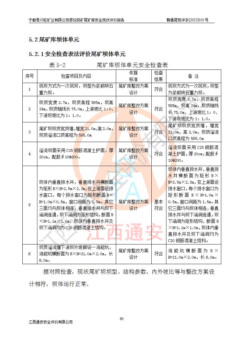 寧都縣興旺礦業(yè)有限公司廖坑鎢礦位于寧都縣縣城北西直距約15km處的安福鄉(xiāng)西甲村,地理坐標:東經(jīng)115°50′48″;北緯26°32′1″。寧都縣興旺礦業(yè)有限公司成立于2006年03月29日,統(tǒng)一社會信用代碼為91360730787253633E,企業(yè)類型為有限責任公司(自然人投資或控股),企業(yè)注冊地位于江西省贛州市寧都縣安福鄉(xiāng)西甲村,法定**人為曾德強,注冊資本為1915萬元人民幣,所屬行業(yè)為有色金屬礦采選業(yè),經(jīng)營范圍包括鎢砂開采及廢砂石加工、銷售。 廖坑鎢礦尾礦庫位于寧都縣安福鄉(xiāng)西甲村、選礦廠東面約1.17Km的下游溝谷中,選礦廠年生產(chǎn)工作日300d,尾礦堆積干容重1.60 t/m3。尾礦庫匯水面積1.927km2,尾礦壩為漿砌塊石重力壩,壩頂高程595.0m,清基后壩底高程為571.0m,壩高24.0m,壩頂寬度2.7m,壩頂軸線長75.0m;上游壩坡1:0,下游壩坡1:1.0。尾礦從庫尾進行排放,設(shè)計總庫容8.5×104m3,服務年限10.9年。尾礦庫總占地面積約21.0畝。為山谷型五等庫。 該尾礦庫于1982年11月由寧都縣水電施工隊建設(shè)施工,1983年11月投產(chǎn),2007年1月由江西省冶金設(shè)計院編制了《寧都縣興旺礦業(yè)有限公司廖坑鎢礦尾礦庫整改方案設(shè)計》,2008年4月2日取得江西省安全生產(chǎn)監(jiān)督管理局頒發(fā)的安全生產(chǎn)許可證,證書編號(贛)FM安許證字[2008]M1268號。2022年江西通安安全評價有限公司編制了安全現(xiàn)狀評價報告,2022年7月15日由贛州市行政審批局下發(fā)了安全生產(chǎn)許可證,證號(贛)FM安許證字[2022]B0081號,(贛市行審證(3)字[2022]第274號),**期至2025年7月14日。 依照《非煤礦礦山企業(yè)安全生產(chǎn)許可證延期換證工作》的通知,根據(jù)***《安全生產(chǎn)許可證條例》、《江西省安全生產(chǎn)條例》、《非煤礦山安全生產(chǎn)許可證實施辦法》、《江西省非煤礦礦山企業(yè)安全生產(chǎn)許可證辦法》規(guī)定及非煤礦山安全評價導則的要求,受寧都縣興旺礦業(yè)有限公司的委托,我公司承擔廖坑鎢礦尾礦庫延期換證的安全現(xiàn)狀評價工作。 |