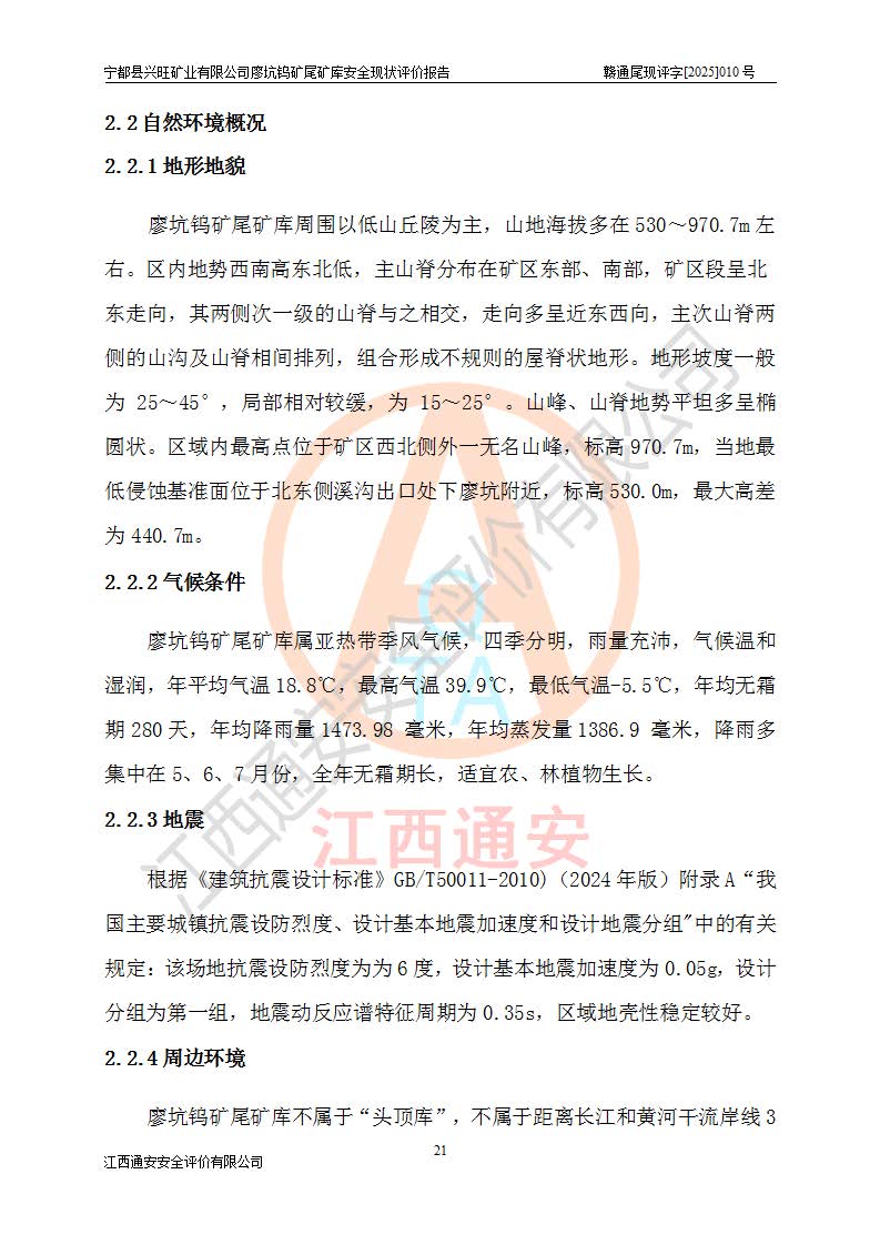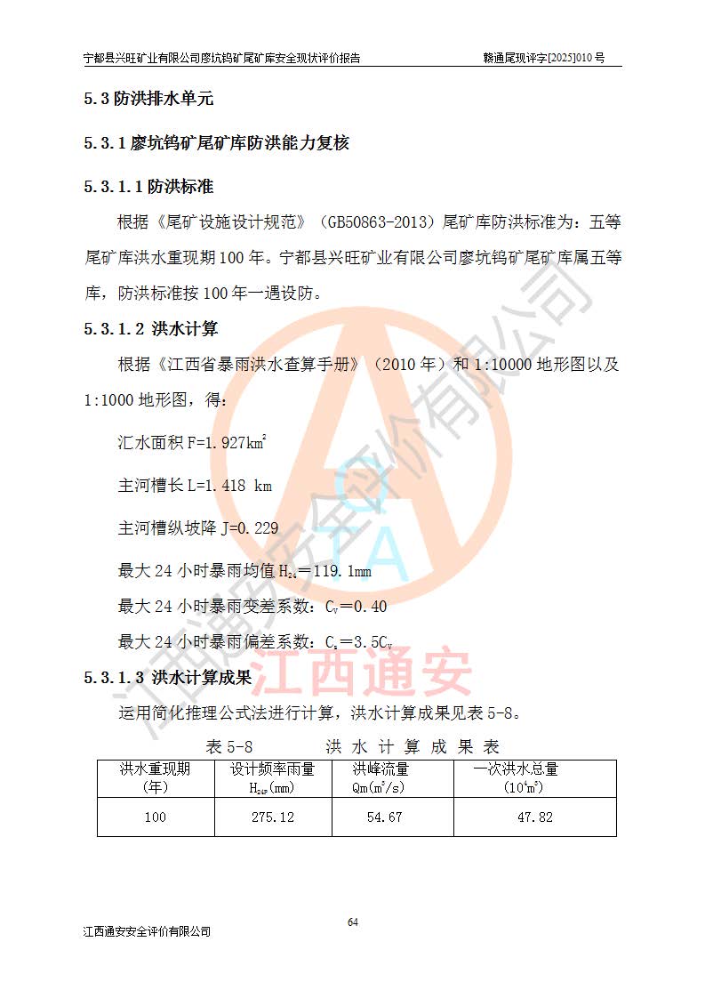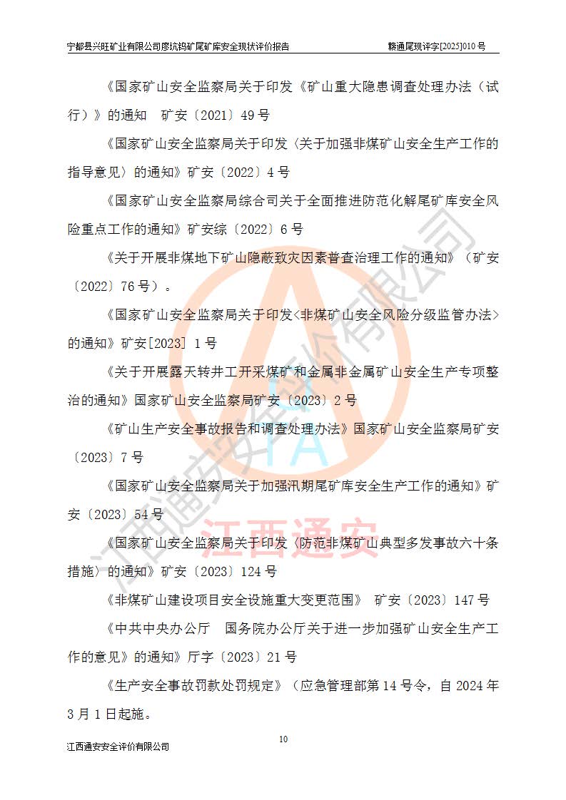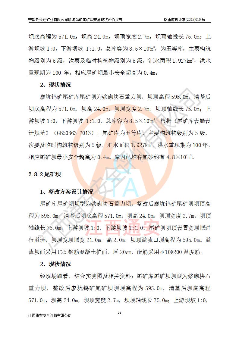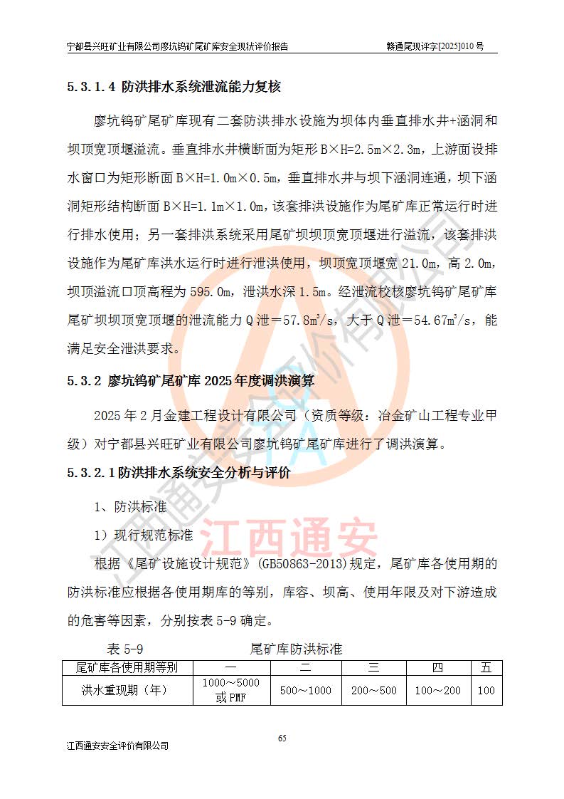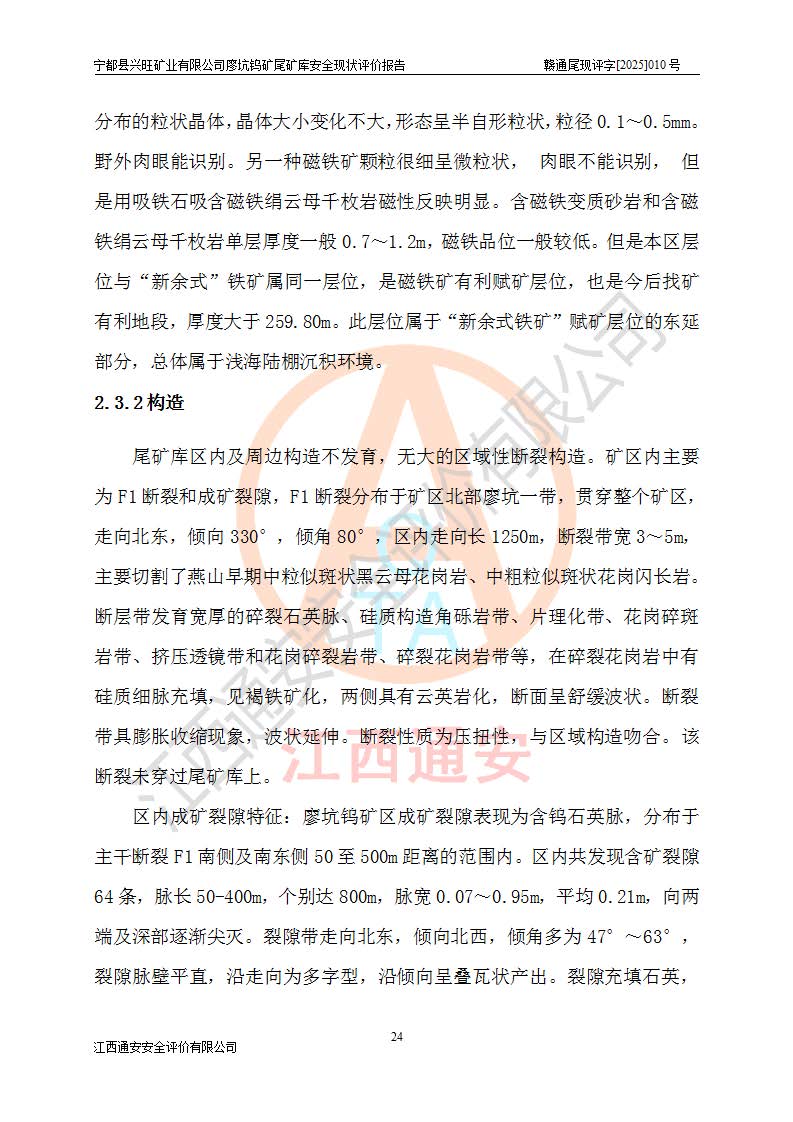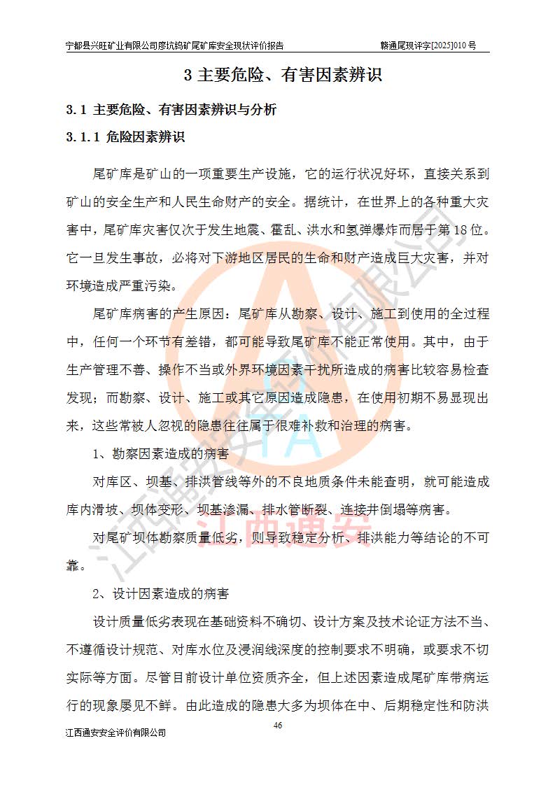 寧都縣興旺礦業(yè)有限公司廖坑鎢礦位于寧都縣縣城北西直距約15km處的安福鄉(xiāng)西甲村,地理坐標:東經(jīng)115°50′48″;北緯26°32′1″。寧都縣興旺礦業(yè)有限公司成立于2006年03月29日,統(tǒng)一社會信用代碼為91360730787253633E,企業(yè)類型為有限責任公司(自然人投資或控股),企業(yè)注冊地位于江西省贛州市寧都縣安福鄉(xiāng)西甲村,法定**人為曾德強,注冊資本為1915萬元人民幣,所屬行業(yè)為有色金屬礦采選業(yè),經(jīng)營范圍包括鎢砂開采及廢砂石加工、銷售。 廖坑鎢礦尾礦庫位于寧都縣安福鄉(xiāng)西甲村、選礦廠東面約1.17Km的下游溝谷中,選礦廠年生產(chǎn)工作日300d,尾礦堆積干容重1.60 t/m3。尾礦庫匯水面積1.927km2,尾礦壩為漿砌塊石重力壩,壩頂高程595.0m,清基后壩底高程為571.0m,壩高24.0m,壩頂寬度2.7m,壩頂軸線長75.0m;上游壩坡1:0,下游壩坡1:1.0。尾礦從庫尾進行排放,設(shè)計總庫容8.5×104m3,服務年限10.9年。尾礦庫總占地面積約21.0畝。為山谷型五等庫。 該尾礦庫于1982年11月由寧都縣水電施工隊建設(shè)施工,1983年11月投產(chǎn),2007年1月由江西省冶金設(shè)計院編制了《寧都縣興旺礦業(yè)有限公司廖坑鎢礦尾礦庫整改方案設(shè)計》,2008年4月2日取得江西省安全生產(chǎn)監(jiān)督管理局頒發(fā)的安全生產(chǎn)許可證,證書編號(贛)FM安許證字[2008]M1268號。2022年江西通安安全評價有限公司編制了安全現(xiàn)狀評價報告,2022年7月15日由贛州市行政審批局下發(fā)了安全生產(chǎn)許可證,證號(贛)FM安許證字[2022]B0081號,(贛市行審證(3)字[2022]第274號),**期至2025年7月14日。 依照《非煤礦礦山企業(yè)安全生產(chǎn)許可證延期換證工作》的通知,根據(jù)***《安全生產(chǎn)許可證條例》、《江西省安全生產(chǎn)條例》、《非煤礦山安全生產(chǎn)許可證實施辦法》、《江西省非煤礦礦山企業(yè)安全生產(chǎn)許可證辦法》規(guī)定及非煤礦山安全評價導則的要求,受寧都縣興旺礦業(yè)有限公司的委托,我公司承擔廖坑鎢礦尾礦庫延期換證的安全現(xiàn)狀評價工作。 |