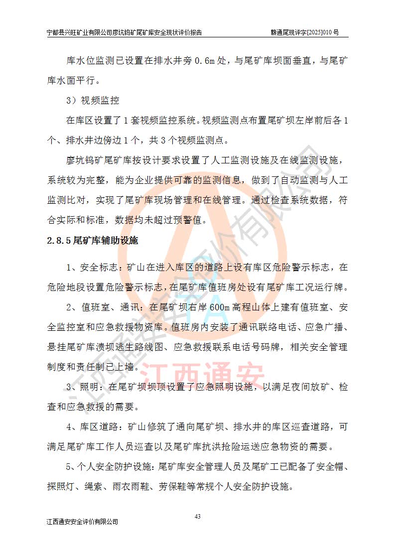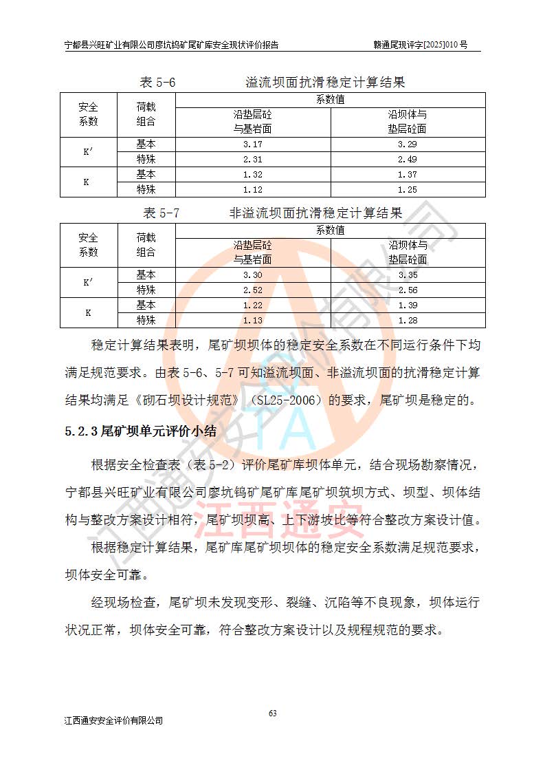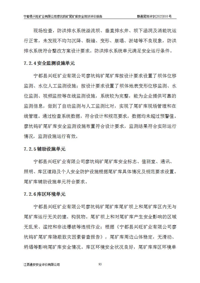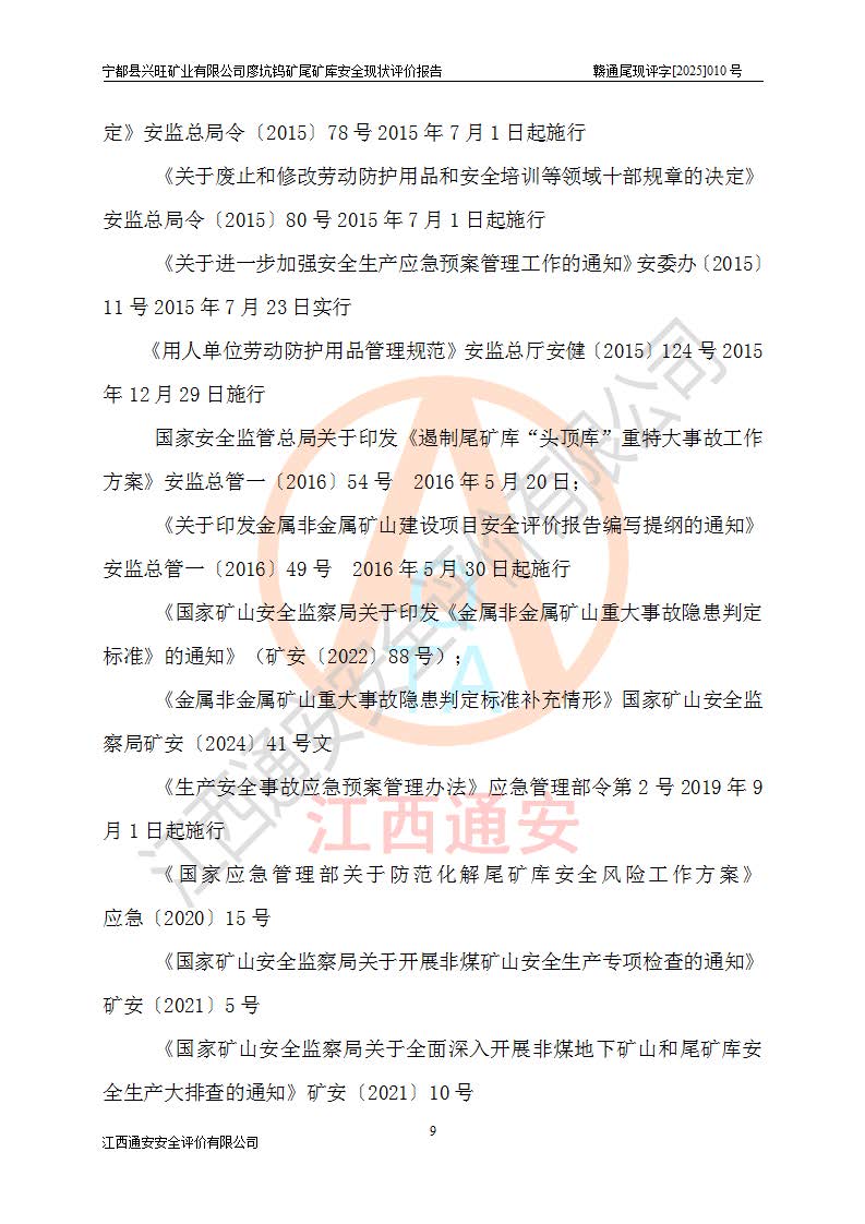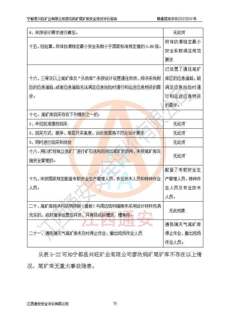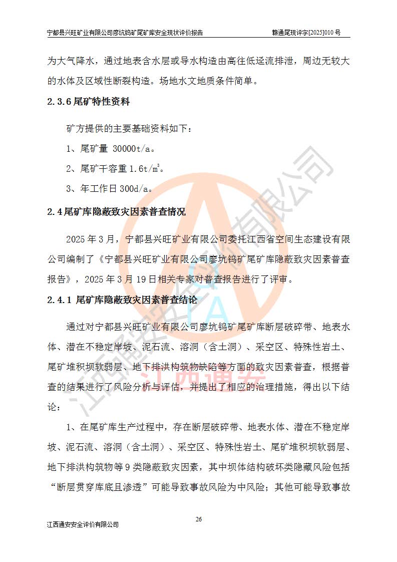 寧都縣興旺礦業(yè)有限公司廖坑鎢礦位于寧都縣縣城北西直距約15km處的安福鄉(xiāng)西甲村,地理坐標:東經(jīng)115°50′48″;北緯26°32′1″。寧都縣興旺礦業(yè)有限公司成立于2006年03月29日,統(tǒng)一社會信用代碼為91360730787253633E,企業(yè)類型為有限責任公司(自然人投資或控股),企業(yè)注冊地位于江西省贛州市寧都縣安福鄉(xiāng)西甲村,法定**人為曾德強,注冊資本為1915萬元人民幣,所屬行業(yè)為有色金屬礦采選業(yè),經(jīng)營范圍包括鎢砂開采及廢砂石加工、銷售。 廖坑鎢礦尾礦庫位于寧都縣安福鄉(xiāng)西甲村、選礦廠東面約1.17Km的下游溝谷中,選礦廠年生產(chǎn)工作日300d,尾礦堆積干容重1.60 t/m3。尾礦庫匯水面積1.927km2,尾礦壩為漿砌塊石重力壩,壩頂高程595.0m,清基后壩底高程為571.0m,壩高24.0m,壩頂寬度2.7m,壩頂軸線長75.0m;上游壩坡1:0,下游壩坡1:1.0。尾礦從庫尾進行排放,設(shè)計總庫容8.5×104m3,服務年限10.9年。尾礦庫總占地面積約21.0畝。為山谷型五等庫。 該尾礦庫于1982年11月由寧都縣水電施工隊建設(shè)施工,1983年11月投產(chǎn),2007年1月由江西省冶金設(shè)計院編制了《寧都縣興旺礦業(yè)有限公司廖坑鎢礦尾礦庫整改方案設(shè)計》,2008年4月2日取得江西省安全生產(chǎn)監(jiān)督管理局頒發(fā)的安全生產(chǎn)許可證,證書編號(贛)FM安許證字[2008]M1268號。2022年江西通安安全評價有限公司編制了安全現(xiàn)狀評價報告,2022年7月15日由贛州市行政審批局下發(fā)了安全生產(chǎn)許可證,證號(贛)FM安許證字[2022]B0081號,(贛市行審證(3)字[2022]第274號),**期至2025年7月14日。 依照《非煤礦礦山企業(yè)安全生產(chǎn)許可證延期換證工作》的通知,根據(jù)***《安全生產(chǎn)許可證條例》、《江西省安全生產(chǎn)條例》、《非煤礦山安全生產(chǎn)許可證實施辦法》、《江西省非煤礦礦山企業(yè)安全生產(chǎn)許可證辦法》規(guī)定及非煤礦山安全評價導則的要求,受寧都縣興旺礦業(yè)有限公司的委托,我公司承擔廖坑鎢礦尾礦庫延期換證的安全現(xiàn)狀評價工作。 |