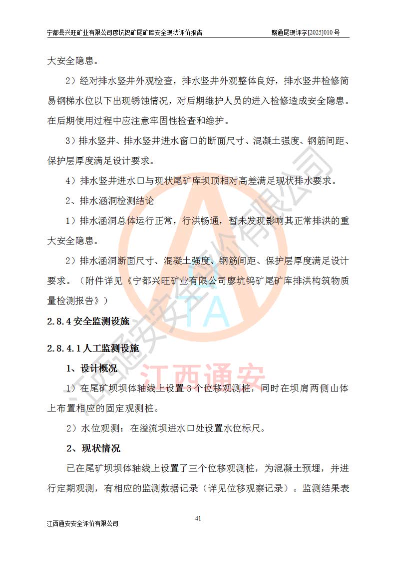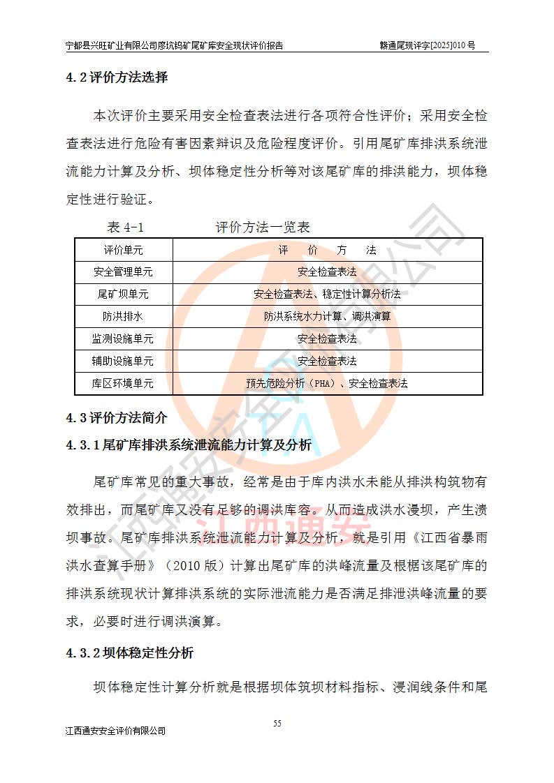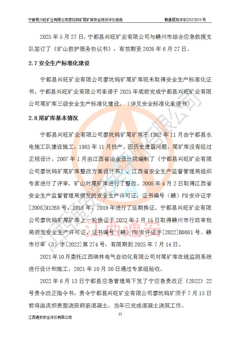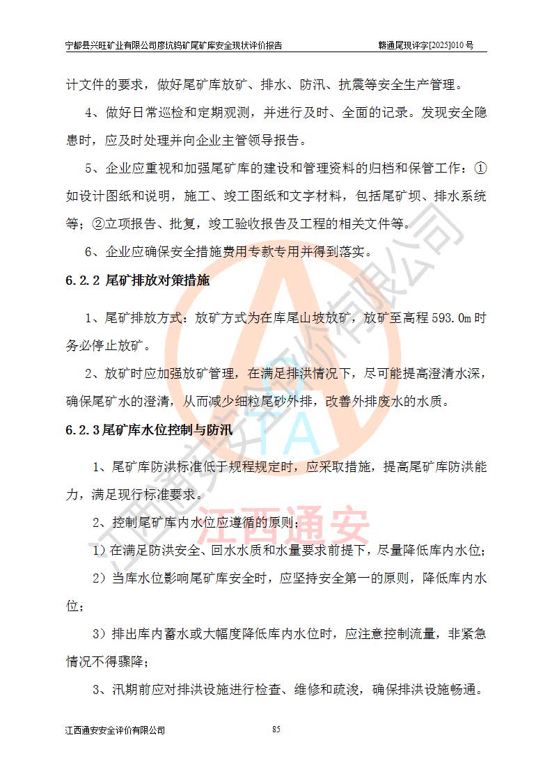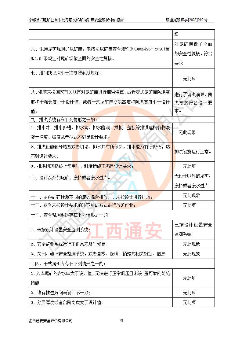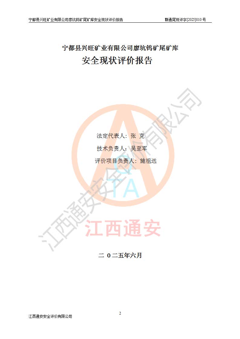寧都縣興旺礦業(yè)有限公司廖坑鎢礦位于寧都縣縣城北西直距約15km處的安福鄉(xiāng)西甲村,地理坐標:東經(jīng)115°50′48″;北緯26°32′1″。寧都縣興旺礦業(yè)有限公司成立于2006年03月29日,統(tǒng)一社會信用代碼為91360730787253633E,企業(yè)類型為有限責任公司(自然人投資或控股),企業(yè)注冊地位于江西省贛州市寧都縣安福鄉(xiāng)西甲村,法定**人為曾德強,注冊資本為1915萬元人民幣,所屬行業(yè)為有色金屬礦采選業(yè),經(jīng)營范圍包括鎢砂開采及廢砂石加工、銷售。 廖坑鎢礦尾礦庫位于寧都縣安福鄉(xiāng)西甲村、選礦廠東面約1.17Km的下游溝谷中,選礦廠年生產(chǎn)工作日300d,尾礦堆積干容重1.60 t/m3。尾礦庫匯水面積1.927km2,尾礦壩為漿砌塊石重力壩,壩頂高程595.0m,清基后壩底高程為571.0m,壩高24.0m,壩頂寬度2.7m,壩頂軸線長75.0m;上游壩坡1:0,下游壩坡1:1.0。尾礦從庫尾進行排放,設(shè)計總庫容8.5×104m3,服務年限10.9年。尾礦庫總占地面積約21.0畝。為山谷型五等庫。 該尾礦庫于1982年11月由寧都縣水電施工隊建設(shè)施工,1983年11月投產(chǎn),2007年1月由江西省冶金設(shè)計院編制了《寧都縣興旺礦業(yè)有限公司廖坑鎢礦尾礦庫整改方案設(shè)計》,2008年4月2日取得江西省安全生產(chǎn)監(jiān)督管理局頒發(fā)的安全生產(chǎn)許可證,證書編號(贛)FM安許證字[2008]M1268號。2022年江西通安安全評價有限公司編制了安全現(xiàn)狀評價報告,2022年7月15日由贛州市行政審批局下發(fā)了安全生產(chǎn)許可證,證號(贛)FM安許證字[2022]B0081號,(贛市行審證(3)字[2022]第274號),**期至2025年7月14日。 依照《非煤礦礦山企業(yè)安全生產(chǎn)許可證延期換證工作》的通知,根據(jù)***《安全生產(chǎn)許可證條例》、《江西省安全生產(chǎn)條例》、《非煤礦山安全生產(chǎn)許可證實施辦法》、《江西省非煤礦礦山企業(yè)安全生產(chǎn)許可證辦法》規(guī)定及非煤礦山安全評價導則的要求,受寧都縣興旺礦業(yè)有限公司的委托,我公司承擔廖坑鎢礦尾礦庫延期換證的安全現(xiàn)狀評價工作。 |
