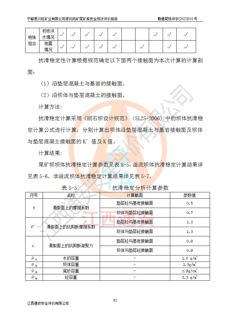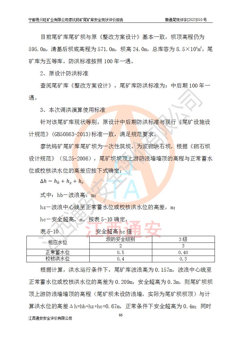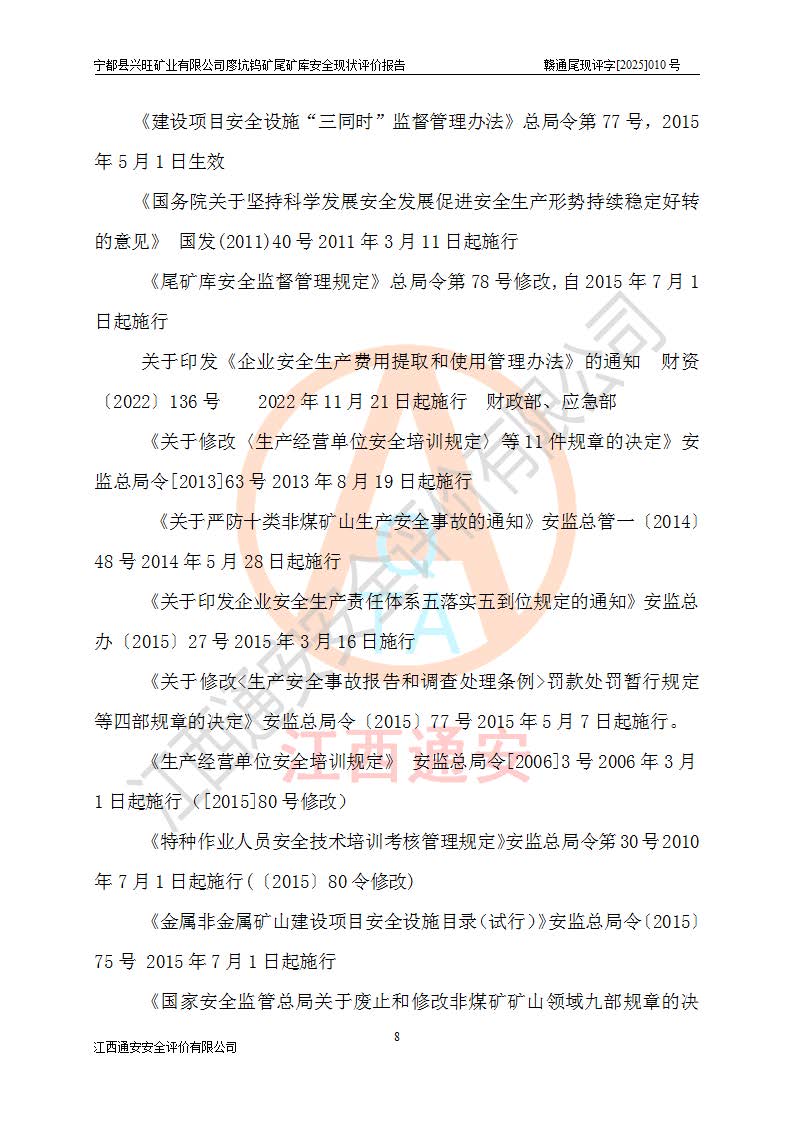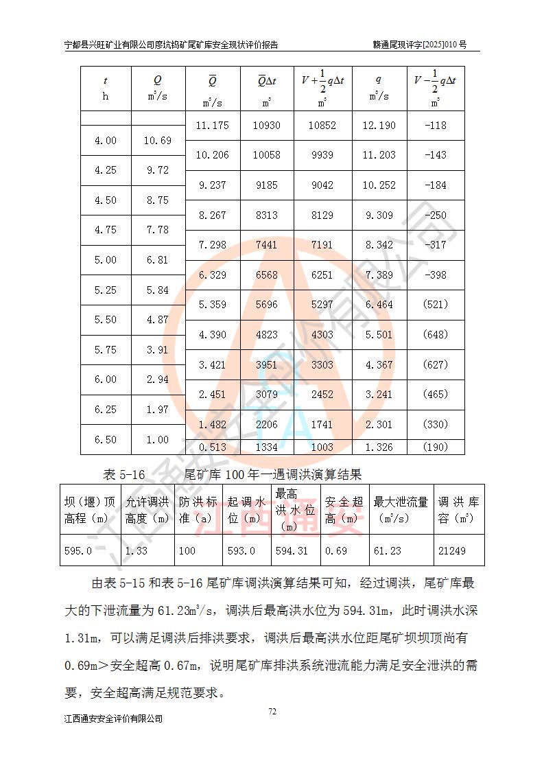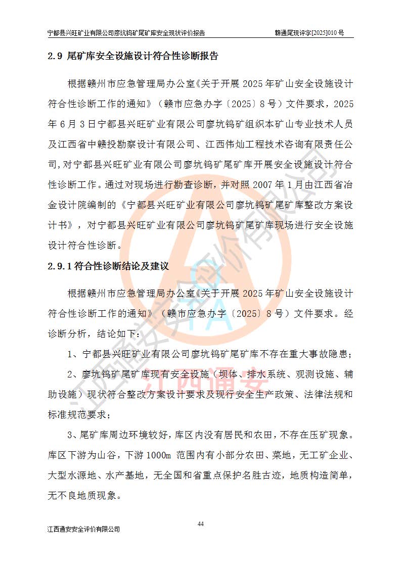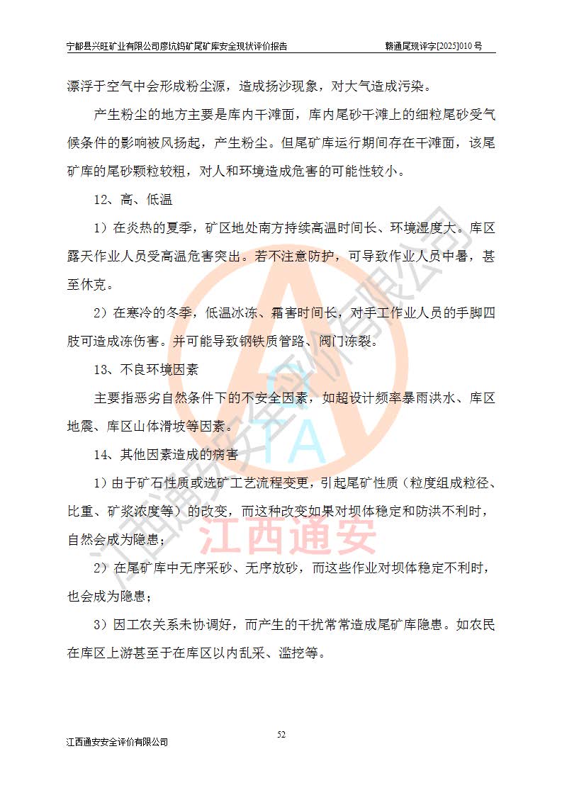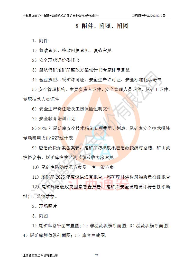 寧都縣興旺礦業(yè)有限公司廖坑鎢礦位于寧都縣縣城北西直距約15km處的安福鄉(xiāng)西甲村,地理坐標:東經(jīng)115°50′48″;北緯26°32′1″。寧都縣興旺礦業(yè)有限公司成立于2006年03月29日,統(tǒng)一社會信用代碼為91360730787253633E,企業(yè)類型為有限責任公司(自然人投資或控股),企業(yè)注冊地位于江西省贛州市寧都縣安福鄉(xiāng)西甲村,法定**人為曾德強,注冊資本為1915萬元人民幣,所屬行業(yè)為有色金屬礦采選業(yè),經(jīng)營范圍包括鎢砂開采及廢砂石加工、銷售。 廖坑鎢礦尾礦庫位于寧都縣安福鄉(xiāng)西甲村、選礦廠東面約1.17Km的下游溝谷中,選礦廠年生產(chǎn)工作日300d,尾礦堆積干容重1.60 t/m3。尾礦庫匯水面積1.927km2,尾礦壩為漿砌塊石重力壩,壩頂高程595.0m,清基后壩底高程為571.0m,壩高24.0m,壩頂寬度2.7m,壩頂軸線長75.0m;上游壩坡1:0,下游壩坡1:1.0。尾礦從庫尾進行排放,設(shè)計總庫容8.5×104m3,服務年限10.9年。尾礦庫總占地面積約21.0畝。為山谷型五等庫。 該尾礦庫于1982年11月由寧都縣水電施工隊建設(shè)施工,1983年11月投產(chǎn),2007年1月由江西省冶金設(shè)計院編制了《寧都縣興旺礦業(yè)有限公司廖坑鎢礦尾礦庫整改方案設(shè)計》,2008年4月2日取得江西省安全生產(chǎn)監(jiān)督管理局頒發(fā)的安全生產(chǎn)許可證,證書編號(贛)FM安許證字[2008]M1268號。2022年江西通安安全評價有限公司編制了安全現(xiàn)狀評價報告,2022年7月15日由贛州市行政審批局下發(fā)了安全生產(chǎn)許可證,證號(贛)FM安許證字[2022]B0081號,(贛市行審證(3)字[2022]第274號),**期至2025年7月14日。 依照《非煤礦礦山企業(yè)安全生產(chǎn)許可證延期換證工作》的通知,根據(jù)***《安全生產(chǎn)許可證條例》、《江西省安全生產(chǎn)條例》、《非煤礦山安全生產(chǎn)許可證實施辦法》、《江西省非煤礦礦山企業(yè)安全生產(chǎn)許可證辦法》規(guī)定及非煤礦山安全評價導則的要求,受寧都縣興旺礦業(yè)有限公司的委托,我公司承擔廖坑鎢礦尾礦庫延期換證的安全現(xiàn)狀評價工作。 |
