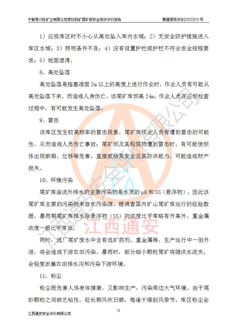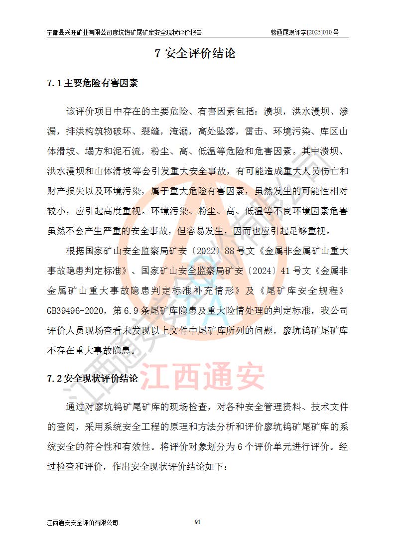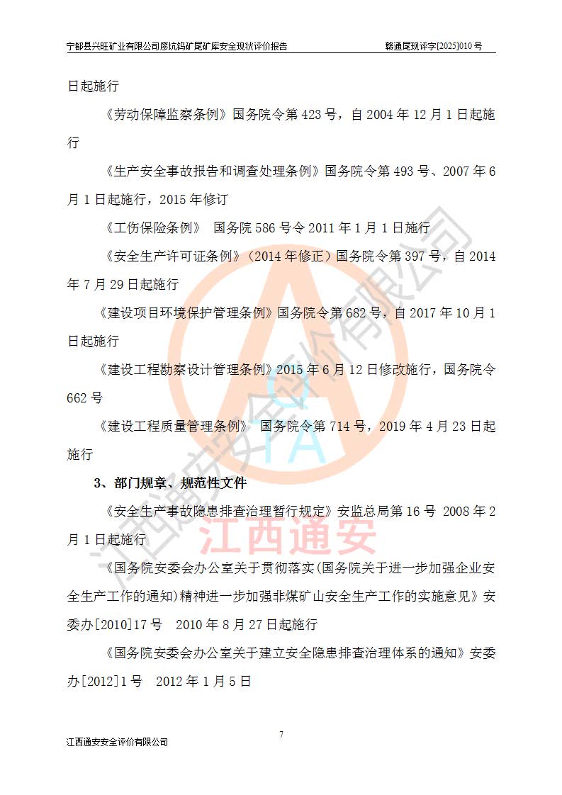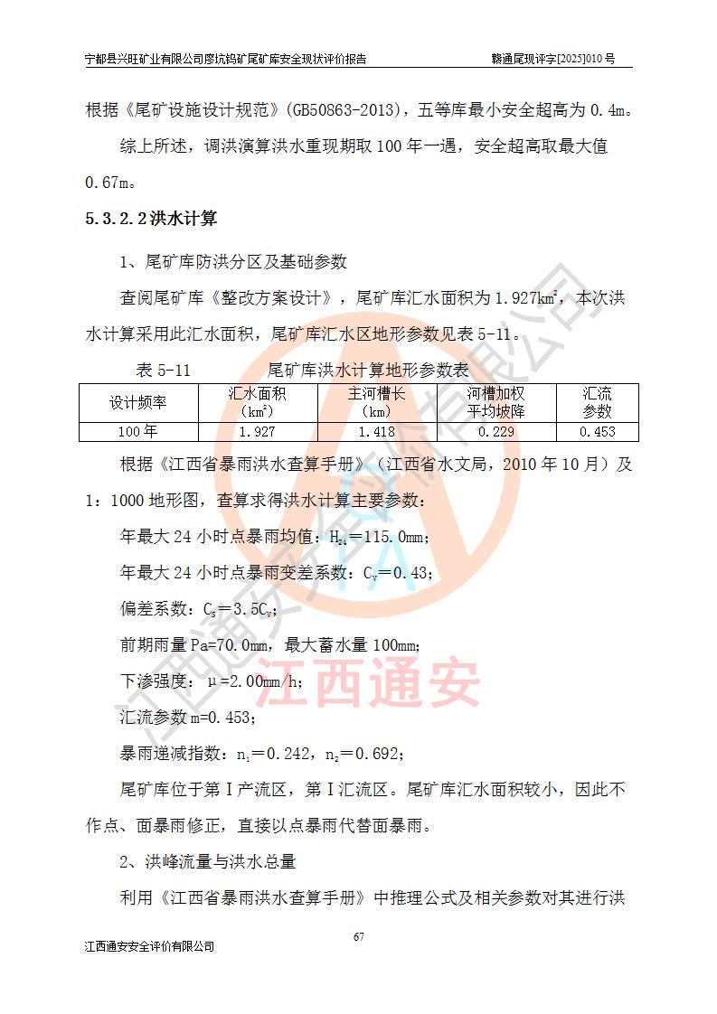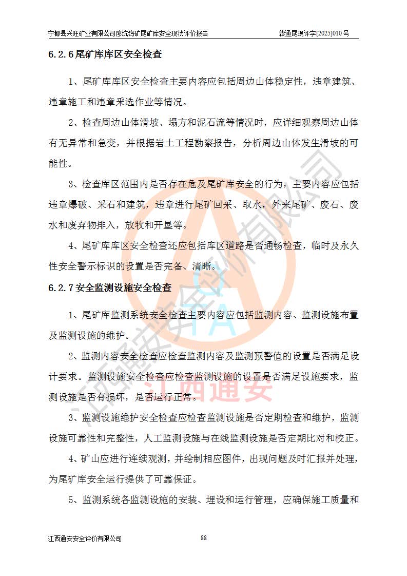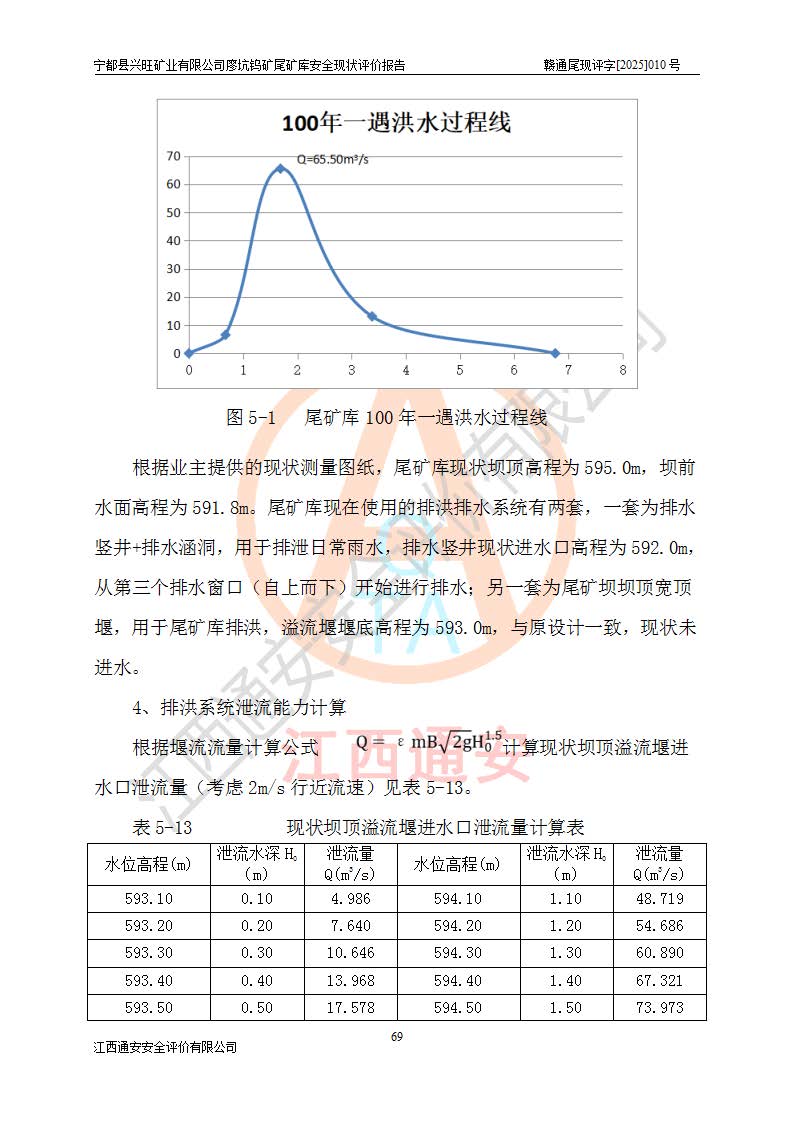 寧都縣興旺礦業(yè)有限公司廖坑鎢礦位于寧都縣縣城北西直距約15km處的安福鄉(xiāng)西甲村,地理坐標:東經(jīng)115°50′48″;北緯26°32′1″。寧都縣興旺礦業(yè)有限公司成立于2006年03月29日,統(tǒng)一社會信用代碼為91360730787253633E,企業(yè)類型為有限責任公司(自然人投資或控股),企業(yè)注冊地位于江西省贛州市寧都縣安福鄉(xiāng)西甲村,法定**人為曾德強,注冊資本為1915萬元人民幣,所屬行業(yè)為有色金屬礦采選業(yè),經(jīng)營范圍包括鎢砂開采及廢砂石加工、銷售。 廖坑鎢礦尾礦庫位于寧都縣安福鄉(xiāng)西甲村、選礦廠東面約1.17Km的下游溝谷中,選礦廠年生產(chǎn)工作日300d,尾礦堆積干容重1.60 t/m3。尾礦庫匯水面積1.927km2,尾礦壩為漿砌塊石重力壩,壩頂高程595.0m,清基后壩底高程為571.0m,壩高24.0m,壩頂寬度2.7m,壩頂軸線長75.0m;上游壩坡1:0,下游壩坡1:1.0。尾礦從庫尾進行排放,設(shè)計總庫容8.5×104m3,服務年限10.9年。尾礦庫總占地面積約21.0畝。為山谷型五等庫。 該尾礦庫于1982年11月由寧都縣水電施工隊建設(shè)施工,1983年11月投產(chǎn),2007年1月由江西省冶金設(shè)計院編制了《寧都縣興旺礦業(yè)有限公司廖坑鎢礦尾礦庫整改方案設(shè)計》,2008年4月2日取得江西省安全生產(chǎn)監(jiān)督管理局頒發(fā)的安全生產(chǎn)許可證,證書編號(贛)FM安許證字[2008]M1268號。2022年江西通安安全評價有限公司編制了安全現(xiàn)狀評價報告,2022年7月15日由贛州市行政審批局下發(fā)了安全生產(chǎn)許可證,證號(贛)FM安許證字[2022]B0081號,(贛市行審證(3)字[2022]第274號),**期至2025年7月14日。 依照《非煤礦礦山企業(yè)安全生產(chǎn)許可證延期換證工作》的通知,根據(jù)***《安全生產(chǎn)許可證條例》、《江西省安全生產(chǎn)條例》、《非煤礦山安全生產(chǎn)許可證實施辦法》、《江西省非煤礦礦山企業(yè)安全生產(chǎn)許可證辦法》規(guī)定及非煤礦山安全評價導則的要求,受寧都縣興旺礦業(yè)有限公司的委托,我公司承擔廖坑鎢礦尾礦庫延期換證的安全現(xiàn)狀評價工作。 |