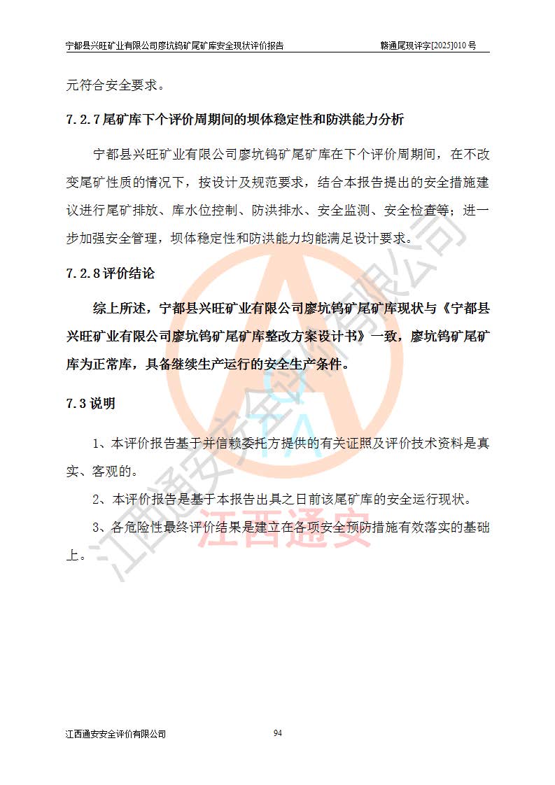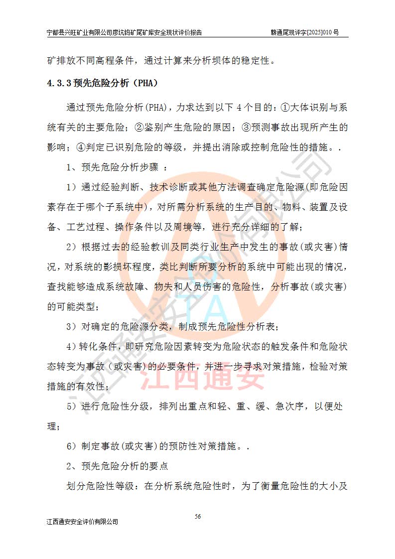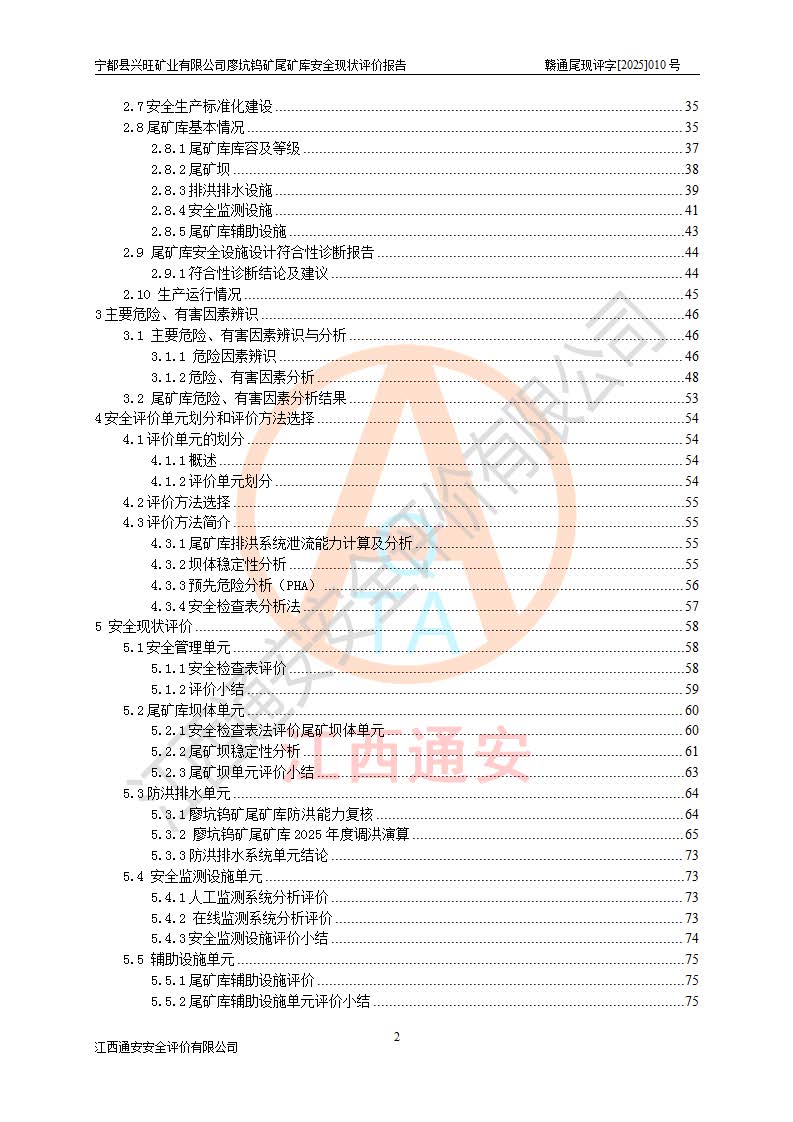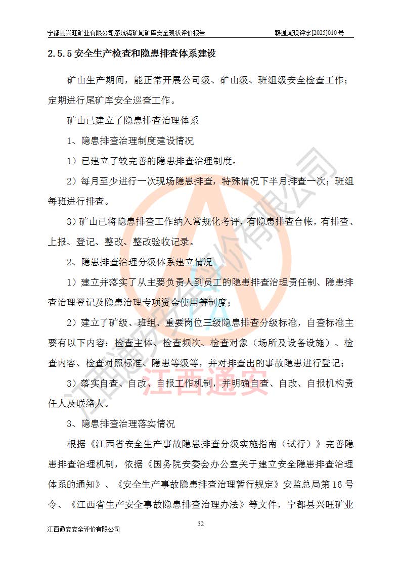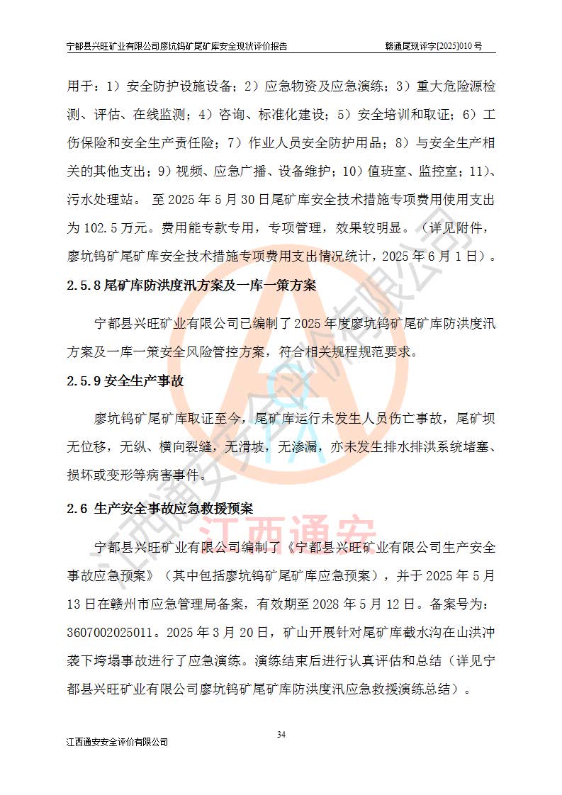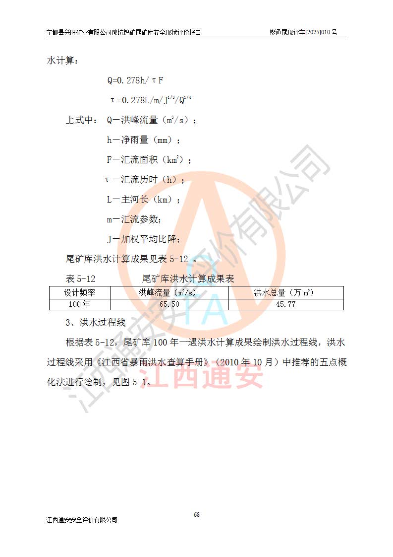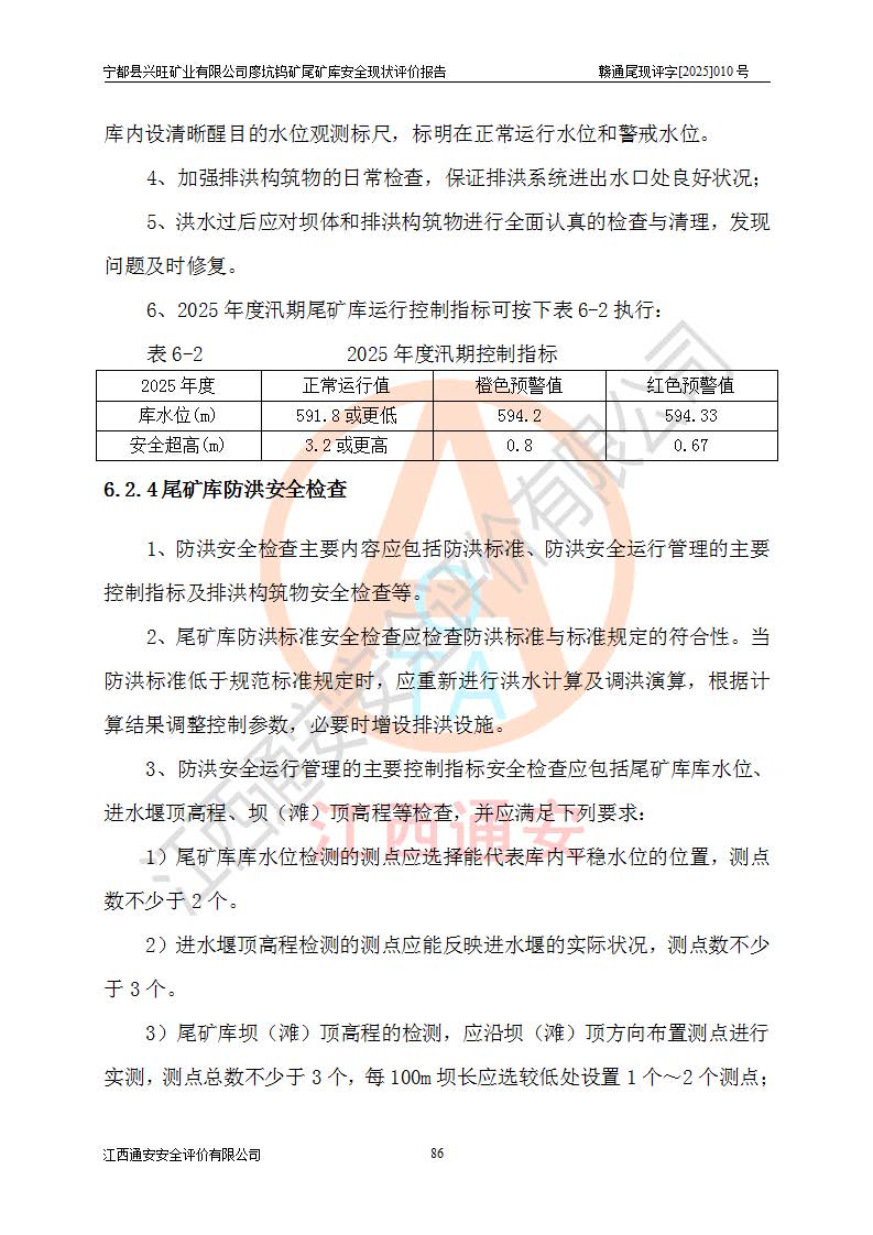 寧都縣興旺礦業(yè)有限公司廖坑鎢礦位于寧都縣縣城北西直距約15km處的安福鄉(xiāng)西甲村,地理坐標:東經(jīng)115°50′48″;北緯26°32′1″。寧都縣興旺礦業(yè)有限公司成立于2006年03月29日,統(tǒng)一社會信用代碼為91360730787253633E,企業(yè)類型為有限責任公司(自然人投資或控股),企業(yè)注冊地位于江西省贛州市寧都縣安福鄉(xiāng)西甲村,法定**人為曾德強,注冊資本為1915萬元人民幣,所屬行業(yè)為有色金屬礦采選業(yè),經(jīng)營范圍包括鎢砂開采及廢砂石加工、銷售。 廖坑鎢礦尾礦庫位于寧都縣安福鄉(xiāng)西甲村、選礦廠東面約1.17Km的下游溝谷中,選礦廠年生產(chǎn)工作日300d,尾礦堆積干容重1.60 t/m3。尾礦庫匯水面積1.927km2,尾礦壩為漿砌塊石重力壩,壩頂高程595.0m,清基后壩底高程為571.0m,壩高24.0m,壩頂寬度2.7m,壩頂軸線長75.0m;上游壩坡1:0,下游壩坡1:1.0。尾礦從庫尾進行排放,設(shè)計總庫容8.5×104m3,服務年限10.9年。尾礦庫總占地面積約21.0畝。為山谷型五等庫。 該尾礦庫于1982年11月由寧都縣水電施工隊建設(shè)施工,1983年11月投產(chǎn),2007年1月由江西省冶金設(shè)計院編制了《寧都縣興旺礦業(yè)有限公司廖坑鎢礦尾礦庫整改方案設(shè)計》,2008年4月2日取得江西省安全生產(chǎn)監(jiān)督管理局頒發(fā)的安全生產(chǎn)許可證,證書編號(贛)FM安許證字[2008]M1268號。2022年江西通安安全評價有限公司編制了安全現(xiàn)狀評價報告,2022年7月15日由贛州市行政審批局下發(fā)了安全生產(chǎn)許可證,證號(贛)FM安許證字[2022]B0081號,(贛市行審證(3)字[2022]第274號),**期至2025年7月14日。 依照《非煤礦礦山企業(yè)安全生產(chǎn)許可證延期換證工作》的通知,根據(jù)***《安全生產(chǎn)許可證條例》、《江西省安全生產(chǎn)條例》、《非煤礦山安全生產(chǎn)許可證實施辦法》、《江西省非煤礦礦山企業(yè)安全生產(chǎn)許可證辦法》規(guī)定及非煤礦山安全評價導則的要求,受寧都縣興旺礦業(yè)有限公司的委托,我公司承擔廖坑鎢礦尾礦庫延期換證的安全現(xiàn)狀評價工作。 |