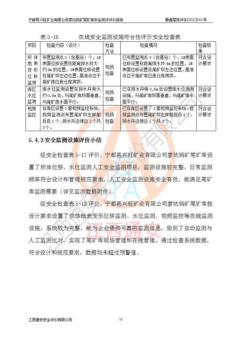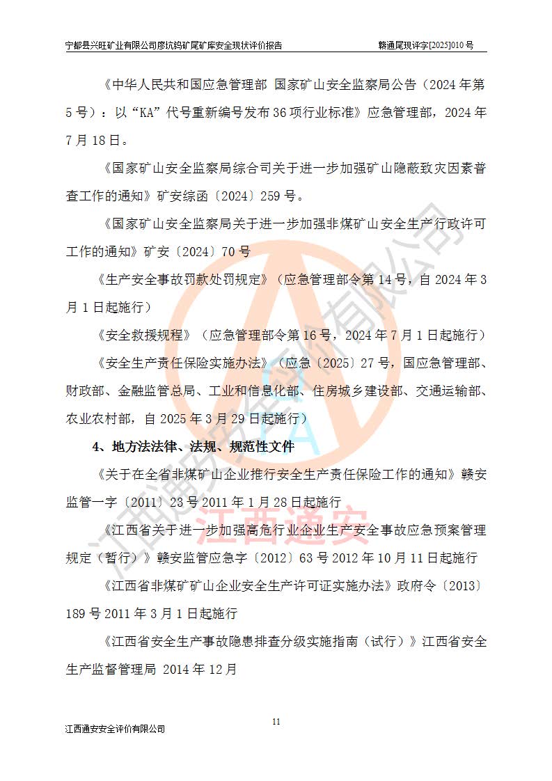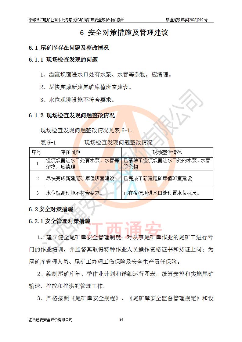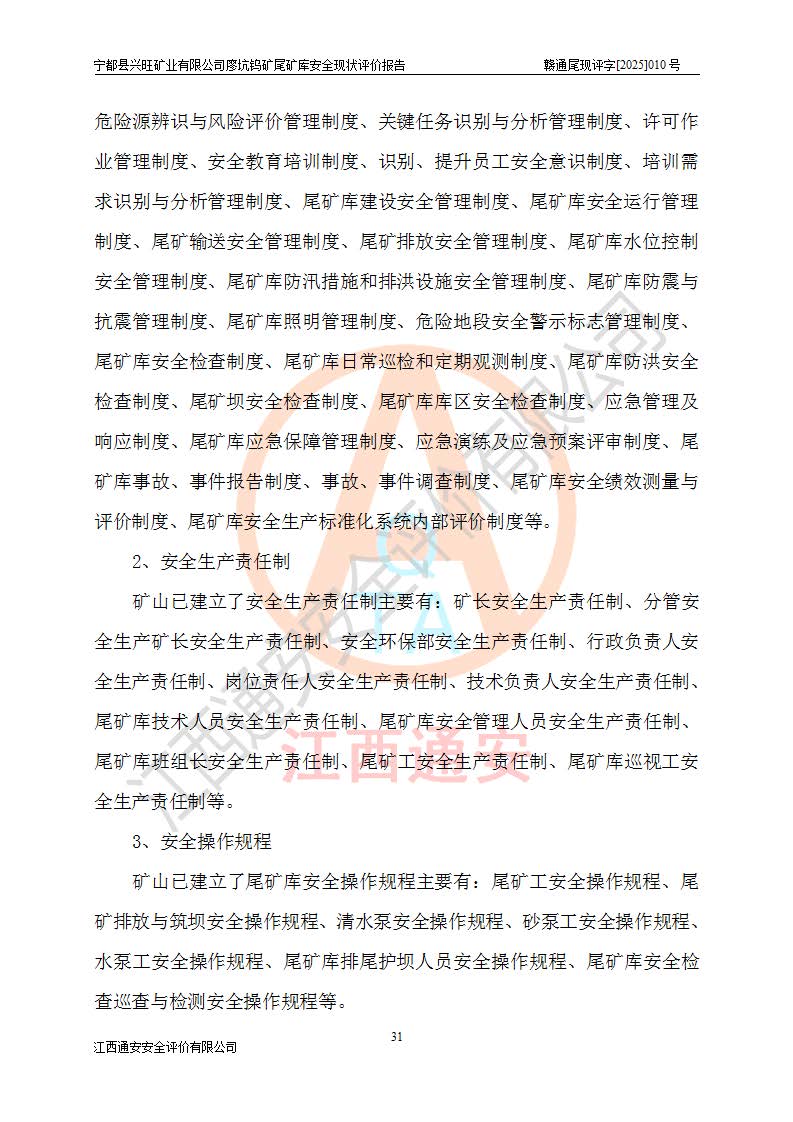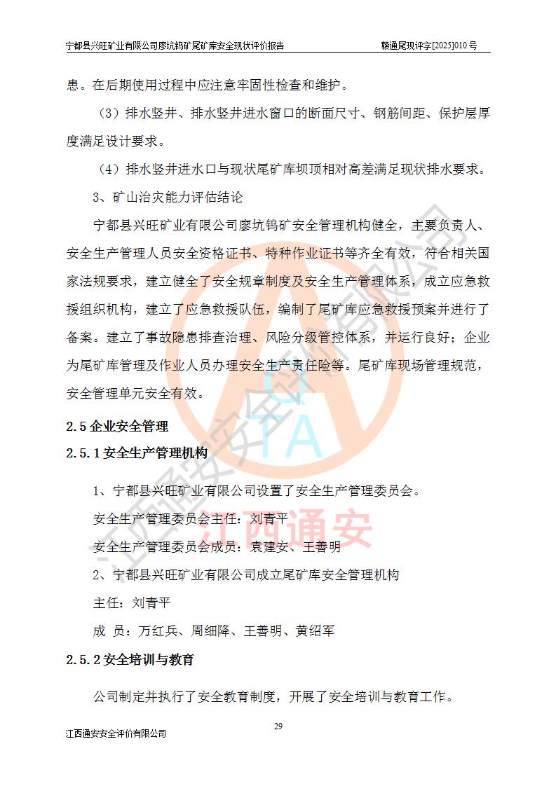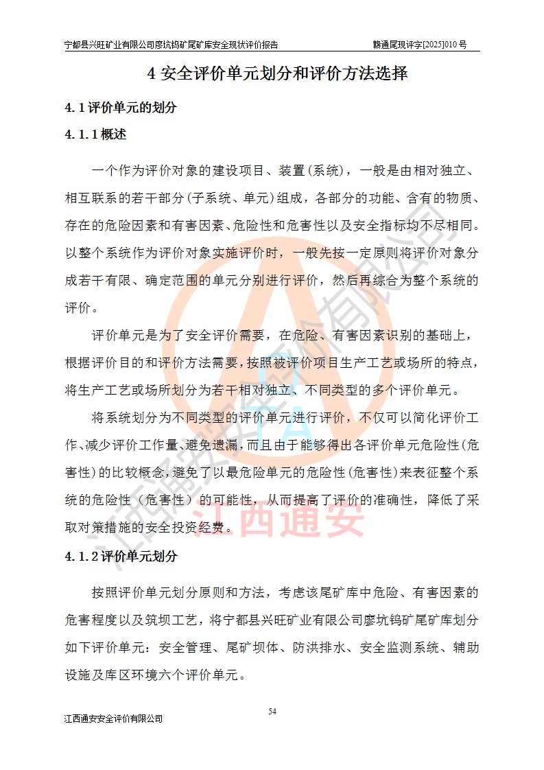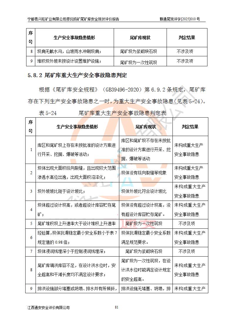 寧都縣興旺礦業(yè)有限公司廖坑鎢礦位于寧都縣縣城北西直距約15km處的安福鄉(xiāng)西甲村,地理坐標:東經(jīng)115°50′48″;北緯26°32′1″。寧都縣興旺礦業(yè)有限公司成立于2006年03月29日,統(tǒng)一社會信用代碼為91360730787253633E,企業(yè)類型為有限責任公司(自然人投資或控股),企業(yè)注冊地位于江西省贛州市寧都縣安福鄉(xiāng)西甲村,法定**人為曾德強,注冊資本為1915萬元人民幣,所屬行業(yè)為有色金屬礦采選業(yè),經(jīng)營范圍包括鎢砂開采及廢砂石加工、銷售。 廖坑鎢礦尾礦庫位于寧都縣安福鄉(xiāng)西甲村、選礦廠東面約1.17Km的下游溝谷中,選礦廠年生產(chǎn)工作日300d,尾礦堆積干容重1.60 t/m3。尾礦庫匯水面積1.927km2,尾礦壩為漿砌塊石重力壩,壩頂高程595.0m,清基后壩底高程為571.0m,壩高24.0m,壩頂寬度2.7m,壩頂軸線長75.0m;上游壩坡1:0,下游壩坡1:1.0。尾礦從庫尾進行排放,設(shè)計總庫容8.5×104m3,服務年限10.9年。尾礦庫總占地面積約21.0畝。為山谷型五等庫。 該尾礦庫于1982年11月由寧都縣水電施工隊建設(shè)施工,1983年11月投產(chǎn),2007年1月由江西省冶金設(shè)計院編制了《寧都縣興旺礦業(yè)有限公司廖坑鎢礦尾礦庫整改方案設(shè)計》,2008年4月2日取得江西省安全生產(chǎn)監(jiān)督管理局頒發(fā)的安全生產(chǎn)許可證,證書編號(贛)FM安許證字[2008]M1268號。2022年江西通安安全評價有限公司編制了安全現(xiàn)狀評價報告,2022年7月15日由贛州市行政審批局下發(fā)了安全生產(chǎn)許可證,證號(贛)FM安許證字[2022]B0081號,(贛市行審證(3)字[2022]第274號),**期至2025年7月14日。 依照《非煤礦礦山企業(yè)安全生產(chǎn)許可證延期換證工作》的通知,根據(jù)***《安全生產(chǎn)許可證條例》、《江西省安全生產(chǎn)條例》、《非煤礦山安全生產(chǎn)許可證實施辦法》、《江西省非煤礦礦山企業(yè)安全生產(chǎn)許可證辦法》規(guī)定及非煤礦山安全評價導則的要求,受寧都縣興旺礦業(yè)有限公司的委托,我公司承擔廖坑鎢礦尾礦庫延期換證的安全現(xiàn)狀評價工作。 |