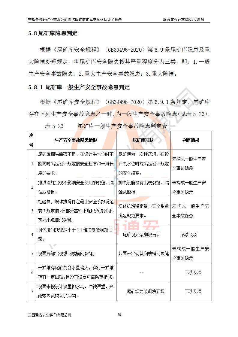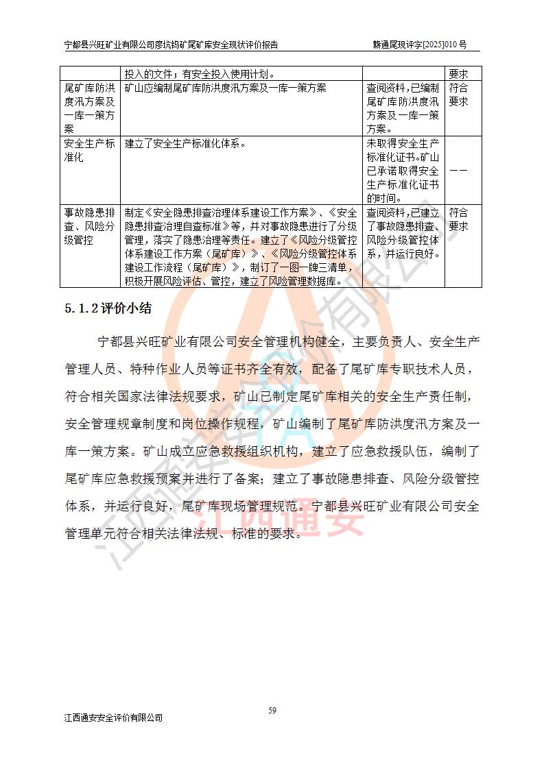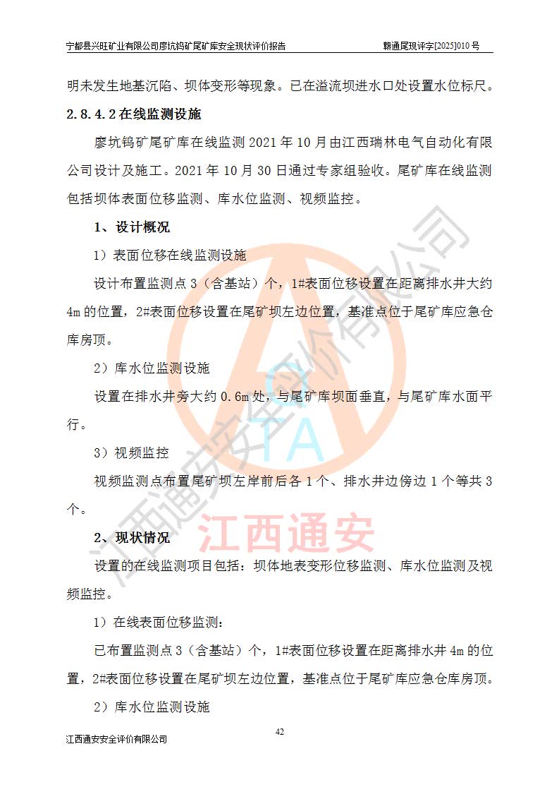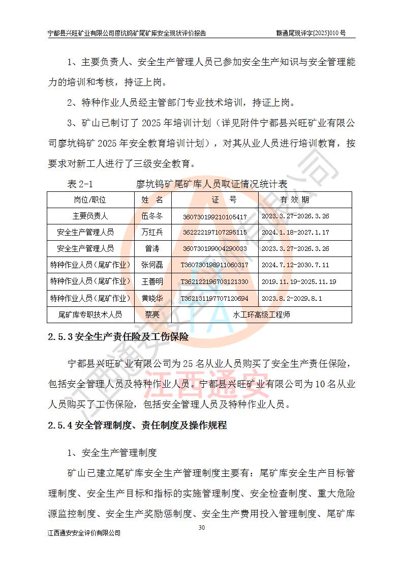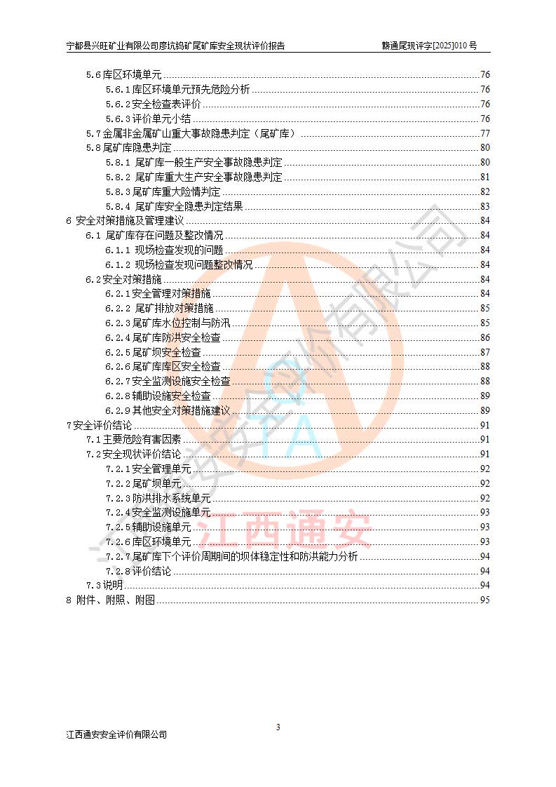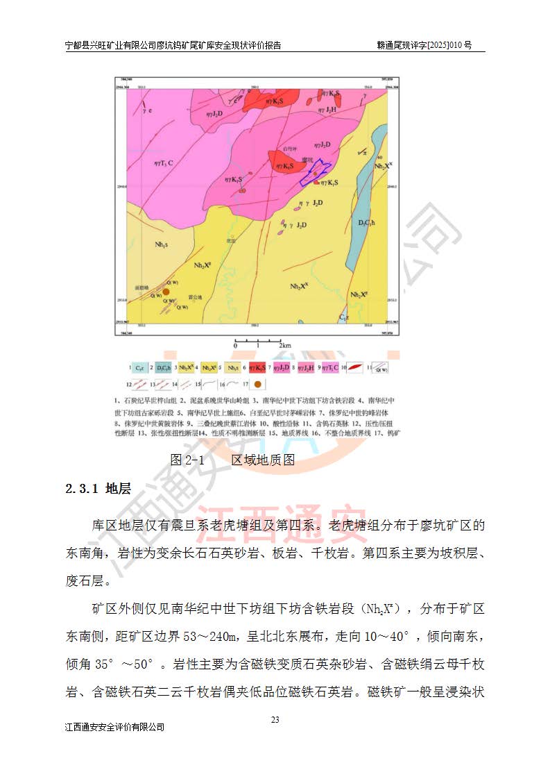 寧都縣興旺礦業(yè)有限公司廖坑鎢礦位于寧都縣縣城北西直距約15km處的安福鄉(xiāng)西甲村,地理坐標:東經(jīng)115°50′48″;北緯26°32′1″。寧都縣興旺礦業(yè)有限公司成立于2006年03月29日,統(tǒng)一社會信用代碼為91360730787253633E,企業(yè)類型為有限責任公司(自然人投資或控股),企業(yè)注冊地位于江西省贛州市寧都縣安福鄉(xiāng)西甲村,法定**人為曾德強,注冊資本為1915萬元人民幣,所屬行業(yè)為有色金屬礦采選業(yè),經(jīng)營范圍包括鎢砂開采及廢砂石加工、銷售。 廖坑鎢礦尾礦庫位于寧都縣安福鄉(xiāng)西甲村、選礦廠東面約1.17Km的下游溝谷中,選礦廠年生產(chǎn)工作日300d,尾礦堆積干容重1.60 t/m3。尾礦庫匯水面積1.927km2,尾礦壩為漿砌塊石重力壩,壩頂高程595.0m,清基后壩底高程為571.0m,壩高24.0m,壩頂寬度2.7m,壩頂軸線長75.0m;上游壩坡1:0,下游壩坡1:1.0。尾礦從庫尾進行排放,設(shè)計總庫容8.5×104m3,服務年限10.9年。尾礦庫總占地面積約21.0畝。為山谷型五等庫。 該尾礦庫于1982年11月由寧都縣水電施工隊建設(shè)施工,1983年11月投產(chǎn),2007年1月由江西省冶金設(shè)計院編制了《寧都縣興旺礦業(yè)有限公司廖坑鎢礦尾礦庫整改方案設(shè)計》,2008年4月2日取得江西省安全生產(chǎn)監(jiān)督管理局頒發(fā)的安全生產(chǎn)許可證,證書編號(贛)FM安許證字[2008]M1268號。2022年江西通安安全評價有限公司編制了安全現(xiàn)狀評價報告,2022年7月15日由贛州市行政審批局下發(fā)了安全生產(chǎn)許可證,證號(贛)FM安許證字[2022]B0081號,(贛市行審證(3)字[2022]第274號),**期至2025年7月14日。 依照《非煤礦礦山企業(yè)安全生產(chǎn)許可證延期換證工作》的通知,根據(jù)***《安全生產(chǎn)許可證條例》、《江西省安全生產(chǎn)條例》、《非煤礦山安全生產(chǎn)許可證實施辦法》、《江西省非煤礦礦山企業(yè)安全生產(chǎn)許可證辦法》規(guī)定及非煤礦山安全評價導則的要求,受寧都縣興旺礦業(yè)有限公司的委托,我公司承擔廖坑鎢礦尾礦庫延期換證的安全現(xiàn)狀評價工作。 |
