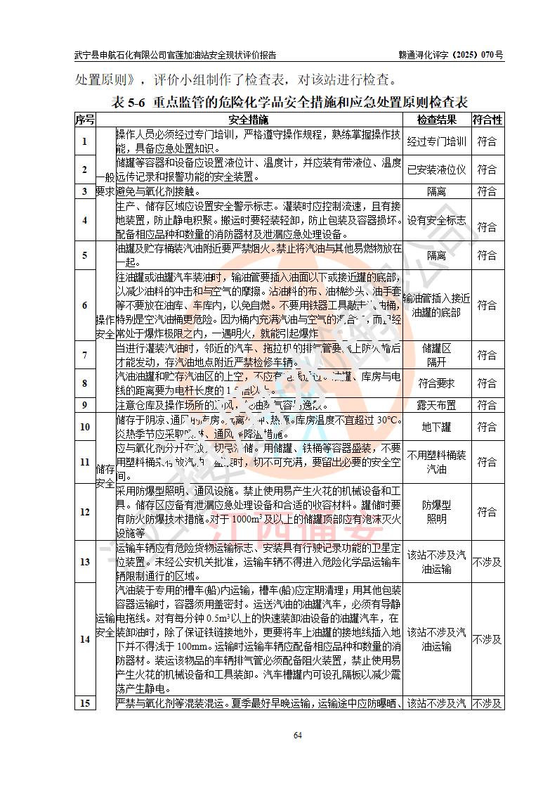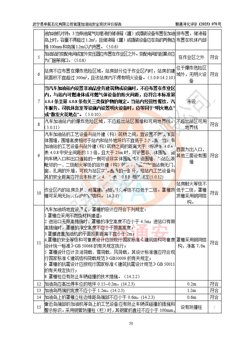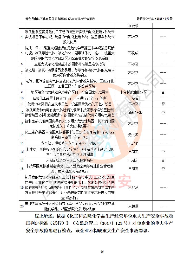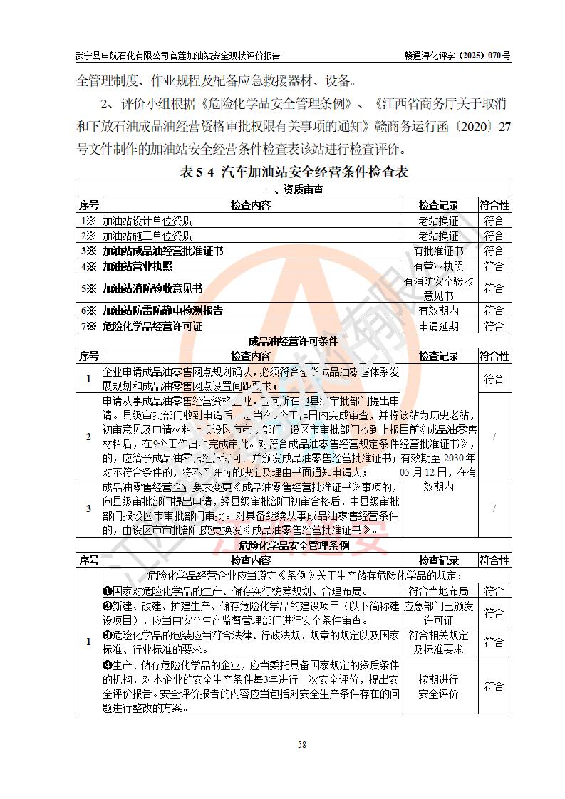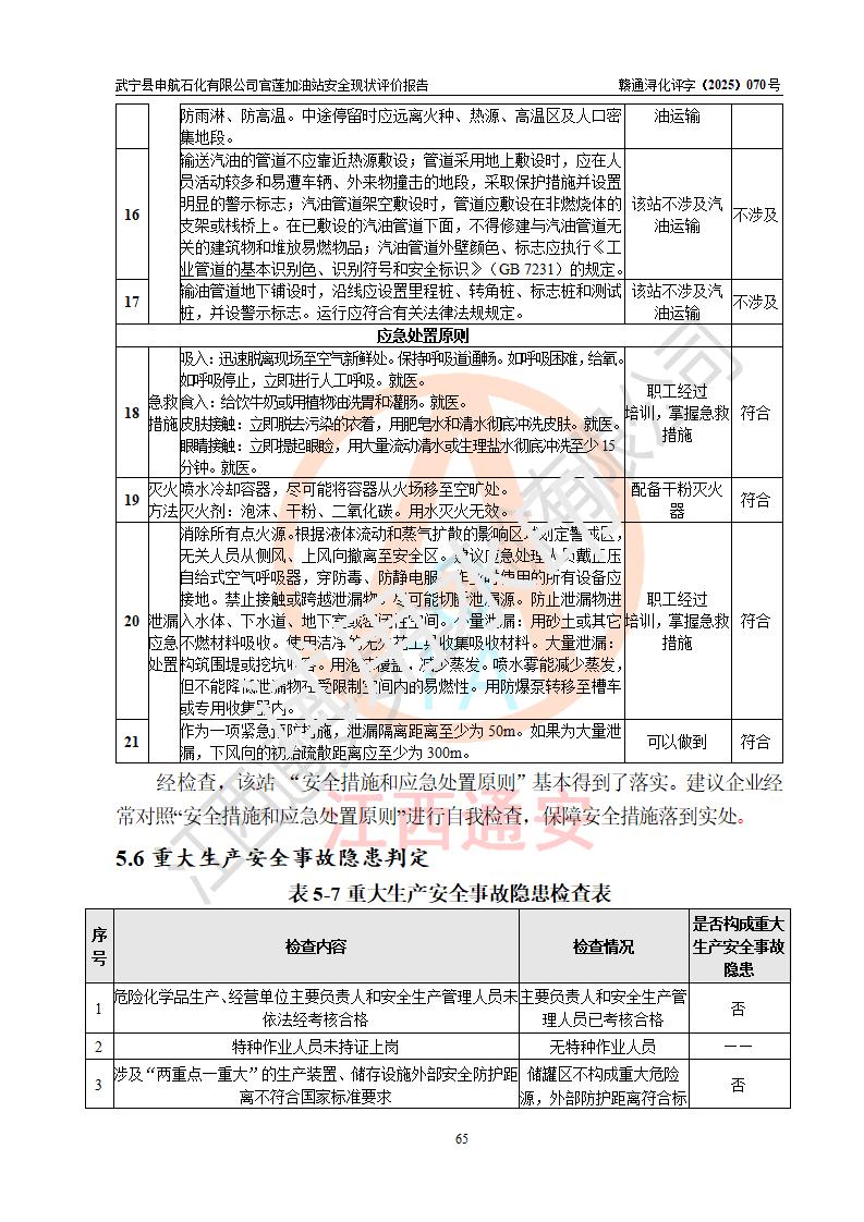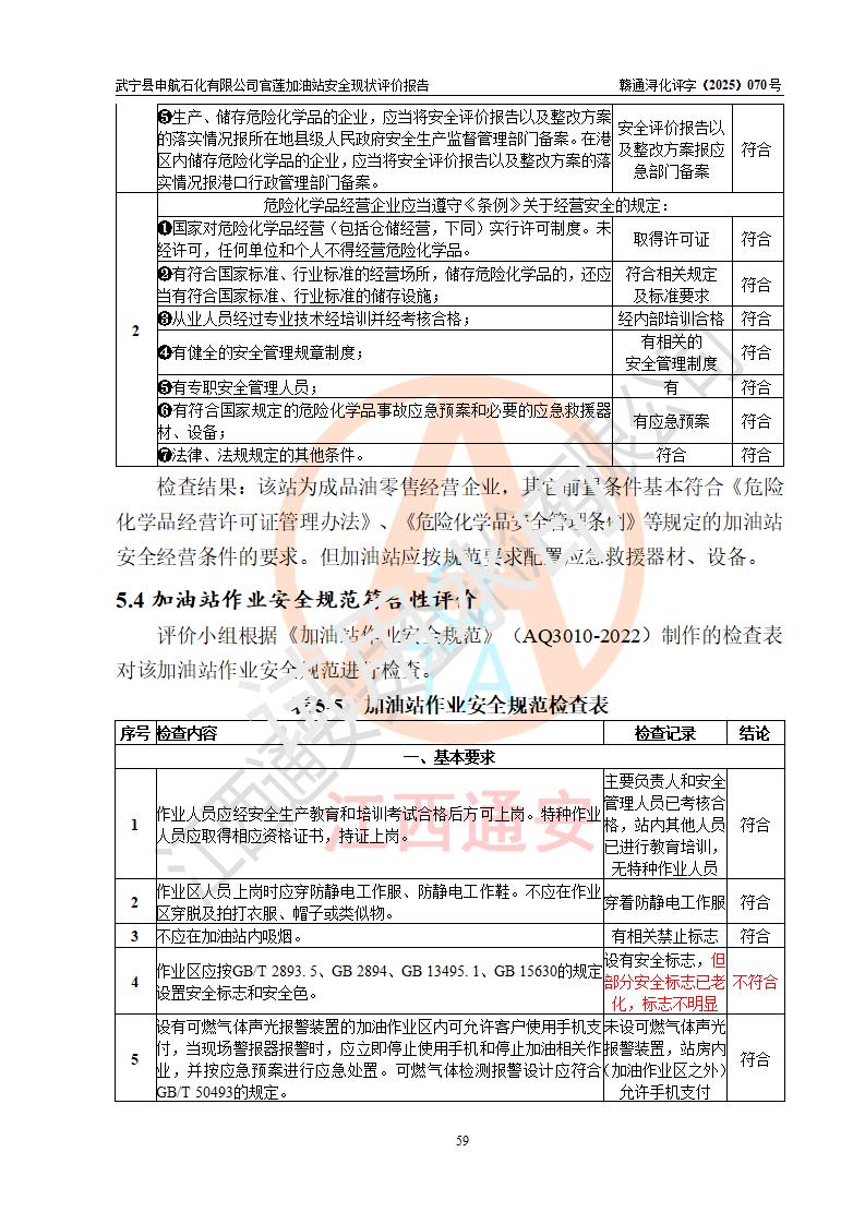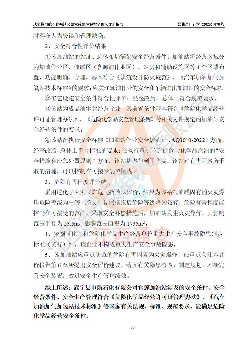 評價(jià)結(jié)論 | 武寧縣申航石化有限公司官蓮加油站涉及的安全條件、安全經(jīng)營條件、安全生產(chǎn)管理符合《危險(xiǎn)化學(xué)品經(jīng)營許可證管理辦法》、《汽車加油加氣加氫站技術(shù)標(biāo)準(zhǔn)》等**有關(guān)法規(guī)、標(biāo)準(zhǔn)、規(guī)范要求,能滿足危險(xiǎn)化學(xué)品經(jīng)營安全條件。 | |||