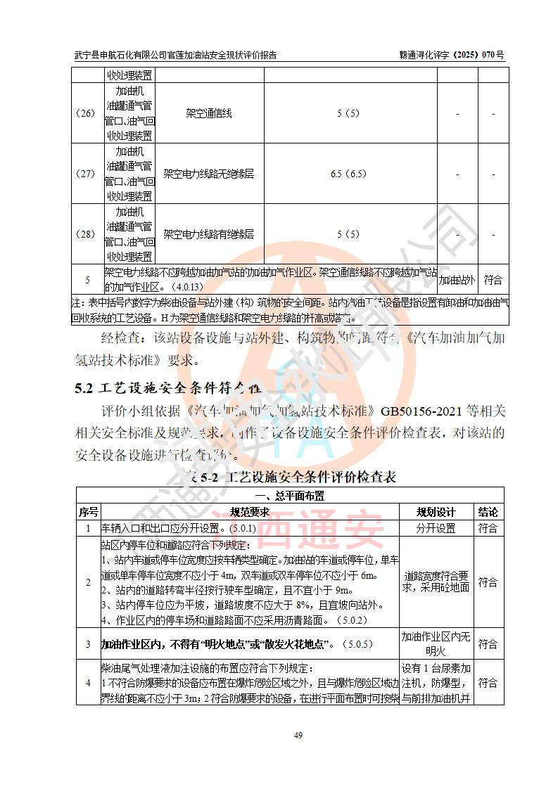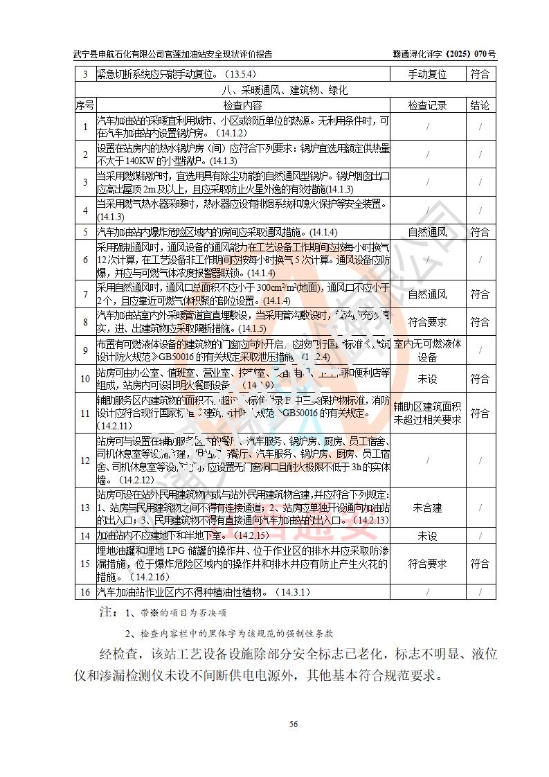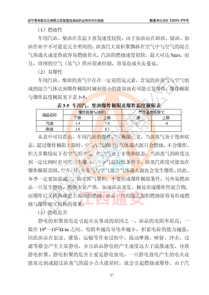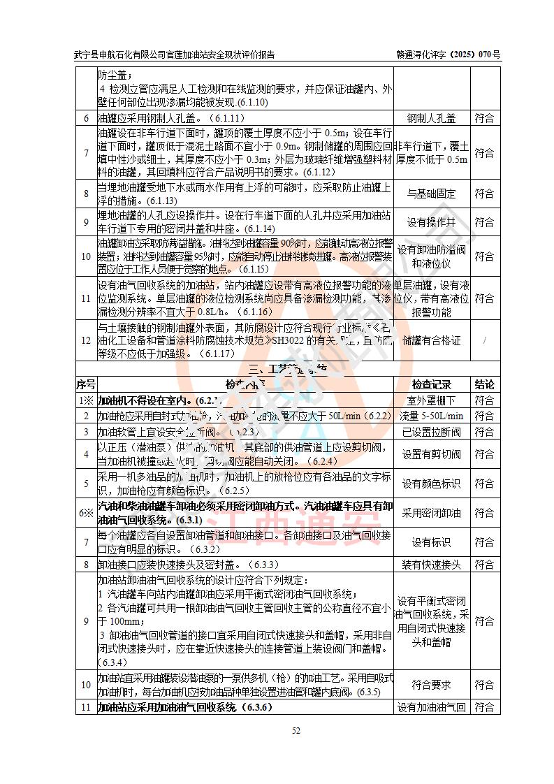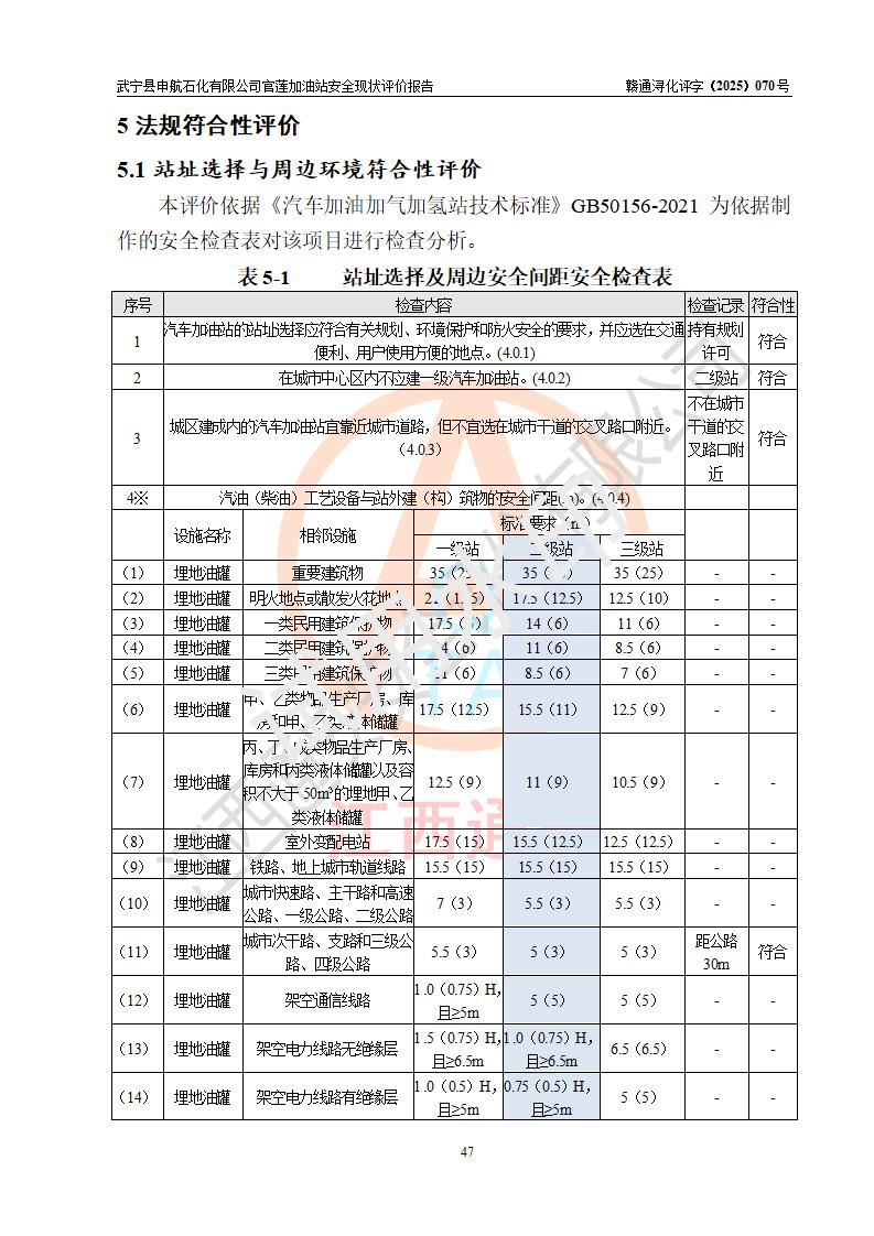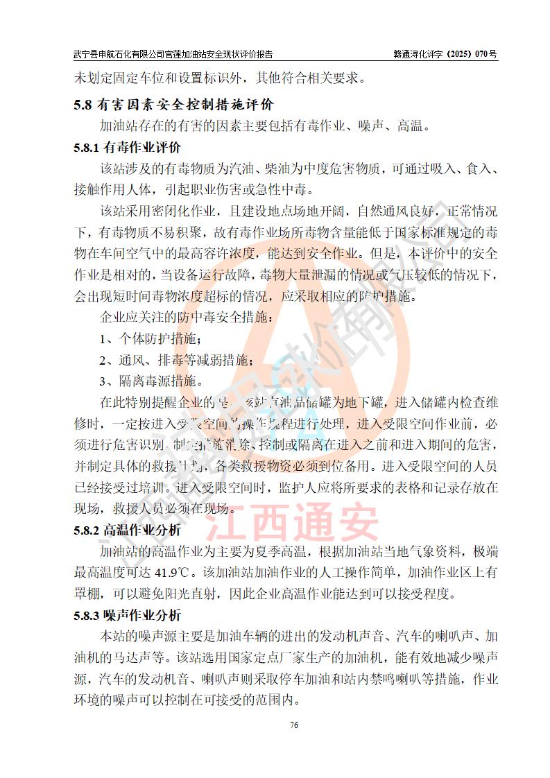 評價(jià)結(jié)論 | 武寧縣申航石化有限公司官蓮加油站涉及的安全條件、安全經(jīng)營條件、安全生產(chǎn)管理符合《危險(xiǎn)化學(xué)品經(jīng)營許可證管理辦法》、《汽車加油加氣加氫站技術(shù)標(biāo)準(zhǔn)》等**有關(guān)法規(guī)、標(biāo)準(zhǔn)、規(guī)范要求,能滿足危險(xiǎn)化學(xué)品經(jīng)營安全條件。 | |||