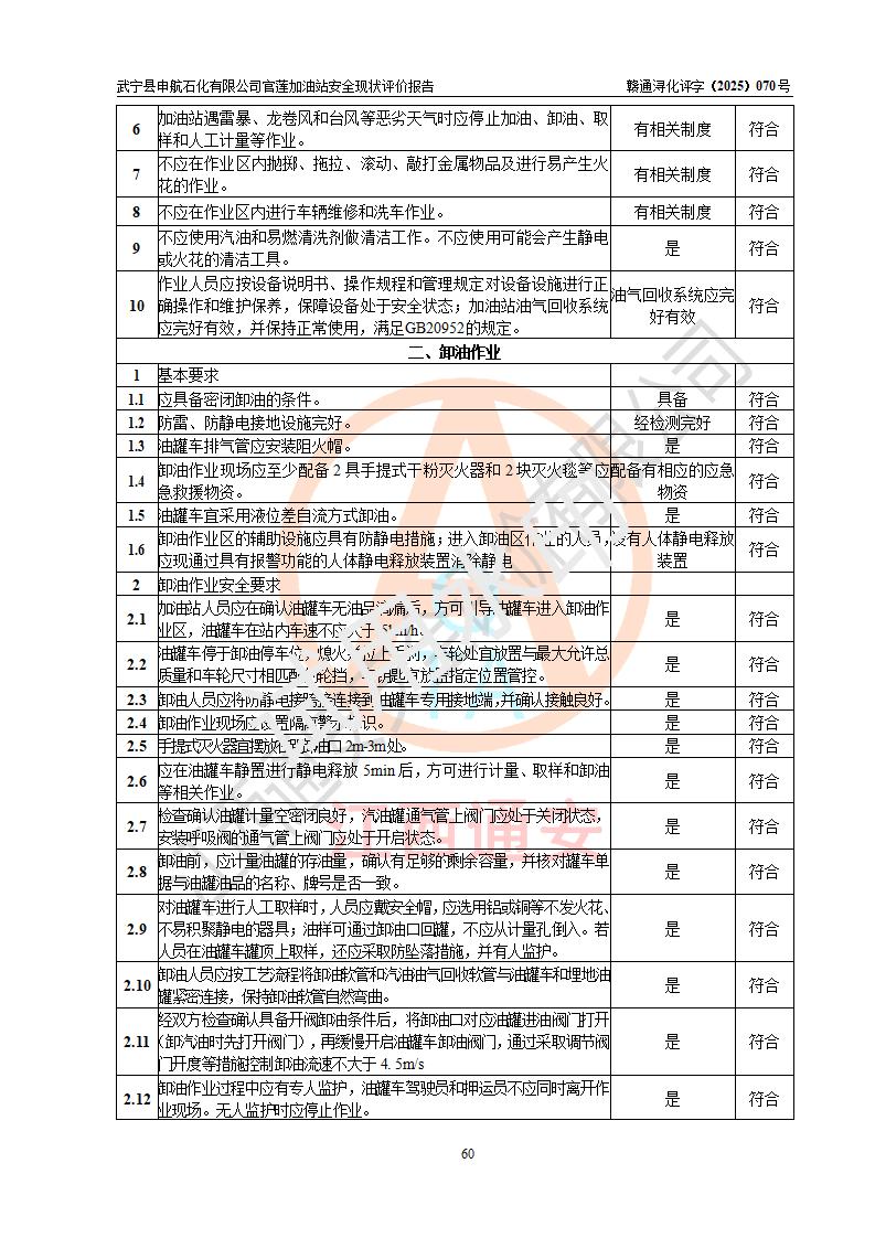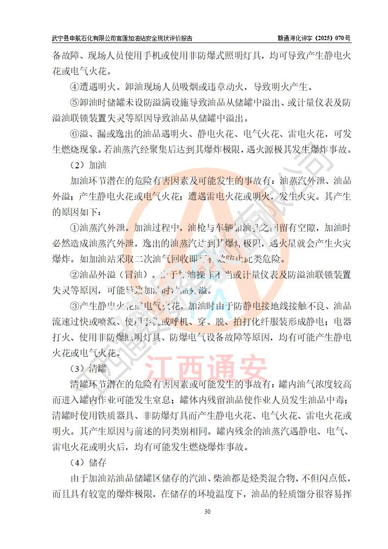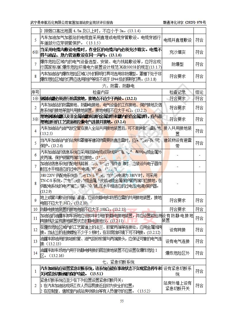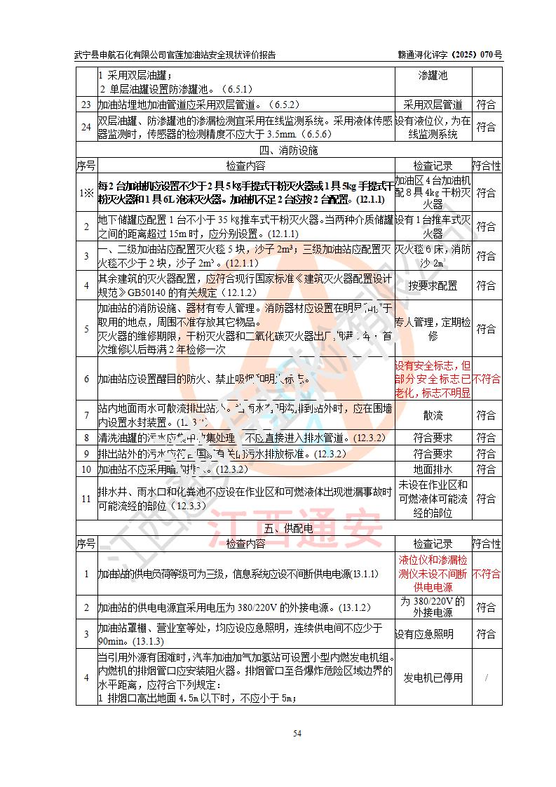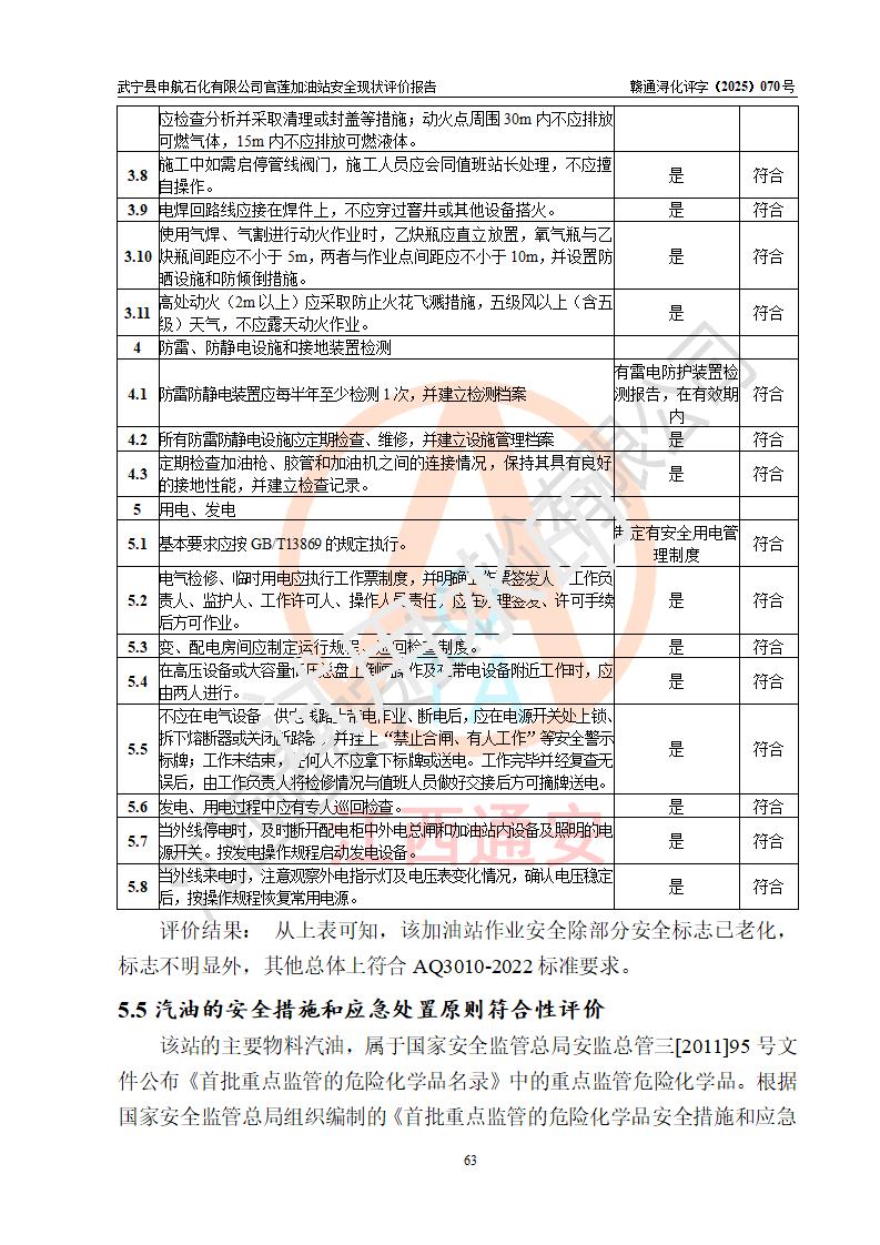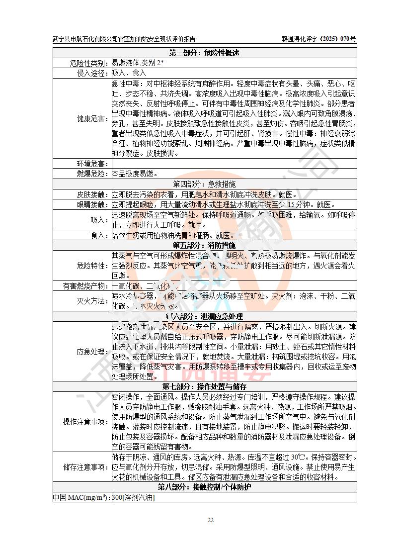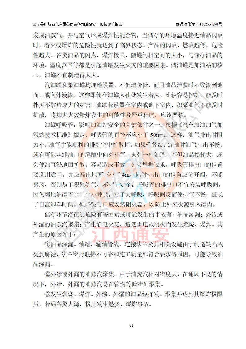 評價(jià)結(jié)論 | 武寧縣申航石化有限公司官蓮加油站涉及的安全條件、安全經(jīng)營條件、安全生產(chǎn)管理符合《危險(xiǎn)化學(xué)品經(jīng)營許可證管理辦法》、《汽車加油加氣加氫站技術(shù)標(biāo)準(zhǔn)》等**有關(guān)法規(guī)、標(biāo)準(zhǔn)、規(guī)范要求,能滿足危險(xiǎn)化學(xué)品經(jīng)營安全條件。 | |||