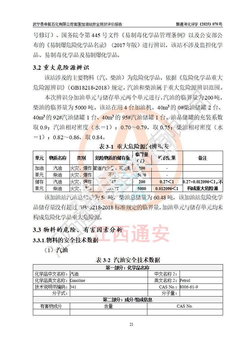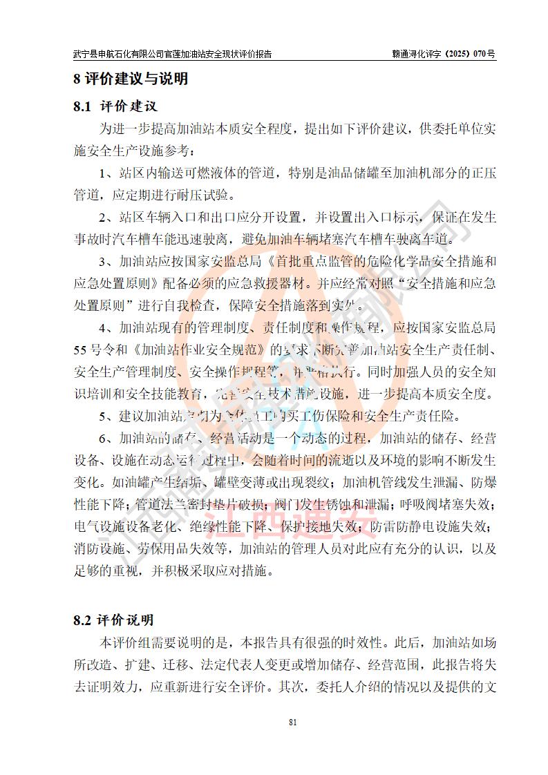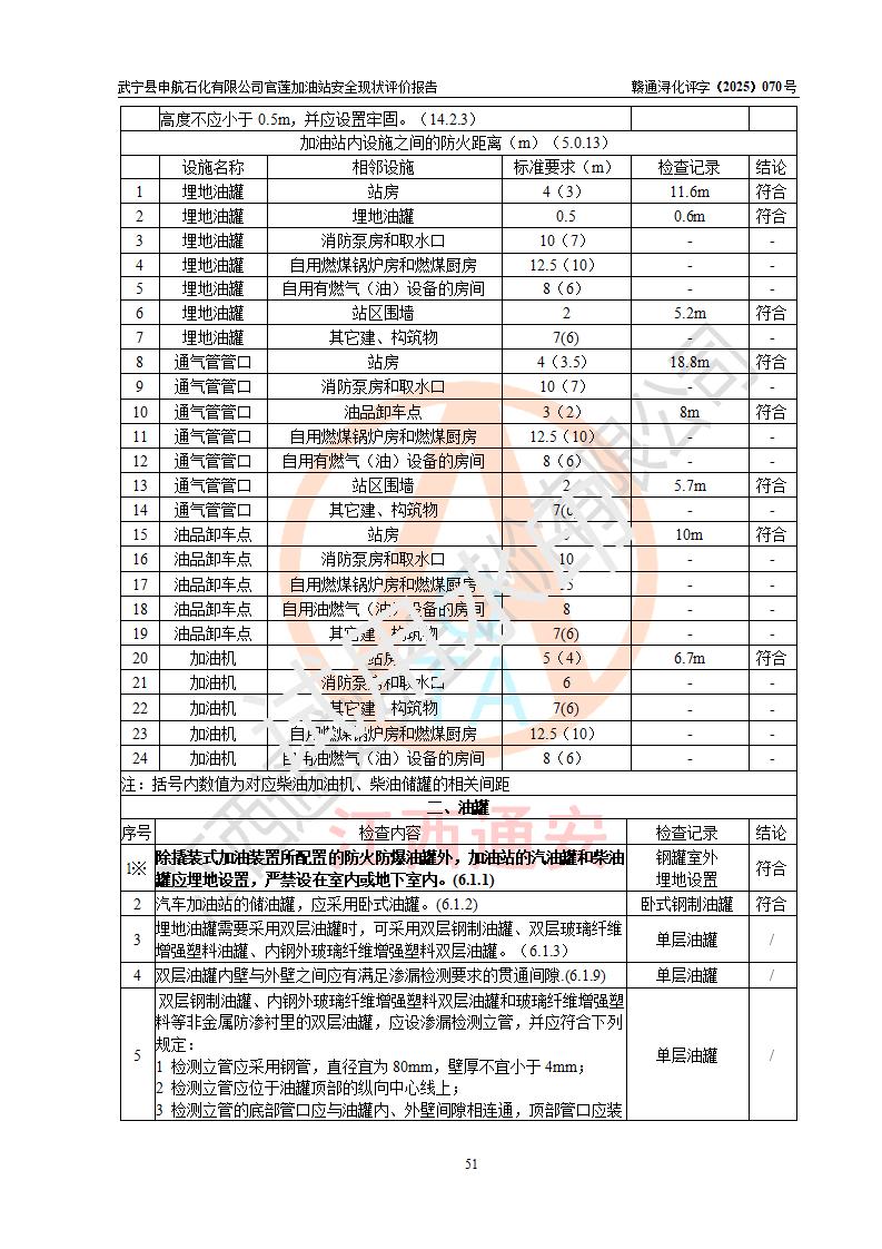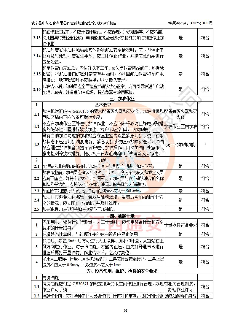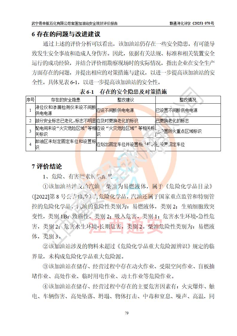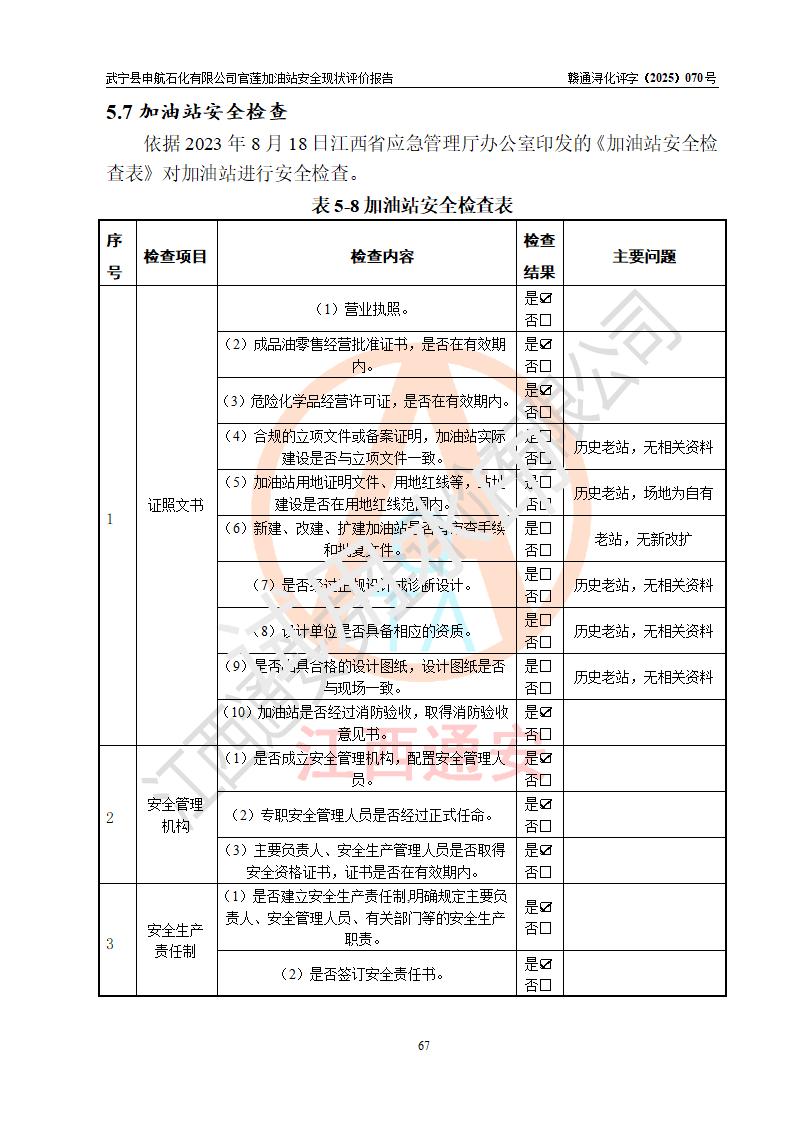 評價(jià)結(jié)論 | 武寧縣申航石化有限公司官蓮加油站涉及的安全條件、安全經(jīng)營條件、安全生產(chǎn)管理符合《危險(xiǎn)化學(xué)品經(jīng)營許可證管理辦法》、《汽車加油加氣加氫站技術(shù)標(biāo)準(zhǔn)》等**有關(guān)法規(guī)、標(biāo)準(zhǔn)、規(guī)范要求,能滿足危險(xiǎn)化學(xué)品經(jīng)營安全條件。 | |||