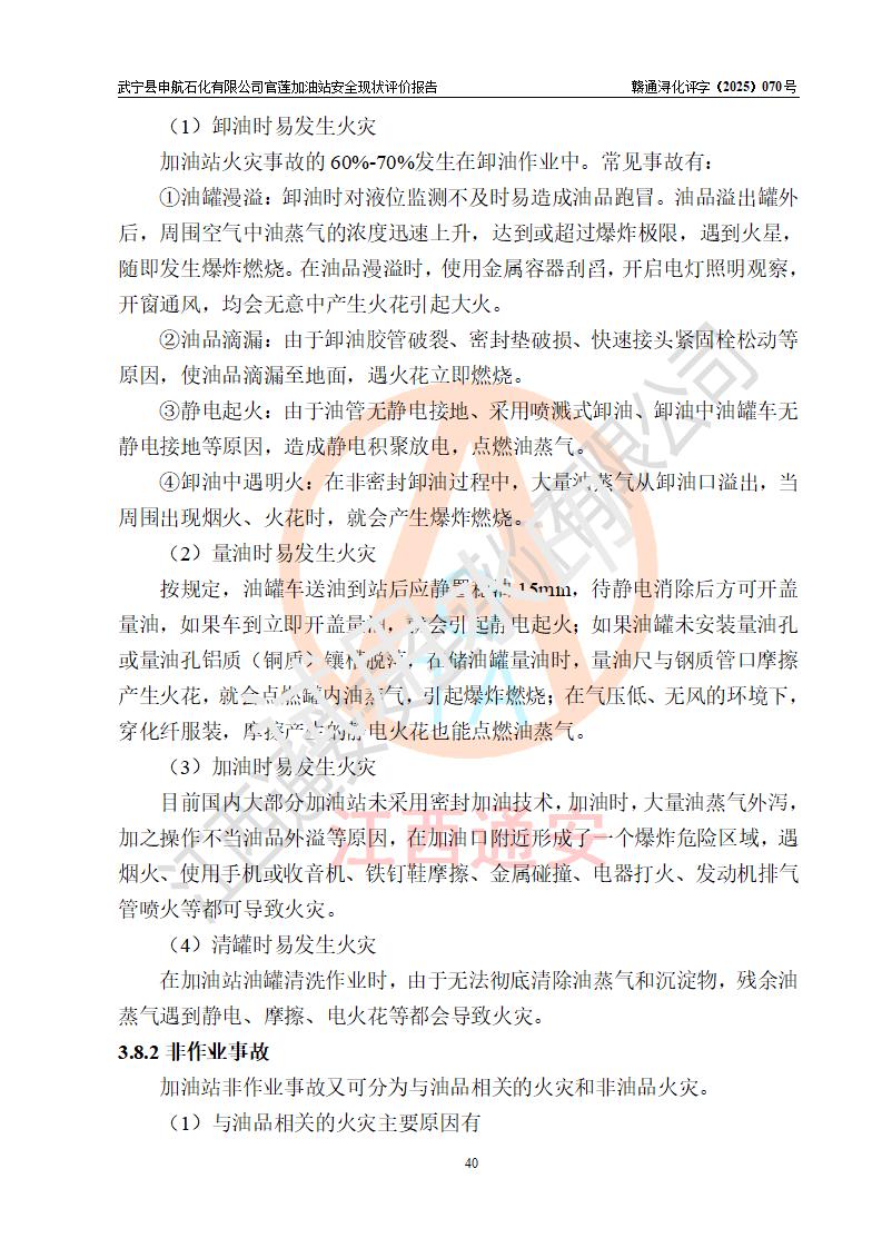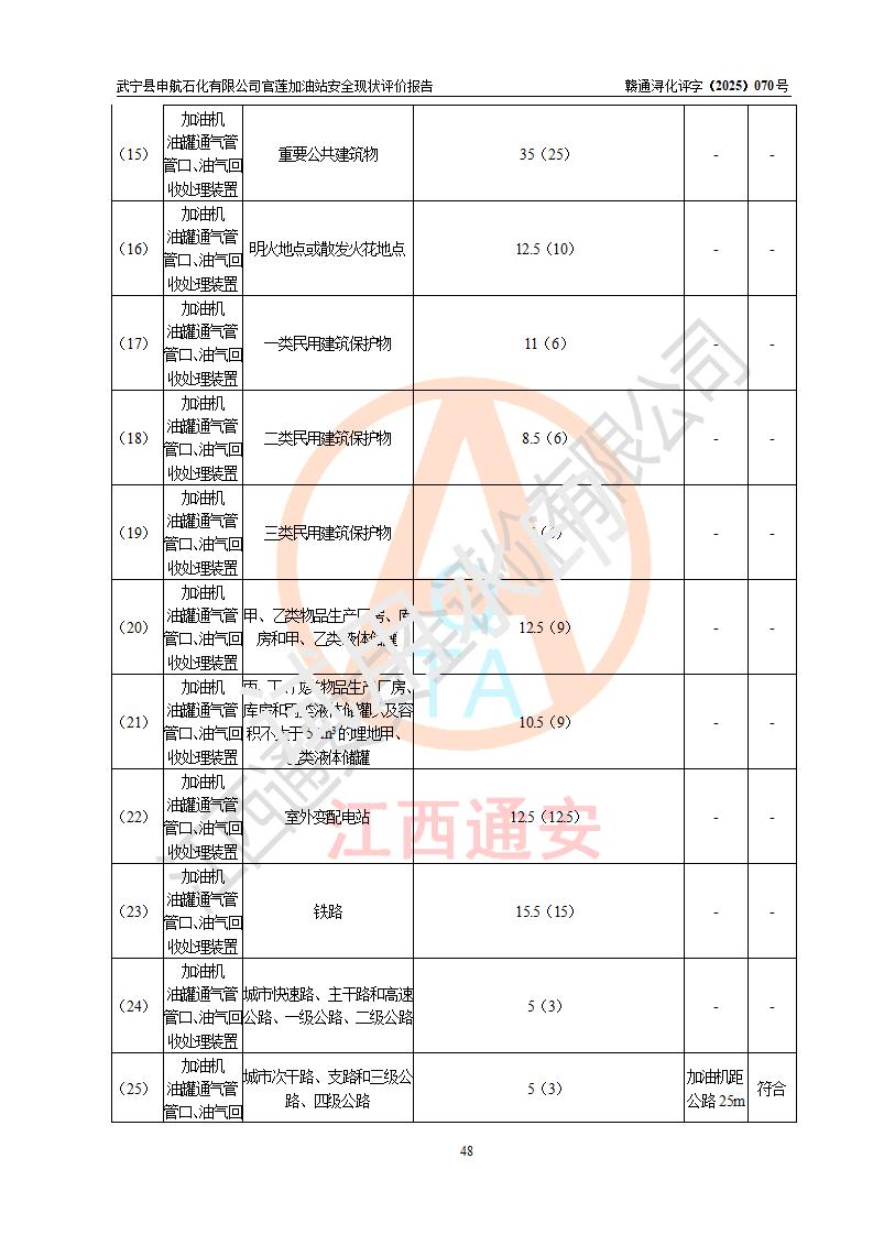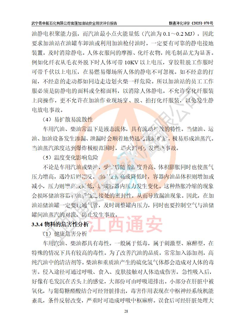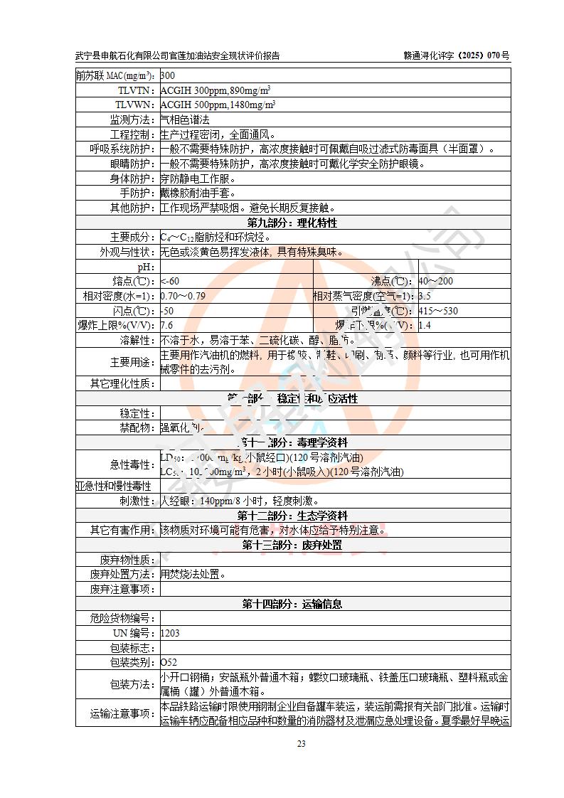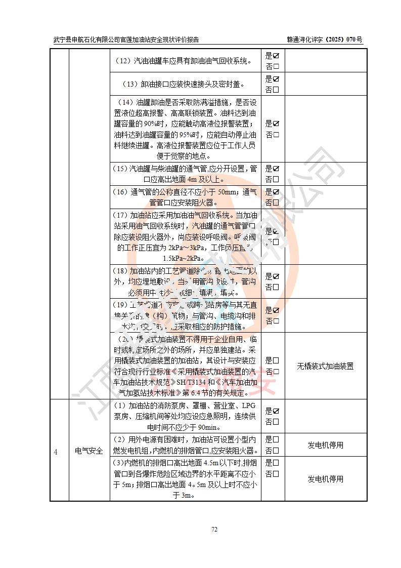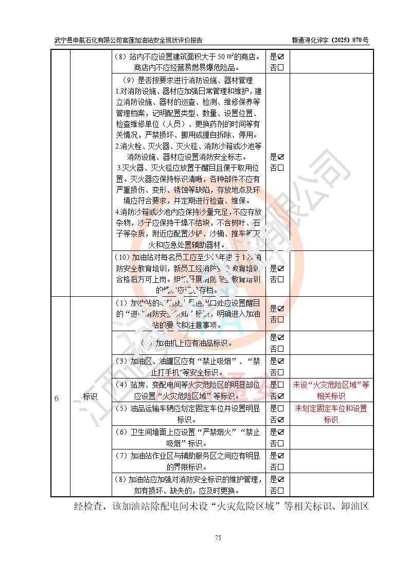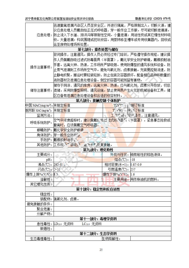 評價(jià)結(jié)論 | 武寧縣申航石化有限公司官蓮加油站涉及的安全條件、安全經(jīng)營條件、安全生產(chǎn)管理符合《危險(xiǎn)化學(xué)品經(jīng)營許可證管理辦法》、《汽車加油加氣加氫站技術(shù)標(biāo)準(zhǔn)》等**有關(guān)法規(guī)、標(biāo)準(zhǔn)、規(guī)范要求,能滿足危險(xiǎn)化學(xué)品經(jīng)營安全條件。 | |||