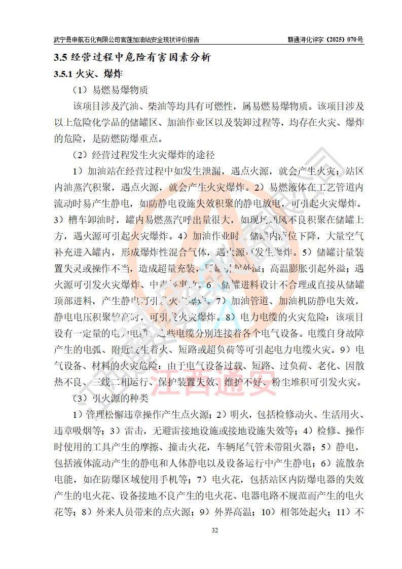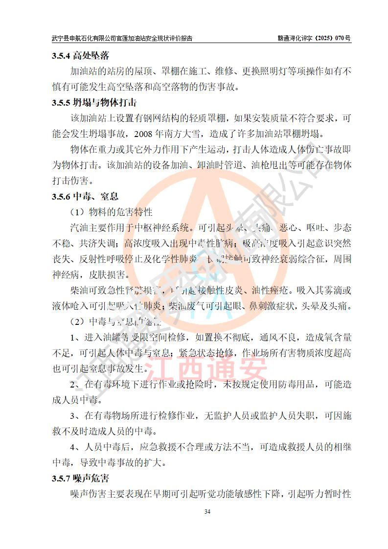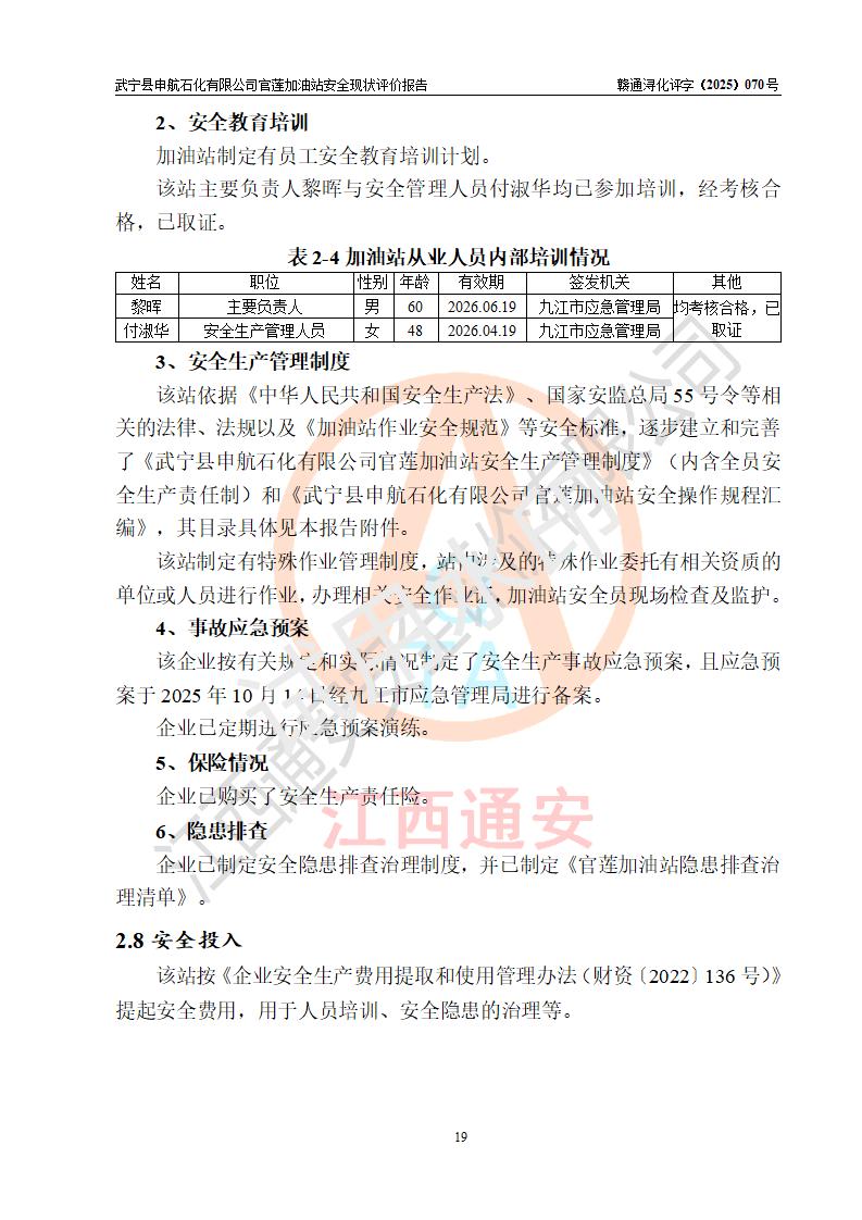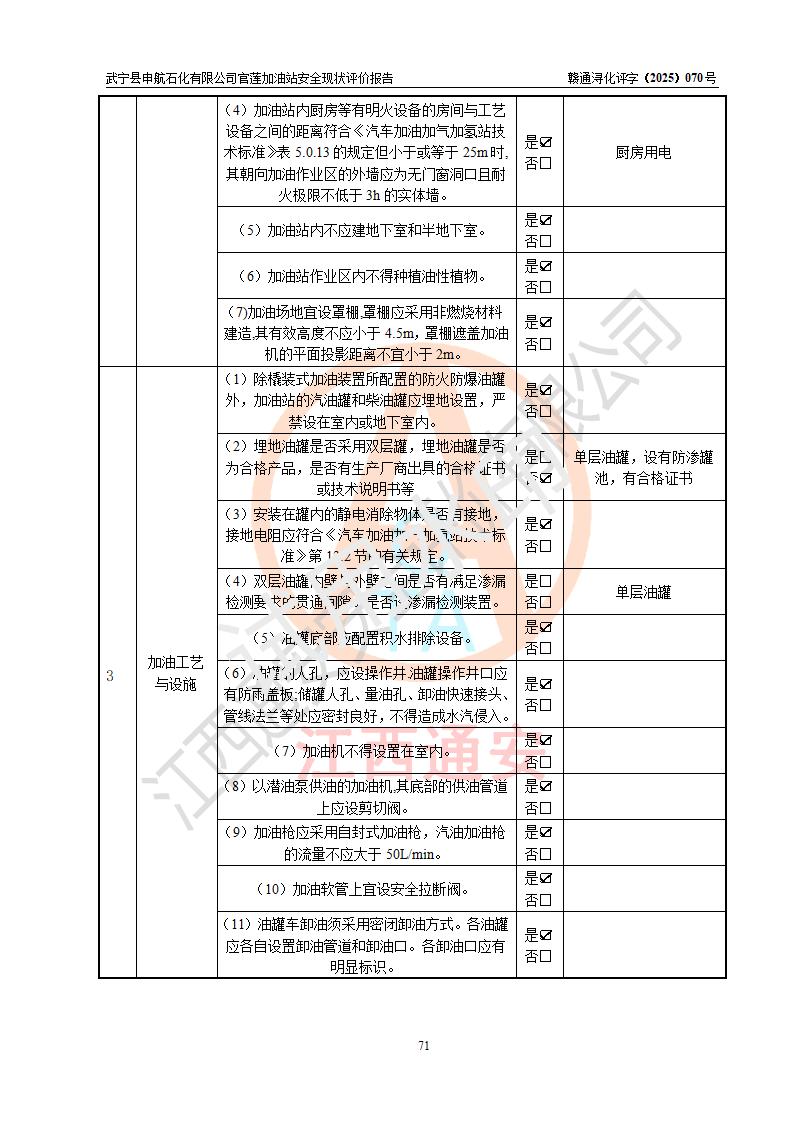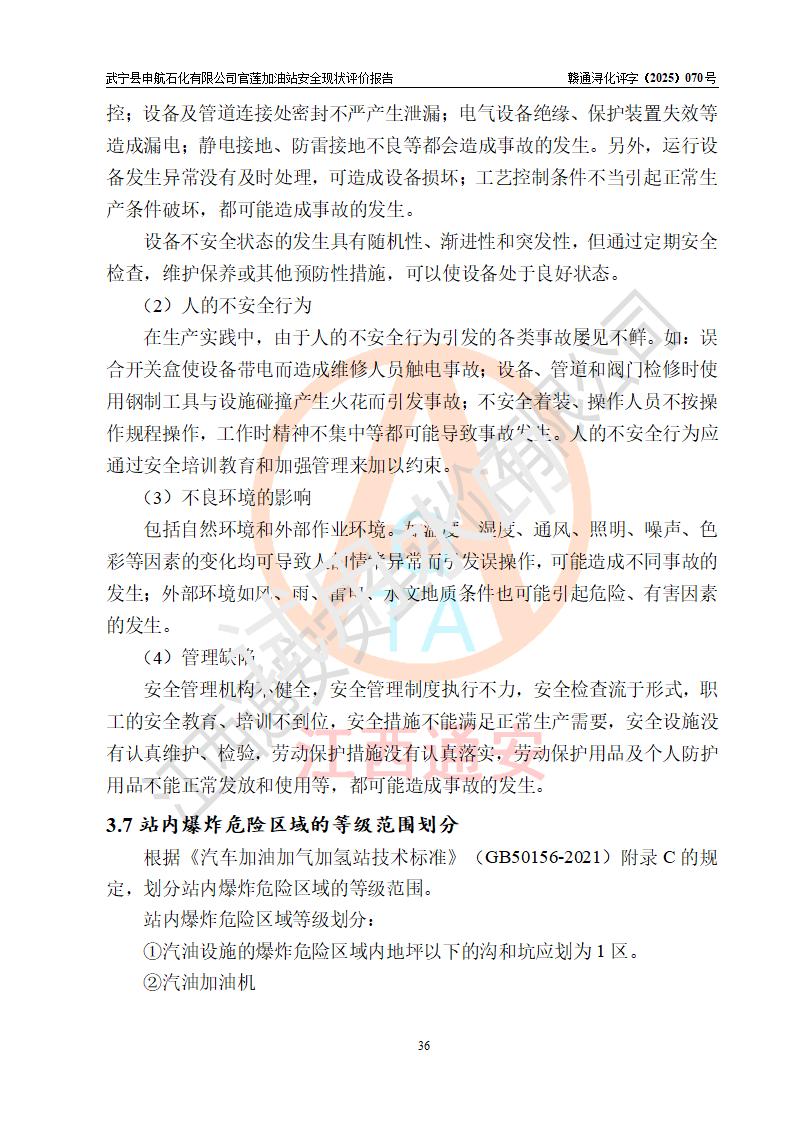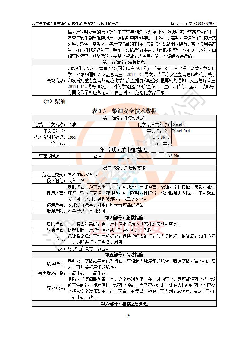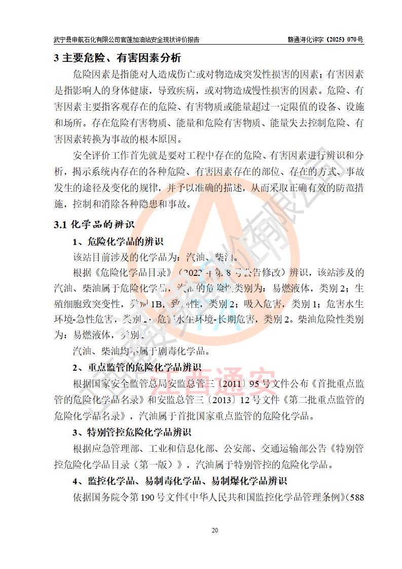 評價(jià)結(jié)論 | 武寧縣申航石化有限公司官蓮加油站涉及的安全條件、安全經(jīng)營條件、安全生產(chǎn)管理符合《危險(xiǎn)化學(xué)品經(jīng)營許可證管理辦法》、《汽車加油加氣加氫站技術(shù)標(biāo)準(zhǔn)》等**有關(guān)法規(guī)、標(biāo)準(zhǔn)、規(guī)范要求,能滿足危險(xiǎn)化學(xué)品經(jīng)營安全條件。 | |||
