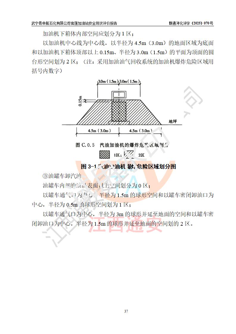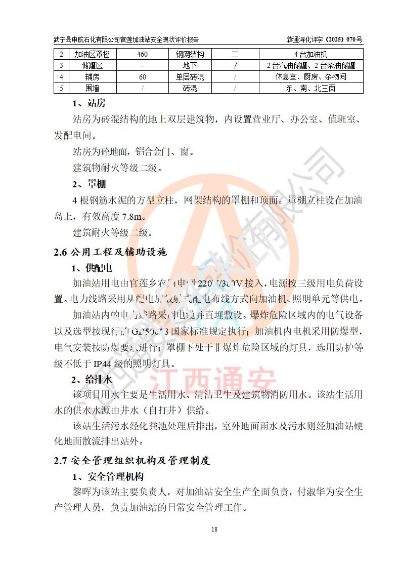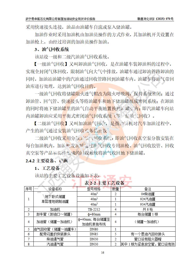 項(xiàng)目簡介 | 武寧縣申航石化有限公司官蓮加油站是一家專門從事成品油零售經(jīng)營的有限責(zé)任公司分公司,經(jīng)營場所位于江西省九江市武寧縣官蓮鄉(xiāng)集鎮(zhèn)。現(xiàn)有從業(yè)人員9名,其中安全管理人員1人,加油站負(fù)責(zé)人黎暉。 該加油站占地面積約2280m2,站區(qū)內(nèi)設(shè)置有4臺雙槍程控燃油加油機(jī)及配套的工藝管線、設(shè)有單層儲罐4臺(設(shè)有防滲罐池),其中40m3的0#柴油儲罐2臺、40m3的92#汽油儲罐1臺,40m3的95#汽油儲罐1臺,油品儲罐總?cè)莘e為160m3(折算成汽油為120m3),按現(xiàn)行《汽車加油加氣加氫站技術(shù)標(biāo)準(zhǔn)》對加油站的等級劃分原則,屬二級加油站。 該站由九江市行政審批局換發(fā)《危險(xiǎn)化學(xué)品經(jīng)營許可證》(證號:36040013202500003),**期限2022年12月19日至2025年12月18日。 | |||