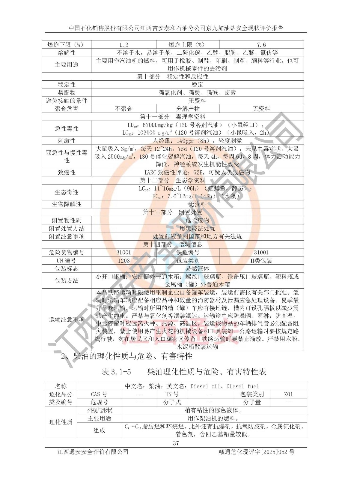 項目簡介  | 中國石化銷售股份有限公司江西吉安泰和石油分公司京九加油站于2003年6月5日經(jīng)吉安市市場監(jiān)督管理局核準注冊成立,營業(yè)場所位于江西省吉安市泰和縣文田開發(fā)區(qū)。類型:外商投資企業(yè)分公司,負責(zé)人:周利平,營業(yè)執(zhí)照統(tǒng)一社會信用代碼為:91360826MA35HHUR8C。營業(yè)執(zhí)照核準經(jīng)營范圍:許可項目:危險化學(xué)品經(jīng)營,成品油倉儲,成品油零售,成品油零售(不含危險化學(xué)品),**類增值電信業(yè)務(wù),第二類增值電信業(yè)務(wù),第三類醫(yī)療器械經(jīng)營,出版物零售,**代理業(yè)務(wù),***零售,發(fā)電業(yè)務(wù)、輸電業(yè)務(wù)、供(配)電業(yè)務(wù),互聯(lián)網(wǎng)直播技術(shù)服務(wù),酒類經(jīng)營,食品銷售,小食雜,網(wǎng)絡(luò)文化經(jīng)營,藥品零售,燃氣經(jīng)營,煙草制品零售,出版物批發(fā),旅游業(yè)務(wù),住宿服務(wù),餐飲服務(wù),港口經(jīng)營,保稅倉庫經(jīng)營,保稅物流中心經(jīng)營(依法須經(jīng)批準的項目,經(jīng)相關(guān)部門批準后在許可**期內(nèi)方可開展經(jīng)營活動,具體經(jīng)營項目和許可期限以相關(guān)部門批準文件或許可證件為準)一般項目:辦公設(shè)備銷售,電池銷售,成品油倉儲(不含危險化學(xué)品),成品油批發(fā)(不含危險化學(xué)品),輪胎銷售,**類醫(yī)療器械銷售,第二類醫(yī)療器械銷售,低溫倉儲(不含危險化學(xué)品等需許可審批的項目),電動自行車銷售,寵物食品及用品批發(fā),電動汽車充電基礎(chǔ)設(shè)施運營,非電力家用器具銷售,化妝品批發(fā),化妝品零售,個人衛(wèi)生用品銷售,會議及展覽服務(wù),金銀制品銷售,集中式**充電站,普通貨物倉儲服務(wù)(不含危險化學(xué)品等需許可審批的項目),人力資源服務(wù)(不含職業(yè)中介活動、勞務(wù)派遣服務(wù)),食品互聯(lián)網(wǎng)銷售(僅銷售預(yù)包裝食品),食用農(nóng)產(chǎn)品零售,外賣遞送服務(wù),消毒劑銷售(不含危險化學(xué)品),新能源汽車換電設(shè)施銷售,站用加氫及儲氫設(shè)施銷售,鐘表銷售,**化學(xué)產(chǎn)品銷售(不含危險化學(xué)品),保健食品(預(yù)包裝)銷售,針紡織品銷售,服裝服飾零售,日用品銷售,五金產(chǎn)品零售,家用電器銷售,單用途商業(yè)預(yù)付卡代理銷售,電子產(chǎn)品銷售,潤滑油銷售,石油制品銷售(不含危險化學(xué)品),戶外用品銷售,汽車銷售,摩托車及零配件零售,農(nóng)副產(chǎn)品銷售,化肥銷售,農(nóng)用薄膜銷售,安防設(shè)備銷售,禮品花卉銷售,計算機軟硬件及輔助設(shè)備零售,橡膠制品銷售,機械設(shè)備銷售,珠寶首飾批發(fā),珠寶首飾零售,玩具銷售,樂器批發(fā),樂器零售,家具銷售,建筑材料銷售,機動車充電銷售,技術(shù)服務(wù)、技術(shù)開發(fā)、技術(shù)咨詢、技術(shù)交流、技術(shù)**、技術(shù)推廣,機動車修理和維護,物業(yè)管理,停車場服務(wù),居民日常生活服務(wù),票務(wù)代理服務(wù),廣告制作,廣告發(fā)布,廣告設(shè)計、代理,洗車服務(wù),信息咨詢服務(wù)(不含許可類信息咨詢服務(wù)),軟件開發(fā),貨物進出口,食品進出口,技術(shù)進出口,進出口代理,汽車裝飾用品銷售,租賃服務(wù)(不含許可類租賃服務(wù)),小微型客車租賃經(jīng)營服務(wù)(除依法須經(jīng)批準的項目外,憑營業(yè)執(zhí)照依法自主開展經(jīng)營活動)。 中國石化銷售股份有限公司江西吉安泰和石油分公司京九加油站設(shè)有1臺95#汽油/0#柴油/92#汽油/0#柴油4槍加油機、1臺92#汽油/0#柴油/95#汽油/0#柴油4槍加油機、1臺0#柴油/92#汽油/95#汽油/92#汽油4槍加油機、1臺95#汽油/0#柴油/92#汽油/0#柴油4槍加油機、尿素加注機(防爆,按柴油加油機確認)布置;1臺50m30#柴油雙層埋地儲罐、1臺50m30#柴油雙層埋地儲罐、1臺30m392#汽油雙層埋地儲罐、1臺30m395#汽油雙層埋地儲罐,油品*大儲存能力為110m3(柴油罐容積折半計入油罐總?cè)莘e),屬二級加油站,汽油卸油、加油設(shè)置了油氣回收系統(tǒng)。 中國石化銷售股份有限公司江西吉安泰和石油分公司京九加油站于2022年10月24日經(jīng)吉安市應(yīng)急管理局核準,換發(fā)了新的《危險化學(xué)品經(jīng)營許可證》,證書編號:贛吉危化經(jīng)字[2022]360800000059號,許可范圍:成品油。**期2022年10月31日至2025年10月30日。  | ||||