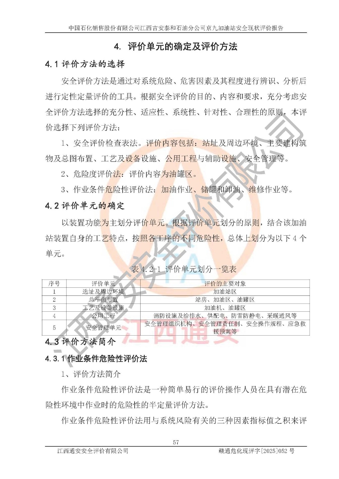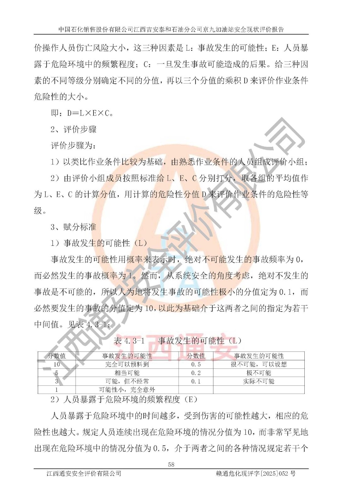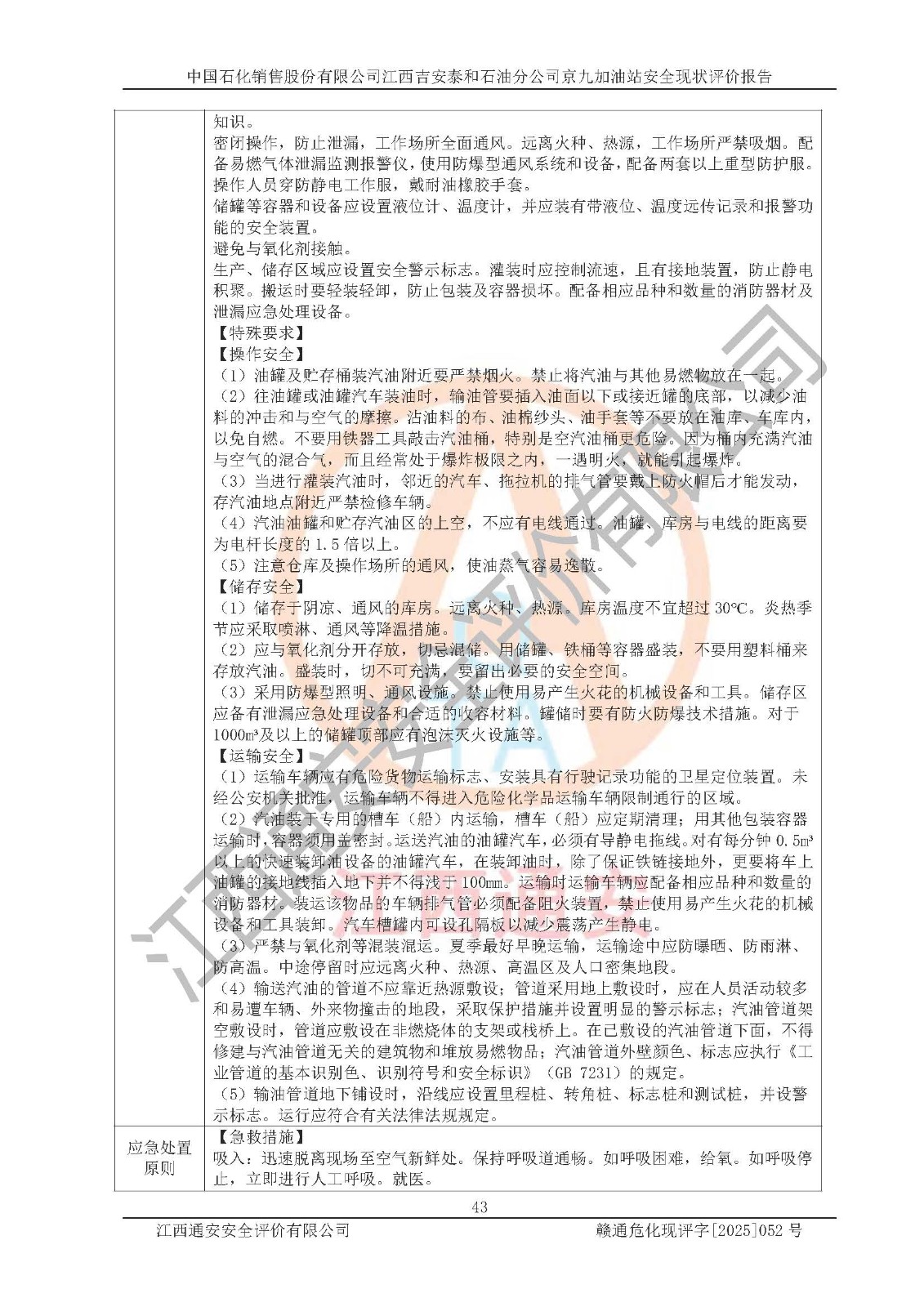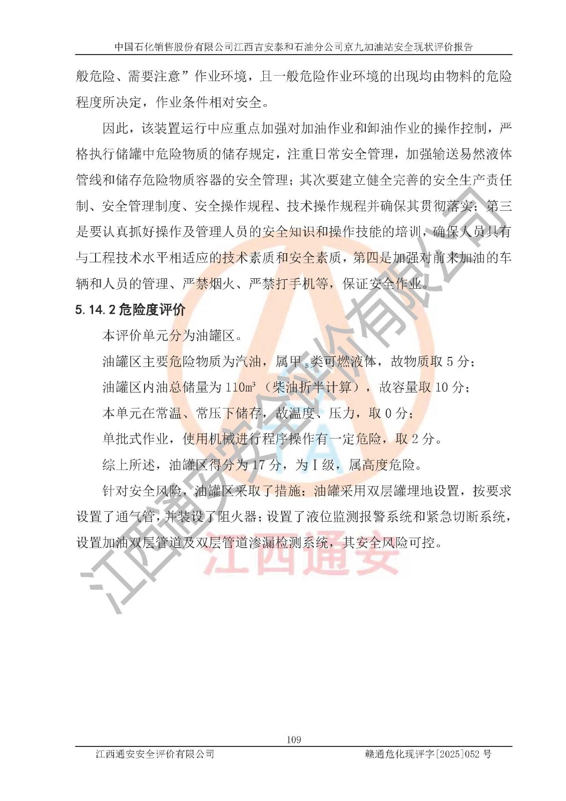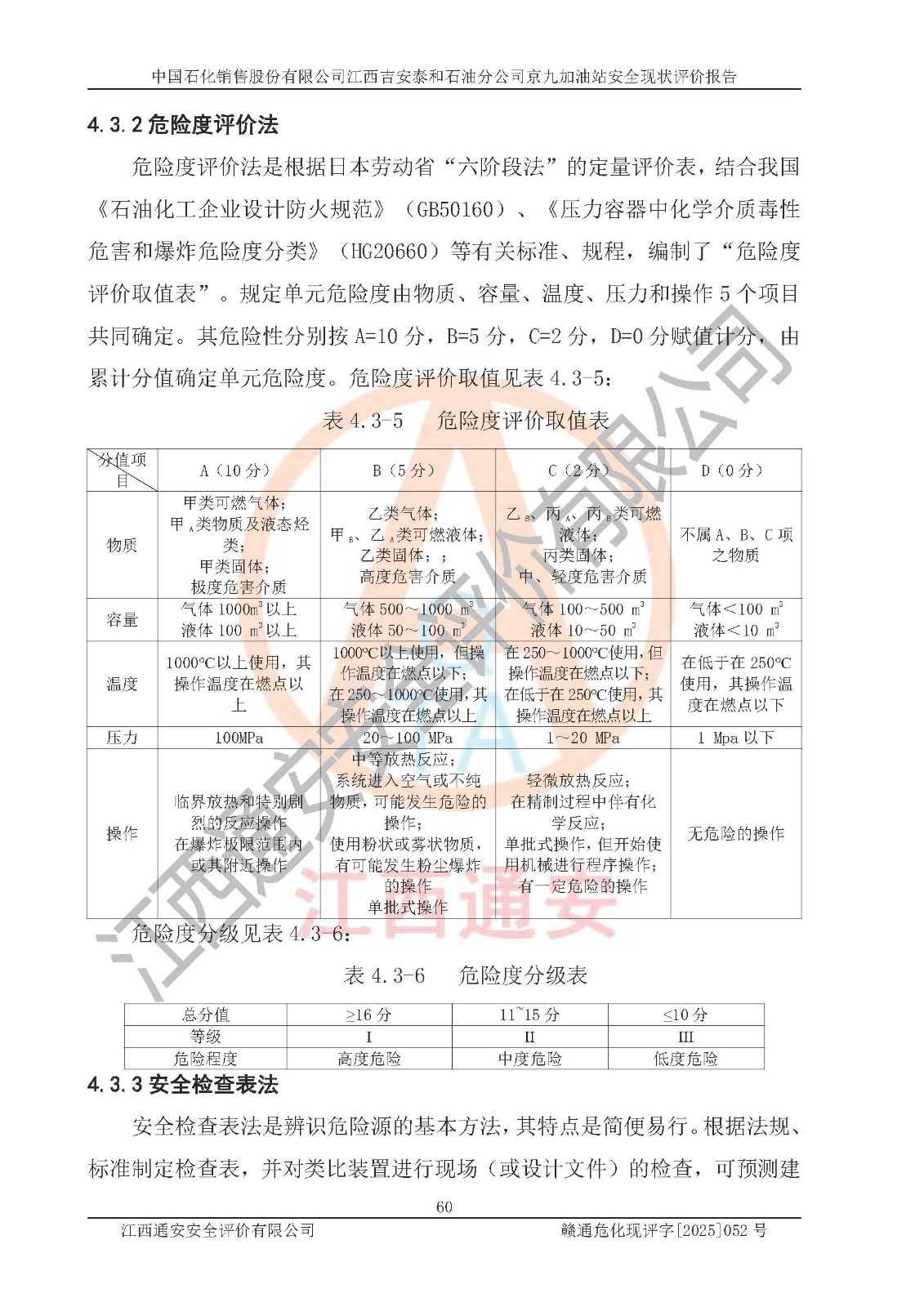 其它  | 在對該項目危險、有害因素辨識分析的基礎(chǔ)上,運用安全檢查表、預(yù)作業(yè)條件危險性分析法、危險度評價、重大事故后果分析結(jié)果等評價方法對該項目進行了分析評價,評價結(jié)果如下: 1、該項目位于江西省吉安市泰和縣文田開發(fā)區(qū),符合當(dāng)?shù)匾?guī)劃,與周邊環(huán)境的距離符合有關(guān)標準、規(guī)范的要求。 2、總圖布置分區(qū)明確,布局合理,各建構(gòu)筑物的防火間距滿足規(guī)范要求。 3、該項目無**明令淘汰的工藝,設(shè)備、設(shè)施與工藝條件、內(nèi)部介質(zhì)相適應(yīng),特種設(shè)備及設(shè)施較齊全,按規(guī)定設(shè)置防雷、防靜電接地,爆炸危險環(huán)境加油機按要求采用防爆型,符合相關(guān)標準規(guī)范要求。 5、企業(yè)設(shè)置了安全生產(chǎn)管理機構(gòu),配備了專職安全生產(chǎn)管理人員,建立了安全生產(chǎn)責(zé)任制和安全生產(chǎn)管理制度,編制了崗位操作規(guī)程,編制了生產(chǎn)安全事故應(yīng)急預(yù)案,人員經(jīng)過相應(yīng)的培訓(xùn),企業(yè)的安全生產(chǎn)管理正常。 6、作業(yè)條件危險性評價結(jié)果:在選定的評價單元中,作業(yè)危險程度均為“一般危險,需要注意”,作業(yè)條件相對安全。 7、危險度評價結(jié)果:汽油儲罐的危險程度為**危險。油罐采用雙層罐埋地設(shè)置,按要求設(shè)置了通氣管,并裝設(shè)了阻火器;設(shè)置了液位監(jiān)測報警系統(tǒng)和緊急切斷系統(tǒng),設(shè)置加油雙層管道及雙層管道滲漏檢測系統(tǒng),其安全風(fēng)險可控。 評價結(jié)論: 中國石化銷售股份有限公司江西吉安泰和石油分公司京九加油站工藝設(shè)備和安全設(shè)施運行正常,安全管理機制運行正常,安全設(shè)施、措施達到設(shè)計要求和預(yù)期結(jié)果,可以滿足建設(shè)項目安全生產(chǎn)的要求,安全生產(chǎn)管理**,項目具備危險化學(xué)品經(jīng)營單位安全經(jīng)營條件的要求。  | ||||