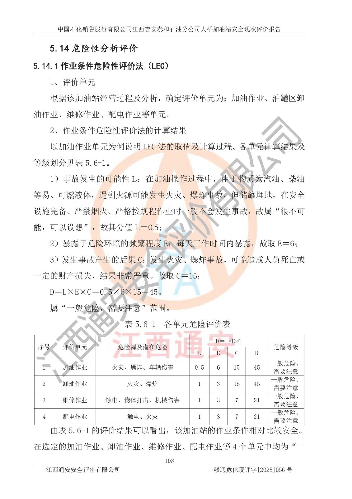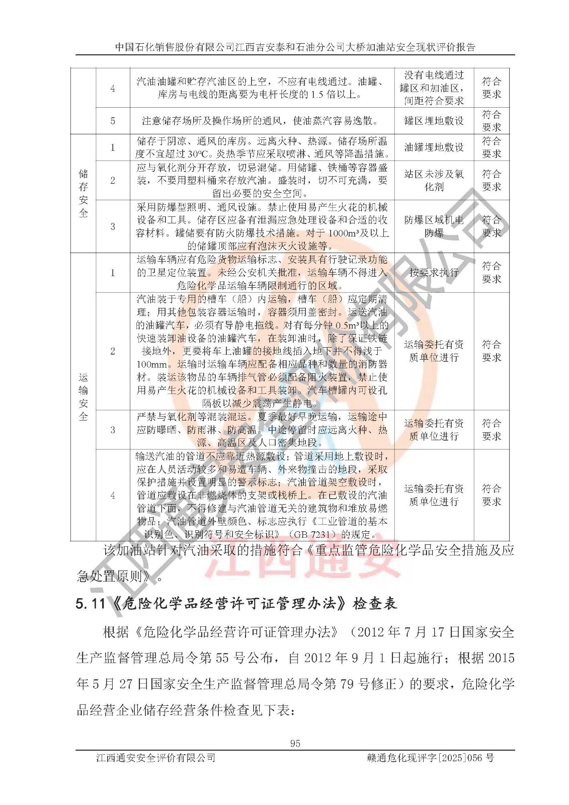 其它  | 在對該項(xiàng)目危險(xiǎn)、有害因素辨識分析的基礎(chǔ)上,運(yùn)用安全檢查表、預(yù)作業(yè)條件危險(xiǎn)性分析法、危險(xiǎn)度評價(jià)、重大事故后果分析結(jié)果等評價(jià)方法對該項(xiàng)目進(jìn)行了分析評價(jià),評價(jià)結(jié)果如下: 1、該項(xiàng)目位于江西省吉安市泰和縣塘洲鎮(zhèn),符合當(dāng)?shù)匾?guī)劃,與周邊環(huán)境的距離符合有關(guān)標(biāo)準(zhǔn)、規(guī)范的要求。 2、總圖布置分區(qū)明確,布局合理,各建構(gòu)筑物的防火間距滿足規(guī)范要求。 3、該項(xiàng)目無**明令淘汰的工藝,設(shè)備、設(shè)施與工藝條件、內(nèi)部介質(zhì)相適應(yīng),特種設(shè)備及設(shè)施較齊全,按規(guī)定設(shè)置防雷、防靜電接地,爆炸危險(xiǎn)環(huán)境加油機(jī)按要求采用防爆型,符合相關(guān)標(biāo)準(zhǔn)規(guī)范要求。 5、企業(yè)設(shè)置了安全生產(chǎn)管理機(jī)構(gòu),配備了專職安全生產(chǎn)管理人員,建立了安全生產(chǎn)責(zé)任制和安全生產(chǎn)管理制度,編制了崗位操作規(guī)程,編制了生產(chǎn)安全事故應(yīng)急預(yù)案,人員經(jīng)過相應(yīng)的培訓(xùn),企業(yè)的安全生產(chǎn)管理正常。 6、作業(yè)條件危險(xiǎn)性評價(jià)結(jié)果:在選定的評價(jià)單元中,作業(yè)危險(xiǎn)程度均為“一般危險(xiǎn),需要注意”,作業(yè)條件相對安全。 7、危險(xiǎn)度評價(jià)結(jié)果:汽油儲(chǔ)罐的危險(xiǎn)程度為中度危險(xiǎn)。油罐采用雙層罐埋地設(shè)置,按要求設(shè)置了通氣管,并裝設(shè)了阻火器;設(shè)置了液位監(jiān)測報(bào)警系統(tǒng)和緊急切斷系統(tǒng),設(shè)置加油雙層管道及雙層管道滲漏檢測系統(tǒng),其安全風(fēng)險(xiǎn)可控。 評價(jià)結(jié)論: 中國石化銷售股份有限公司江西吉安泰和石油分公司大橋加油站工藝設(shè)備和安全設(shè)施運(yùn)行正常,安全管理機(jī)制運(yùn)行正常,安全設(shè)施、措施達(dá)到設(shè)計(jì)要求和預(yù)期結(jié)果,可以滿足建設(shè)項(xiàng)目安全生產(chǎn)的要求,安全生產(chǎn)管理**,項(xiàng)目具備危險(xiǎn)化學(xué)品經(jīng)營單位安全經(jīng)營條件的要求。  | ||||