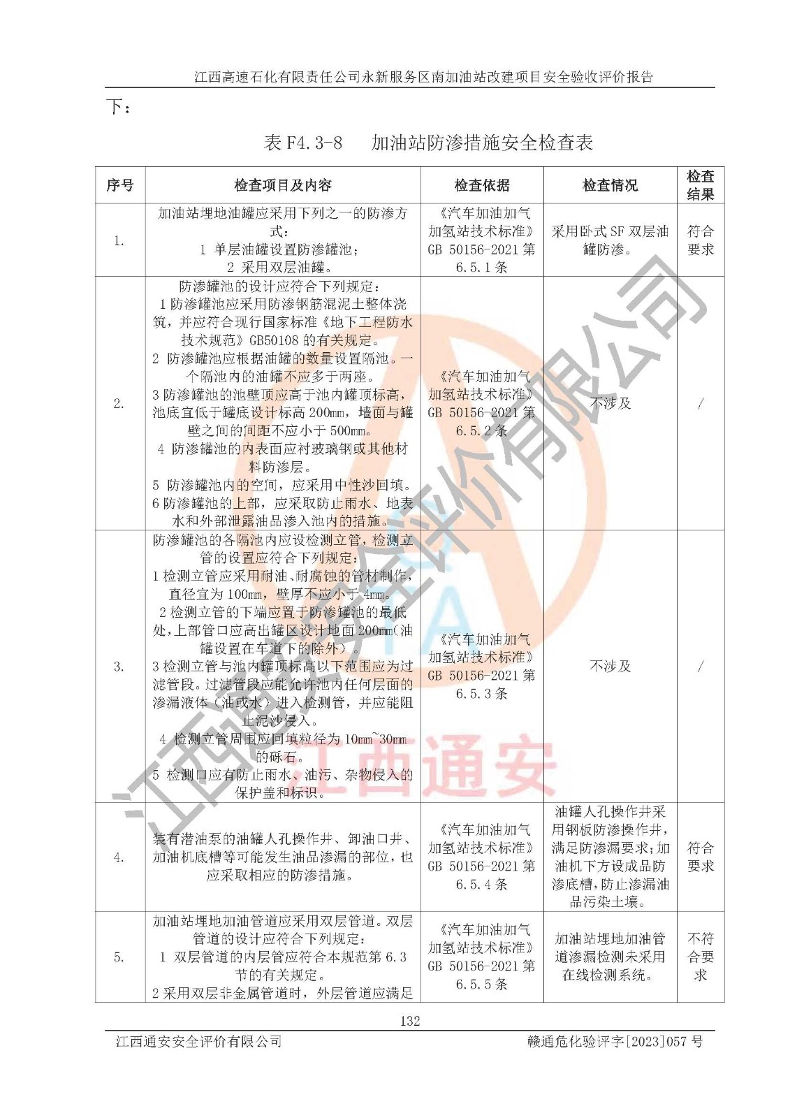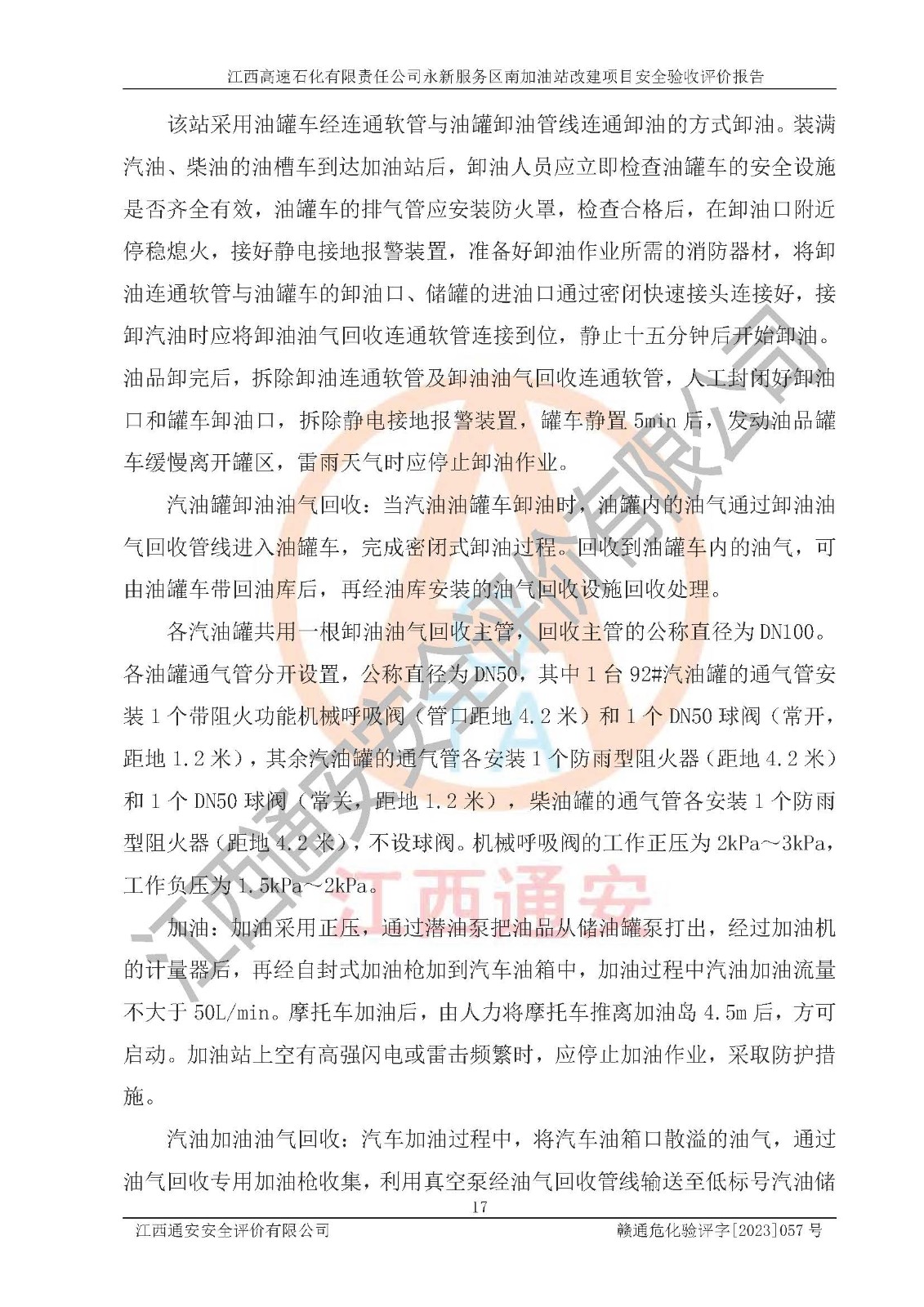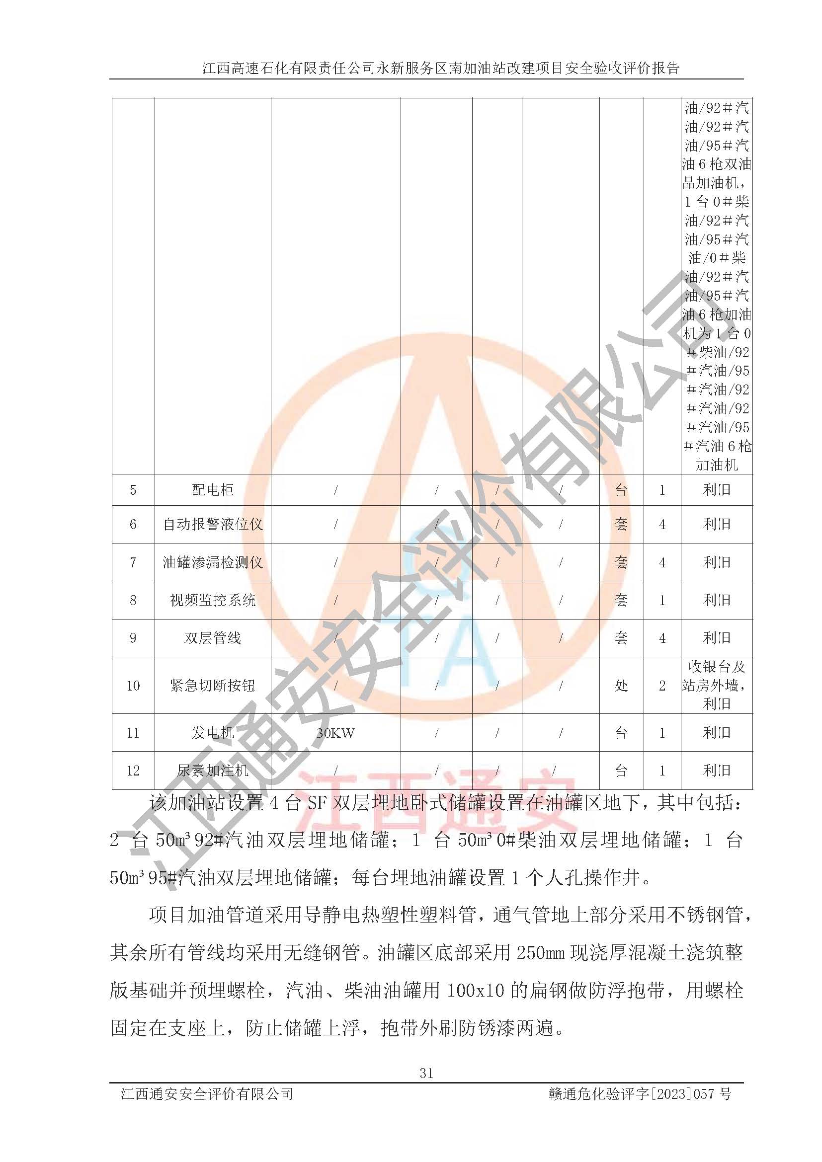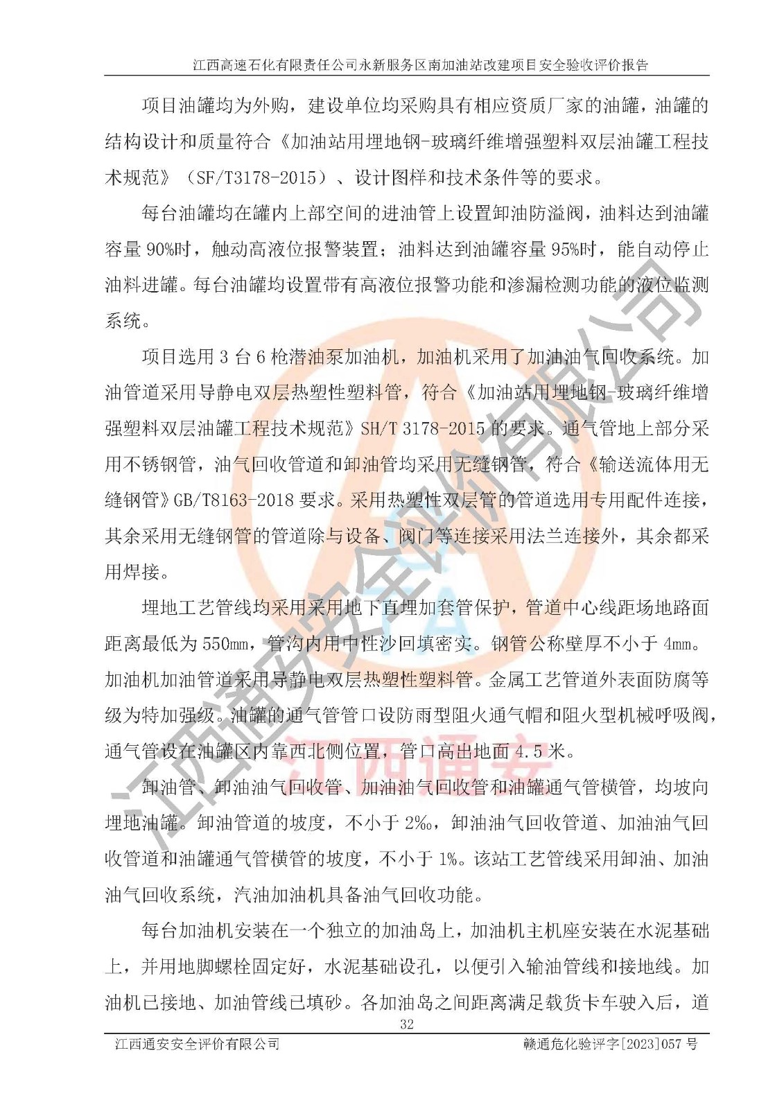 項(xiàng)目簡(jiǎn)介  | 江西高速石化有限責(zé)任公司永新服務(wù)區(qū)南加油站成立于2019年2月2日,類(lèi)型:其他有限責(zé)任公司分公司;負(fù)責(zé)人:陳志斌;經(jīng)營(yíng)場(chǎng)所為江西省吉安市永新縣吉蓮高速永新服務(wù)區(qū)南。該公司營(yíng)業(yè)執(zhí)照經(jīng)營(yíng)范圍:石油、石油化工、化纖及其他化工產(chǎn)品的銷(xiāo)售;光伏、充電樁、日用百貨便利店經(jīng)營(yíng):汽車(chē)清洗服務(wù):廣告位出租:房屋租賃:食品、計(jì)生用品、零售卷煙、雪茄煙:委托代理收取水電費(fèi):銷(xiāo)售潤(rùn)滑油、燃油料。(依法須經(jīng)批準(zhǔn)的項(xiàng)目,經(jīng)相關(guān)部門(mén)批準(zhǔn)后方可開(kāi)展經(jīng)營(yíng)活動(dòng))。 該加油站于2023年12月4日經(jīng)吉安市商務(wù)局核準(zhǔn)變更換發(fā)成品油零售經(jīng)營(yíng)批準(zhǔn)證書(shū),證書(shū)編號(hào):油零售證書(shū)第吉0299號(hào)。**期由2023年12月4日至2028年12月3日。于2023年11月16日由吉安市應(yīng)急管理局變更發(fā)放危險(xiǎn)化學(xué)品經(jīng)營(yíng)許可證,證書(shū)編號(hào):贛吉?;?jīng)字【2022】360800000010。**期由2022年1月31日至2025年1月30日。 為提升優(yōu)化加油站的整體布局,更好滿足運(yùn)營(yíng)服務(wù)的需求,同時(shí)迎合吉蓮高速日益增長(zhǎng)的**,江西高速石化有限責(zé)任公司永新服務(wù)區(qū)南加油站決定在原址基礎(chǔ)上進(jìn)行改建,并于2023年3月17日獲得永新縣工業(yè)和信息化局蓋章的《江西省工業(yè)企業(yè)技術(shù)改造項(xiàng)目備案通知書(shū)》,同意該站在原址上改建。 江西高速石化有限責(zé)任公司永新服務(wù)區(qū)南加油站改建項(xiàng)目位于江西省吉安市永新縣吉蓮高速永新服務(wù)區(qū)南,加油站用地面積約2000m2。 該加油站改建前設(shè)有4個(gè)SF雙層埋地儲(chǔ)罐,分別為:1臺(tái)50m392#汽油雙層埋地儲(chǔ)罐,1臺(tái)50m395#汽油雙層埋地儲(chǔ)罐;2 臺(tái)50m30#柴油雙層埋地儲(chǔ)罐;柴油折半后總?cè)莘e為 150 m3,屬二級(jí)加油站。設(shè)有3個(gè)六槍3油品潛油泵加油機(jī),分別為:1臺(tái)0#柴油/92#汽油/95#汽油/0#柴油/92#汽油/95#汽油6槍加油機(jī),1臺(tái)0#柴油/92#汽油/95#汽油/0#柴油/92#汽油/95#汽油6槍加油機(jī),1臺(tái)0#柴油/92#汽油/95#汽油/0#柴油/92#汽油/95#汽油6槍加油機(jī)。 改建后情況如下:在原有罐區(qū)位置上將1臺(tái)50m30#柴油雙層埋地儲(chǔ)罐改造為1臺(tái)50m392#汽油雙層埋地儲(chǔ)罐,更換后設(shè)置4臺(tái)SF雙層埋地儲(chǔ)罐,其中包括:2臺(tái)50m392#汽油雙層埋地儲(chǔ)罐;1臺(tái)50m395#汽油雙層埋地儲(chǔ)罐;1臺(tái)50m30#柴油雙層埋地儲(chǔ)罐;改建后*大總儲(chǔ)量為200m3,柴油折半后總?cè)莘e為175m3,加油站等級(jí)由原來(lái)的二級(jí)變?yōu)?/span>一級(jí),設(shè)有1臺(tái)0#柴油/92#汽油/95#汽油/92#汽油/92#汽油/95#汽油6槍3油品加油機(jī),1臺(tái)0#柴油/92#汽油/95#汽油/0#柴油/92#汽油/95#汽油6槍3油品加油機(jī),1臺(tái)92#汽油/92#汽油/95#汽油/92#汽油/92#汽油/95#汽油6槍雙油品加油機(jī),設(shè)有1個(gè)尿素加注機(jī)(防爆,按柴油加油機(jī)確認(rèn)),加油站內(nèi)其他設(shè)施利舊。 江西高速石化有限責(zé)任公司永新服務(wù)區(qū)南加油站2022年12月委托江西省贛華安全生產(chǎn)科學(xué)技術(shù)咨詢(xún)服務(wù)中心編制《江西高速石化有限責(zé)任公司永新服務(wù)區(qū)南加油站改建項(xiàng)目安全預(yù)評(píng)價(jià)報(bào)告》,并于2023年4月12日取得《危險(xiǎn)化學(xué)品建設(shè)項(xiàng)目安全條件備案告知意見(jiàn)書(shū)》(吉市?;?xiàng)目安條審字[2023]2號(hào))。 江西高速石化有限責(zé)任公司永新服務(wù)區(qū)南加油站2023年4月委托哈爾濱天源石化工程設(shè)計(jì)有限責(zé)任公司編制《江西高速石化有限責(zé)任公司永新服務(wù)區(qū)南加油站改建項(xiàng)目安全設(shè)施設(shè)計(jì)》,并于2023年5月19日取得《危險(xiǎn)化學(xué)品建設(shè)項(xiàng)目安全設(shè)施設(shè)計(jì)審查意見(jiàn)書(shū)》(吉市?;?xiàng)目安設(shè)審字〔2023〕10號(hào))。