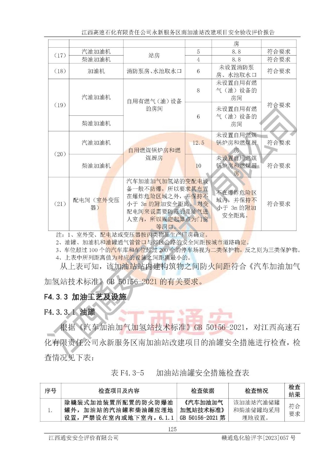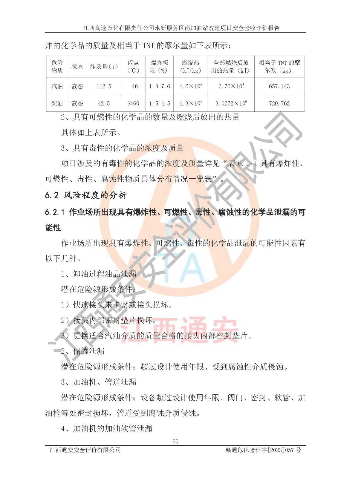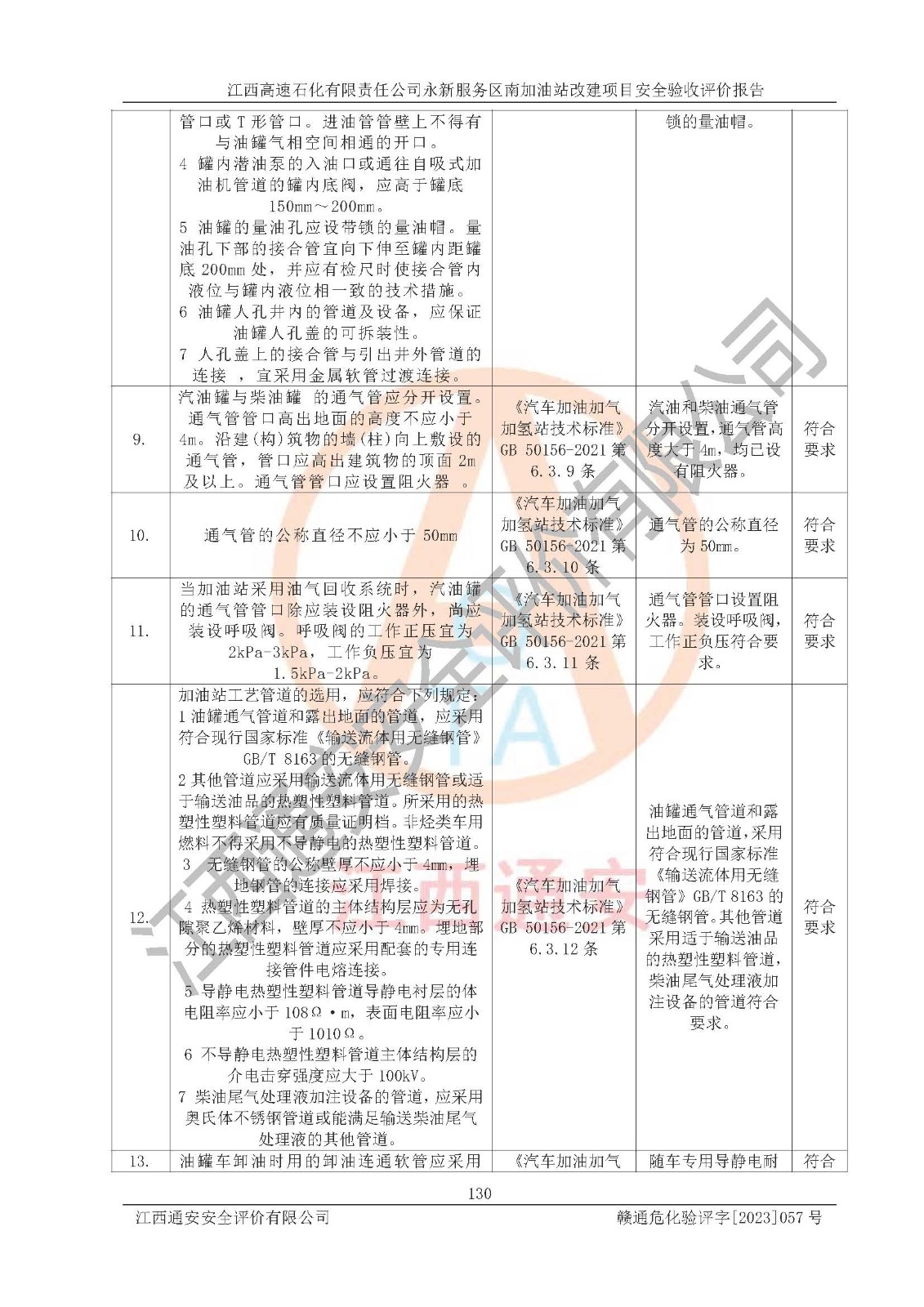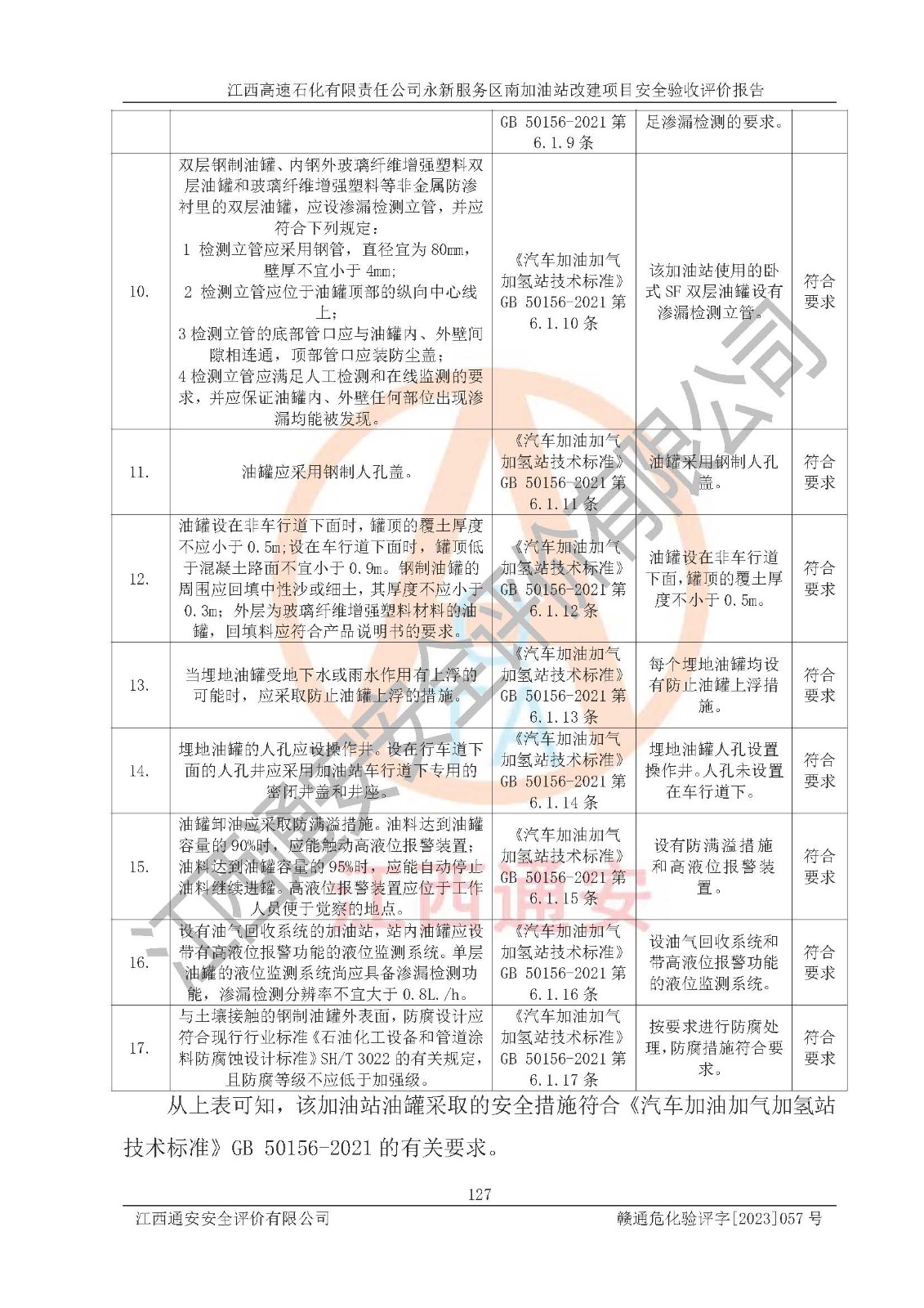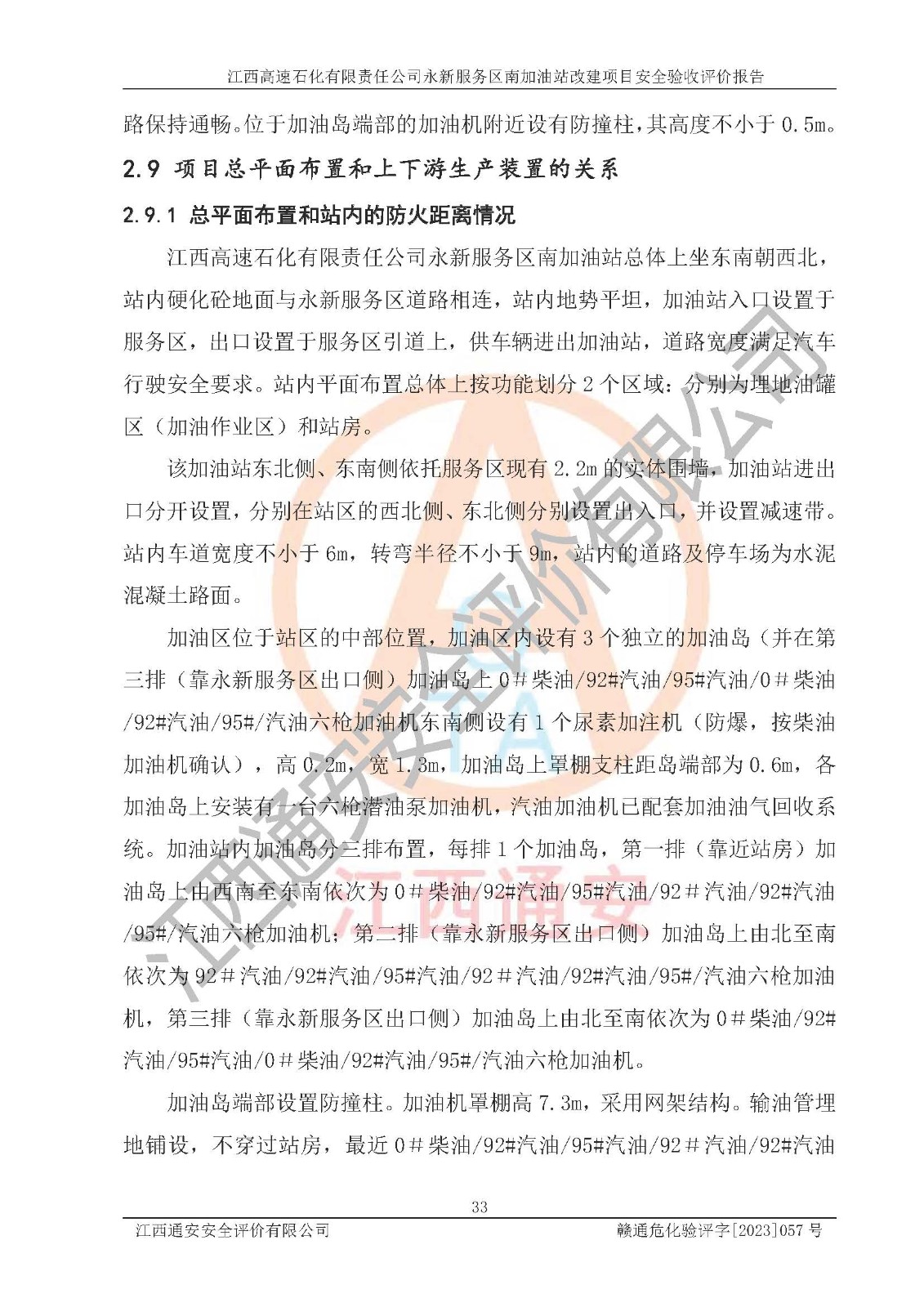 項(xiàng)目簡(jiǎn)介  | 江西高速石化有限責(zé)任公司永新服務(wù)區(qū)南加油站成立于2019年2月2日,類(lèi)型:其他有限責(zé)任公司分公司;負(fù)責(zé)人:陳志斌;經(jīng)營(yíng)場(chǎng)所為江西省吉安市永新縣吉蓮高速永新服務(wù)區(qū)南。該公司營(yíng)業(yè)執(zhí)照經(jīng)營(yíng)范圍:石油、石油化工、化纖及其他化工產(chǎn)品的銷(xiāo)售;光伏、充電樁、日用百貨便利店經(jīng)營(yíng):汽車(chē)清洗服務(wù):廣告位出租:房屋租賃:食品、計(jì)生用品、零售卷煙、雪茄煙:委托代理收取水電費(fèi):銷(xiāo)售潤(rùn)滑油、燃油料。(依法須經(jīng)批準(zhǔn)的項(xiàng)目,經(jīng)相關(guān)部門(mén)批準(zhǔn)后方可開(kāi)展經(jīng)營(yíng)活動(dòng))。 該加油站于2023年12月4日經(jīng)吉安市商務(wù)局核準(zhǔn)變更換發(fā)成品油零售經(jīng)營(yíng)批準(zhǔn)證書(shū),證書(shū)編號(hào):油零售證書(shū)第吉0299號(hào)。**期由2023年12月4日至2028年12月3日。于2023年11月16日由吉安市應(yīng)急管理局變更發(fā)放危險(xiǎn)化學(xué)品經(jīng)營(yíng)許可證,證書(shū)編號(hào):贛吉?;?jīng)字【2022】360800000010。**期由2022年1月31日至2025年1月30日。 為提升優(yōu)化加油站的整體布局,更好滿足運(yùn)營(yíng)服務(wù)的需求,同時(shí)迎合吉蓮高速日益增長(zhǎng)的**,江西高速石化有限責(zé)任公司永新服務(wù)區(qū)南加油站決定在原址基礎(chǔ)上進(jìn)行改建,并于2023年3月17日獲得永新縣工業(yè)和信息化局蓋章的《江西省工業(yè)企業(yè)技術(shù)改造項(xiàng)目備案通知書(shū)》,同意該站在原址上改建。 江西高速石化有限責(zé)任公司永新服務(wù)區(qū)南加油站改建項(xiàng)目位于江西省吉安市永新縣吉蓮高速永新服務(wù)區(qū)南,加油站用地面積約2000m2。 該加油站改建前設(shè)有4個(gè)SF雙層埋地儲(chǔ)罐,分別為:1臺(tái)50m392#汽油雙層埋地儲(chǔ)罐,1臺(tái)50m395#汽油雙層埋地儲(chǔ)罐;2 臺(tái)50m30#柴油雙層埋地儲(chǔ)罐;柴油折半后總?cè)莘e為 150 m3,屬二級(jí)加油站。設(shè)有3個(gè)六槍3油品潛油泵加油機(jī),分別為:1臺(tái)0#柴油/92#汽油/95#汽油/0#柴油/92#汽油/95#汽油6槍加油機(jī),1臺(tái)0#柴油/92#汽油/95#汽油/0#柴油/92#汽油/95#汽油6槍加油機(jī),1臺(tái)0#柴油/92#汽油/95#汽油/0#柴油/92#汽油/95#汽油6槍加油機(jī)。 改建后情況如下:在原有罐區(qū)位置上將1臺(tái)50m30#柴油雙層埋地儲(chǔ)罐改造為1臺(tái)50m392#汽油雙層埋地儲(chǔ)罐,更換后設(shè)置4臺(tái)SF雙層埋地儲(chǔ)罐,其中包括:2臺(tái)50m392#汽油雙層埋地儲(chǔ)罐;1臺(tái)50m395#汽油雙層埋地儲(chǔ)罐;1臺(tái)50m30#柴油雙層埋地儲(chǔ)罐;改建后*大總儲(chǔ)量為200m3,柴油折半后總?cè)莘e為175m3,加油站等級(jí)由原來(lái)的二級(jí)變?yōu)?/span>一級(jí),設(shè)有1臺(tái)0#柴油/92#汽油/95#汽油/92#汽油/92#汽油/95#汽油6槍3油品加油機(jī),1臺(tái)0#柴油/92#汽油/95#汽油/0#柴油/92#汽油/95#汽油6槍3油品加油機(jī),1臺(tái)92#汽油/92#汽油/95#汽油/92#汽油/92#汽油/95#汽油6槍雙油品加油機(jī),設(shè)有1個(gè)尿素加注機(jī)(防爆,按柴油加油機(jī)確認(rèn)),加油站內(nèi)其他設(shè)施利舊。 江西高速石化有限責(zé)任公司永新服務(wù)區(qū)南加油站2022年12月委托江西省贛華安全生產(chǎn)科學(xué)技術(shù)咨詢(xún)服務(wù)中心編制《江西高速石化有限責(zé)任公司永新服務(wù)區(qū)南加油站改建項(xiàng)目安全預(yù)評(píng)價(jià)報(bào)告》,并于2023年4月12日取得《危險(xiǎn)化學(xué)品建設(shè)項(xiàng)目安全條件備案告知意見(jiàn)書(shū)》(吉市?;?xiàng)目安條審字[2023]2號(hào))。 江西高速石化有限責(zé)任公司永新服務(wù)區(qū)南加油站2023年4月委托哈爾濱天源石化工程設(shè)計(jì)有限責(zé)任公司編制《江西高速石化有限責(zé)任公司永新服務(wù)區(qū)南加油站改建項(xiàng)目安全設(shè)施設(shè)計(jì)》,并于2023年5月19日取得《危險(xiǎn)化學(xué)品建設(shè)項(xiàng)目安全設(shè)施設(shè)計(jì)審查意見(jiàn)書(shū)》(吉市?;?xiàng)目安設(shè)審字〔2023〕10號(hào))。