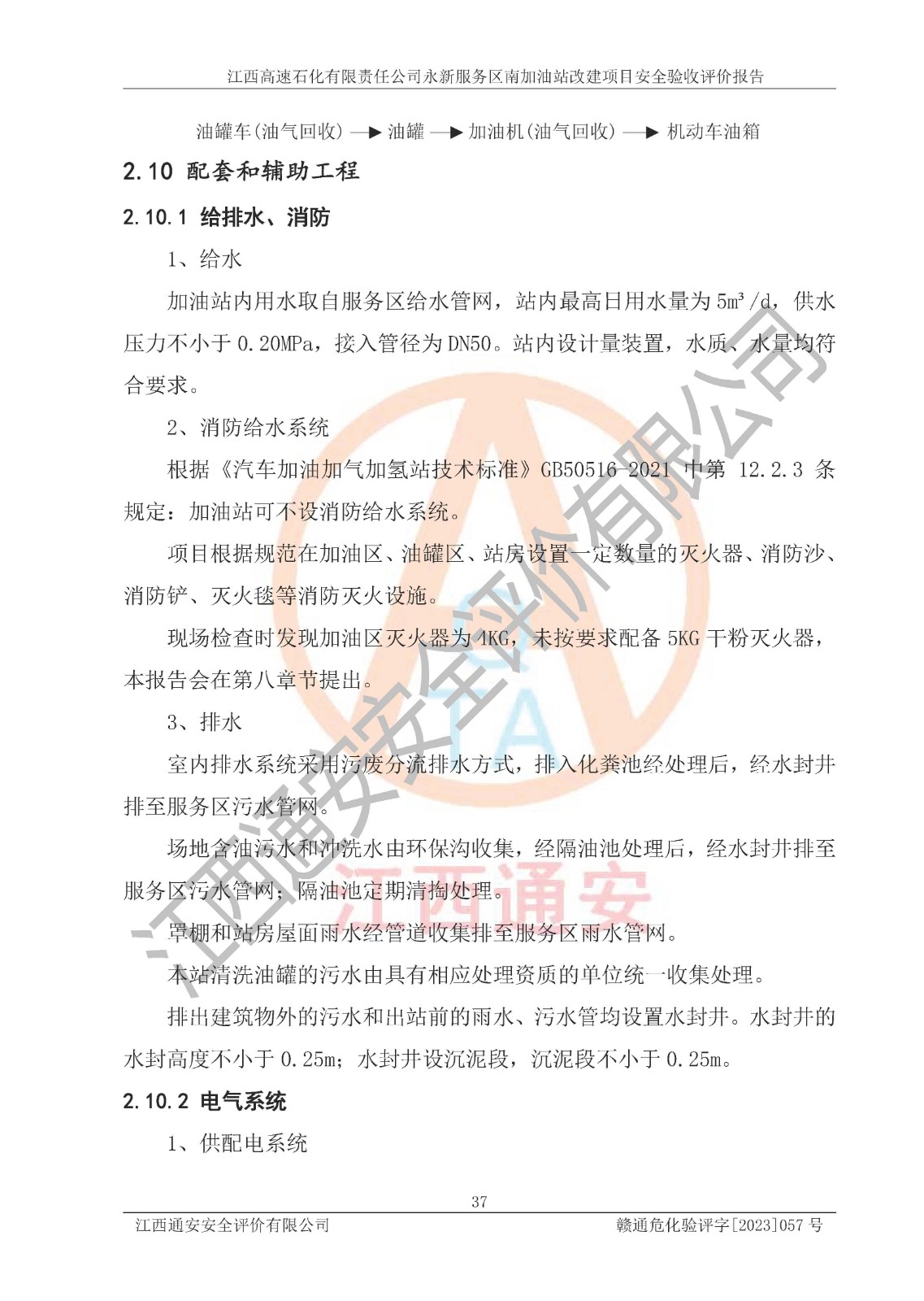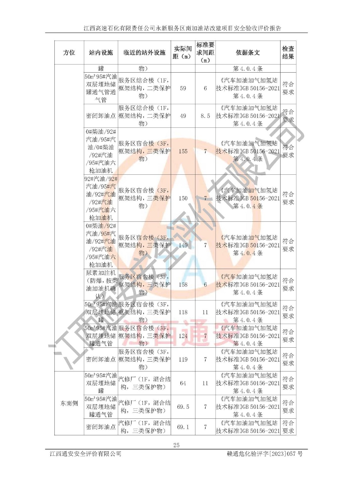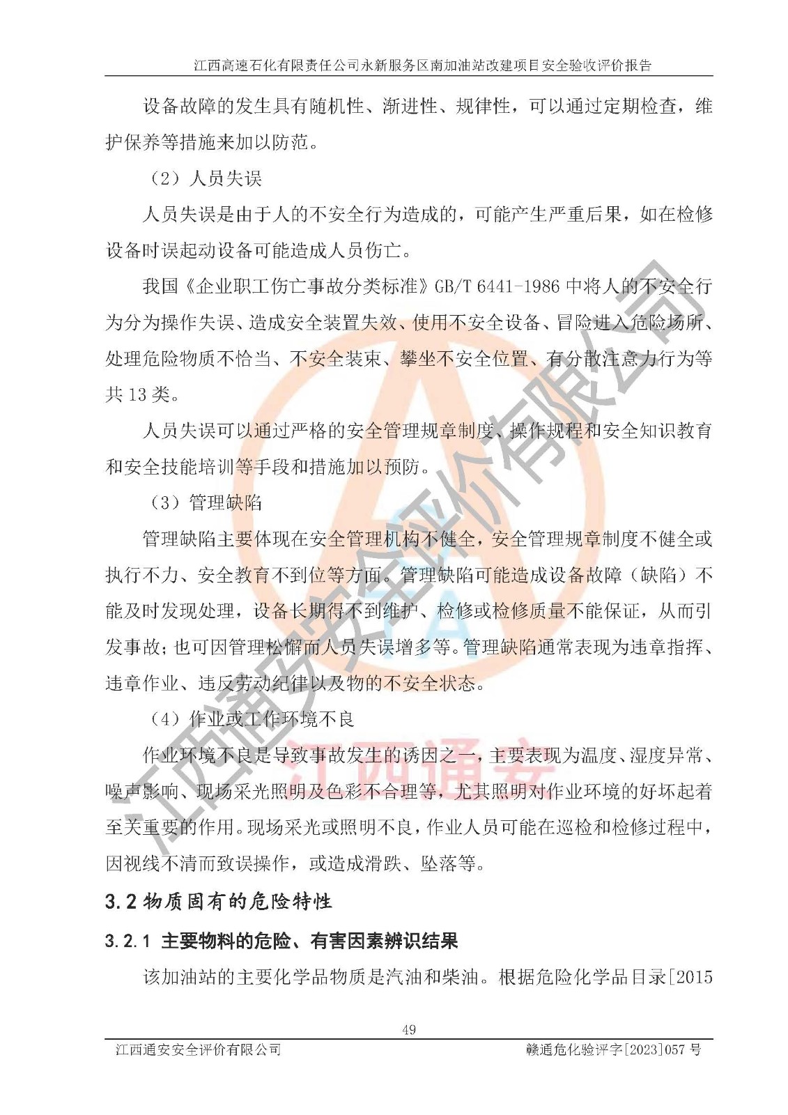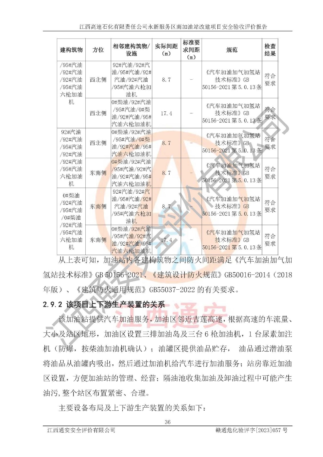 項(xiàng)目簡(jiǎn)介  | 江西高速石化有限責(zé)任公司永新服務(wù)區(qū)南加油站成立于2019年2月2日,類(lèi)型:其他有限責(zé)任公司分公司;負(fù)責(zé)人:陳志斌;經(jīng)營(yíng)場(chǎng)所為江西省吉安市永新縣吉蓮高速永新服務(wù)區(qū)南。該公司營(yíng)業(yè)執(zhí)照經(jīng)營(yíng)范圍:石油、石油化工、化纖及其他化工產(chǎn)品的銷(xiāo)售;光伏、充電樁、日用百貨便利店經(jīng)營(yíng):汽車(chē)清洗服務(wù):廣告位出租:房屋租賃:食品、計(jì)生用品、零售卷煙、雪茄煙:委托代理收取水電費(fèi):銷(xiāo)售潤(rùn)滑油、燃油料。(依法須經(jīng)批準(zhǔn)的項(xiàng)目,經(jīng)相關(guān)部門(mén)批準(zhǔn)后方可開(kāi)展經(jīng)營(yíng)活動(dòng))。 該加油站于2023年12月4日經(jīng)吉安市商務(wù)局核準(zhǔn)變更換發(fā)成品油零售經(jīng)營(yíng)批準(zhǔn)證書(shū),證書(shū)編號(hào):油零售證書(shū)第吉0299號(hào)。**期由2023年12月4日至2028年12月3日。于2023年11月16日由吉安市應(yīng)急管理局變更發(fā)放危險(xiǎn)化學(xué)品經(jīng)營(yíng)許可證,證書(shū)編號(hào):贛吉?;?jīng)字【2022】360800000010。**期由2022年1月31日至2025年1月30日。 為提升優(yōu)化加油站的整體布局,更好滿足運(yùn)營(yíng)服務(wù)的需求,同時(shí)迎合吉蓮高速日益增長(zhǎng)的**,江西高速石化有限責(zé)任公司永新服務(wù)區(qū)南加油站決定在原址基礎(chǔ)上進(jìn)行改建,并于2023年3月17日獲得永新縣工業(yè)和信息化局蓋章的《江西省工業(yè)企業(yè)技術(shù)改造項(xiàng)目備案通知書(shū)》,同意該站在原址上改建。 江西高速石化有限責(zé)任公司永新服務(wù)區(qū)南加油站改建項(xiàng)目位于江西省吉安市永新縣吉蓮高速永新服務(wù)區(qū)南,加油站用地面積約2000m2。 該加油站改建前設(shè)有4個(gè)SF雙層埋地儲(chǔ)罐,分別為:1臺(tái)50m392#汽油雙層埋地儲(chǔ)罐,1臺(tái)50m395#汽油雙層埋地儲(chǔ)罐;2 臺(tái)50m30#柴油雙層埋地儲(chǔ)罐;柴油折半后總?cè)莘e為 150 m3,屬二級(jí)加油站。設(shè)有3個(gè)六槍3油品潛油泵加油機(jī),分別為:1臺(tái)0#柴油/92#汽油/95#汽油/0#柴油/92#汽油/95#汽油6槍加油機(jī),1臺(tái)0#柴油/92#汽油/95#汽油/0#柴油/92#汽油/95#汽油6槍加油機(jī),1臺(tái)0#柴油/92#汽油/95#汽油/0#柴油/92#汽油/95#汽油6槍加油機(jī)。 改建后情況如下:在原有罐區(qū)位置上將1臺(tái)50m30#柴油雙層埋地儲(chǔ)罐改造為1臺(tái)50m392#汽油雙層埋地儲(chǔ)罐,更換后設(shè)置4臺(tái)SF雙層埋地儲(chǔ)罐,其中包括:2臺(tái)50m392#汽油雙層埋地儲(chǔ)罐;1臺(tái)50m395#汽油雙層埋地儲(chǔ)罐;1臺(tái)50m30#柴油雙層埋地儲(chǔ)罐;改建后*大總儲(chǔ)量為200m3,柴油折半后總?cè)莘e為175m3,加油站等級(jí)由原來(lái)的二級(jí)變?yōu)?/span>一級(jí),設(shè)有1臺(tái)0#柴油/92#汽油/95#汽油/92#汽油/92#汽油/95#汽油6槍3油品加油機(jī),1臺(tái)0#柴油/92#汽油/95#汽油/0#柴油/92#汽油/95#汽油6槍3油品加油機(jī),1臺(tái)92#汽油/92#汽油/95#汽油/92#汽油/92#汽油/95#汽油6槍雙油品加油機(jī),設(shè)有1個(gè)尿素加注機(jī)(防爆,按柴油加油機(jī)確認(rèn)),加油站內(nèi)其他設(shè)施利舊。 江西高速石化有限責(zé)任公司永新服務(wù)區(qū)南加油站2022年12月委托江西省贛華安全生產(chǎn)科學(xué)技術(shù)咨詢(xún)服務(wù)中心編制《江西高速石化有限責(zé)任公司永新服務(wù)區(qū)南加油站改建項(xiàng)目安全預(yù)評(píng)價(jià)報(bào)告》,并于2023年4月12日取得《危險(xiǎn)化學(xué)品建設(shè)項(xiàng)目安全條件備案告知意見(jiàn)書(shū)》(吉市?;?xiàng)目安條審字[2023]2號(hào))。 江西高速石化有限責(zé)任公司永新服務(wù)區(qū)南加油站2023年4月委托哈爾濱天源石化工程設(shè)計(jì)有限責(zé)任公司編制《江西高速石化有限責(zé)任公司永新服務(wù)區(qū)南加油站改建項(xiàng)目安全設(shè)施設(shè)計(jì)》,并于2023年5月19日取得《危險(xiǎn)化學(xué)品建設(shè)項(xiàng)目安全設(shè)施設(shè)計(jì)審查意見(jiàn)書(shū)》(吉市?;?xiàng)目安設(shè)審字〔2023〕10號(hào))。