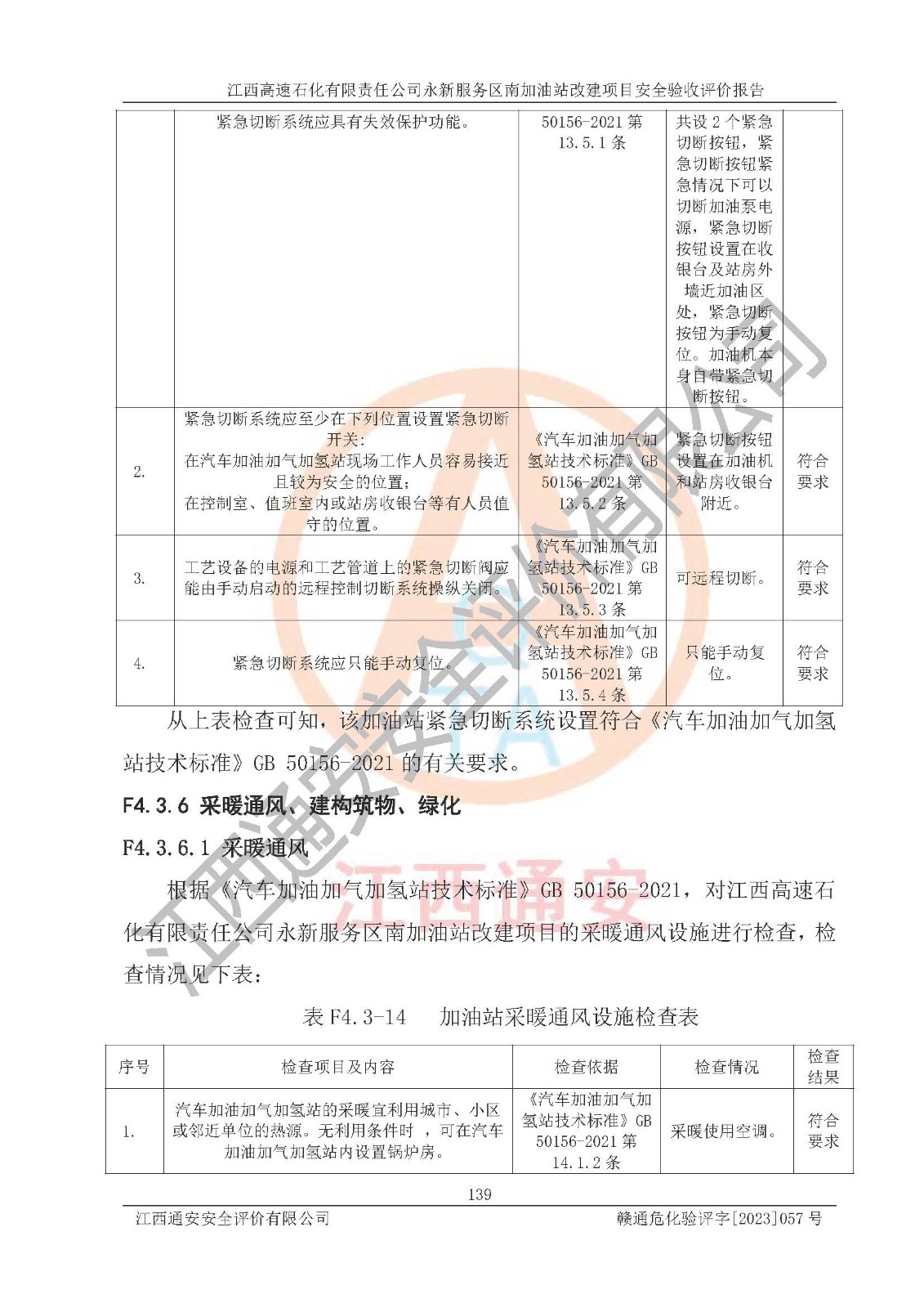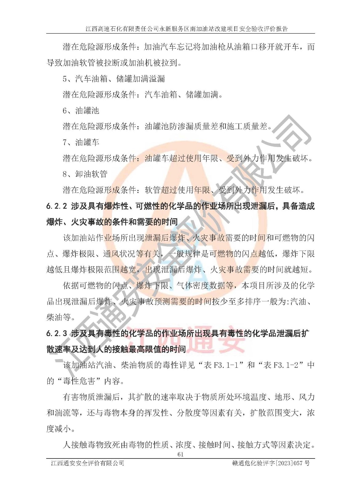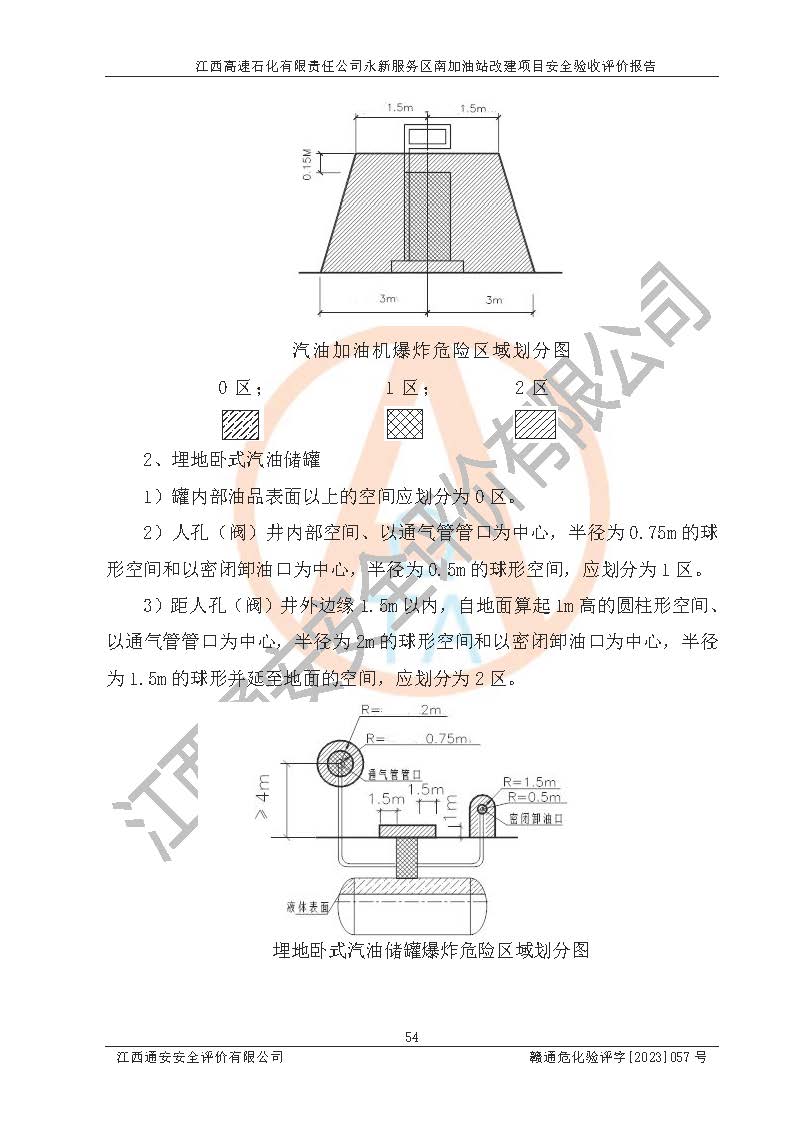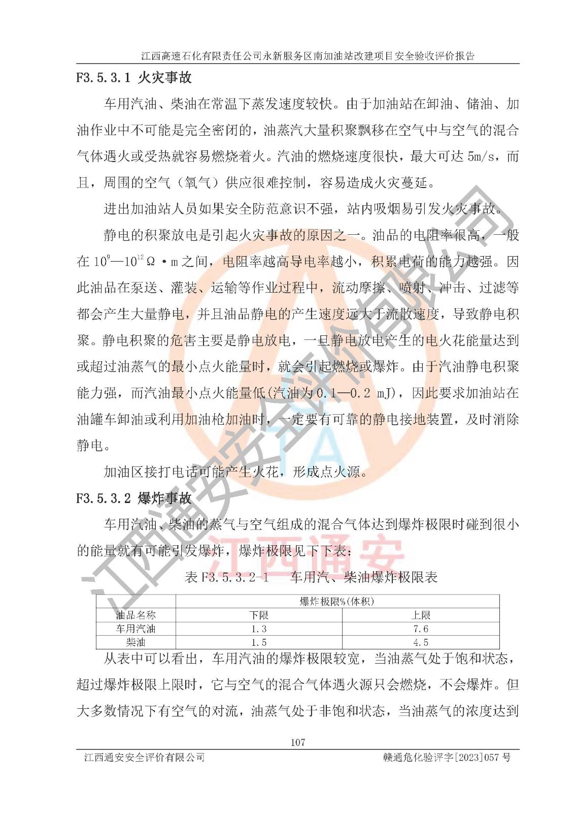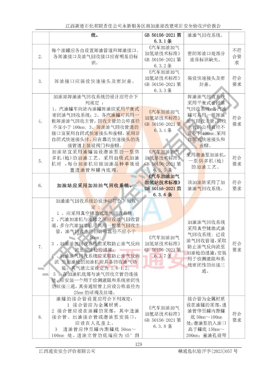 項(xiàng)目簡(jiǎn)介  | 江西高速石化有限責(zé)任公司永新服務(wù)區(qū)南加油站成立于2019年2月2日,類(lèi)型:其他有限責(zé)任公司分公司;負(fù)責(zé)人:陳志斌;經(jīng)營(yíng)場(chǎng)所為江西省吉安市永新縣吉蓮高速永新服務(wù)區(qū)南。該公司營(yíng)業(yè)執(zhí)照經(jīng)營(yíng)范圍:石油、石油化工、化纖及其他化工產(chǎn)品的銷(xiāo)售;光伏、充電樁、日用百貨便利店經(jīng)營(yíng):汽車(chē)清洗服務(wù):廣告位出租:房屋租賃:食品、計(jì)生用品、零售卷煙、雪茄煙:委托代理收取水電費(fèi):銷(xiāo)售潤(rùn)滑油、燃油料。(依法須經(jīng)批準(zhǔn)的項(xiàng)目,經(jīng)相關(guān)部門(mén)批準(zhǔn)后方可開(kāi)展經(jīng)營(yíng)活動(dòng))。 該加油站于2023年12月4日經(jīng)吉安市商務(wù)局核準(zhǔn)變更換發(fā)成品油零售經(jīng)營(yíng)批準(zhǔn)證書(shū),證書(shū)編號(hào):油零售證書(shū)第吉0299號(hào)。**期由2023年12月4日至2028年12月3日。于2023年11月16日由吉安市應(yīng)急管理局變更發(fā)放危險(xiǎn)化學(xué)品經(jīng)營(yíng)許可證,證書(shū)編號(hào):贛吉?;?jīng)字【2022】360800000010。**期由2022年1月31日至2025年1月30日。 為提升優(yōu)化加油站的整體布局,更好滿足運(yùn)營(yíng)服務(wù)的需求,同時(shí)迎合吉蓮高速日益增長(zhǎng)的**,江西高速石化有限責(zé)任公司永新服務(wù)區(qū)南加油站決定在原址基礎(chǔ)上進(jìn)行改建,并于2023年3月17日獲得永新縣工業(yè)和信息化局蓋章的《江西省工業(yè)企業(yè)技術(shù)改造項(xiàng)目備案通知書(shū)》,同意該站在原址上改建。 江西高速石化有限責(zé)任公司永新服務(wù)區(qū)南加油站改建項(xiàng)目位于江西省吉安市永新縣吉蓮高速永新服務(wù)區(qū)南,加油站用地面積約2000m2。 該加油站改建前設(shè)有4個(gè)SF雙層埋地儲(chǔ)罐,分別為:1臺(tái)50m392#汽油雙層埋地儲(chǔ)罐,1臺(tái)50m395#汽油雙層埋地儲(chǔ)罐;2 臺(tái)50m30#柴油雙層埋地儲(chǔ)罐;柴油折半后總?cè)莘e為 150 m3,屬二級(jí)加油站。設(shè)有3個(gè)六槍3油品潛油泵加油機(jī),分別為:1臺(tái)0#柴油/92#汽油/95#汽油/0#柴油/92#汽油/95#汽油6槍加油機(jī),1臺(tái)0#柴油/92#汽油/95#汽油/0#柴油/92#汽油/95#汽油6槍加油機(jī),1臺(tái)0#柴油/92#汽油/95#汽油/0#柴油/92#汽油/95#汽油6槍加油機(jī)。 改建后情況如下:在原有罐區(qū)位置上將1臺(tái)50m30#柴油雙層埋地儲(chǔ)罐改造為1臺(tái)50m392#汽油雙層埋地儲(chǔ)罐,更換后設(shè)置4臺(tái)SF雙層埋地儲(chǔ)罐,其中包括:2臺(tái)50m392#汽油雙層埋地儲(chǔ)罐;1臺(tái)50m395#汽油雙層埋地儲(chǔ)罐;1臺(tái)50m30#柴油雙層埋地儲(chǔ)罐;改建后*大總儲(chǔ)量為200m3,柴油折半后總?cè)莘e為175m3,加油站等級(jí)由原來(lái)的二級(jí)變?yōu)?/span>一級(jí),設(shè)有1臺(tái)0#柴油/92#汽油/95#汽油/92#汽油/92#汽油/95#汽油6槍3油品加油機(jī),1臺(tái)0#柴油/92#汽油/95#汽油/0#柴油/92#汽油/95#汽油6槍3油品加油機(jī),1臺(tái)92#汽油/92#汽油/95#汽油/92#汽油/92#汽油/95#汽油6槍雙油品加油機(jī),設(shè)有1個(gè)尿素加注機(jī)(防爆,按柴油加油機(jī)確認(rèn)),加油站內(nèi)其他設(shè)施利舊。 江西高速石化有限責(zé)任公司永新服務(wù)區(qū)南加油站2022年12月委托江西省贛華安全生產(chǎn)科學(xué)技術(shù)咨詢(xún)服務(wù)中心編制《江西高速石化有限責(zé)任公司永新服務(wù)區(qū)南加油站改建項(xiàng)目安全預(yù)評(píng)價(jià)報(bào)告》,并于2023年4月12日取得《危險(xiǎn)化學(xué)品建設(shè)項(xiàng)目安全條件備案告知意見(jiàn)書(shū)》(吉市?;?xiàng)目安條審字[2023]2號(hào))。 江西高速石化有限責(zé)任公司永新服務(wù)區(qū)南加油站2023年4月委托哈爾濱天源石化工程設(shè)計(jì)有限責(zé)任公司編制《江西高速石化有限責(zé)任公司永新服務(wù)區(qū)南加油站改建項(xiàng)目安全設(shè)施設(shè)計(jì)》,并于2023年5月19日取得《危險(xiǎn)化學(xué)品建設(shè)項(xiàng)目安全設(shè)施設(shè)計(jì)審查意見(jiàn)書(shū)》(吉市?;?xiàng)目安設(shè)審字〔2023〕10號(hào))。
