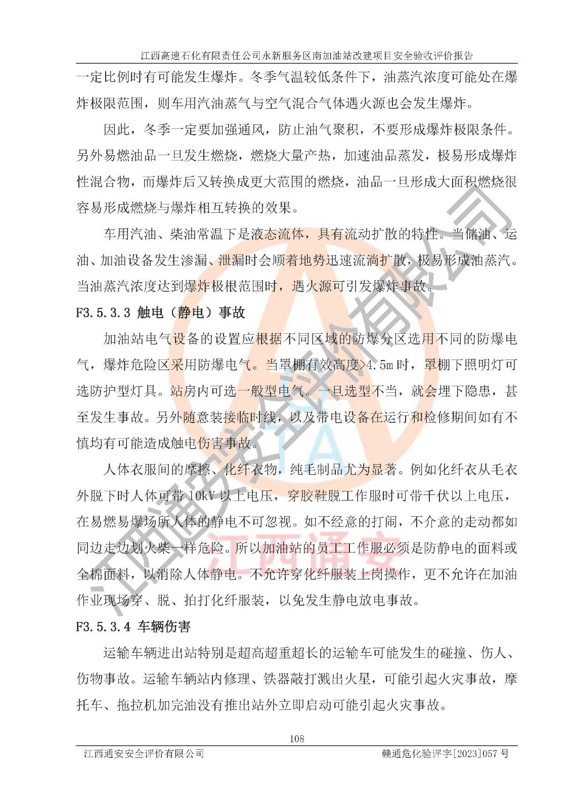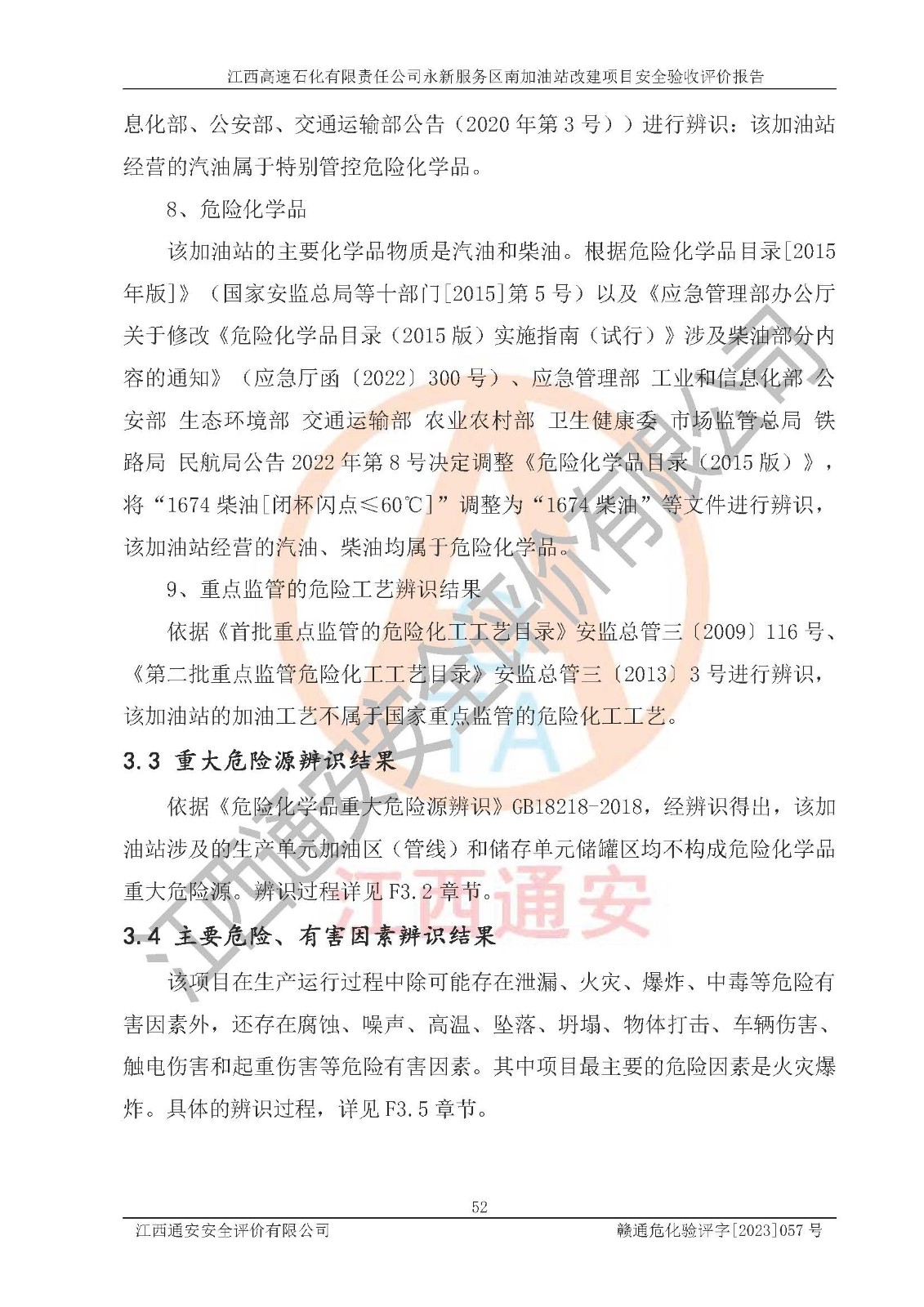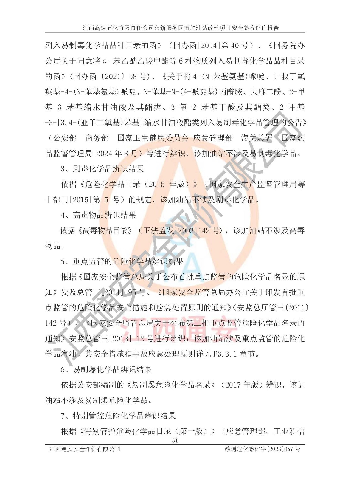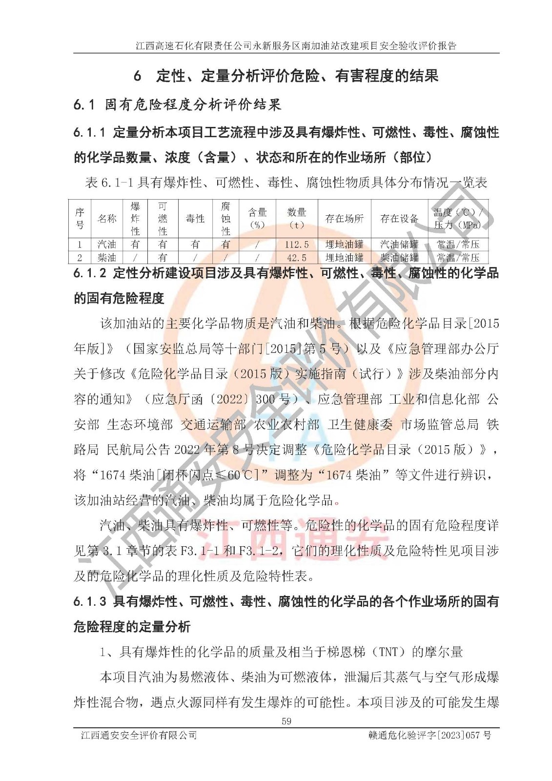 項(xiàng)目簡(jiǎn)介  | 江西高速石化有限責(zé)任公司永新服務(wù)區(qū)南加油站成立于2019年2月2日,類(lèi)型:其他有限責(zé)任公司分公司;負(fù)責(zé)人:陳志斌;經(jīng)營(yíng)場(chǎng)所為江西省吉安市永新縣吉蓮高速永新服務(wù)區(qū)南。該公司營(yíng)業(yè)執(zhí)照經(jīng)營(yíng)范圍:石油、石油化工、化纖及其他化工產(chǎn)品的銷(xiāo)售;光伏、充電樁、日用百貨便利店經(jīng)營(yíng):汽車(chē)清洗服務(wù):廣告位出租:房屋租賃:食品、計(jì)生用品、零售卷煙、雪茄煙:委托代理收取水電費(fèi):銷(xiāo)售潤(rùn)滑油、燃油料。(依法須經(jīng)批準(zhǔn)的項(xiàng)目,經(jīng)相關(guān)部門(mén)批準(zhǔn)后方可開(kāi)展經(jīng)營(yíng)活動(dòng))。 該加油站于2023年12月4日經(jīng)吉安市商務(wù)局核準(zhǔn)變更換發(fā)成品油零售經(jīng)營(yíng)批準(zhǔn)證書(shū),證書(shū)編號(hào):油零售證書(shū)第吉0299號(hào)。**期由2023年12月4日至2028年12月3日。于2023年11月16日由吉安市應(yīng)急管理局變更發(fā)放危險(xiǎn)化學(xué)品經(jīng)營(yíng)許可證,證書(shū)編號(hào):贛吉?;?jīng)字【2022】360800000010。**期由2022年1月31日至2025年1月30日。 為提升優(yōu)化加油站的整體布局,更好滿足運(yùn)營(yíng)服務(wù)的需求,同時(shí)迎合吉蓮高速日益增長(zhǎng)的**,江西高速石化有限責(zé)任公司永新服務(wù)區(qū)南加油站決定在原址基礎(chǔ)上進(jìn)行改建,并于2023年3月17日獲得永新縣工業(yè)和信息化局蓋章的《江西省工業(yè)企業(yè)技術(shù)改造項(xiàng)目備案通知書(shū)》,同意該站在原址上改建。 江西高速石化有限責(zé)任公司永新服務(wù)區(qū)南加油站改建項(xiàng)目位于江西省吉安市永新縣吉蓮高速永新服務(wù)區(qū)南,加油站用地面積約2000m2。 該加油站改建前設(shè)有4個(gè)SF雙層埋地儲(chǔ)罐,分別為:1臺(tái)50m392#汽油雙層埋地儲(chǔ)罐,1臺(tái)50m395#汽油雙層埋地儲(chǔ)罐;2 臺(tái)50m30#柴油雙層埋地儲(chǔ)罐;柴油折半后總?cè)莘e為 150 m3,屬二級(jí)加油站。設(shè)有3個(gè)六槍3油品潛油泵加油機(jī),分別為:1臺(tái)0#柴油/92#汽油/95#汽油/0#柴油/92#汽油/95#汽油6槍加油機(jī),1臺(tái)0#柴油/92#汽油/95#汽油/0#柴油/92#汽油/95#汽油6槍加油機(jī),1臺(tái)0#柴油/92#汽油/95#汽油/0#柴油/92#汽油/95#汽油6槍加油機(jī)。 改建后情況如下:在原有罐區(qū)位置上將1臺(tái)50m30#柴油雙層埋地儲(chǔ)罐改造為1臺(tái)50m392#汽油雙層埋地儲(chǔ)罐,更換后設(shè)置4臺(tái)SF雙層埋地儲(chǔ)罐,其中包括:2臺(tái)50m392#汽油雙層埋地儲(chǔ)罐;1臺(tái)50m395#汽油雙層埋地儲(chǔ)罐;1臺(tái)50m30#柴油雙層埋地儲(chǔ)罐;改建后*大總儲(chǔ)量為200m3,柴油折半后總?cè)莘e為175m3,加油站等級(jí)由原來(lái)的二級(jí)變?yōu)?/span>一級(jí),設(shè)有1臺(tái)0#柴油/92#汽油/95#汽油/92#汽油/92#汽油/95#汽油6槍3油品加油機(jī),1臺(tái)0#柴油/92#汽油/95#汽油/0#柴油/92#汽油/95#汽油6槍3油品加油機(jī),1臺(tái)92#汽油/92#汽油/95#汽油/92#汽油/92#汽油/95#汽油6槍雙油品加油機(jī),設(shè)有1個(gè)尿素加注機(jī)(防爆,按柴油加油機(jī)確認(rèn)),加油站內(nèi)其他設(shè)施利舊。 江西高速石化有限責(zé)任公司永新服務(wù)區(qū)南加油站2022年12月委托江西省贛華安全生產(chǎn)科學(xué)技術(shù)咨詢(xún)服務(wù)中心編制《江西高速石化有限責(zé)任公司永新服務(wù)區(qū)南加油站改建項(xiàng)目安全預(yù)評(píng)價(jià)報(bào)告》,并于2023年4月12日取得《危險(xiǎn)化學(xué)品建設(shè)項(xiàng)目安全條件備案告知意見(jiàn)書(shū)》(吉市?;?xiàng)目安條審字[2023]2號(hào))。 江西高速石化有限責(zé)任公司永新服務(wù)區(qū)南加油站2023年4月委托哈爾濱天源石化工程設(shè)計(jì)有限責(zé)任公司編制《江西高速石化有限責(zé)任公司永新服務(wù)區(qū)南加油站改建項(xiàng)目安全設(shè)施設(shè)計(jì)》,并于2023年5月19日取得《危險(xiǎn)化學(xué)品建設(shè)項(xiàng)目安全設(shè)施設(shè)計(jì)審查意見(jiàn)書(shū)》(吉市?;?xiàng)目安設(shè)審字〔2023〕10號(hào))。