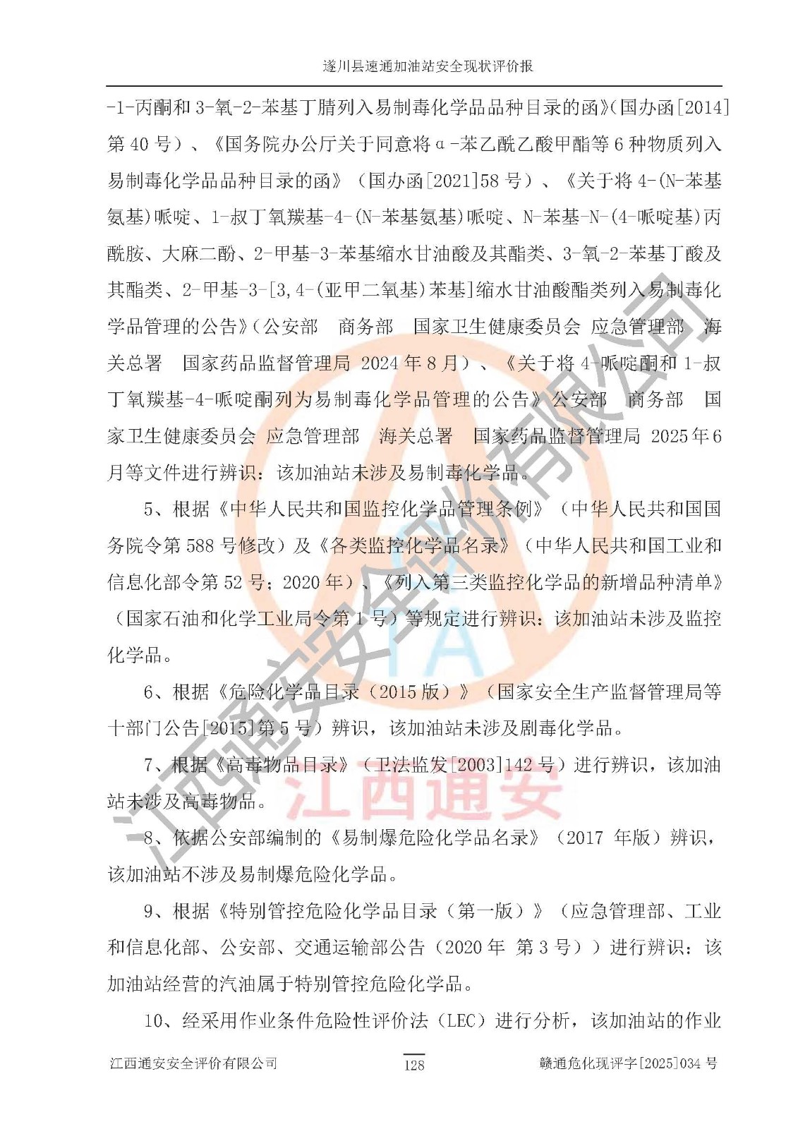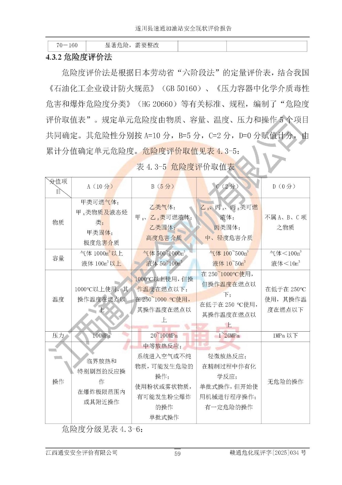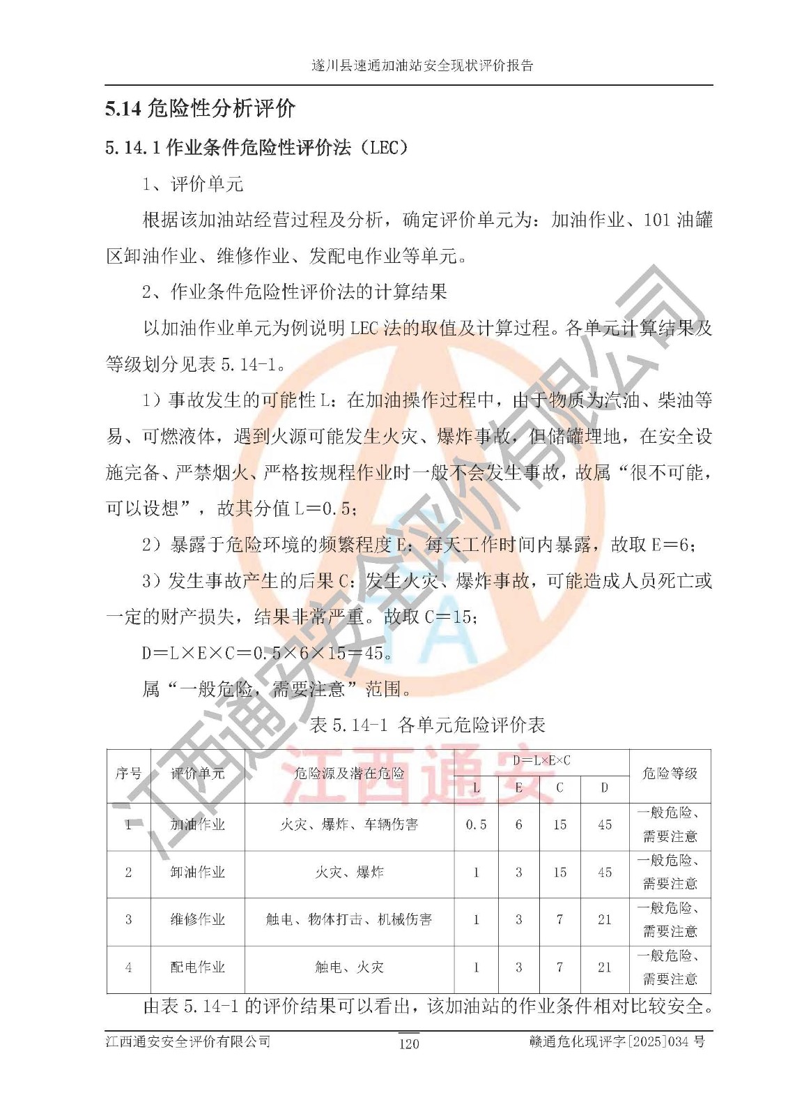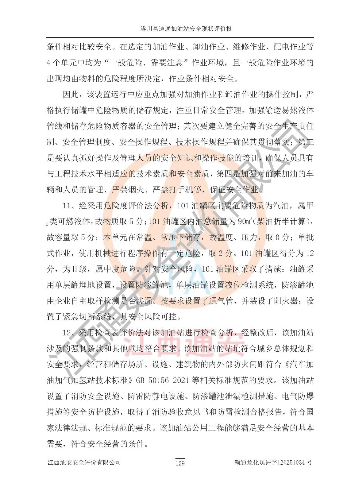 其它 | 在對該項目危險、有害因素辨識分析的基礎(chǔ)上,運用安全檢查表、預(yù)作業(yè)條件危險性分析法、危險度評價、重大事故后果分析結(jié)果等評價方法對該項目進(jìn)行了分析評價,評價結(jié)果如下: 1、該項目位于江西省吉安市遂川縣高速公路連接線(泉江鎮(zhèn)洋村段),符合當(dāng)?shù)匾?guī)劃,與周邊環(huán)境的距離符合有關(guān)標(biāo)準(zhǔn)、規(guī)范的要求。 2、總圖布置分區(qū)明確,布局合理,各建構(gòu)筑物的防火間距滿足規(guī)范要求。 3、該項目無**明令淘汰的工藝,設(shè)備、設(shè)施與工藝條件、內(nèi)部介質(zhì)相適應(yīng),特種設(shè)備及設(shè)施較齊全,按規(guī)定設(shè)置防雷、防靜電接地,爆炸危險環(huán)境加油機按要求采用防爆型,符合相關(guān)標(biāo)準(zhǔn)規(guī)范要求。 5、企業(yè)設(shè)置了安全生產(chǎn)管理機構(gòu),配備了專職安全生產(chǎn)管理人員,建立了安全生產(chǎn)責(zé)任制和安全生產(chǎn)管理制度,編制了崗位操作規(guī)程,編制了生產(chǎn)安全事故應(yīng)急預(yù)案,人員經(jīng)過相應(yīng)的培訓(xùn),企業(yè)的安全生產(chǎn)管理正常。 6、作業(yè)條件危險性評價結(jié)果:在選定的評價單元中,作業(yè)危險程度均為“一般危險,需要注意”,作業(yè)條件相對安全。 7、危險度評價結(jié)果:汽油儲罐的危險程度為中度危險。油罐采用單層罐埋地設(shè)置,設(shè)置防滲罐池,單層油罐設(shè)置液位檢測系統(tǒng),防滲罐池由企業(yè)自主取樣檢測是否滲漏。按要求設(shè)置了通氣管,并裝設(shè)了阻火器;設(shè)置了緊急切斷系統(tǒng),其安全風(fēng)險可控。 評價結(jié)論: 遂川縣速通加油站工藝設(shè)備和安全設(shè)施運行正常,安全管理機制運行正常,安全設(shè)施、措施達(dá)到設(shè)計要求和預(yù)期結(jié)果,可以滿足建設(shè)項目安全生產(chǎn)的要求,安全生產(chǎn)管理**,項目具備危險化學(xué)品經(jīng)營單位安全經(jīng)營條件的要求。 | ||||