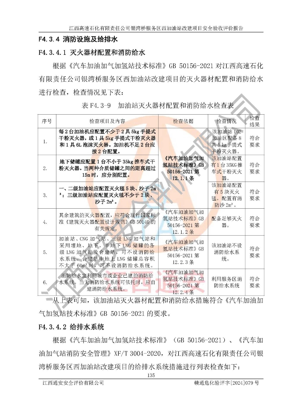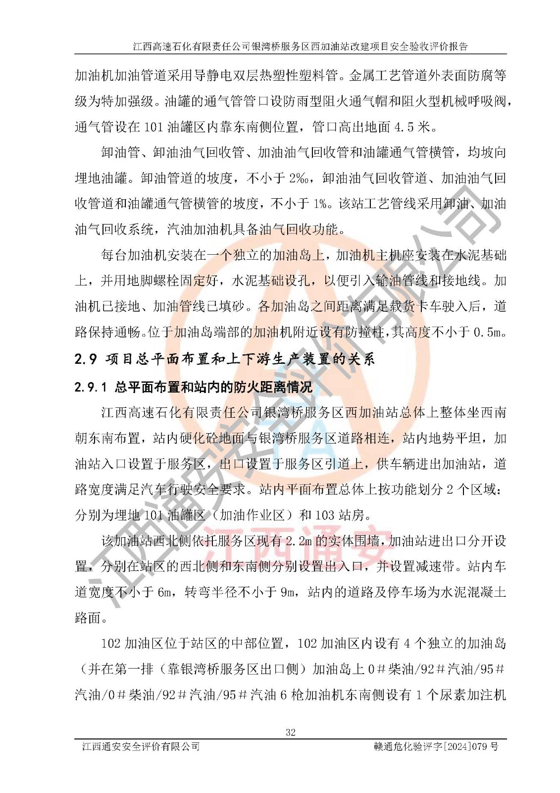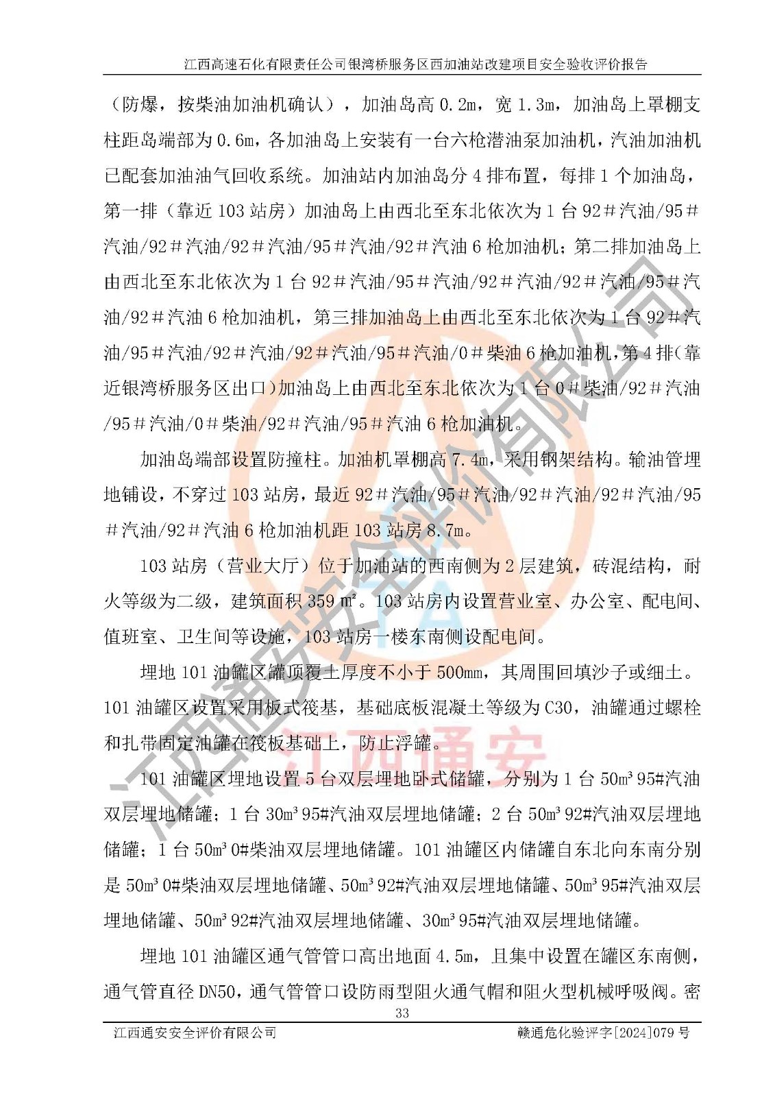 項目簡介 | 江西高速石化有限責(zé)任公司銀灣橋服務(wù)區(qū)西加油站成立于2011年9月16日,企業(yè)類型:其他有限責(zé)任公司分公司,負(fù)責(zé)人陳志斌。該站位于吉安縣固江鎮(zhèn)武吉高速銀灣橋服務(wù)區(qū),加油站為企業(yè)自有(建站土地為企業(yè)租賃所得),經(jīng)營范圍為:許可項目:成品油零售,成品油零售(不含危險化學(xué)品)(依法須經(jīng)批準(zhǔn)的項目,經(jīng)相關(guān)部門批準(zhǔn)后在許可**期內(nèi)方可開展經(jīng)營活動,具體經(jīng)營項目和許可期限以相關(guān)部門批準(zhǔn)文件或許可證件為準(zhǔn))一般項目:石油制品銷售(不含危險化學(xué)品)(除依法須經(jīng)批準(zhǔn)的項目外,憑營業(yè)執(zhí)照依法自主開展經(jīng)營活動)。 該加油站于2023年11月2日經(jīng)吉安市商務(wù)局核準(zhǔn)換發(fā)成品油零售經(jīng)營批準(zhǔn)證書,證書編號:油零售證書第吉0296號。**期由2023年11月2日至2028年11月1日。于2023年10月30日由吉安市應(yīng)急管理局變更發(fā)放危險化學(xué)品經(jīng)營許可證,證書編號:贛吉?;?jīng)字【2022】360800000169號。**期由2022年12月23日至2025年12月22日。 為提升優(yōu)化加油站的整體布局,更好滿足運營服務(wù)的需求,同時迎合武吉高速日益增長的**,江西高速石化有限責(zé)任公司銀灣橋服務(wù)區(qū)西加油站決定在原址基礎(chǔ)上進(jìn)行改建,并于2024年7月1日提交《江西高速石化有限責(zé)任公司銀灣橋服務(wù)區(qū)西加油站在原址改建的請示》,2024年7月11日取得由吉安縣發(fā)展和改革委員會蓋章的《江西省企業(yè)投資項目備案通知書》,同意該站在原址上改建。 該加油站改建前設(shè)有5個SF雙層埋地儲罐,分別為:1臺50m392#汽油雙層埋地儲罐,1臺50m395#汽油雙層埋地儲罐;2臺50m30#柴油雙層埋地儲罐;1 臺30m392#汽油雙層埋地儲罐。柴油折半后總?cè)莘e為 180m3,屬**加油站。設(shè)有2臺4槍潛油泵加油機(jī),2臺6槍潛油泵加油機(jī),分別為:1臺0#柴油/95#汽油/0#柴油/92#汽油4槍加油機(jī),1臺92#汽油/95#汽油/0#柴油/92#汽油/95#汽油/0#柴油6槍加油機(jī),1臺92#汽油/95#汽油/0#柴油/92#汽油/95#汽油/0#柴油6槍加油機(jī),1臺92#汽油/95#汽油/92#汽油/95#汽油4槍加油機(jī)。 改建后情況如下:在原有罐區(qū)位置上將1臺50m30#柴油雙層埋地儲罐改造為1臺50m392#汽油雙層埋地儲罐,1臺30m392#汽油雙層埋地儲罐改造為1臺30m395#汽油雙層埋地儲罐。儲罐更換后僅對油品變更,油罐保持原有,工藝管線進(jìn)行更換。設(shè)置5臺SF雙層埋地儲罐,其中包括:1臺50m395#汽油雙層埋地儲罐;1臺30m395#汽油雙層埋地儲罐;2臺50m392#汽油雙層埋地儲罐;1臺50m30#柴油雙層埋地儲罐;改建后*大總儲量為230m3,柴油折半后總?cè)莘e為205m3,屬**加油站,加油站等級未發(fā)生改變。加油機(jī)更換后在原有102加油區(qū)位置將2臺4槍加油機(jī)改造為2臺6槍加油機(jī),加油機(jī)加油槍號發(fā)生改變,設(shè)有1臺0#柴油/92#汽油/95#汽油/0#柴油/92#汽油/95#汽油6槍加油機(jī),1臺92#汽油/95#汽油/92#汽油/92#汽油/95#汽油/0#柴油6槍加油機(jī),1臺92#汽油/95#汽油/92#汽油/92#汽油/95#汽油/92#汽油6槍加油機(jī),1臺92#汽油/95#汽油/92#汽油/92#汽油/95#汽油/92#汽油6槍加油機(jī),新增1臺柴油尿素加注機(jī)(防爆,按柴油加油機(jī)確認(rèn)),工藝管線進(jìn)行更換。加油站內(nèi)其他設(shè)施利舊。 江西高速石化有限責(zé)任公司銀灣橋服務(wù)區(qū)西加油站2024年7月委托山東新安達(dá)工程咨詢有限公司編制《江西高速石化有限責(zé)任公司銀灣橋服務(wù)區(qū)西加油站改建項目安全條件評價報告》,并于2024年9月9日取得《危險化學(xué)品建設(shè)項目安全條件備案告知意見書》(吉市危化項目安條備字[2024]7號)。 江西高速石化有限責(zé)任公司銀灣橋服務(wù)區(qū)西加油站2024年10月委托天津中德工程設(shè)計有限公司編制《江西高速石化有限責(zé)任公司銀灣橋服務(wù)區(qū)西加油站改建項目安全設(shè)施設(shè)計》,并于2024年10月24日取得《危險化學(xué)品建設(shè)項目安全設(shè)施設(shè)計審查意見書》(吉市危化項目安設(shè)審字〔2024〕29號)。 | ||||