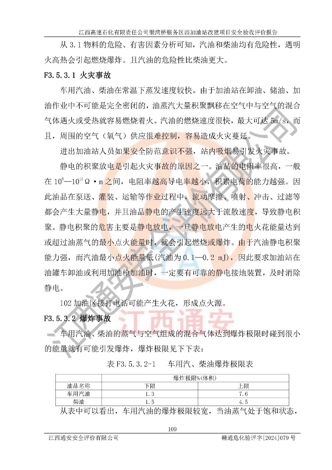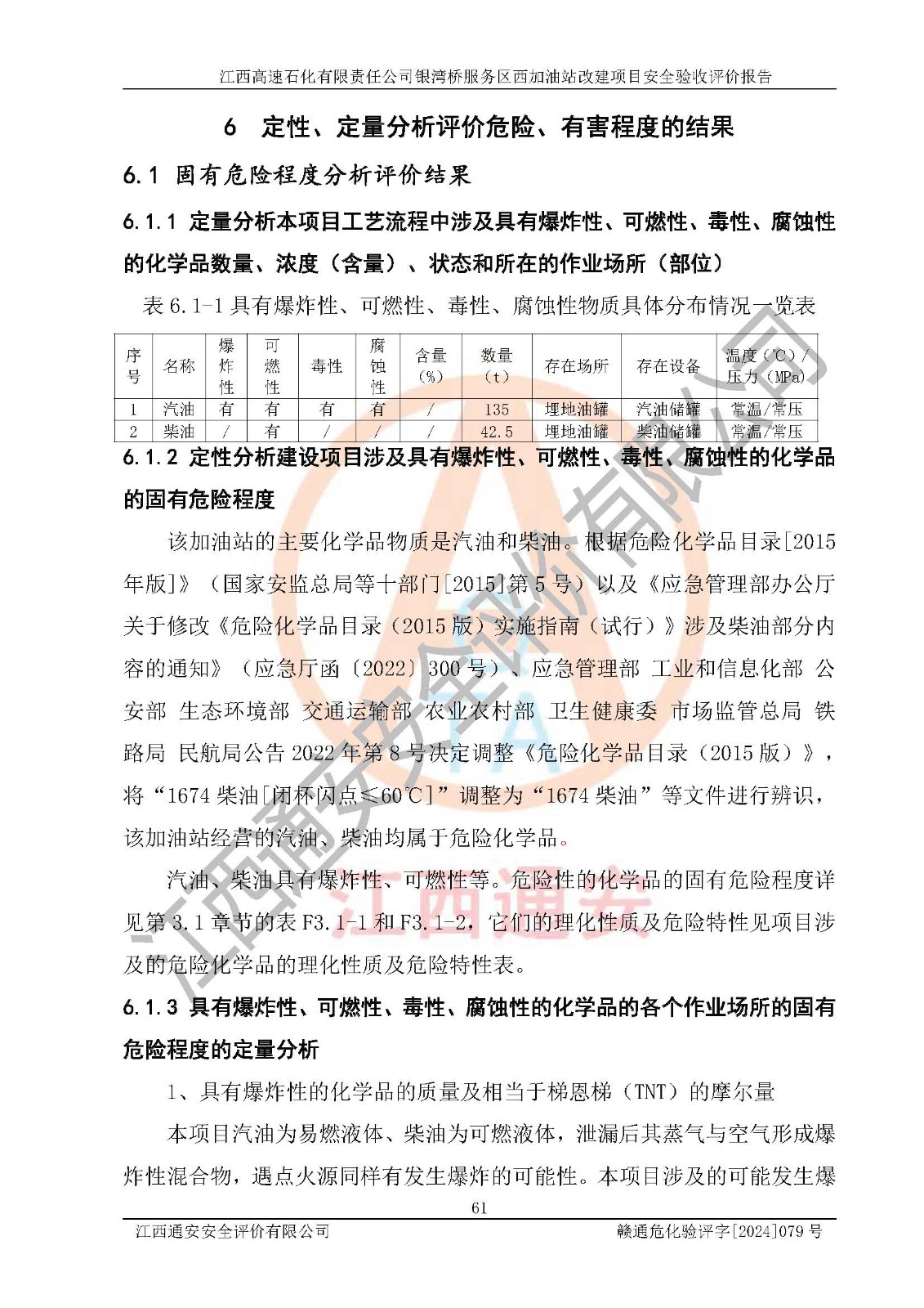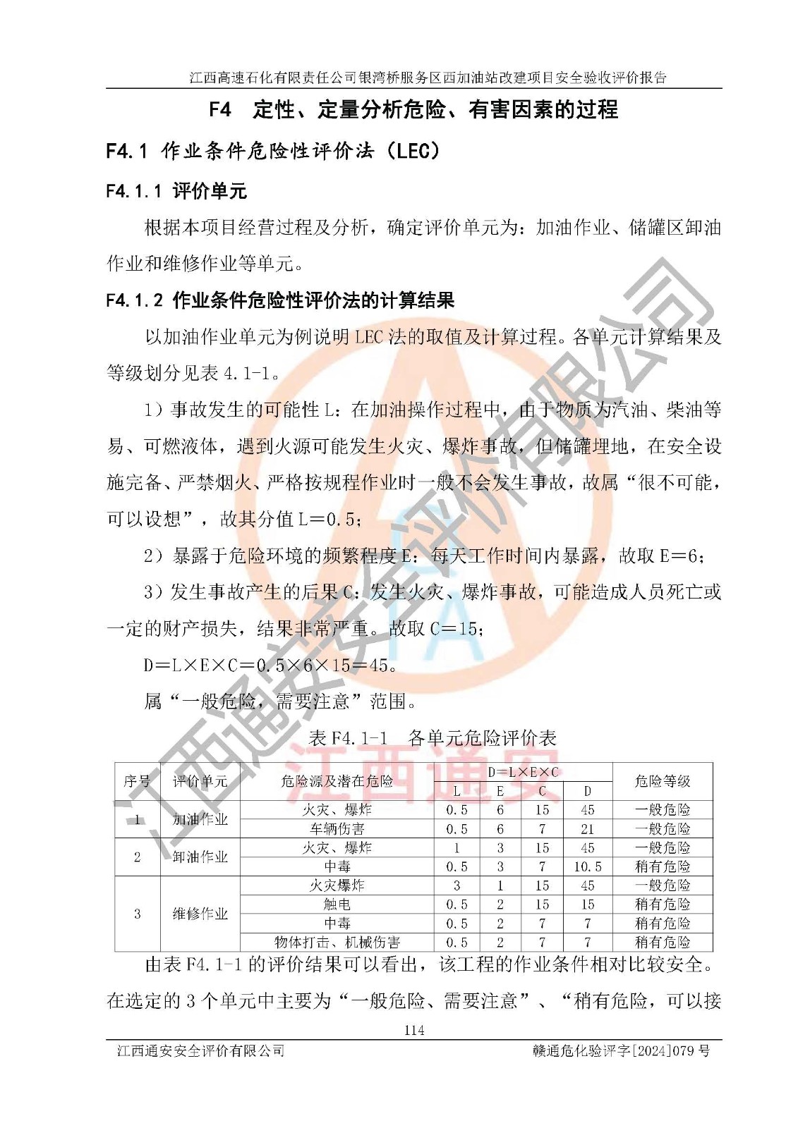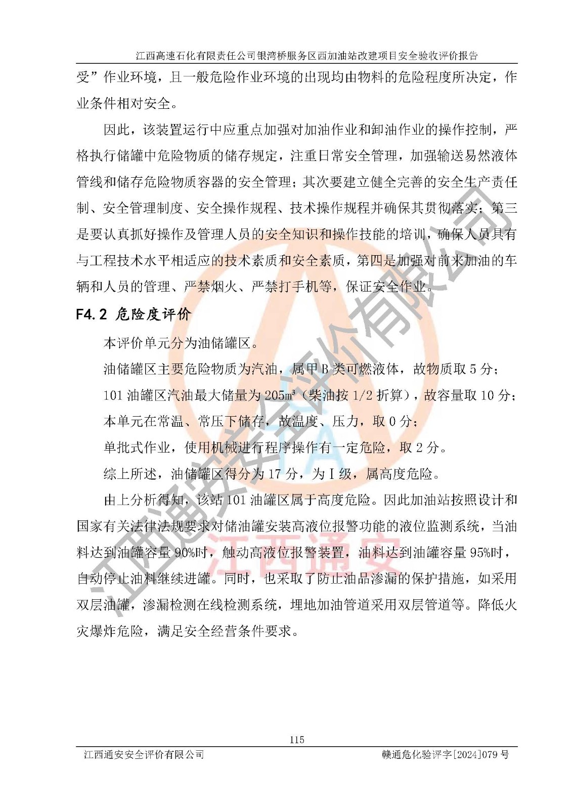 其它 | 在對該項目危險、有害因素辨識分析的基礎(chǔ)上,運用安全檢查表、預(yù)作業(yè)條件危險性分析法、危險度評價、重大事故后果分析結(jié)果等評價方法對該項目進(jìn)行了分析評價,評價結(jié)果如下: 1、該項目位于吉安縣固江鎮(zhèn)武吉高速銀灣橋服務(wù)區(qū),符合當(dāng)?shù)匾?guī)劃,與周邊環(huán)境的距離符合有關(guān)標(biāo)準(zhǔn)、規(guī)范的要求。 2、總圖布置分區(qū)明確,布局合理,各建構(gòu)筑物的防火間距滿足規(guī)范要求。 3、該項目無**明令淘汰的工藝,設(shè)備、設(shè)施與工藝條件、內(nèi)部介質(zhì)相適應(yīng),特種設(shè)備及設(shè)施較齊全,按規(guī)定設(shè)置防雷、防靜電接地,爆炸危險環(huán)境加油機(jī)按要求采用防爆型,符合相關(guān)標(biāo)準(zhǔn)規(guī)范要求。 5、企業(yè)設(shè)置了安全生產(chǎn)管理機(jī)構(gòu),配備了專職安全生產(chǎn)管理人員,建立了安全生產(chǎn)責(zé)任制和安全生產(chǎn)管理制度,編制了崗位操作規(guī)程,編制了生產(chǎn)安全事故應(yīng)急預(yù)案,人員經(jīng)過相應(yīng)的培訓(xùn),企業(yè)的安全生產(chǎn)管理正常。 6、作業(yè)條件危險性評價結(jié)果:在選定的評價單元中,作業(yè)危險程度均為“一般危險,需要注意”,作業(yè)條件相對安全。 7、危險度評價結(jié)果:汽油儲罐的危險程度為**危險。其設(shè)置了當(dāng)油料達(dá)到油罐容量90%時,觸動高液位報警裝置,油料達(dá)到油罐容量95%時,自動停止油料繼續(xù)進(jìn)罐。同時,也采取了防止油品滲漏的保護(hù)措施,如采用雙層油罐,滲漏檢測在線檢測系統(tǒng),埋地加油管道采用雙層管道等,可以滿足安全生產(chǎn)條件要求。 評價結(jié)論: 江西高速石化有限責(zé)任公司銀灣橋服務(wù)區(qū)西加油站工藝設(shè)備和安全設(shè)施運行正常,安全管理機(jī)制運行正常,安全設(shè)施、措施達(dá)到設(shè)計要求和預(yù)期結(jié)果,可以滿足建設(shè)項目安全生產(chǎn)的要求,安全生產(chǎn)管理**,項目具備危險化學(xué)品經(jīng)營單位安全經(jīng)營條件的要求。 | ||||