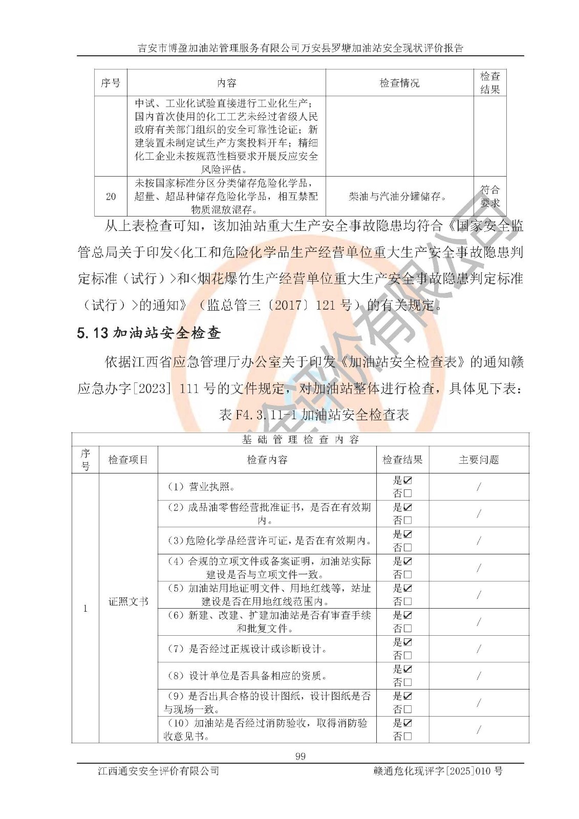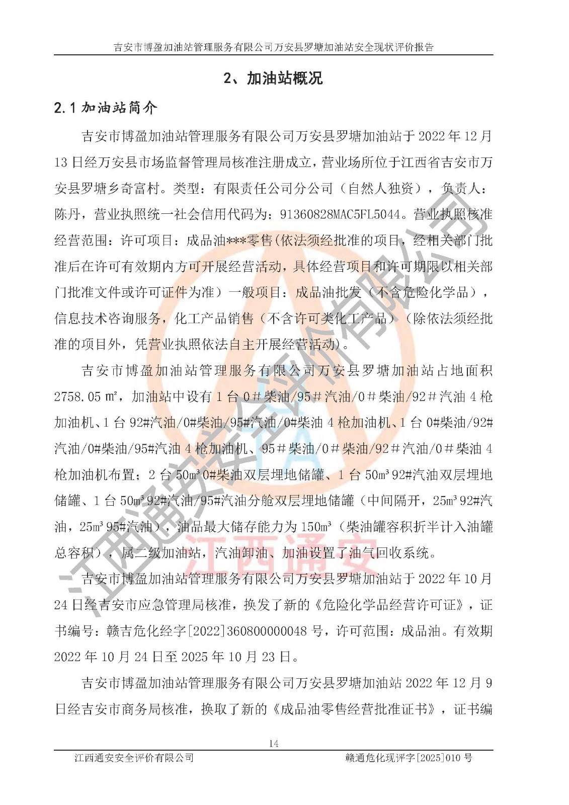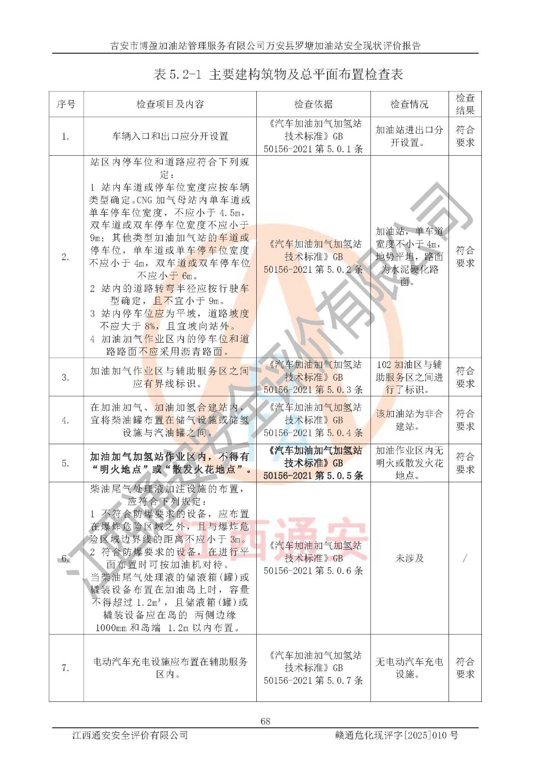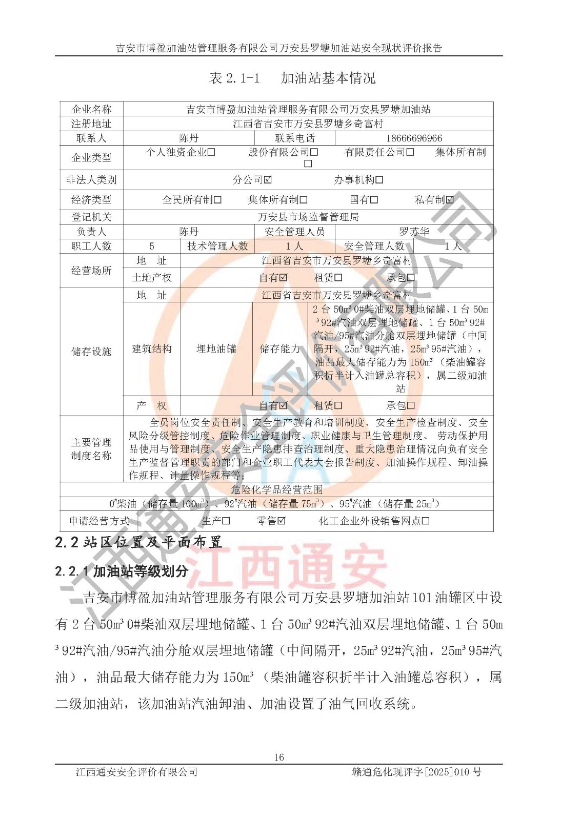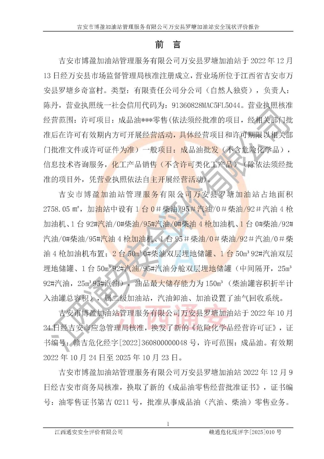 項目名稱 | 吉安市博盈加油站管理服務(wù)有限公司萬安縣羅塘加油站安全現(xiàn)狀評價報告 | ||||