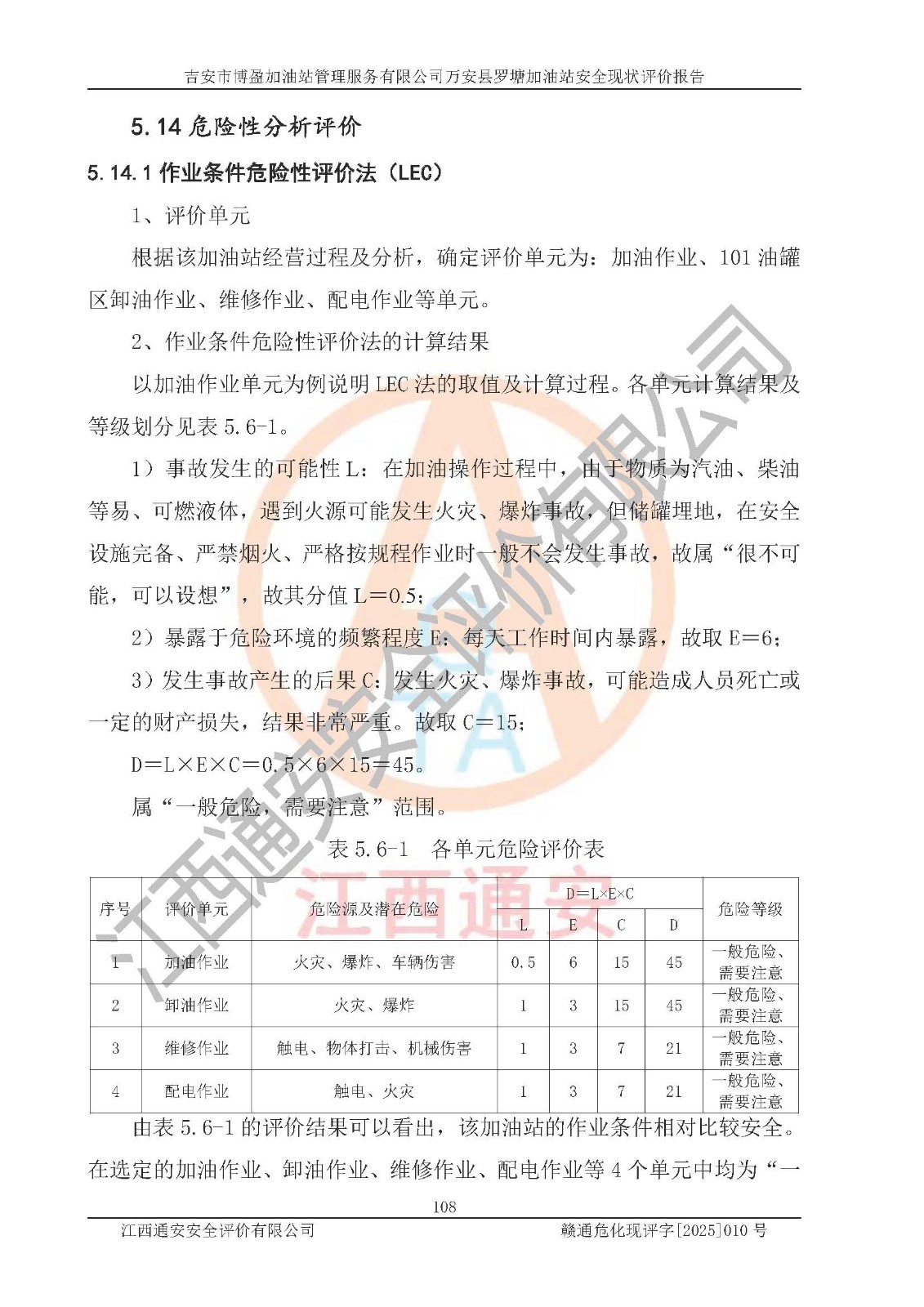 其它 | 在對該項目危險、有害因素辨識分析的基礎(chǔ)上,運用安全檢查表、預作業(yè)條件危險性分析法、危險度評價、重大事故后果分析結(jié)果等評價方法對該項目進行了分析評價,評價結(jié)果如下: 1、該項目位于江西省吉安市萬安縣羅塘鄉(xiāng)奇富村,符合當?shù)匾?guī)劃,與周邊環(huán)境的距離符合有關(guān)標準、規(guī)范的要求。 2、總圖布置分區(qū)明確,布局合理,各建構(gòu)筑物的防火間距滿足規(guī)范要求。 3、該項目無**明令淘汰的工藝,設(shè)備、設(shè)施與工藝條件、內(nèi)部介質(zhì)相適應(yīng),特種設(shè)備及設(shè)施較齊全,按規(guī)定設(shè)置防雷、防靜電接地,爆炸危險環(huán)境加油機按要求采用防爆型,符合相關(guān)標準規(guī)范要求。 5、企業(yè)設(shè)置了安全生產(chǎn)管理機構(gòu),配備了專職安全生產(chǎn)管理人員,建立了安全生產(chǎn)責任制和安全生產(chǎn)管理制度,編制了崗位操作規(guī)程,編制了生產(chǎn)安全事故應(yīng)急預案,人員經(jīng)過相應(yīng)的培訓,企業(yè)的安全生產(chǎn)管理正常。 6、作業(yè)條件危險性評價結(jié)果:在選定的評價單元中,作業(yè)危險程度均為“一般危險,需要注意”,作業(yè)條件相對安全。 7、危險度評價結(jié)果:汽油儲罐的危險程度為**危險。油罐采用雙層罐埋地設(shè)置,按要求設(shè)置了通氣管,并裝設(shè)了阻火器;設(shè)置了液位監(jiān)測報警系統(tǒng)和緊急切斷系統(tǒng),設(shè)置了雙層管道及雙層管道滲漏檢測系統(tǒng),其安全風險可控。 評價結(jié)論: 吉安市博盈加油站管理服務(wù)有限公司萬安縣羅塘加油站工藝設(shè)備和安全設(shè)施運行正常,安全管理機制運行正常,安全設(shè)施、措施達到設(shè)計要求和預期結(jié)果,可以滿足建設(shè)項目安全生產(chǎn)的要求,安全生產(chǎn)管理**,項目具備危險化學品經(jīng)營單位安全經(jīng)營條件的要求。 | ||||