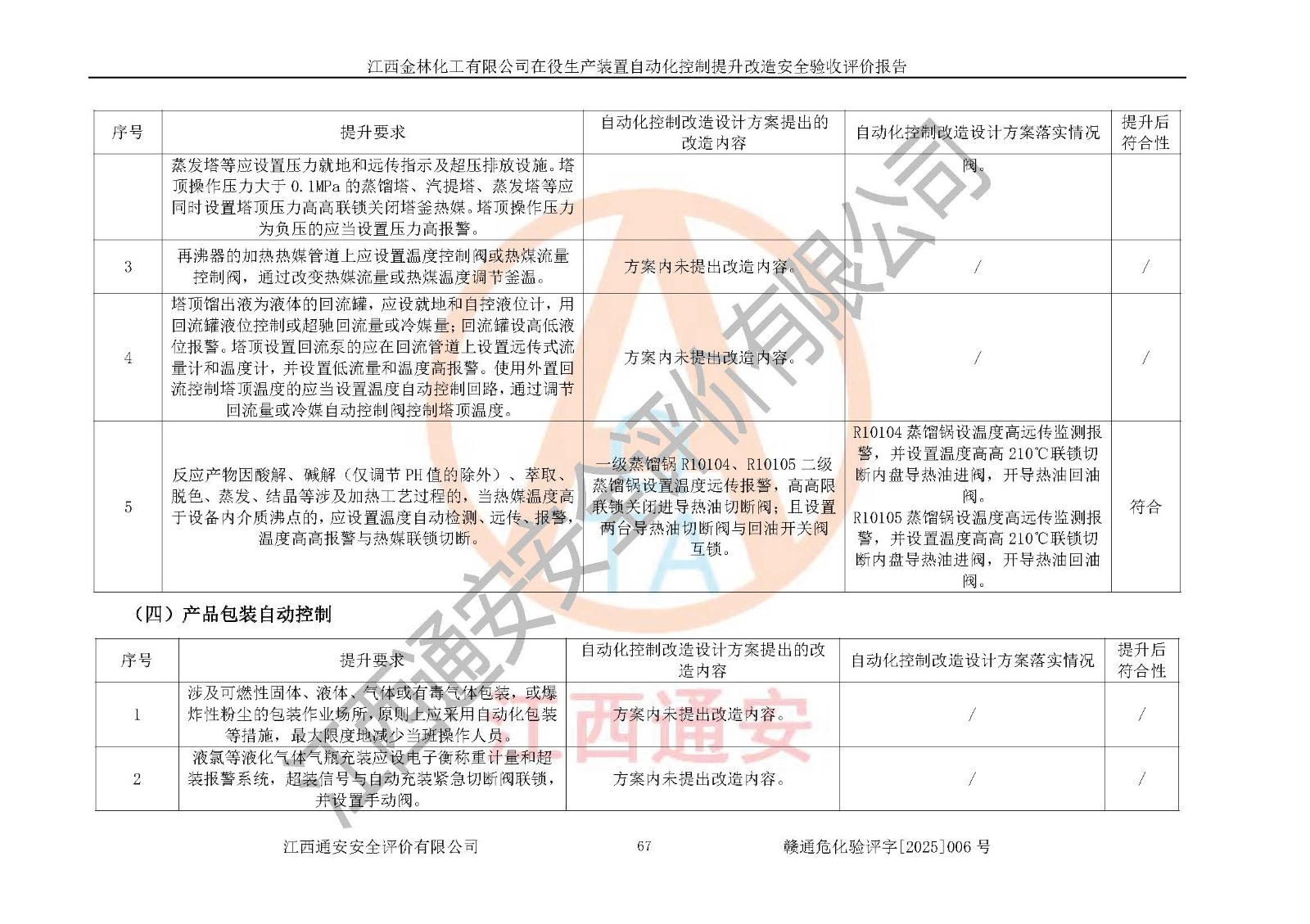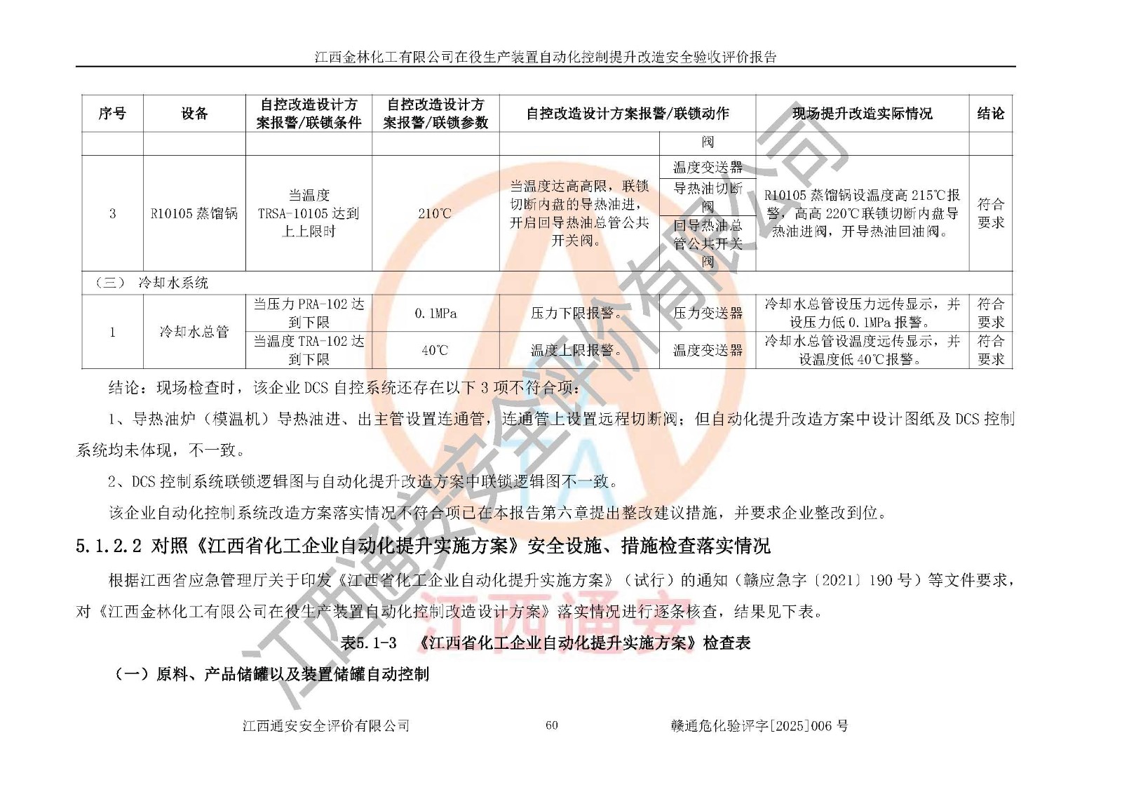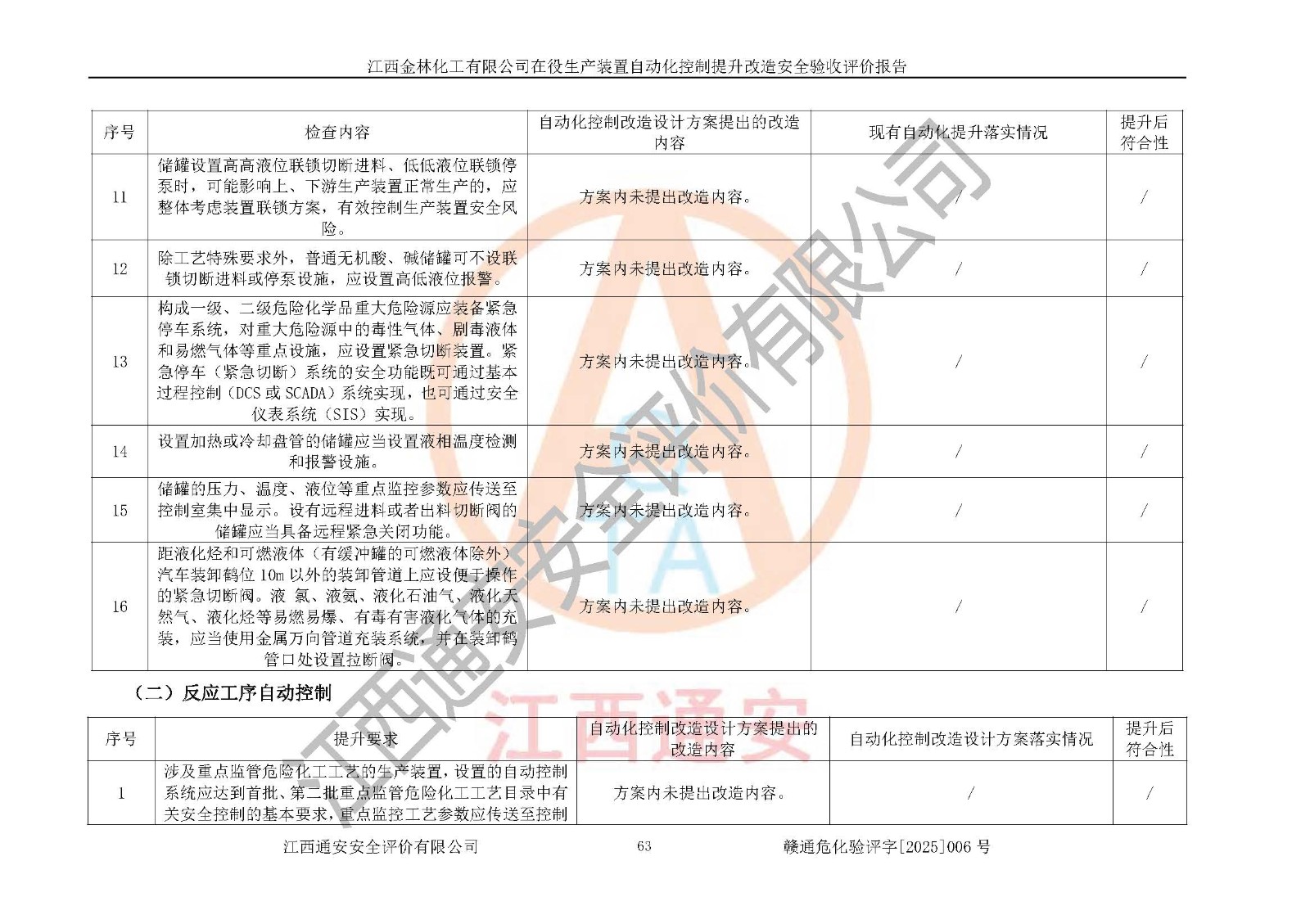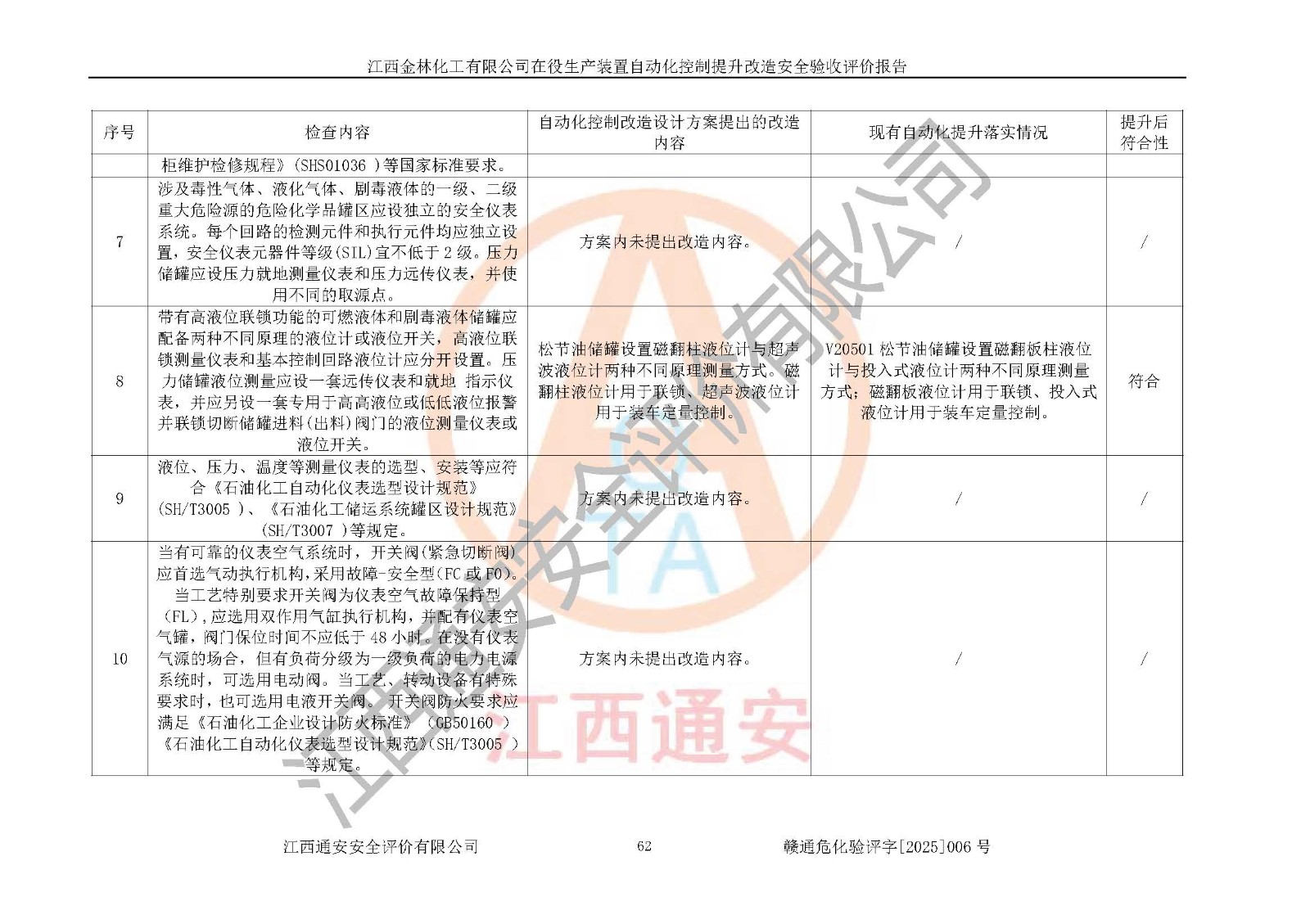 評(píng)價(jià)結(jié)論 | 江西金林化工有限公司在役生產(chǎn)裝置自動(dòng)化控制改造工程設(shè)計(jì)方案中提出的整改和控制措施已得到落實(shí),企業(yè)控制系統(tǒng)設(shè)置情況與設(shè)計(jì)方案一致,由具有**相應(yīng)資質(zhì)的單位進(jìn)行設(shè)計(jì)、施工,施工單位對(duì)自動(dòng)控制系統(tǒng)調(diào)試合格,并出具了竣工圖,安全設(shè)施、儀表系統(tǒng)及安全管理符合**及有關(guān)部門關(guān)于安全生產(chǎn)法律、法規(guī)、標(biāo)準(zhǔn)的要求,安全風(fēng)險(xiǎn)程度是可以接受的,安全風(fēng)險(xiǎn)可控,滿足《江西省應(yīng)急管理廳關(guān)于印發(fā)<江西省化工企業(yè)自動(dòng)化提升實(shí)施方案>(試行)的通知》(贛應(yīng)急字[2021]190號(hào))的要求,具備在役生產(chǎn)裝置全流程自動(dòng)化控制改造工程竣工驗(yàn)收條件。 | |||