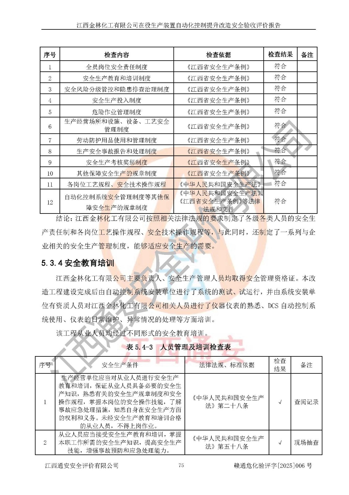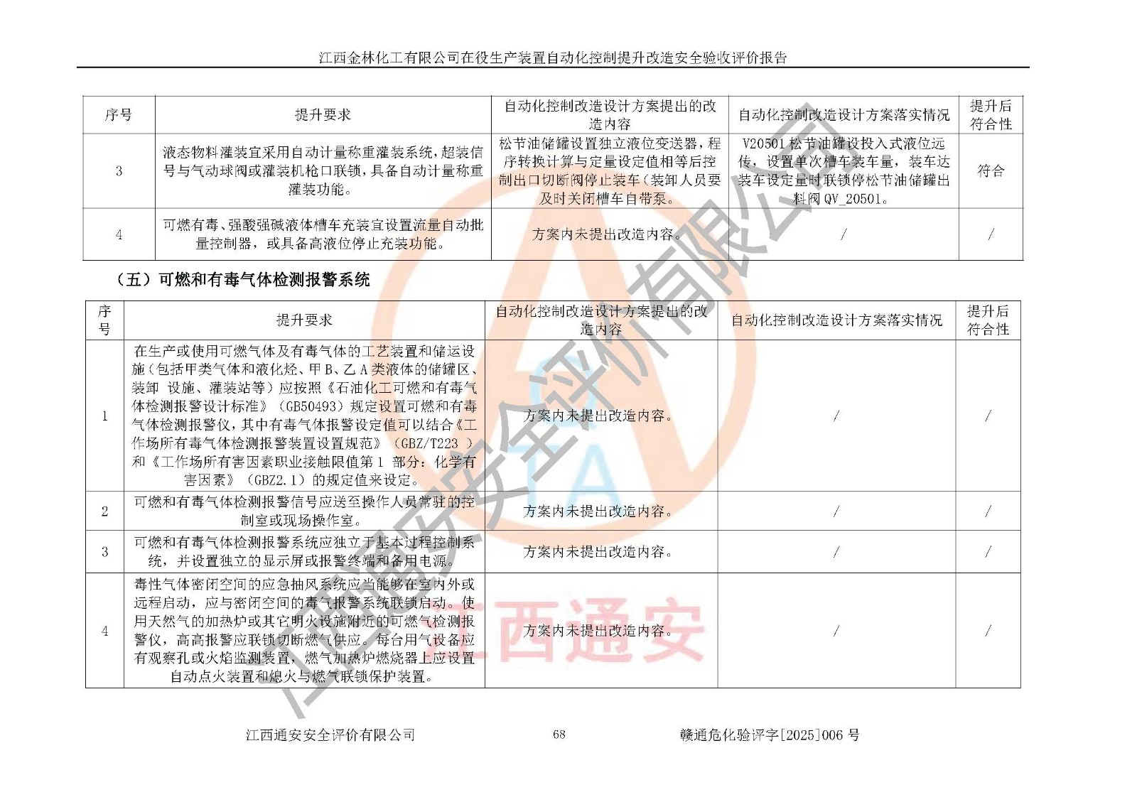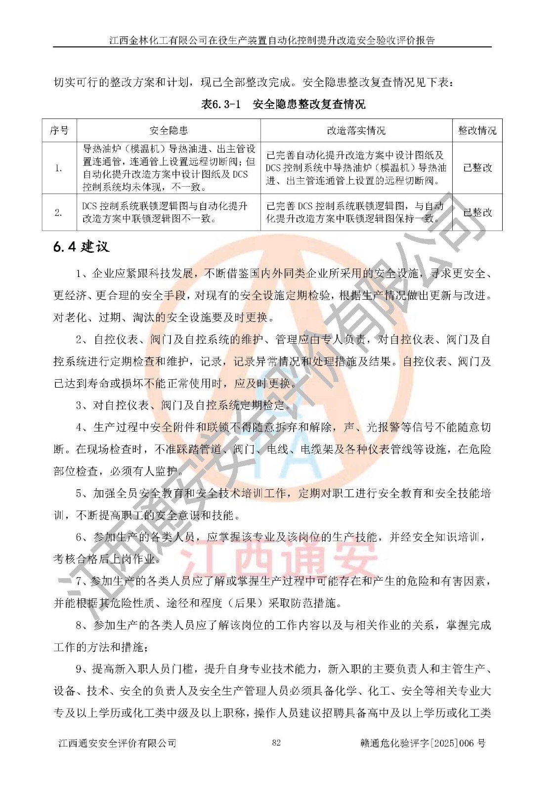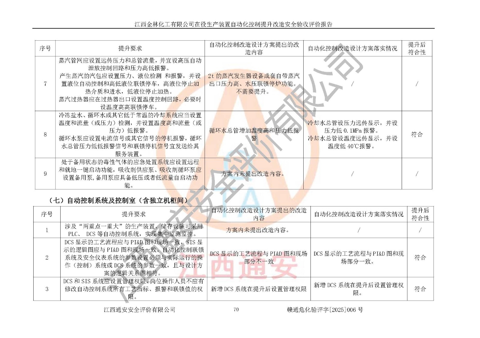 評(píng)價(jià)結(jié)論 | 江西金林化工有限公司在役生產(chǎn)裝置自動(dòng)化控制改造工程設(shè)計(jì)方案中提出的整改和控制措施已得到落實(shí),企業(yè)控制系統(tǒng)設(shè)置情況與設(shè)計(jì)方案一致,由具有**相應(yīng)資質(zhì)的單位進(jìn)行設(shè)計(jì)、施工,施工單位對(duì)自動(dòng)控制系統(tǒng)調(diào)試合格,并出具了竣工圖,安全設(shè)施、儀表系統(tǒng)及安全管理符合**及有關(guān)部門關(guān)于安全生產(chǎn)法律、法規(guī)、標(biāo)準(zhǔn)的要求,安全風(fēng)險(xiǎn)程度是可以接受的,安全風(fēng)險(xiǎn)可控,滿足《江西省應(yīng)急管理廳關(guān)于印發(fā)<江西省化工企業(yè)自動(dòng)化提升實(shí)施方案>(試行)的通知》(贛應(yīng)急字[2021]190號(hào))的要求,具備在役生產(chǎn)裝置全流程自動(dòng)化控制改造工程竣工驗(yàn)收條件。 | |||