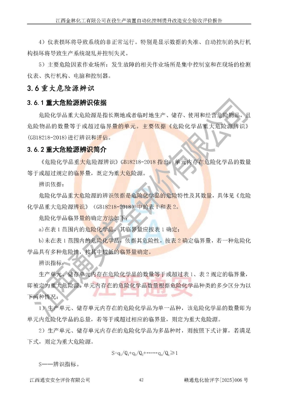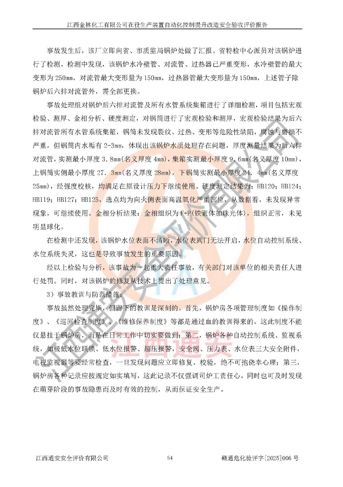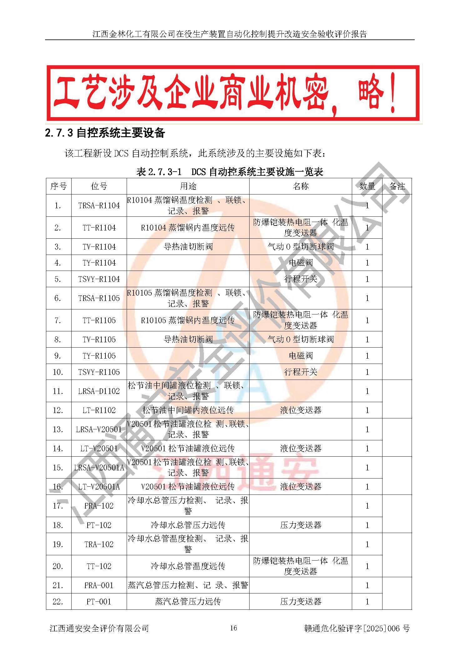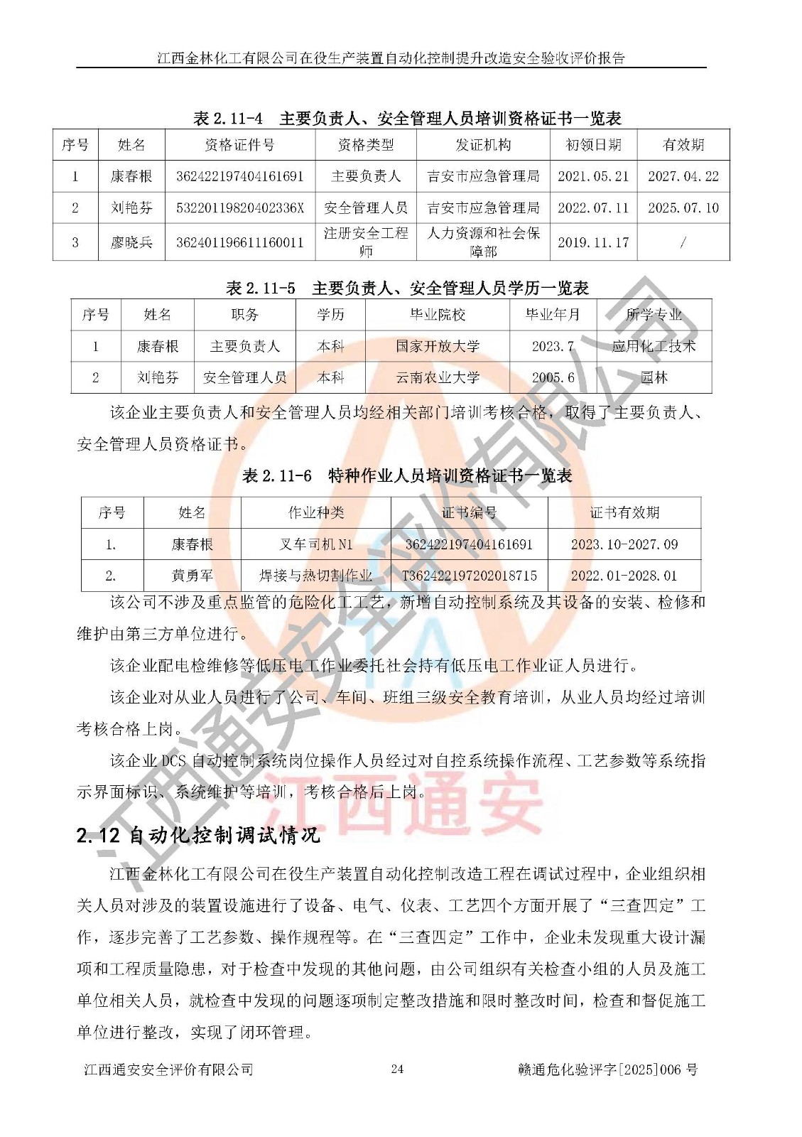 評(píng)價(jià)結(jié)論 | 江西金林化工有限公司在役生產(chǎn)裝置自動(dòng)化控制改造工程設(shè)計(jì)方案中提出的整改和控制措施已得到落實(shí),企業(yè)控制系統(tǒng)設(shè)置情況與設(shè)計(jì)方案一致,由具有**相應(yīng)資質(zhì)的單位進(jìn)行設(shè)計(jì)、施工,施工單位對(duì)自動(dòng)控制系統(tǒng)調(diào)試合格,并出具了竣工圖,安全設(shè)施、儀表系統(tǒng)及安全管理符合**及有關(guān)部門關(guān)于安全生產(chǎn)法律、法規(guī)、標(biāo)準(zhǔn)的要求,安全風(fēng)險(xiǎn)程度是可以接受的,安全風(fēng)險(xiǎn)可控,滿足《江西省應(yīng)急管理廳關(guān)于印發(fā)<江西省化工企業(yè)自動(dòng)化提升實(shí)施方案>(試行)的通知》(贛應(yīng)急字[2021]190號(hào))的要求,具備在役生產(chǎn)裝置全流程自動(dòng)化控制改造工程竣工驗(yàn)收條件。 | |||