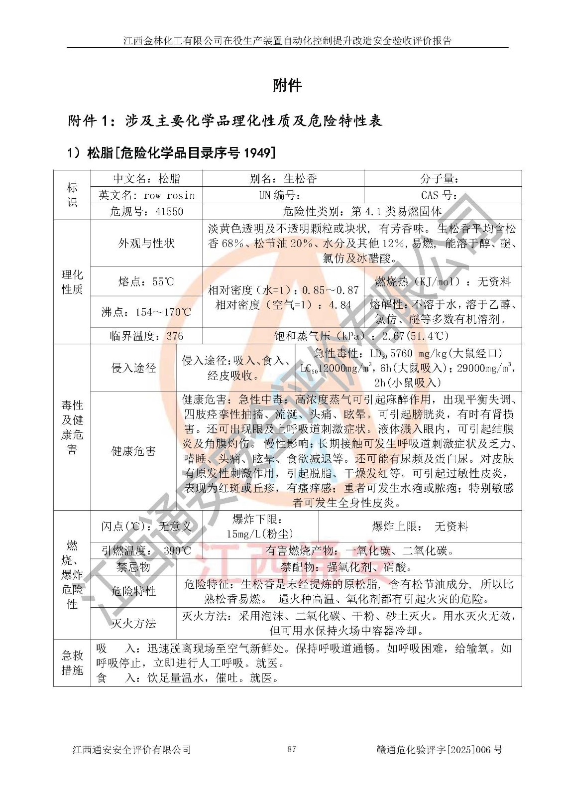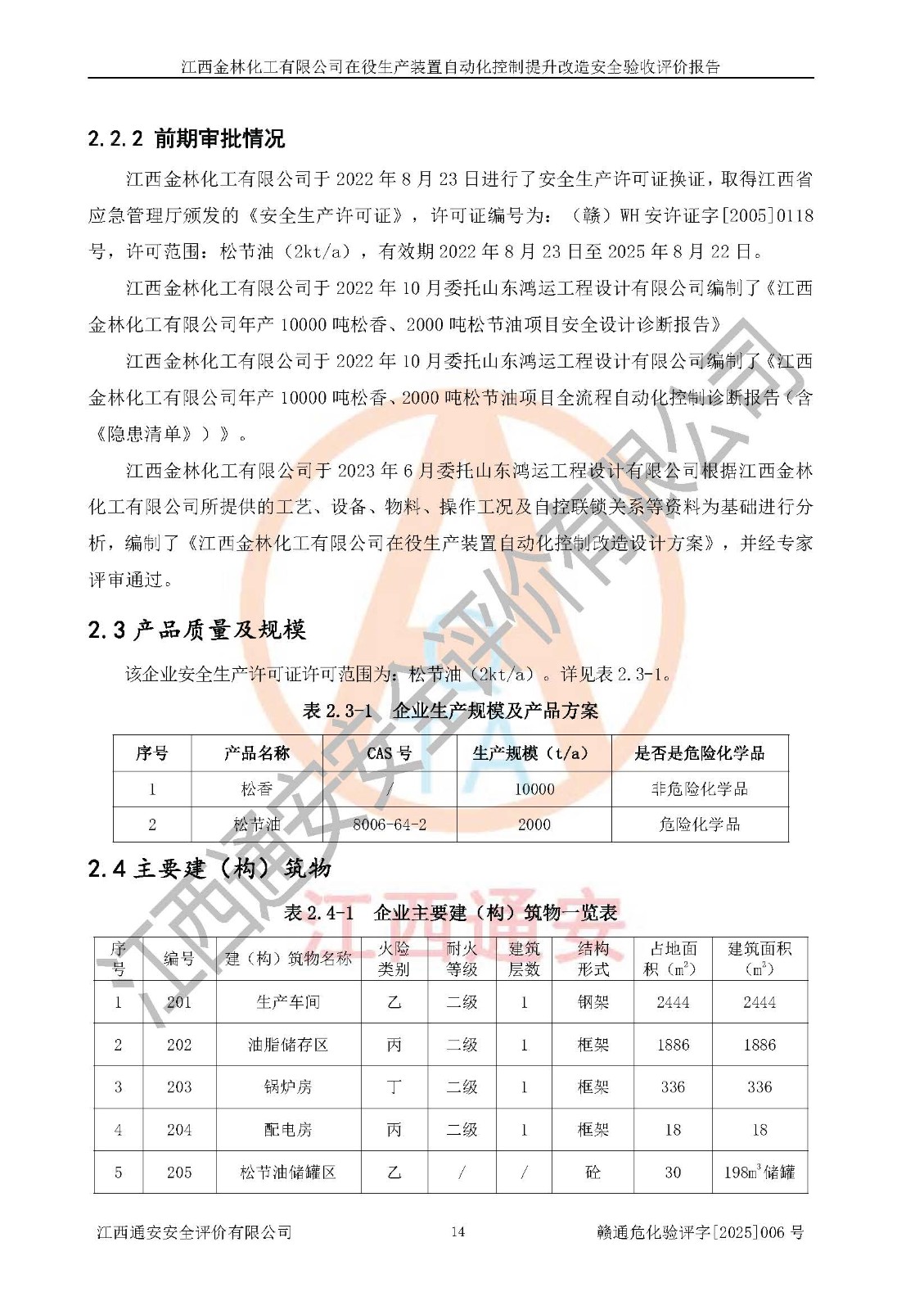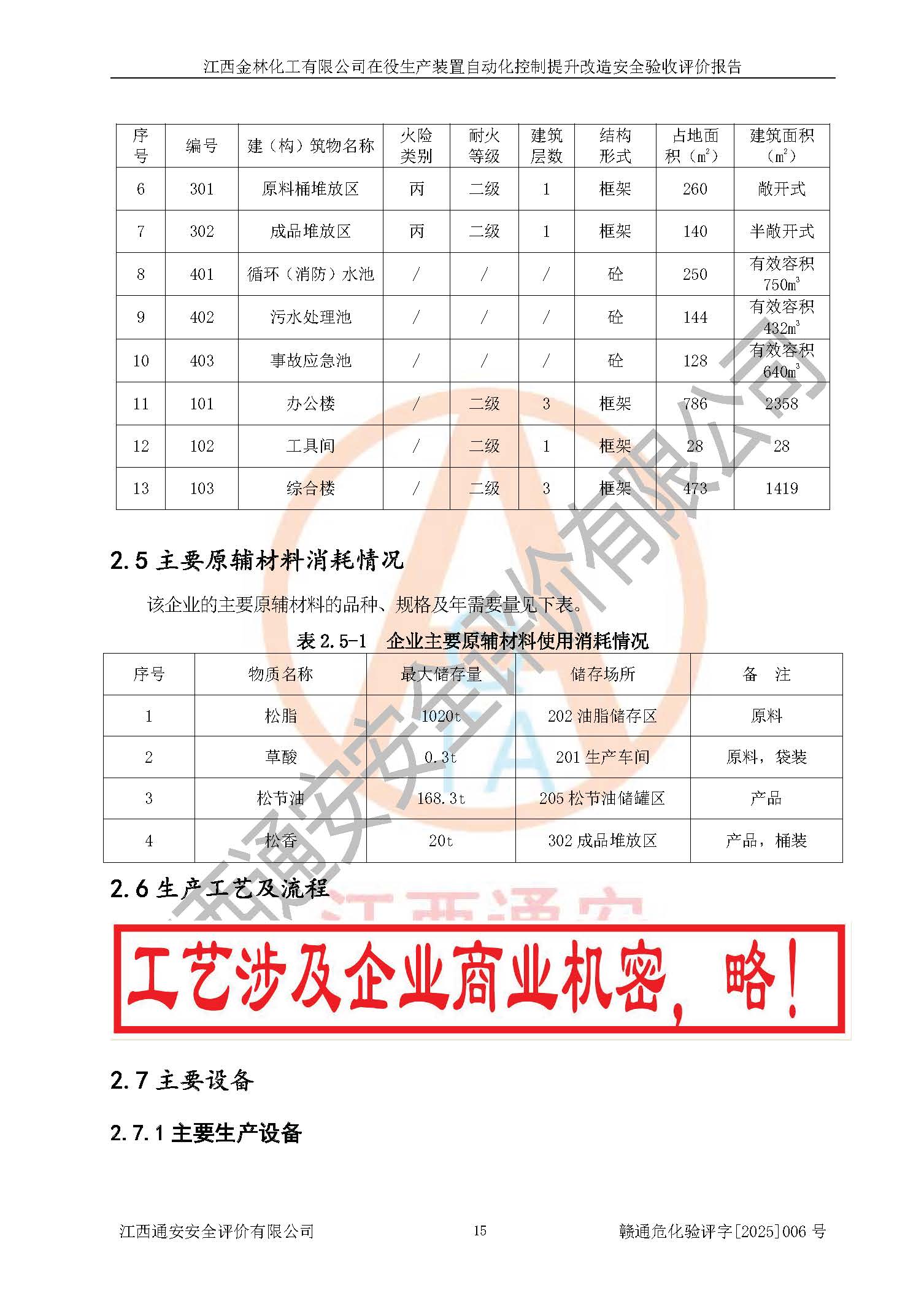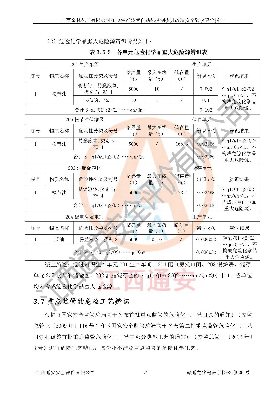 項(xiàng)目簡(jiǎn)介 | 江西金林化工有限公司成立于2003年6月26日,并取得了吉水縣市場(chǎng)監(jiān)督管理局頒發(fā)的《營(yíng)業(yè)執(zhí)照》,營(yíng)業(yè)執(zhí)照統(tǒng)一社會(huì)信用代碼:91360822748530538B。公司注冊(cè)住所:江西省吉安市吉水縣文峰工業(yè)城。法定**人:湯光耀,注冊(cè)資本:貳仟零壹拾玖萬(wàn)元整。企業(yè)類型:有限責(zé)任公司(自然人投資或控股)。經(jīng)營(yíng)范圍包括生產(chǎn)、銷售松節(jié)油、松香、林產(chǎn)化工產(chǎn)品、其它化工產(chǎn)品(含苯酚、甲醛)、橡膠產(chǎn)品、(憑化學(xué)危險(xiǎn)品經(jīng)營(yíng)許可證及消防安全檢查意見(jiàn)書(shū)經(jīng)營(yíng))、機(jī)械配件、紙張銷售。 江西金林化工有限公司于2022年8月23日進(jìn)行了安全生產(chǎn)許可證換證,取得江西省應(yīng)急管理廳頒發(fā)的《安全生產(chǎn)許可證》,許可證編號(hào)為:(贛)WH安許證字[2005]0118號(hào),許可范圍:松節(jié)油(2kt/a),**期2022年8月23日至2025年8月22日。 江西金林化工有限公司在役生產(chǎn)裝置為年產(chǎn)10000噸松香、2000噸松節(jié)油項(xiàng)目及其配套公用、輔助設(shè)施,主要產(chǎn)品有松香和松節(jié)油。 根據(jù)《危險(xiǎn)化學(xué)品目錄》(2015年版)、應(yīng)急管理部辦公廳關(guān)于修改《危險(xiǎn)化學(xué)品目錄(2015年版)實(shí)施指南(試行)》涉及柴油部分內(nèi)容的通知(應(yīng)急廳函〔2022〕300號(hào))和《應(yīng)急管理部工業(yè)和信息化部公安部生態(tài)環(huán)境部交通運(yùn)輸部農(nóng)業(yè)農(nóng)村部衛(wèi)生健康委市場(chǎng)監(jiān)管總局鐵路局民航局公告》2022年第8號(hào)《決定調(diào)整《危險(xiǎn)化學(xué)品目錄(2015版)》,將“1674柴油〔閉杯閃點(diǎn)≤60℃〕”調(diào)整為“1674柴油”》的文件規(guī)定,對(duì)該企業(yè)生產(chǎn)過(guò)程中所涉及的化學(xué)品進(jìn)行辨識(shí):該企業(yè)涉及的松脂、松節(jié)油、柴油(發(fā)電機(jī)燃料)等為危險(xiǎn)化學(xué)品。 | |||